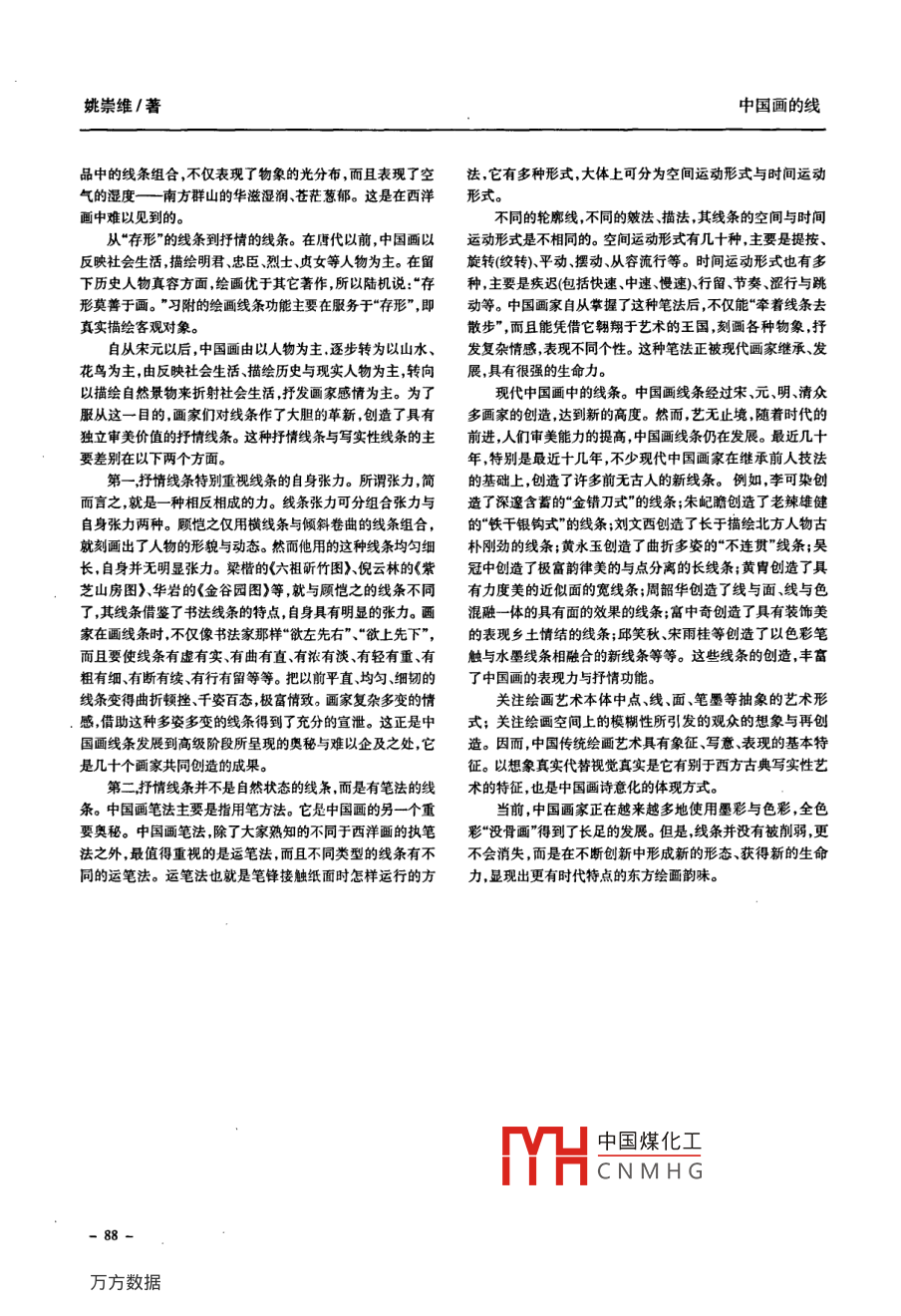 第28卷第1期承德民族師專學(xué)報(bào)Vol 28 No. 1008年3月JournalofChengde Teachers CollegeforNationaliliesMar.2008中國畫的線姚崇維(承德畫院河北承德067000)摘要:中國畫線條的突出特點(diǎn)是富有表現(xiàn)性,它的成熟經(jīng)歷了漫長的發(fā)展:從平實(shí)的線逐漸變?yōu)楦挥猩Φ娘w動的線條,從輪廓線到表現(xiàn)結(jié)構(gòu)、空間、亮度的線條,從“存形”的線條到抒情的線條。最近幾十年,特別是最近十幾年,不少現(xiàn)代中國畫家在繼承前人技法的基礎(chǔ)上,創(chuàng)造了許多前無古人的新線條關(guān)鍵詞:中國畫;線條;發(fā)展中圖分類號J21文獻(xiàn)標(biāo)識碼:A文章編號:1005-1554(2008)01-0087-0我國素有“書畫同源”之說。不管書與畫,所用的工具是“單線平涂”來概括中國畫的特點(diǎn)這是不確切的。單線平涂相同的。行筆、運(yùn)筆等技巧相同,中國書法是“以線造字”,而是人類早期繪畫的共同特點(diǎn)。自漢末后,中國畫的特點(diǎn)就難中國畫歷來是“以線造型”(以線條為主要造型手段)。研究中以用單線平涂來說明了。輪廓線指所畫物象的周邊線。它面國畫線條的歷史發(fā)展軌跡,使我們對中國畫線條的繼承與創(chuàng)對的是所畫物象與它所處空間的關(guān)系,因此它只是把某一物新有一個(gè)更清醒的認(rèn)識是十分重要的。象從大的背景中分離出來,而無法顯現(xiàn)這一物象的內(nèi)部結(jié)構(gòu)中國畫線條的突出特點(diǎn)是富有表現(xiàn)性,它是至今多數(shù)國和光分布。自從中國畫家創(chuàng)造了獨(dú)特的皴法、描法以及擦染家繪畫藝術(shù)中的線條所難以企及的。它的成熟遠(yuǎn)遠(yuǎn)早于西之后,對物象內(nèi)部結(jié)構(gòu)與光分布的處理,就不是借助透視法、方經(jīng)歷了漫長的發(fā)展。人類在原始社會所創(chuàng)造的線條,主要明暗法,而是以本民族獨(dú)特的表現(xiàn)形式描繪出來。從五代時(shí)是直線、橫線和圓線。由于使用這些線,人們就可以在畫面上董源的《瀟湘圖》中,我們可以看到中國畫線條的發(fā)展變化畫出對象的結(jié)構(gòu)傳達(dá)出所要傳遞的信息。此后隨著文明的此畫用輪廓線界定了山的空間位置和整體走勢后,對山體內(nèi)發(fā)展,人們又感到直線橫線和圓線比較呆板、僵硬和缺少動的各個(gè)組成部分均以長披麻皴線條加點(diǎn)來表現(xiàn)。眾多披麻感和生命力于是創(chuàng)造了一些波狀的粗細(xì)不勻的、富有張力皴線條與點(diǎn)的有序排列,一方面刻畫出山嶺在一定光線照耀的線條。我們從周代青銅器《饕餮簋》、漢代畫像石《騎術(shù)》中下的皴紋,另一方面表現(xiàn)出山體內(nèi)各個(gè)部分的有機(jī)組合,從可以看出,中國畫線條從公元前十世紀(jì)開始就有了巨大的發(fā)而有效地描繪了山體的結(jié)構(gòu)。這些表現(xiàn)結(jié)構(gòu)的皴線、點(diǎn)與輪展:從平實(shí)的線逐漸變?yōu)楦挥猩Φ娘w動的線條。這種變廓線融合后,山的雄姿秀態(tài)就盡收眼底了?;窃鯓颖憩F(xiàn)出來的呢?這要從線條的位置、運(yùn)動方向、張力此畫沒有用透視法照樣畫出物象的空間和距離是由于等方面來研究畫家靈活運(yùn)用了皴線和點(diǎn)。畫面的遠(yuǎn)景部分,畫家用的是較首先這兩件作品中出現(xiàn)了波狀線亦稱蛇形線)。這種線短、較小較淡的皴線與點(diǎn);近景部分,則用較長、較濃的皴條的位置與方向不像直線那樣固定,它好象是在擺動而且活點(diǎn);山體背陰的部分,用較濃的短線與點(diǎn);各個(gè)山頭用重選法動的方向不確定,這樣在視覺上就給人以動感。其次,這兩件畫出,畫家用這些方法表現(xiàn)出山體的縱深感。有人認(rèn)為這種作品中的線條不像以往直線那樣平直均勻,而是有粗有細(xì),方法沒有透視法科學(xué)準(zhǔn)確。當(dāng)然按透視法畫出的物象顯得由此可知作者在運(yùn)筆時(shí)所用的力度和速度是不均勻的。這逼真。但是格式塔心理學(xué)家指出透視法的準(zhǔn)確是建立在透種力度與速度的不同,就表現(xiàn)出線條在空間與時(shí)間上的運(yùn)視縮短與透視變形基礎(chǔ)上的,它僅僅是在二維空間表現(xiàn)三維動因而給人以動感;再次,我們從饕餮頭部的向相反方向夸幻覺,是對眼睛的欺騙”。因此,我們不必用透視法來苛求用張性運(yùn)動的線條中,從馬的四條腿最大限度地向不同方向伸皴、點(diǎn)與重迭法來表現(xiàn)物象空間距離—“深度”的中國畫展的姿態(tài)中可以看出,作者企圖通過線條的巨大張力來表現(xiàn)此畫沒有用明暗法也畫出了物象的光分布。這是因?yàn)楫嬿吟选ⅠR的奮進(jìn),使青銅器、石頭上的動物給人視覺上強(qiáng)烈的家利用皴線有疏有密的排列留白來描繪山體的明部與暗部。運(yùn)動感。正是通過這種運(yùn)動感,才使作品表現(xiàn)出極強(qiáng)的生命顯然,這幅畫似乎沒有固定光源和合乎比例的明暗層次亮度活力梯度),但這樣的作品并不像有人說的只強(qiáng)調(diào)線條韻律不要從輪廓線到表現(xiàn)結(jié)構(gòu)、空間亮度的線條。有些人常用光,而是采用垂直光分布、正面光(正面留白來表現(xiàn)光亮,背面、側(cè)面用密集的短皴與點(diǎn)來表現(xiàn)。這種特殊的正面光與明暗分中國煤化工陽的觀點(diǎn)。董源之收稿日期:2007-11-25后,畫作者簡介姚崇維(1964),男,遼寧營口