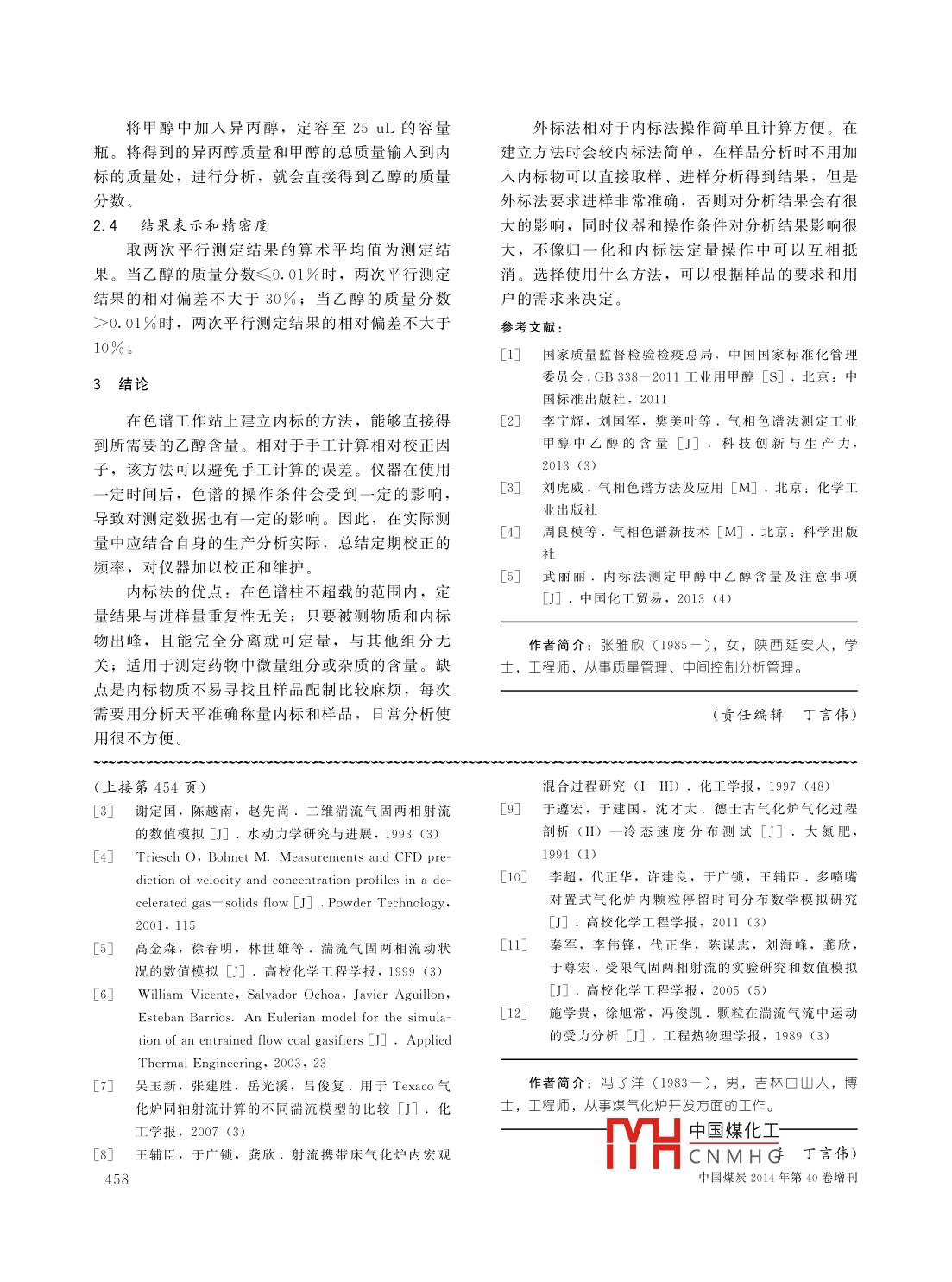 ★煤制油化工★內(nèi)標(biāo)法測(cè)定甲醇乙醇含量的方法訂張雅欣張起政王銳楊海朝伏江峰(神華包頭煤化工有限責(zé)任公司,內(nèi)蒙古包頭市,014010)摘要在應(yīng)用內(nèi)標(biāo)法對(duì)精甲醇中乙醇含量進(jìn)行分析時(shí),通過(guò)在色譜工作站上建立內(nèi)標(biāo)的方法,直接得到乙醇的含量,既避免多個(gè)誤差的引入,也提高了工作效率。關(guān)鍵詞內(nèi)標(biāo)法氣相色譜儀甲醇中圖分類號(hào)TQ23.121文獻(xiàn)標(biāo)識(shí)碼A神華包頭煤化工有限責(zé)任公司年產(chǎn)60萬(wàn)t聚異丙醇,用甲醇稀釋至刻度,混勻。啟動(dòng)氣相色譜烯烴產(chǎn)品,通過(guò)煤制甲醇制烯烴得到聚乙烯和聚丙儀,待儀器穩(wěn)定后,用微量注射器取1uL標(biāo)準(zhǔn)溶烯產(chǎn)品,MTO裝置處理能力為180萬(wàn)t/a甲醇原液,進(jìn)樣、分析。料(折純)。在原料甲醇供應(yīng)不足時(shí),需要外購(gòu)甲5樣品測(cè)定醇。對(duì)外購(gòu)的甲醇,分析檢測(cè)中心要進(jìn)行進(jìn)廠原材GB338-2011中是通過(guò)標(biāo)準(zhǔn)溶液的配制計(jì)算料的分析工作。對(duì)于MTO級(jí)甲醇和精甲醇均可以校正因子,再計(jì)算校正因子的平均值得到最終校正按照GB338-2011中的內(nèi)標(biāo)法進(jìn)行分析因子。在樣品分析時(shí),需要在容量瓶中加人25uL實(shí)驗(yàn)部分的異丙醇作為內(nèi)標(biāo)物,再用樣品進(jìn)行定容,得到樣品和異丙醇的質(zhì)量及峰面積,利用校正因子,通過(guò)1主要儀器計(jì)算得到甲醇中乙醇的最終含量,見式(1)島津GC2010plus氣相色譜儀,檢測(cè)器FID×100島津自動(dòng)進(jìn)樣器sXm2主要試劑式中:v—乙醇的質(zhì)量分?jǐn)?shù),數(shù)值以%表示;甲醇,色譜純;f′—相對(duì)校正因子;醇,色譜純A;乙醇的峰面積異丙醇,色譜純。異丙醇的質(zhì)量1.3分析條件A、——異丙醇的峰面積柱箱溫度:100℃,進(jìn)樣口溫度:150℃,檢測(cè)m-樣品的質(zhì)量。器溫度:200℃;進(jìn)樣量:1μL;氫氣流量計(jì)算結(jié)果保留至小數(shù)點(diǎn)后第四位。乙醇的相對(duì)40mL/min;空氣流量:400mL/min;尾吹氣流校正因子f′按下式進(jìn)行計(jì)算量:25mL/minA. X1.4標(biāo)準(zhǔn)樣品的配制×m在已稱重的清潔、干燥的100mL容量瓶中2色譜分析加人0.5mL乙醇并稱重,準(zhǔn)至0.0001g;用甲醇稀釋至刻度并稱重,混勻。2.1標(biāo)準(zhǔn)樣品色譜圖在5個(gè)清潔、干燥的50mL容量瓶中,分別圖1為甲醇、乙醇、異丙醇樣品分離色譜圖加入0.00mL、0.20mL、0.40mL、0.80mL出峰時(shí)間分別為6.02min,12.10min和1.60mL上述母液,再分別加入25L已知質(zhì)量的m中國(guó)煤化工CNMHG內(nèi)標(biāo)法測(cè)定甲醇中乙醇含量的方法探討455圖1甲醇、乙醇、異丙醇樣品分離色譜圖2.2工作曲線標(biāo)準(zhǔn)溶液時(shí)幾種濃度的甲醇、乙醇和異丙醇的質(zhì)量在優(yōu)化的試驗(yàn)條件下對(duì)甲醇、乙醇和異丙醇混及對(duì)應(yīng)的峰面積。合標(biāo)準(zhǔn)溶液系列進(jìn)行色譜分析。表1和表2是配制表1母液中各個(gè)物質(zhì)的含量空瓶質(zhì)量/g乙醇質(zhì)量/g加乙醇后的質(zhì)量/g甲醇+乙醇質(zhì)量/g總質(zhì)量/g乙醇百分?jǐn)?shù)/%54.13160.368554.500178.8842133.01580.0047表2標(biāo)準(zhǔn)溶液中甲醇、乙醇含量異丙醇異丙醇峰面積乙醇乙醇乙醇峰乙醇質(zhì)量乙醇峰面積質(zhì)量/g/uv質(zhì)量/g含量/%面積/uV·s/異丙醇質(zhì)量異丙醇峰面積0.01940.0184167920.30.15160007080.03840.013280.62160.0029030.160431.24720,00582610732,1按照GB338-2011《工業(yè)用甲醇》關(guān)于甲醇中乙醇的測(cè)定,首先要根據(jù)以上乙醇、異丙醇質(zhì)量和峰面積來(lái)計(jì)算乙醇相對(duì)于異丙醇的相對(duì)校正因子。得到校正因子之后,再通過(guò)計(jì)算得到乙醇的含量,這給過(guò)程中會(huì)引入更多的誤差,操作也比較麻煩。本文采用繪制校準(zhǔn)曲線來(lái)計(jì)算,進(jìn)樣之后可以00.050.10.150.20.250.30.350.4直接得到乙醇的含量,根據(jù)乙醇/異丙醇質(zhì)量比和圖2甲醇中乙醇含量曲線乙醇/異丙醇峰中國(guó)煤化工通過(guò)這YHaCNMHG線456中國(guó)煤炭2014年第40卷增刊0.7431x-0.0171,R2=0.9955,對(duì)于該曲線方程純甲醇的色譜峰作為基線分析,這樣就扣除掉乙醇已經(jīng)能滿足分析的要求。但是,如何在色譜工作站的影響,標(biāo)準(zhǔn)溶液峰面積對(duì)比圖見圖3上實(shí)現(xiàn)此功能是我們接下來(lái)要解決的問題分析完這四個(gè)樣品之后,打開任何一個(gè)數(shù)據(jù)文2.3建立方法件,將方法更改為內(nèi)標(biāo)法,在濃度處輸入乙醇和異由于色譜純甲醇中含有少量乙醇,要扣除掉這丙醇的質(zhì)量百分比,將異丙醇選為內(nèi)標(biāo),內(nèi)標(biāo)法建些乙醇的影響,因此,在色譜中單獨(dú)進(jìn)1L色譜立的標(biāo)準(zhǔn)曲線見圖4。純甲醇,然后在進(jìn)之后的5個(gè)標(biāo)樣時(shí),分別以色譜中H圖3標(biāo)準(zhǔn)溶液峰面積對(duì)比圖1。gc略1函1FIDD回劃副創(chuàng)下到國(guó)地圖巴方法·鄧?yán)砟阈﹨^(qū)廠中回上中國(guó)煤化工圖4內(nèi)標(biāo)法建立的標(biāo)準(zhǔn)曲線CNMHG內(nèi)標(biāo)法測(cè)定甲醇中乙醇含量的方法探討457將甲醇中加入異丙醇,定容至25uL的容量外標(biāo)法相對(duì)于內(nèi)標(biāo)法操作簡(jiǎn)單且計(jì)算方便。在瓶。將得到的異丙醇質(zhì)量和甲醇的總質(zhì)
