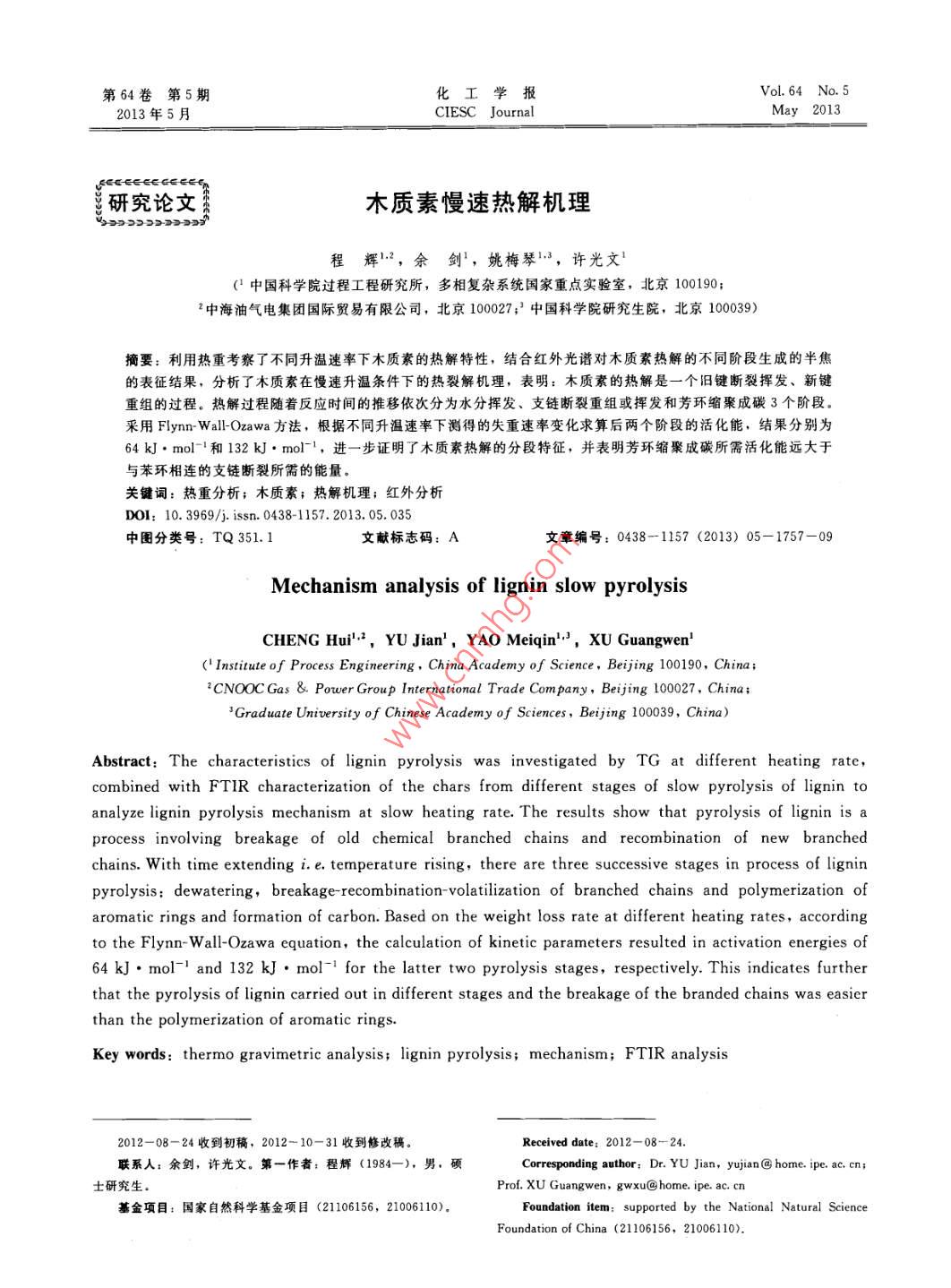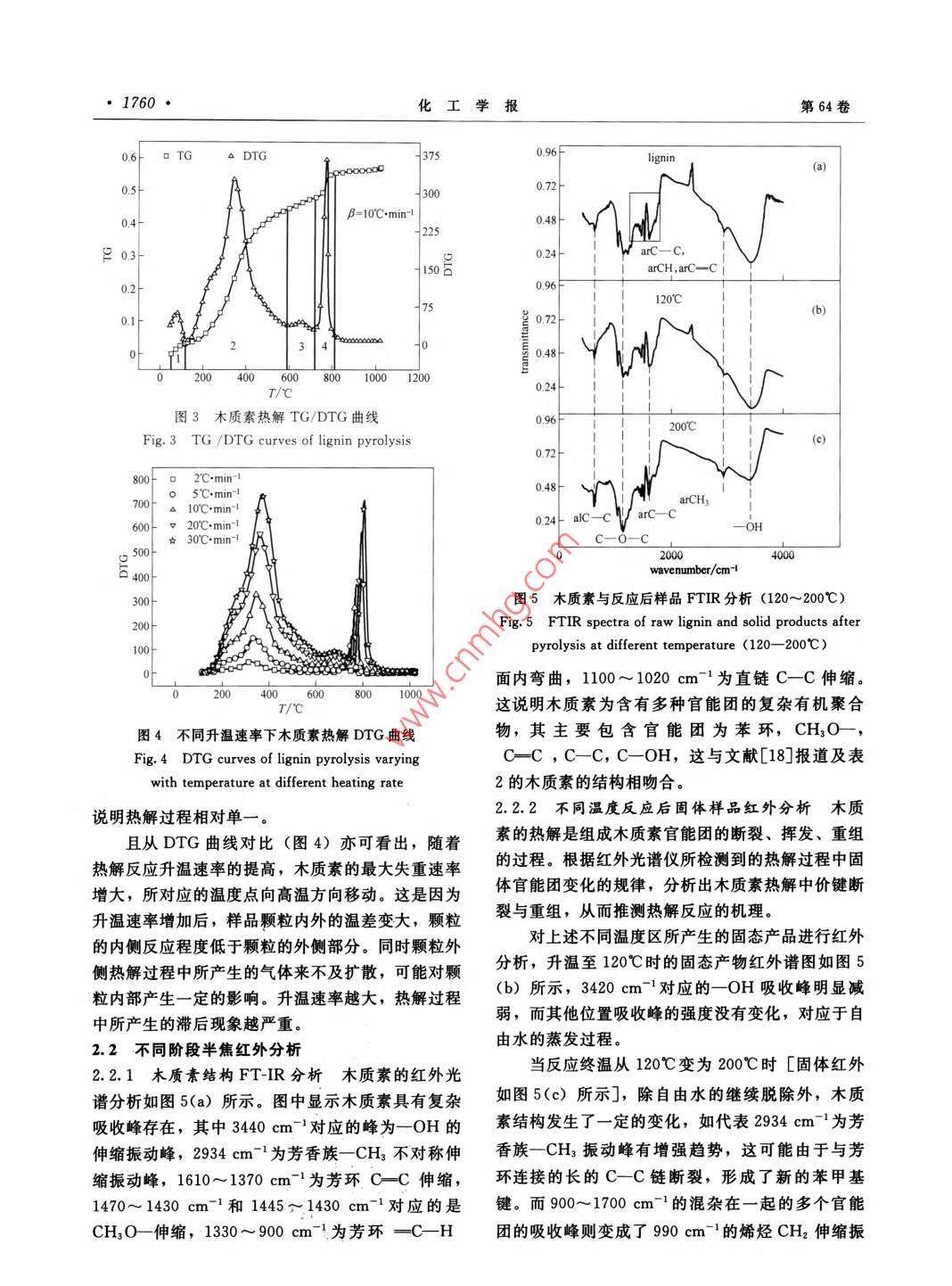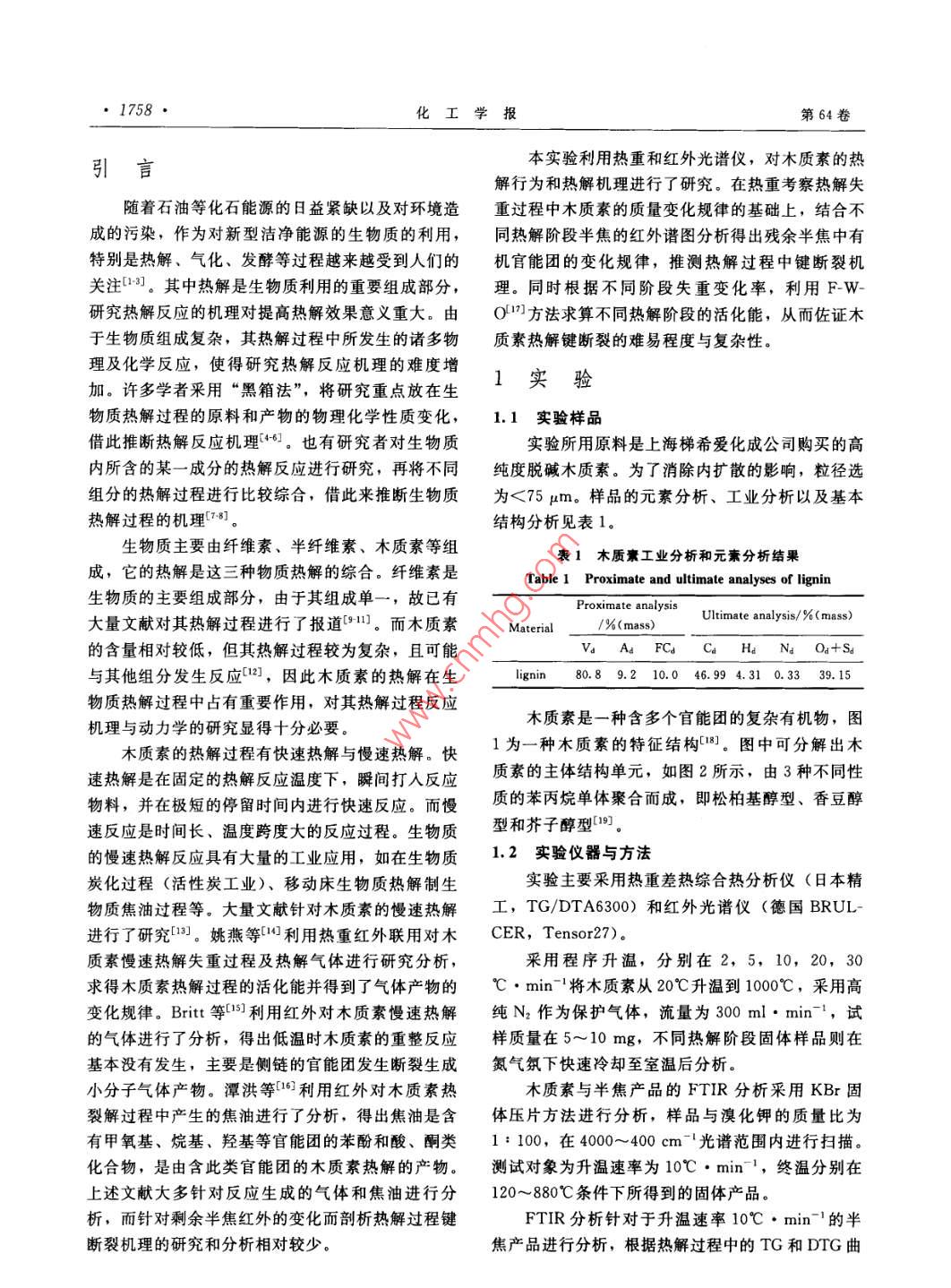 第64卷第5期化工學(xué)報(bào)Vol 64 No 52013年5月CIESC JournalMay 2013研究論文木質(zhì)素慢速熱解機(jī)理程輝1·,余劍,姚梅琴3,許光文1(中國(guó)科學(xué)院過(guò)程工程研究所,多相復(fù)雜系統(tǒng)國(guó)家重點(diǎn)實(shí)驗(yàn)室,北京100190中海油氣電集團(tuán)國(guó)際貿(mào)易有限公司,北京100027;3中國(guó)科學(xué)院研究生院,北京100039)摘要:利用熱重考察了不同升溫速率下木質(zhì)素的熱解特性,結(jié)合紅外光譜對(duì)木質(zhì)素?zé)峤獾牟煌A段生成的半焦的表征結(jié)果,分析了木質(zhì)素在慢速升溫條件下的熱裂解機(jī)理,表明:木質(zhì)素的熱解是一個(gè)舊鍵斷裂揮發(fā)、新鍵重組的過(guò)程。熱解過(guò)程隨著反應(yīng)時(shí)間的推移依次分為水分揮發(fā)、支鏈斷裂重組或揮發(fā)和芳環(huán)縮聚成碳3個(gè)階段采用 Flynn-Wall-Ozawa方法,根據(jù)不同升溫速率下測(cè)得的失重速率變化求算后兩個(gè)階段的活化能,結(jié)果分別為64kJ.mol-1和132kJ·mol-1,進(jìn)一步證明了木質(zhì)素?zé)峤獾姆侄翁卣?并表明芳環(huán)縮聚成碳所需活化能遠(yuǎn)大于與苯環(huán)相連的支鏈斷裂所需的能量關(guān)鍵詞:熱重分析;木質(zhì)素;熱解機(jī)理;紅外分析DoI:10.3969/j.issn.0438-157.2013.05.035中圖分類號(hào):TQ351.1文獻(xiàn)標(biāo)志碼:A文章編號(hào):0438-1157(2013)05-1757-09Mechanism analysis of lignin slow pyrolysisCHENG Hui, YU Jian, YAO Meiqin, XU Guangwen'( Institute of Process Engineering, China Academy of Science, Beijing 100190, China;2 CNOOC Gas & Power Group International Trade Company, Beijing 100027, ChinaGraduate University of Chinese Academy of Sciences, Beijing 100039, China)Abstract: The characteristics of lignin pyrolysis was investigated by tg at different heating ratecombined with FtiR characterization of the chars from different stages of slow pyrolysis of lignin toanalyze lignin pyrolysis mechanism at slow heating rate. The results show that pyrolysis of lignin is aprocess involving breakage of old chemical branched chains and recombination of new branchedchains. With time extending i. e. temperature rising, there are three successive stages in process of ligninpyrolysis: dewatering, breakage-recombination-volatilization of branched chains and polymerization ofaromatic rings and formation of carbon. Based on the weight loss rate at different heating rates, accordingto the Flynn-Wall-Ozawa equation, the calculation of kinetic parameters resulted in activation energies of64 kJ. mol and 132 kJ. mol for the latter two pyrolysis stages, respectively This indicates furtherthat the pyrolysis of lignin carried out in different stages and the breakage of the branded chains was easierthan the polymerization of aromatic rings.Key words thermo gravimetric analysis; lignin pyrolysis; mechanism; FTIR analysis2012-08-24收到初稿,2012-10-31收到修改稿Received date: 2012-08-24聯(lián)系人:余劍,許光文。第一作者:程輝(1984-),男,碩Corresponding author: Dr . YUhome ipe. ac cn;士研究生Prof. XU Guangwen, gwxu@ home. ipe ac cn基金項(xiàng)目:國(guó)家自然科學(xué)基金項(xiàng)目(21106156,21006110)Foundation item: supported by the National Natural ScienceFoundation of China (21106156, 21006110)1758·化工學(xué)報(bào)第64卷本實(shí)驗(yàn)利用熱重和紅外光譜儀,對(duì)木質(zhì)素的熱解行為和熱解機(jī)理進(jìn)行了研究。在熱重考察熱解失隨著石油等化石能源的日益緊缺以及對(duì)環(huán)境造重過(guò)程中木質(zhì)素的質(zhì)量變化規(guī)律的基礎(chǔ)上,結(jié)合不成的污染,作為對(duì)新型潔凈能源的生物質(zhì)的利用,同熱解階段半焦的紅外譜圖分析得出殘余半焦中有特別是熱解、氣化、發(fā)酵等過(guò)程越來(lái)越受到人們的機(jī)官能團(tuán)的變化規(guī)律,推測(cè)熱解過(guò)程中鍵斷裂機(jī)關(guān)注口。其中熱解是生物質(zhì)利用的重要組成部分,理。同時(shí)根據(jù)不同階段失重變化率,利用FW研究熱解反應(yīng)的機(jī)理對(duì)提高熱解效果意義重大。由O1方法求算不同熱解階段的活化能,從而佐證木于生物質(zhì)組成復(fù)雜,其熱解過(guò)程中所發(fā)生的諸多物質(zhì)素?zé)峤怄I斷裂的難易程度與復(fù)雜性。加。許多學(xué)者采用“黑箱法”將研究重點(diǎn)放在生1實(shí)驗(yàn)物質(zhì)熱解過(guò)程的原料和產(chǎn)物的物理化學(xué)性質(zhì)變化,1.1實(shí)驗(yàn)樣品借此推斷熱解反應(yīng)機(jī)理。也有研究者對(duì)生物質(zhì)實(shí)驗(yàn)所用原料是上海梯希愛(ài)化成公司購(gòu)買的高內(nèi)所含的某一成分的熱解反應(yīng)進(jìn)行研究,再將不同純度脫堿木質(zhì)素。為了消除內(nèi)擴(kuò)散的影響,粒徑選組分的熱解過(guò)程進(jìn)行比較綜合,借此來(lái)推斷生物質(zhì)為<75pm。樣品的元素分析、工業(yè)分析以及基本熱解過(guò)程的機(jī)理78結(jié)構(gòu)分析見(jiàn)表1。生物質(zhì)主要由纖維素、半纖維素、木質(zhì)素等組表1木質(zhì)素工業(yè)分析和元素分析結(jié)果成,它的熱解是這三種物質(zhì)熱解的綜合。纖維素是Table 1 Proximate and ultimate analyses of lignin生物質(zhì)的主要組成部分,由于其組成單一,故已有Proximate analysis大量文獻(xiàn)對(duì)其熱解過(guò)程進(jìn)行了報(bào)道1。而木質(zhì)素Material/%(mass)Ultimate analysis/%( mass)的含量相對(duì)較低,但其熱解過(guò)程較為復(fù)雜,且可能Va A FCd Cd H N Od+S,與其他組分發(fā)生反應(yīng)12,因此木質(zhì)素的熱解