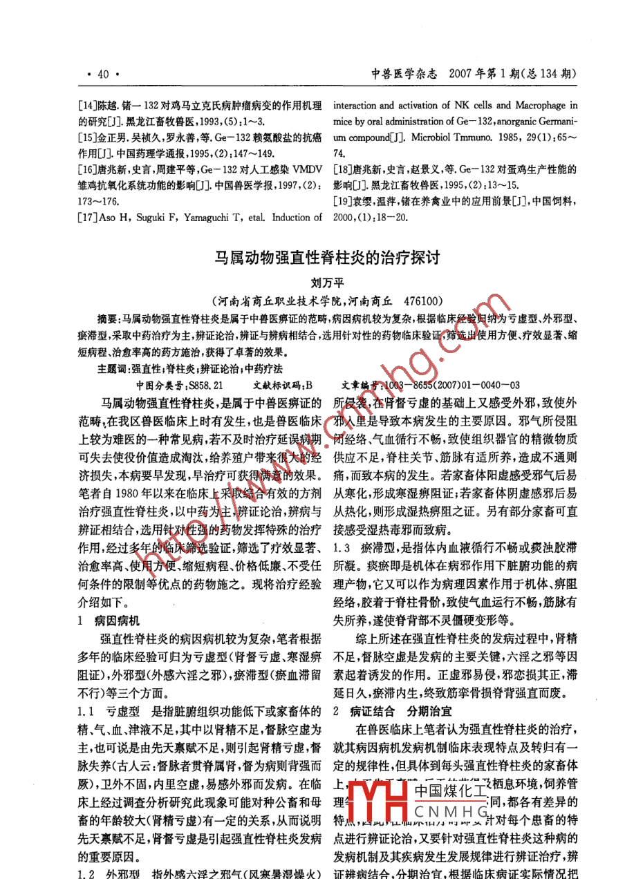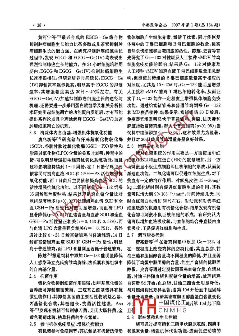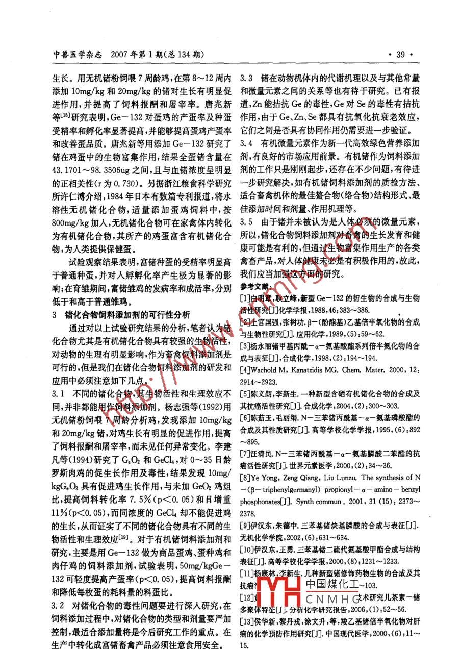 36●中獸醫(yī)學(xué)雜志2007 年第1期(總134期)頭斜斷面內(nèi)壁邊緣鈍的在采血過程中-般很少發(fā)再將這10個(gè)針頭斜斷面內(nèi)壁邊緣用折斷的鋼生堵塞,而斜斷面內(nèi)壁鋒利的新針頭反而易發(fā)生堵鋸條斷面刮削,使其邊緣圓滑,不能切削火柴梗為塞或血流不暢,這是由于大家畜采血針頭較粗,常度,再用這10個(gè)針頭如前所述刺向膠塞3次,結(jié)果用的16號(hào)針頭針梗外徑約0. 16cm,針梗管壁厚證實(shí)沒有膠皮塊沖下。0.04cm,使針梗壁薄、管腔粗,斜斷面內(nèi)壁邊緣很2現(xiàn)場采血應(yīng)用對照試驗(yàn)鋒利,如同刀刃一般,穿刺時(shí)用力很猛,針頭將皮選20個(gè)斜斷面內(nèi)壁邊緣刮鈍的針頭做實(shí)驗(yàn)?zāi)w、組織沖下- -部分,較大的就堵塞針梗管腔,較小組, 20個(gè)斜斷面內(nèi)壁邊緣鋒利的新針頭做對照組,的存在于管腔中阻礙血液流暢,更小的順著血流流用于實(shí)際采 血,結(jié)果實(shí)驗(yàn)組沒有一例發(fā)生堵塞,對到血容器中。照組中發(fā)生完全堵塞4例,不完全堵塞6例。為了證實(shí)堵塞是由于針頭斜斷面內(nèi)壁邊緣鋒通過以上的兩個(gè)實(shí)例表明,針頭堵塞的主要原利所致,筆者做了以下兩個(gè)實(shí)驗(yàn)。因是斜斷面內(nèi)壁邊緣鋒利的緣故,經(jīng)刮鈍后斜面內(nèi)1在膠塞上做模擬試驗(yàn)壁邊緣圓滑,在穿刺時(shí)阻力小,并將針孔周圍的皮選斜面內(nèi)壁邊緣鋒利的16號(hào)新針頭10個(gè),可膚向 四周擠壓,針頭穿刺皮膚和靜脈管時(shí)不會(huì)切下用火柴梗試其鋒利程度,能削火柴梗為度,從膠塞皮膚塊 、組織塊而堵塞針頭,同時(shí)撤針后擠向四周側(cè)面將針頭橫向刺穿孔壁,將膠塞打孔,孔壁孔徑的皮膚 立即堵塞針眼,加速止血。各1cm左右,每個(gè)針頭刺3次,結(jié)果觀察,每次都所以,筆者認(rèn)為將針頭斜斷面內(nèi)壁邊緣刮鈍可可以沖下底面直徑約0. 1cm,高約0. 08cm左右的提高采 血速度,保證血清質(zhì)量和人畜安全。近似圓錐體膠皮塊。鍺化合物飼料添加劑開發(fā)與利用馮雪風(fēng)' ,金衛(wèi)根’(1.東華理工學(xué)院應(yīng)化系,江西撫州344000;2. 東華理工學(xué)院生物系)摘要:鍺化合物作為飼料添加劑具有抗腫瘤、提高免疫力、清除自由基、增強(qiáng)抗氧化作用、抑菌、影響脂類代謝、促進(jìn)禽畜生長等多種生理功能。此外,通過生物富集作用,可以改變禽畜產(chǎn)品的質(zhì)量,提升禽畜產(chǎn)品的保健功效。關(guān)鍵詞:鍺化合物;生理功能;生物富集;飼料添加劑中圖分類號(hào):S816.7文獻(xiàn)標(biāo)識(shí)碼:A文章編號(hào):1003- 8655<(2007)01 -0036- -05飼料添加劑是指在飼料中加入- -些天然的或1鍺與鍺化合物“等同于天然的”營養(yǎng)成分,目的是為了預(yù)防畜禽疾鍺是地殼中的稀有元素,其地殼豐度很低(1.病促進(jìn)畜禽健康和生長發(fā)育良好、提高飼料轉(zhuǎn)化5ug/g) ,在土壤中的平均含量為0. 2ug/g,在天然率。飼料添加劑一般分為兩大類,即營養(yǎng)性添加劑水中的含量為 1.5X 10-3 ug/g.自然界沒有獨(dú)立和非營養(yǎng)性添加劑,前者如氨基酸維生素、礦物質(zhì)的鍺礦 ,多以硫化物形式伴生在硫砷銅礦和硫銀鍺(微量元素)添加劑,它們都是畜禽生長發(fā)育所必需錫等 物質(zhì)中,并可在冶煉中富集。人和動(dòng)物的許多的營養(yǎng)素;后者如藥物添加劑、微生態(tài)添加劑、低聚酶,大腦、小腦、脊髓的灰質(zhì) 與鉑質(zhì)及腦脊液中都有糖添加劑、酶制劑、酸化劑、防霉劑、大蒜中草藥添鍺的分布,可以認(rèn)為鍺對人和動(dòng)物的生長發(fā)育、健加劑等。目前,在畜禽生產(chǎn)領(lǐng)域正大力提倡“綠色”康狀況有著一 -定的影響。飼料添加劑,要求飼料添加劑在使用中不會(huì)產(chǎn)生毒1971年日本學(xué)者首先合成有機(jī)鍺化合物,即β副作用,不會(huì)造成有害物質(zhì)有畜禽體內(nèi)和產(chǎn)品內(nèi)殘-羧乙基鍺倍半氧化物(2-Carboxyethy1. germa-留,能提高畜禽產(chǎn)品的質(zhì)量和品質(zhì)、對消費(fèi)者的健nium中國煤化工132,化學(xué)式為康有益或無害,對環(huán)境無污染。微量元素尤其是有機(jī)微量元素作為新- -代高效綠色營養(yǎng)添加劑,有著IHCNMHG6個(gè)鍺原子和 6個(gè)氧原了他間壓安成時(shí)T _兒環(huán)結(jié)構(gòu)單元組成,良好的市場應(yīng)用前景。其中每個(gè)鍺原子與3個(gè)橋氧原子聯(lián)結(jié)成延伸的片收稿日期:2006-05-26作煮簡介:馮雪風(fēng)(1972 - -),女,碩土,講師,主要從事應(yīng)用化學(xué)教學(xué)與研究工作。中獸醫(yī)學(xué)雜志2007 年第1期(總134期)層結(jié)構(gòu),從而使Ge- 132具三維網(wǎng)狀結(jié)構(gòu)。它是2006年1月廈門大學(xué)黃河寧(2]等用有機(jī)化學(xué)-種多聚物,溶于水,不溶于有機(jī)溶劑,具有廣泛藥法合成兒茶素- -Ge 多聚體。紅外光譜和質(zhì)譜技術(shù)理作用和生理效應(yīng)。分析并證實(shí)其組成為表沒食子兒茶素沒食子酸酯自從第-一個(gè)倍半氧化物Ge- 132合成后,人(EGCG)絡(luò)合金屬 鍺,成為EGCG -Get+ 和EGCG們又相續(xù)合成了大量的Ge-132衍生物。如白明-Get+ 多聚體。兒茶素- Ge絡(luò)合物具有明顯的章等叼合成(GeCH2CH2CONHAr)2O3, Ar為苯抑制肺癌細(xì)胞生 長的作用?;蛉〈?上官國強(qiáng)等[2]合成新β一(酚酯基)乙基2鍺的生理功能倍半氧化物,后又合成三氧化二一β→