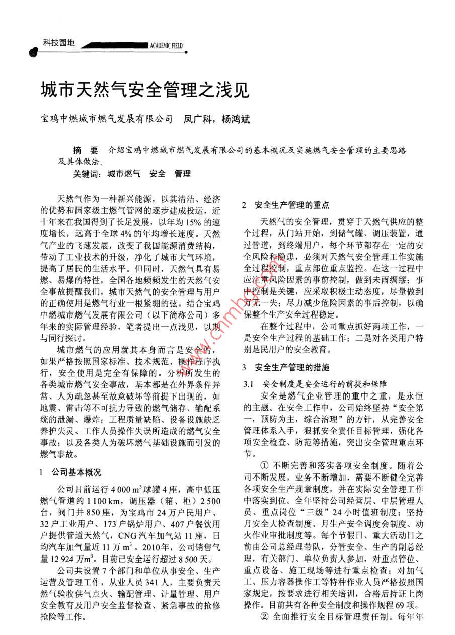 科技園地ACADEMIC FIELD城市天然氣安全管理之淺見寶雞中燃城市燃?xì)獍l(fā)展有限公司鳳廣科,楊鴻斌摘要介紹寶雞中燃城市燃?xì)獍l(fā)展有服公司的基本概況及實施燃?xì)獍踩芾淼闹饕悸芳熬唧w做法。關(guān)鍵詞:城市燃?xì)獍踩芾硖烊粴庾鳛橐环N新興能源,以其清潔、經(jīng)濟的優(yōu)勢和國家級主燃?xì)夤芫W(wǎng)的逐步建成投運,近2安全生產(chǎn)管理的重點十年來在我國得到了長足發(fā)展,以年均15%的速天然氣的安全管理,貫穿于天然氣供應(yīng)的整度增長,遠(yuǎn)高于全球4%的年均增長速度。天然個過程,從門站開始,到儲氣罐、調(diào)壓裝置,通氣產(chǎn)業(yè)的飛速發(fā)展,改變了我國能源消費結(jié)構(gòu),過管道,到終端用戶,每個環(huán)節(jié)都存在一定的安帶動了工業(yè)技術(shù)的升級,凈化了城市大氣環(huán)境,全風(fēng)險和隱患,必須對天然氣安全管理工作實施提高了居民的生活水平。但同時,天然氣具有易全過程控制,重點部位重點監(jiān)控。在這一過程中燃、易爆的特性,全國各地頻頻發(fā)生的天然氣安應(yīng)注重風(fēng)險因素的事前控制,做到未雨綢繆;事全事故提醒我們,城市天然氣的安全管理與用戶中控制是關(guān)鍵,應(yīng)采取積極主動態(tài)度,盡量做到的正確使用是燃?xì)庑袠I(yè)一根緊繃的弦。結(jié)合寶雞萬無一失;盡力減少危險因素的事后控制,以確中燃城市燃?xì)獍l(fā)展有限公司(以下簡稱公司)多保整個生產(chǎn)安全過程穩(wěn)定。年來的實際管理經(jīng)驗,筆者提出一點淺見,以期在整個過程中,公司重點抓好兩項工作,與同行探討。是安全生產(chǎn)過程的基礎(chǔ)工作;二是對各類用戶特城市燃?xì)獾膽?yīng)用就其本身而言是安全的,別是民用戶的安全教育。如果嚴(yán)格按照國家標(biāo)準(zhǔn)、技術(shù)規(guī)范、操作程序執(zhí)行,安全使用是完全有保障的。分析所發(fā)生的安全生產(chǎn)管理的措施各類城市燃?xì)獍踩鹿?基本都是在外界條件異3.1安全制度是安全運行的前提和保障常、人為疏忽甚至故意破壞等前提下出現(xiàn)的,如安全是燃?xì)馄髽I(yè)管理的重中之重,是永恒地震、雷擊等不可抗力導(dǎo)致的燃?xì)鈨Υ?、輸配系的主題。在安全工作中,公司始終堅持“安全第統(tǒng)的泄漏、爆炸;工程質(zhì)量缺陷、設(shè)備設(shè)施缺乏,預(yù)防為主,綜合治理”的方針,從完善安全養(yǎng)護(hù)失靈、工作人員操作失誤所造成的燃?xì)獍踩芾眢w系入手,狠抓安全責(zé)任目標(biāo)管理,強化各事故;以及各類人為破壞燃?xì)饣A(chǔ)設(shè)施而引發(fā)的項安全檢查、防范等措施,突出安全管理重點環(huán)燃?xì)馐鹿盛俨粩嗤晟坪吐鋵嵏黜棸踩贫取kS著公1公司基本概況司不斷發(fā)展,業(yè)務(wù)不斷增加,需要不斷健全完善公司目前運行4000m3球罐4座,高中低壓各項安全生產(chǎn)規(guī)章制度,并在實際安全管理工作燃?xì)夤艿兰s1100km,調(diào)壓器(箱、柜)2500中落實到位。全年堅持公司經(jīng)營層、中層管理人臺,閥門井850座,為寶雞市24萬戶民用戶員、重點崗位“三級”24小時值班制度;堅持32戶工業(yè)用戶、173戶鍋爐用戶、407戶餐飲用安全大檢查制度、月生產(chǎn)安全調(diào)度會制度、動戶提供管道天然氣,CNG汽車加氣站11座,日火作業(yè)審批制度等。每個節(jié)假日、重大活動日之均汽車加氣量近11萬m3。2010年,公司銷售氣前由公司總經(jīng)理帶隊,分管安全、生產(chǎn)的副總經(jīng)量12924萬m3。目前已安全運行超過8500天理,有關(guān)部門、單位負(fù)責(zé)人參加,對重點管位、公司共設(shè)置7個部門和單位從事安全、生產(chǎn)重點設(shè)備、施工現(xiàn)場等進(jìn)行重點檢查;對加氣運營及管理工作,從業(yè)人員341人,主要負(fù)責(zé)天工、壓力容器操作工等特種作業(yè)人員嚴(yán)格按照國然氣驗收供氣點火、輸配管理、計量管理、用戶家規(guī)定,按要求進(jìn)行相關(guān)培訓(xùn),合格后持證上崗安全教育及用戶安全監(jiān)督檢査、緊急事故的搶修操作。目前共有各種安全制度和操作規(guī)程69項搶險等工作②全面推行安全目標(biāo)管理責(zé)任制。每年年城市天然氣安全管理之淺見∠初,公司與各單位、各單位與班組、班組與個人發(fā)布停、供氣通知。同時,公司還利用 SCADA層層簽訂安全目標(biāo)管理責(zé)任書,使公司的每個部系統(tǒng)對門站、重要用戶、加氣站、管網(wǎng)重點壓力門、每個班組、每位員工明確自己的安全工作內(nèi)監(jiān)測點的壓力、流量、溫度進(jìn)行實時監(jiān)控。特別容和責(zé)任,將安全目標(biāo)貫穿于企業(yè)生產(chǎn)經(jīng)營管理是今年,公司承擔(dān)了國家“十一五”科技支撐計的各個階段,使責(zé)任落實到人,檢査考核到崗,劃“城市燃?xì)鈿庠磧ε浼皯?yīng)用關(guān)鍵技術(shù)”之燃?xì)猹剳蛢冬F(xiàn)到位。輸配系統(tǒng)模擬與智能調(diào)控技術(shù)示范工程,完成對32安全關(guān)口前移,把隱患消滅在萌芽狀態(tài)原 SCADA系統(tǒng)的升級改造,實現(xiàn)了燃?xì)夤芫W(wǎng)的①嚴(yán)把工程質(zhì)量關(guān),從源頭確保投入運行負(fù)荷預(yù)測和管網(wǎng)模擬等功能,一旦管網(wǎng)壓力出現(xiàn)管網(wǎng)安全。工程竣工后先由施工單位進(jìn)行自檢異常,能夠及時發(fā)現(xiàn)并發(fā)布