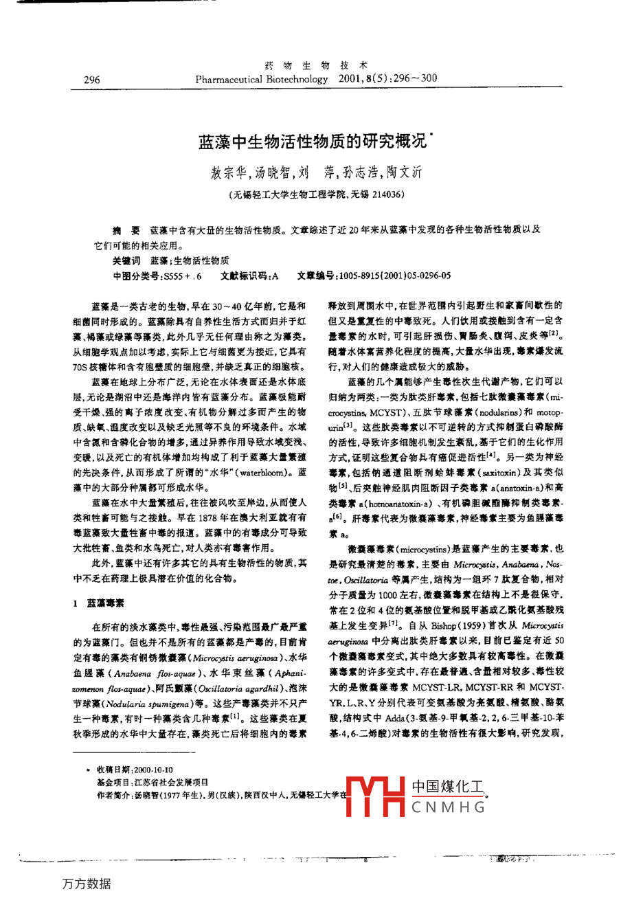 藥物生物技術(shù)Pharmaceutical Biotechnology 2001, 8(5): 296-300藍(lán)藻中生物活性物質(zhì)的研究概況敖宗華,湯曉智,劉萍,孫志浩,陶文沂(無錫輕工大學(xué)生物工程學(xué)院,無錫214036)要藍(lán)藻中含有大量的生物活性物質(zhì)。文章綜述了近20年來從藍(lán)藻中發(fā)現(xiàn)的各種生物活性物質(zhì)以及它們可能的相關(guān)應(yīng)用。關(guān)鍵詞藍(lán)藻;生物活性物質(zhì)中圖分類號(hào):S55+,6文獻(xiàn)標(biāo)識(shí)碼:A文章編號(hào):1005-8915(2001)05029605藍(lán)藻是一類古老的生物,早在30~40億年前,它是和釋放到周圍水中在世界范圍內(nèi)引起野生和家畜間歇性的細(xì)菌同時(shí)形成的。藍(lán)藻除具有自養(yǎng)性生活方式而歸并于紅但又是重復(fù)性的中毒致死。人們伙用或接觸到含有一定含藻、褐藻或綠藻等藻類此外幾乎無任何理由稱之為藻類。量毒素的水時(shí),可引起肝損傷胃腸炎、腹瀉、皮炎等2從細(xì)胞學(xué)觀點(diǎn)加以考慮,實(shí)際上它與細(xì)茵更為接近,它具有隨譽(yù)水體富營養(yǎng)化程度的提高,大量水華出現(xiàn),毒爆發(fā)流70S核糖體和含有胞壁質(zhì)的細(xì)胞壁并缺乏真正的細(xì)胞核。行,對(duì)人們的健康造成極大的威脅藍(lán)藻在地球上分布廣泛,無論在水體表面還是水體底藍(lán)藻的幾個(gè)屬能夠產(chǎn)生毒性次生代謝產(chǎn)物,它們可以層無論是湖沼中還是海洋內(nèi)皆有藍(lán)藻分布。藍(lán)藻極能耐歸納為兩類:一類為肽類肝毒素,包括七肽微囊藻毒京(受干燥、強(qiáng)的離子濃度改變、有機(jī)物分解過多而產(chǎn)生的物 crocystins, MCYST)、五肽節(jié)球藻素( nodularins)和motp質(zhì)、缺氧、溫度改變以及缺乏光照等不良的環(huán)境條件。水域un(3)。這些肽類毒素以不可逆轉(zhuǎn)的方式抑制蛋白磷酸酶中含氮和含彈化合物的增多通過異養(yǎng)作用導(dǎo)致水域變淺、的活性導(dǎo)致許多細(xì)胞機(jī)制發(fā)生紊亂,基于它們的生化作用變暖,以及死亡的有機(jī)體增加均構(gòu)成了利于藍(lán)藻大量繁殖方式,證明這些復(fù)合物具有癌促進(jìn)活性4。另一類為神經(jīng)的先決條件,從而形成了所謂的“水華"( waterbloom)。藍(lán)毒素,包括鈉通道阻斷劑蛤蚌寰( Saxitoxin)及其類似藻中的大部分種屬都可形成水華。物5后奕觸神經(jīng)肌肉阻斷因子類毒素a( anatoxin-a)和高藍(lán)藻在水中大量繁殖后,往往被風(fēng)吹至岸邊,從而使人類毒素( hotmaanatoxin-a)、有機(jī)磷膽堿降抑制類毒素類和牲畜可能與之接觸。早在1878年在溴大利亞就有有46。肝毒素代表為微囊藻毒素,神經(jīng)毒主要為魚腿藻毒毒藍(lán)藻致大量牲畜中毒的報(bào)道。藍(lán)藻中的有毒成分可導(dǎo)致紫大批牲畜、魚類和水鳥死亡,對(duì)人類亦有毒害作用。微囊藻毒素( microcystins)是藍(lán)藻產(chǎn)生的主要毒素,也此外藍(lán)藻中還有許多其它的具有生物活性的物質(zhì)其是研究最清楚的毒素,主要由 Microcystis, Anabaena,№中不乏在藥理上極具潛在價(jià)值的化合物toe, Oscillatoria等屬產(chǎn)生,結(jié)構(gòu)為一組環(huán)7肽復(fù)合物,相對(duì)分子質(zhì)量為100左右微囊藻事宗在結(jié)構(gòu)上不是很保守,1藍(lán)新親常在2位和4位的氨基酸位置和脫甲基或乙酰化氨基酸殘?jiān)谒械牡孱愔卸拘宰顝?qiáng)污染范圍最廣最嚴(yán)重基上發(fā)生變異。自從Bisp(1959)首次從 Microcystis為藍(lán)藻門。但也并不是所有的藍(lán)藻都是產(chǎn)毒的,目前肯 aruginosa中分離出肽類肝毒素以來,目前已鑒定有近的定有毒的藻類有銅銹微囊藻( Microcystis aeruginos)水華個(gè)微囊藻毒素變式,其中絕大多數(shù)具有較高毒性。在微囊魚腥藻( Anabaena ftos-aquae)、水華東絲藻( Athan·藻毒京的許多變式中存在最普遵含量相對(duì)較多毒性較zomenon fuas-aquae)阿氏顫藻( Oscillatoria agardh)、泡沫大的是微囊藻毒京 MCYST-LR, MCYST-RR和 MCYST節(jié)球藻( Nodularia spumigena)等。這些產(chǎn)毒藻類并不只產(chǎn)YR,LR、Y分別代表可變氨基酸為亮氨酸、精氨酸、酪氨生一種毒素,有時(shí)一種藻類含幾種毒素1。這些藻類在夏酸結(jié)構(gòu)式中Adda(3氨基9甲氧基2,2,6三甲基10苯秋季形成的水華中大量存在藻類死亡后將細(xì)胞內(nèi)的毒素基4,6二烯酸)對(duì)毒素的生物活性有很大影響,研究發(fā)現(xiàn),收稿日期:20001010基金項(xiàng)目:江蘇省社會(huì)發(fā)展項(xiàng)目作者簡介:湯曉智(1977年生),男(漢族)陜西漢中人,無錫輕工rYH中國煤化工CNMHG教宗華等:藍(lán)藻中生物活性物質(zhì)的研充慨況去除Ada后毒素毒性降低,證明Adda對(duì)微囊藻毒素的活 Rinehart等(1981)發(fā)現(xiàn)他們所篩選出來的藍(lán)藻培養(yǎng)物的提性是必藩的取物中,5%以上的都具有抗皰疹Ⅱ型病毒活性.另外也育魚邊藻毒素a( anatoxin a),它是相對(duì)分予質(zhì)量為1665%以上的具有抗呼吸道合胞病毒的活性1。La等的仲胺,結(jié)構(gòu)為帶鳥嘌呤的有機(jī)磷酸酯是最強(qiáng)烈的煙酰乙(1993)也對(duì)900株藍(lán)藻提墳物進(jìn)行了鳥類成髓細(xì)胞反轉(zhuǎn)錄酰膽堿受體拮抗劑,作為奕觸后去極化神經(jīng)肌肉阻斷劑,致酶病毒和人免疫缺陷病毒1型抑制實(shí)驗(yàn),發(fā)現(xiàn)2%以上的使呼吸停滯,動(dòng)物在幾分鐘內(nèi)死亡。小鼠LD0為250g/藻類具有預(yù)期的活性l。 Mundt s(1997)從15