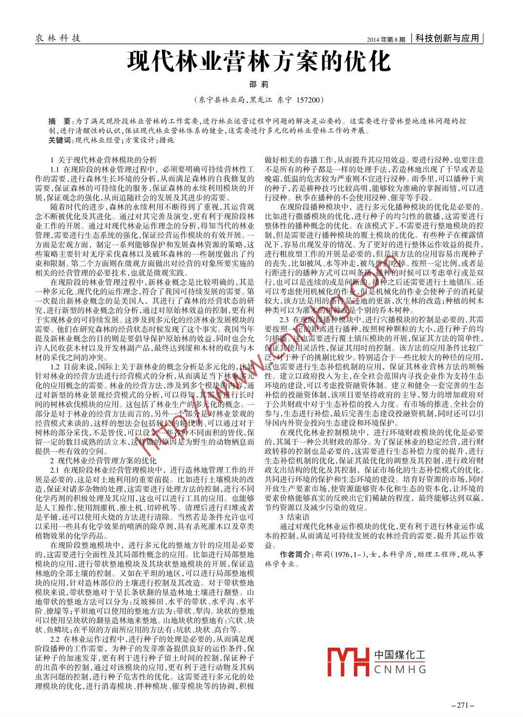 農(nóng)林科技2014年第8期I 科技創(chuàng)新與應(yīng)用現(xiàn)代林業(yè)營林方案的優(yōu)化邵莉(東寧縣林業(yè)局,黑龍江東寧157200)商要:為了滿足現(xiàn)階段林業(yè)營林的工作需要,進行林業(yè)運營過程中問題的解決是必要的。這需要進行營林整地造林問題的控制,進行清醒性的認識,保證現(xiàn)代林業(yè)營林體系的健全,這需要進行多元化的林業(yè)營林工作的開展。關(guān)鍵詞:現(xiàn)代林業(yè)經(jīng)營;方案設(shè)計;措施1關(guān)于現(xiàn)代林業(yè)營林模塊的分析做好相關(guān)的春播工作,從而提升其應(yīng)用效益。要進行浸種,也要注意1.1 在現(xiàn)階段的林業(yè)管理過程中,必須要明確可持續(xù)營林性工不是所有的種子都是- -樣的處理手法,若造林地出現(xiàn)了干旱或者是作的需要,進行森林生長環(huán)境的分析,從而滿足森林的自我修復的晚霜,低溫的危害較為嚴重則不宜進行浸種。雨季里,可以播種干爽需要,保證森林的可持續(xù)化的服務(wù),保證森林的永續(xù)利用模塊的開的種子,若是耕種技巧比較高明,能夠較為準確的掌握雨情,可以進展,保證觀念的強化,從而追隨社會的發(fā)展及其進步的需要。行浸種。秋季在播種的不會使用浸種、催芽等手段。隨著時代的進步,森林的永續(xù)利用不斷得到了重視,其運營觀在現(xiàn)階段播種模塊中,進行多元化播種模塊的優(yōu)化是必要的。念不斷被優(yōu)化及其進化。通過對其完善及演變,更有利于現(xiàn)階段林比如進行撒播模塊的優(yōu)化,進行種子的均勻性的散播,這需要進行業(yè)工作的開展。通過對現(xiàn)代林業(yè)運作理念的分析,得知當代的林業(yè)整體性的播種概念的優(yōu)化。在該模式下,不需要進行整地模塊的控管理,需要進行生態(tài)系統(tǒng)的強化,保證經(jīng)營運作模塊的有效開展。制,但是需要進行播種模塊的覆土模塊的優(yōu)化。有些種子在裸露情方面是宏觀方面,制定--系列能夠保護和發(fā)展森林資源的策略,這況下,容易出現(xiàn)發(fā)芽的情況。為了更好的進行整體運作效益的提升,些策略主要針對無序采伐森林以及破壞森林的一-些制度做出了約進行粗放型工作的開展是必要的,但是該方法的應(yīng)用容易出現(xiàn)種子束和限制。第二個方面則在微觀方面做出對經(jīng)營的對象所要實施的的喪失,比如被風、水等沖走,被鳥獸們吃掉。按照-定比例,或者是相關(guān)的經(jīng)營管理的必要技術(shù),也就是微觀實踐。行距進行的播種方式可以叫條播,播種的時候可以考慮單行或是雙在現(xiàn)階段的林業(yè)管理過程中,新林業(yè)概念是比較明確的,其是行,也可以是連續(xù)的或是間斷的。播種之后還需要進行土地鎮(zhèn)壓。還-種多元化、現(xiàn)代化的運作理念,符合了我國可持續(xù)發(fā)展的需要。第可以考慮使用機械化的作業(yè),但是機械化的作業(yè)會使種子的消耗量-次提出新林業(yè)概念的是美國人,其進行了森林的經(jīng)營狀態(tài)的研較大,該方法是用的條件是跡地的更新,次生林的改造;種植的樹木究,進行新型的林業(yè)概念的分析,通過對原始林效益的控制,更有利種類可 以為灌木的樹種或是個別的喬木樹種。于實現(xiàn)林業(yè)的可持續(xù)發(fā)展。這涉及到多元化的經(jīng)濟林業(yè)發(fā)展模塊的2.3在現(xiàn)階段播種模塊中,進行穴播模塊的控制是必要的,其需需要。他們在研究森林的經(jīng)營狀態(tài)時候發(fā)現(xiàn)了這個事實。我國當年要按照--定的距離進行播種.按照樹種顆粒的大小,進行種子的均提及新林業(yè)概念的目的則是要倡導保護原始林的效益,同時也會允勻插播。這也需要進行覆土鎮(zhèn)壓模塊的開展,保證其方法的簡單性,許人民收獲木材以及開發(fā)林副產(chǎn)品,最終達到緩和木材的收獲與木保證其使 用靈活性,保證其用時的控制。該方法的應(yīng)用條件比較廣材的采伐之間的沖突。泛,對于種子的挑剔比較少。特別適合于- -些比較大的種徑的應(yīng)用,1.2目前來說,國際上關(guān)于新林業(yè)的概念分析是多元化的,比如這也需要進行生態(tài)補償機制的應(yīng)用,保證其林業(yè)營林方法的順暢針對林業(yè)的經(jīng)營方法進行經(jīng)營模式的分析,從而滿足當下林業(yè)多元性。 建立以政府投入為主,在全社會范圍內(nèi)尋找企業(yè)作為支持生態(tài)化的應(yīng)用概念的需要。林業(yè)的經(jīng)營方法,涉及到多個模塊的內(nèi)容,通環(huán)境的建設(shè),可以考慮投資融資體制。建立和健全一套完善的生態(tài)過對新型的林業(yè)景觀經(jīng)營模式的分析,可以得知,其需要進行長時補償?shù)耐度谫Y體制,該項目要堅持政府的主導,努力的增加政府對間的樹林砍伐模塊的應(yīng)用。這包括了林業(yè)生產(chǎn)的多元化的概念。一于公共財政中對于生態(tài)補償?shù)耐度肓Χ?。有市場的推進、全社會的部分是對于林業(yè)的經(jīng)營方法而言的,另外一一 個部分是對林業(yè)景觀的參 與,生態(tài)進行補償,最后完善生態(tài)建設(shè)投融資機制,同時還可以引經(jīng)營模式來談的,這樣的想法會包括較長的輪伐期、可以通過對于導國內(nèi)外資金投向生態(tài)建設(shè)和環(huán)境保護。樹林的部分采伐,不是皆伐,可以設(shè)立- -些各種不同面積的皆伐,保在現(xià