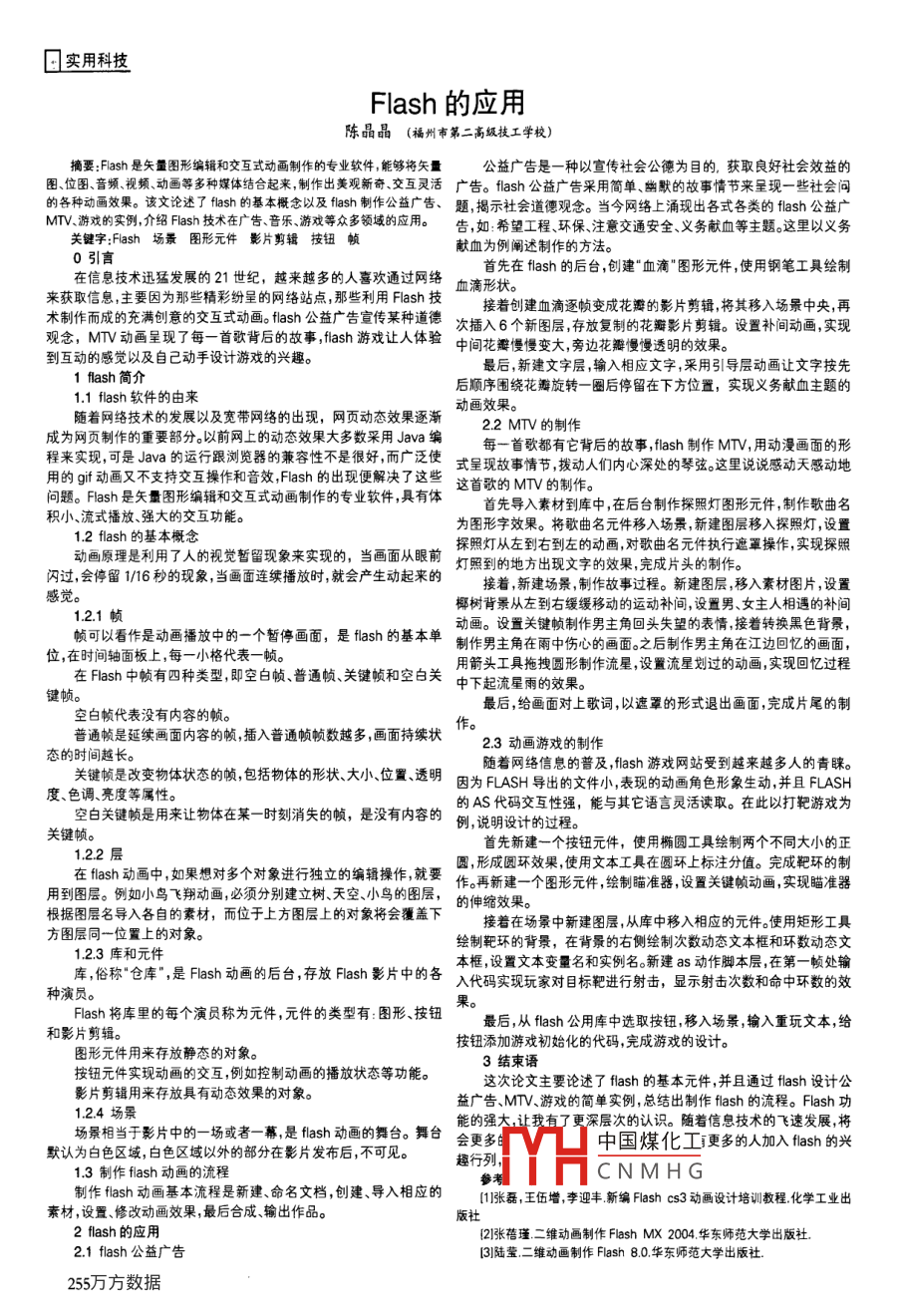 團實用科技Fash的應(yīng)用陳晶晶(福州市第二高級技工學校)摘要:Fash是矢量圖形編輯和交互式動畫制作的專業(yè)軟件能夠?qū)⑹噶抗鎻V告是一種以宣傳社會公德為目的,獲取良好社會效益的圖、位圖、音頻、視頻、動畫等多種媒體結(jié)合起來制作出美觀新奇交互靈活廣告。fash公益廣告采用簡單、幽默的故事情節(jié)來呈現(xiàn)一些社會問的各種動畫效果。該文論述了fsh的基本概念以及fsh制作公益廣告、題,揭示社會道德觀念。當今網(wǎng)絡(luò)上涌現(xiàn)出各式各類的fash公益廣MTV游戲的實例,介紹Fsh技術(shù)在廣告、音樂、游戲等眾多領(lǐng)域的應(yīng)用。告,如希望工程、環(huán)保、注意交通安金、義務(wù)獻血等主題這里以義務(wù)關(guān)鍵字:Fash場景圖形元件影片剪輯按鈕幀獻血為例闡述制作的方法。0引言首先在fash的后臺,創(chuàng)建“血滴"圖形元件,使用鋼筆工具繪制在信息技術(shù)迅猛發(fā)展的21世紀,越來越多的人喜歡通過網(wǎng)絡(luò)血滴形狀。來獲取信息主要因為那些精彩紛呈的網(wǎng)絡(luò)站點,那些利用Fash技接著創(chuàng)建血滴逐幀變成花瓣的影片剪輯將其移入場景中央,術(shù)制作而成的充滿創(chuàng)意的交互式動畫。ash公益廣告宣傳某種道德次插入6個新圖層,存放復(fù)制的花瓣影片剪輯。設(shè)置補間動畫實現(xiàn)觀念,MV動畫呈現(xiàn)了每一首歌背后的故事,ah游戲讓人體驗中間花瓣慢慢變大,旁邊花瓣慢慢透明的效果。到互動的感覺以及自己動手設(shè)計游戲的興趣。最后,新建文字層,輸入相應(yīng)文字,采用引導層動畫讓文字按先1fash簡介1.1fash軟件的由來后順序圍繞花瓣旋轉(zhuǎn)一圈后停留在下方位置,實現(xiàn)義務(wù)獻血主題的隨著網(wǎng)絡(luò)技術(shù)的發(fā)展以及寬帶網(wǎng)絡(luò)的出現(xiàn),網(wǎng)頁動態(tài)效果逐漸動畫效果。22MT的制作成為網(wǎng)頁制作的重要部分。以前網(wǎng)上的動態(tài)效果大多數(shù)采用Java編程來實現(xiàn),可是Java的運行跟瀏覽器的兼容性不是很好,而廣泛使每一首歌都有它背后的故事,fash制作MTV,用動漫畫面的形式呈現(xiàn)故事情節(jié),撥動人們內(nèi)心深處的琴弦。這里說說感動天感動地用的動畫又不支持交互操作和音效,Fsh的出現(xiàn)便解決了這些這首歌的MV的制作問題。Fash是矢量圖形編輯和交互式動畫制作的專業(yè)軟件,具有體首先導入素材到庫中,在后臺制作探照燈圖形元件制作歌曲名積小、流式播放、強大的交互功能。為圖形字效果。將歌曲名元件移入場景,新建圖層移入探照燈,設(shè)置12fash的基本概念動畫原理是利用了人的視覺暫留現(xiàn)象來實現(xiàn)的,當畫面從眼前探照燈從左到右到左的動畫,對歌曲名元件執(zhí)行遮罩操作,實現(xiàn)探照燈照到的地方出現(xiàn)文字的效果,完成片頭的制作。閃過會停留116秒的現(xiàn)象,當畫面連續(xù)播放時,就會產(chǎn)生動起來的接著新建場景,制作故事過程。新建圖層,移入素材圖片,設(shè)置121幀椰樹背景從左到右緩緩移動的運動補間,設(shè)置男、女主人相遇的補間動畫。設(shè)置關(guān)鍵幀制作男主角回頭失望的表情接著轉(zhuǎn)換黑色背景,幀可以看作是動畫播放中的一個暫停畫面,是fsh的基本單制作男主角在雨中傷心的畫面。之后制作男主角在江邊回憶的畫面,位,在時間軸面板上,每一小格代表一幀。在Fash中幀有四種類型,即空白幀、普通幀、關(guān)鍵幀和空白關(guān)用箭頭工具拖拽圓形制作流星,設(shè)置流星劃過的動畫,實現(xiàn)回憶過程中下起流星雨的效果鍵幀空白幀代表沒有內(nèi)容的幀最后,給畫面對上歌詞,以遮罩的形式退出畫面,完成片尾的制普通幀是延續(xù)畫面內(nèi)容的幀,插入普通幀幀數(shù)越多,畫面持續(xù)狀作23動畫游戲的制作態(tài)的時間越長關(guān)鍵幀是改變物體狀態(tài)的幀,包括物體的形狀、大小、位置、透明隨著網(wǎng)絡(luò)信息的普及,fash游戲網(wǎng)站受到越來越多人的青睞因為 FLASH導出的文件小,表現(xiàn)的動畫角色形象生動,并且 FLASH度、色調(diào)、亮度等屬性的AS代碼交互性強,能與其它語言靈活讀取。在此以打靶游戲為空白關(guān)鍵幀是用來讓物體在某一時刻消失的幀,是沒有內(nèi)容的例,說明設(shè)計的過程。關(guān)鍵幀。首先新建一個按鈕元件,使用橢圓工具繪制兩個不同大小的正122層圓,形成圓環(huán)效果,使用文本工具在圓環(huán)上標注分值。完成靶環(huán)的制在1sh動畫中,如果想對多個對象進行獨立的編排操作就要作再新建一個圖形元件,繪制瞄準器,設(shè)置關(guān)鍵幀動畫,實現(xiàn)瞄準器用到圖層。例如小鳥飛翔動畫,必須分別建立樹、天空、小鳥的圖層的伸縮效果。根據(jù)圖層名導入各自的素材,而位于上方圖層上的對象將會覆蓋下方圖層同一位置上的對象接著在場景中新建圖層,從庫中移入相應(yīng)的元件。使用矩形工具繪制靶環(huán)的背景,在背景的右側(cè)繪制次數(shù)動態(tài)文本框和環(huán)數(shù)動態(tài)文123庫和元件庫,俗稱“倉庫",是Fash動畫的后臺,存放Fash影片中的各本框,設(shè)置文本變量名和實例名。新建as動作腳本層,在第一幀處輸入代碼實現(xiàn)玩家對目標靶進行射擊,顯示射擊次數(shù)和命中環(huán)數(shù)的效Fash將庫里的每個演員稱為元件,元件的類型有: