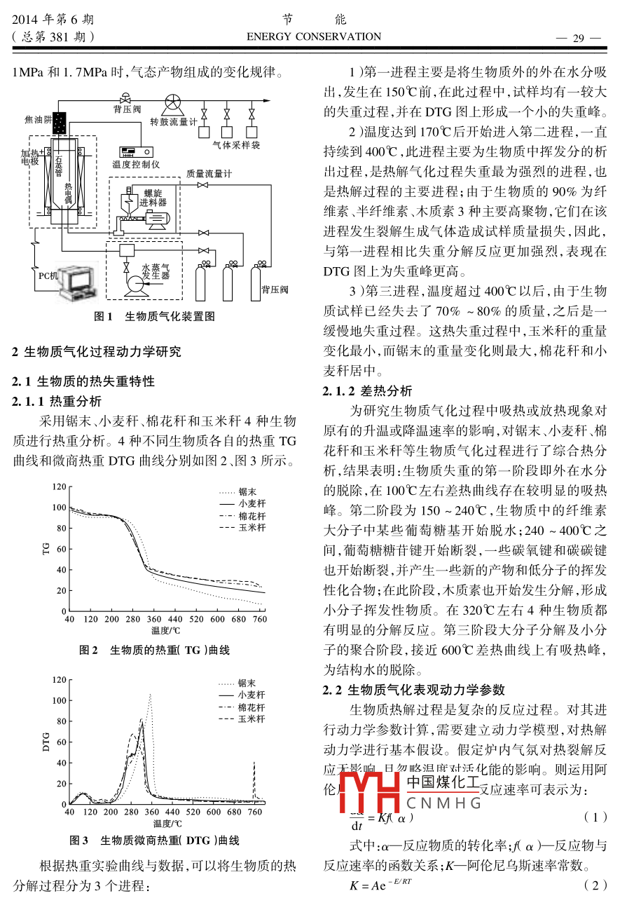 能2014年第6期ENERGY CONSERVATION(總第381期)生物質(zhì)熱解氣化特性分析邱新紅(唐山市科技情報(bào)研究所,河北唐山063000摘要:通過(guò)對(duì)玉米稈、小麥稈、棉花稈、稻草、松木屑等生物質(zhì)進(jìn)行熱重分析和差熱分析,分析了生物質(zhì)氣化過(guò)程的裂解機(jī)理。研究中采用松木屑作為氣化原料,得出了氣化溫度、壓力、水蒸氣加入量等反應(yīng)條件對(duì)氣化產(chǎn)物的產(chǎn)率、組成成分及焦油產(chǎn)率的影響規(guī)律,研究結(jié)杲表明,溫度對(duì)生物質(zhì)氣化的影響最大,當(dāng)溫度為800℃時(shí)氣體的產(chǎn)率最高。關(guān)鍵詞:生物質(zhì)氣化;熱解特性;動(dòng)力學(xué)中圖分類號(hào):TK6文獻(xiàn)標(biāo)識(shí)碼:A文章編號(hào):1004-7948(2014)6-0028-04doi:103969/j.issn.1004-7948.2014.06.007引言素分析儀測(cè)定。華北地區(qū)典型生物質(zhì)的元素分析結(jié)果如表2所示。在諸多生物質(zhì)利用方法中,生物質(zhì)氣化以其高表2生物質(zhì)元素分析及熱值效率、低成本、使用和運(yùn)輸方便等諸多優(yōu)點(diǎn)越來(lái)越LHV受到人們的關(guān)注。由于氣化過(guò)程是復(fù)雜的物理和物料%H%0%N%S/%/kJ·kg-1化學(xué)變化過(guò)程,生物質(zhì)原料的物理性質(zhì)、形狀的復(fù)雜草48.246.0544.800.750.1616897雜性決定了生物質(zhì)在氣化過(guò)程中熱傳導(dǎo)和不完全松木屑51.016.00420.080.01燃燒過(guò)程的復(fù)雜多變11氣化過(guò)程的復(fù)雜性使得稻草48.305.3045.500.810.0917636玉米稈49.306.0243.870.690.1217746生物質(zhì)氣化技術(shù)的開(kāi)發(fā)、后續(xù)氣化設(shè)備設(shè)計(jì)和制造棉花稈49.825.6843.620.670.2118089等存在一定的困難。為深入研究生物質(zhì)氣化機(jī)理小麥稈49.626.1143.590.620.0618563為生產(chǎn)和制造生物質(zhì)氣化設(shè)備提供參考,文中對(duì)我國(guó)典型生物質(zhì)的氣化特性進(jìn)行分析研究1.2熱重-差熱實(shí)驗(yàn)實(shí)驗(yàn)前,將樣品在自然條件下風(fēng)干,然后用粉1實(shí)驗(yàn)內(nèi)容碎機(jī)粉碎。粉碎后的原料顆粒直徑小于20μm。1.1生物質(zhì)基本燃料特性分析實(shí)驗(yàn)所用的儀器是德國(guó)耐馳儀器制造有限公司生1.1.1工業(yè)分析產(chǎn)的STA499C型常壓熱重分析儀。實(shí)驗(yàn)用生物質(zhì)選擇我國(guó)華北地區(qū)主要的農(nóng)作1.3生物質(zhì)氣化實(shí)驗(yàn)物秸稈、木屑、雜草等為研究對(duì)象,各種生物質(zhì)工業(yè)實(shí)驗(yàn)原料采用粉碎機(jī)粉碎成小于10mm,在分析的結(jié)果如表1所示。05℃溫度下烘干2h后備用。生物質(zhì)氣化反應(yīng)器表1生物質(zhì)工業(yè)分析值為實(shí)驗(yàn)室規(guī)模的加壓氣化裝置,如圖1所示物料揮發(fā)分固定碳灰分實(shí)驗(yàn)前,先將鼓風(fēng)干燥箱中的溫度設(shè)定為雜草(105±2)℃,并將物料放入其中干燥2h。實(shí)驗(yàn)過(guò)松木屑76.48程V凵中國(guó)煤化工的溫度和壓力后,進(jìn)料玉米稈器CNMHG穩(wěn)后在反應(yīng)器出口處棉花稈69.5518.25用氣袋收集氣體,此時(shí)的反應(yīng)參數(shù)等由計(jì)算機(jī)讀小麥稈5.44取。實(shí)驗(yàn)考察溫度在400~900℃對(duì)氣態(tài)產(chǎn)物組成1.1.2元素分析的影響,以50℃為增量,氣化劑為空氣,并考察在研究中實(shí)驗(yàn)物料的C、H、N、S、O含量采用元溫度不變(800℃),壓力分別為0.5MPa、0.8MPa2014年第6期(總第381期)ENERGY CONSERVATIONIMPa和1.7MPa時(shí),氣態(tài)產(chǎn)物組成的變化規(guī)律。1)第一進(jìn)程主要是將生物質(zhì)外的外在水分吸出,發(fā)生在150℃前,在此過(guò)程中,試樣均有一較大背壓閥的失重過(guò)程,并在DTG圖上形成一個(gè)小的失重峰。焦油轉(zhuǎn)鼓流量計(jì)2)溫度達(dá)到170℃后開(kāi)始進(jìn)入第二進(jìn)程,一直氣體采樣袋持續(xù)到400℃,此進(jìn)程主要為生物質(zhì)中揮發(fā)分的析溫度控制儀質(zhì)量流量計(jì)出過(guò)程,是熱解氣化過(guò)程失重最為強(qiáng)烈的進(jìn)程,也甲螺旋是熱解過(guò)程的主要進(jìn)程;由于生物質(zhì)的90%為纖維素、半纖維素、木質(zhì)素3種主要高聚物,它們?cè)谠撨M(jìn)程發(fā)生裂解生成氣體造成試樣質(zhì)量損失,因此,與第一進(jìn)程相比失重分解反應(yīng)更加強(qiáng)烈,表現(xiàn)在DTG圖上為失重峰更高。3)第三進(jìn)程,溫度超過(guò)400℃以后,由于生物圖1生物質(zhì)氣化裝置圖質(zhì)試樣已經(jīng)失去了70%~80%的質(zhì)量,之后是緩慢地失重過(guò)程。這熱失重過(guò)程中,玉米稈的重量2生物質(zhì)氣化過(guò)程動(dòng)力學(xué)研究變化最小,而鋸末的重量變化則最大,棉花稈和小麥稈居中。2.1生物質(zhì)的熱失重特性2.1.2差熱分析2.1.1熱重分析為研究生物質(zhì)氣化過(guò)程中吸熱或放熱現(xiàn)象對(duì)采用鋸末、小麥稈、棉花稈和玉米稈4種生物質(zhì)進(jìn)行熱重分析。4種不同生物質(zhì)各自的熱重TG原有的升溫或降溫速率的影響,對(duì)鋸末、小麥稈、棉花稈和玉米稈等生物質(zhì)氣化過(guò)程進(jìn)行了綜合熱分曲線和微商熱重DTG曲線分別如圖2、圖3所示。析,結(jié)果表明:生物質(zhì)失重的第一階段即外在水分鋸末的脫除,在100℃左右差熱曲線存在較明顯的吸熱小麥桿棉花桿峰。第二階段為150~240℃,生物質(zhì)中的纖維素大分子中某些葡萄糖基開(kāi)始脫水;240~400℃之g