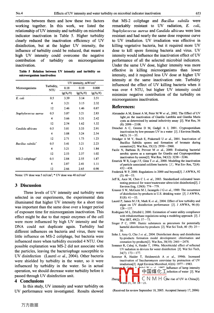ISSN 1001-0742Journal of Enwironmental Seiences Vol. 18, No. 4, pp.650- 653, 2006CN11- -2629/XArticle D: 101-07420604-0650-04CLC number: X703.1; X125Document code: AEffects of UV intensity and water turbidity on microbial indicatorinactivationLIU Wen-jun", ZHANG Yong-ji(Department of Environmental Science and Engnering, Tsinghua University, Beijing 10084, China. E-mail: wjiliu@tsinghua.edu.cn;zhangyongji@sohu. com)UV disinfection was effective in klling all the selected microbial indicators, the resistance order of the microorganisms was asfllows: MS-2 coliphage > Bacillus subilis > E. coli > Staphylococcus aureus and Candida albicans. UV intensity had influence on theinactivation of all the microorganisms, high UV disinfection eficency was obtained with higher UV intensity. Turbidity had impact onthe bacteria inactivation rate, but there was no evidence that turbidity had any negative contribution to MS-2 coliphage. Under thesame UV dosage, higher UV intensity could overcome the negative influence of turbidity on UV performance, enhanced microorg-anism inactivation effect in turbidity water.Keywords: UV disinfection; intensity; exposure time; microbial indicatorinfluencing UV performance, it may decrease the UVIntroductiontransmitance of the water and afect dose delivery, orDisinfection of drinking water with chlorine hasshield microorganisms from UV light, thus altering thebeen used for more than one hundred years for its lowcharacteristics of the dose response curve. UVcost and effective in killing water born pathogens,intensity and turbidity may have different effects onhowever, the production of trihalomethanes and thUV performance, however, few studies have evaluatedsurvival of chlorine-resistant microorganisms such asthe effects of the two factors influencing UVvirus, cryptosporidium and giardia oocysts areperformance together. In this study, differentobserved under ordinary condition of chlorinationmicrobial indicators were selected for its dose(Singer, 1999; Rodriguez and Drtofrd, 2000; Krasnerresponse to UV irradiation, the influence of irradiateet al., 1989; Alexander et al, 2002; Drescher et al.,intensity and turbidity on the inactivation efficiency2001). Ozone is known to be an effective disinfectantwas examined.for its capability of inactivation chlorine-resistant1 Materials and methodsmicroorganisms, but it will disappear rapidly throughautodecomposition to oxygen, another is that1.1 Low pressure UV irradiation system and ra-hazardous products such as aldehydes may bediometryproduced by the reaction of ozone and organicThe collimated beam apparatus was used for UVmaterials (Driedger et al, 2001; Sohn et al, 2004;disinfection experiment. A 40-W low pressureFacile et al, 2000). Ultraviolet (UV) irradiation is onemercury vapor germicidal lamps emitting mono-of the most practical disinfection methods in waterchromatic UV radiation at 253.7 nm was used in the .treatment because it can inactivate bacteria, viruses,experiment, it was directed through a circular openingbacterial spores and oocysts of protozoa (Frederick,to provide incident radiation perpendicular to the2000; Zhang, 2004; Sommer et al, 1996a). Thesurface of the test suspensions. UV irradiance wasefficiency of UV disinfection in water depends onmeasured with a radiometer and a UV detectormany factors, such as UV dose delivered to the(Beijing Normal University, UV-B). The measuredmicroorganisms, lamp envelope, ageing of lamp,incident irradiance at the surface of the test liquid wasconcentration of suspended solids and the thickness ofcorrected for non homogeneity of irradiation acrossthe fluid (Sommer et al, 1997; Emerick, 2000). UVthe surface area of the Petri dish to provide thedose is defined as the products of UV intensity andaverage incident iradiance. The average iradiance inexposure time as chemical disinfection concentrationthe mixed suspension was determined mathematicallyand time, it was thought that the same dose mayfrom an integration of the Beer-Lambert Law over theproduce the same ffect at different UV intensity, busample depth (effet al., 2003).some research showed that the same dose produced1.2 Turbidity water preparationdifferent results. Sommer et al. (1996a, b) found thatThe synthetic waters had various levels ofUV disinfection did not obey intensity and exposureinor中國煤化工was chosen as thetime rule, higher UV intensity would produce highertendency to swellinactivation effects. Turbidity is another factorYHCNMHGbelievedtobetheFoundation item: The Outstanding Doctoral Dissertation Foundation by China Ministry of Education (No. 200243); *Coresponding authorNo.4Effects ofUV intensity and water turtbidity on microbial indicator inactivation651representative of many natural water turbidity2.1 UV irradiation on microorganism inactiva-particles and a potential worst particle for shielding.tionDifferent amount of kaolin clay was seeded to steriledThe dose response curve for UV irradiation onwater, turbidity was measured with a HANNAdifferent microorganisms at a UV intensity of 0.10turbidity meter, before each use, the turbidity metermW/cm2 was evaluated (Fig.1). MS-2 coliphage andwas calibrated according to the manufacturer'sBacillus subtilis were more resistant than otherinstructions.microorganisms, only 2.4 and 3.1 lg(NJN) reduction1.3 Test organismswas achieved respectively at a UV dose of 40 mJ/cm2,E. coli 1.3373, Bacillus subtilis (ATCC 9372),and MS-2 was more UV resistant than BacillusStaphylococcus aureus (ATCC 6538), Candidasubtilis. Staphylococcus aureus and Candida albicansalbicans (ATCC 10231) were obtained from Micro-were susceptible to UV irradiation and had nearly thebiology School of Chinese Academy of Sciences,same response to UV irradiation, nearly 4.6 ofMS-2 coliphage 15597-B, and its host strain E. colilg(N/N) reduction was achieved at a UV dose of 10(ATCC 15597) was provided by Canadian GAPmJ/cm?. E. coli was more resistant than the other two,Microorganism Company. The growth me