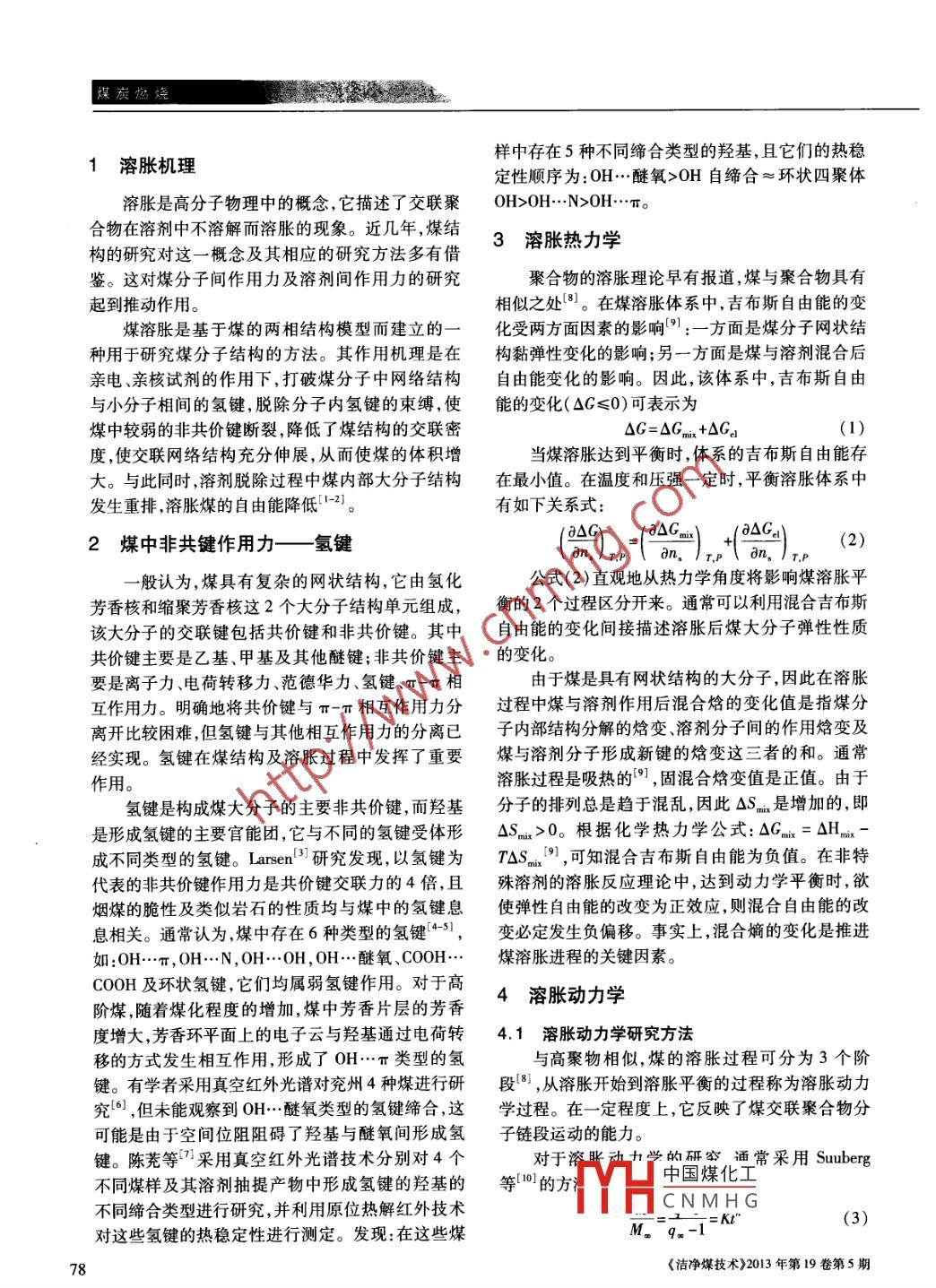 煤炭燃燒中國(guó)科技核心期刊礦業(yè)類核心期刊煤溶脹動(dòng)力學(xué)與熱力學(xué)的研究張曉娟,盛清濤!,申峻!,凌開(kāi)成21.太原理工大學(xué)化學(xué)化工學(xué)院,山西太原0300242.山西廣播電視大學(xué),山西太原030027)摘要:以煤溶脹機(jī)理、氫鍵等為基礎(chǔ),從熱力學(xué)和動(dòng)力學(xué)方面綜述了煤溶脹的本質(zhì),討論了溶劑性質(zhì)、氧化、溫度、煤粉粒度及熱處理對(duì)溶脹動(dòng)力學(xué)的影響。結(jié)果表明:溶脹過(guò)程中,表觀活化能和速率常數(shù)不僅與溶劑分子的空間屬性有關(guān),還受溶劑分子形狀的影響;混合溶劑的協(xié)同效應(yīng)極大地提升了溶脹速率,增大了表觀活化能;抽提煤的干燥條件不同及煤經(jīng)過(guò)氧化后,溶脹機(jī)理均會(huì)發(fā)生明顯改變。最后詳細(xì)介紹了煤溶脹技術(shù)對(duì)煤分子結(jié)構(gòu)的影響及在煤液化方面的應(yīng)用。關(guān)鍵詞:煤;溶脹;熱力學(xué);動(dòng)力學(xué);影響因素中圖分類號(hào):TQ531;TD849文獻(xiàn)標(biāo)識(shí)碼:A文章編號(hào):1006-6772(2013)05-0077-05Kinetics and thermodynamics of coal swellingZHANG Xiaojuan, SHENG Qingtao, SHEN Jun, LING Kaicheng(1. College of Chemistry and Chemical Engineering, Taiyuan University of Technology, Taiyuan 030024, China2. Shanxi Radio and TV University, Taiyuan 030027, China)Abstract: Based on the mechanism of coal swelling and hydrogen bond within the coal, introduce the nature of coalswelling from the aspects of kinetics and thermodynamics. Investigate the influence of solvents properties, oxidationtemperature, particle size and heat treatment on swelling kinetics. The results show that, dunng the swelling processapparent activation energy and rate constant are influenced by the steric properties and shape of solvent molecularThe synergistic effect of mixed solvent increase the swelling rate and apparent activation energy Drying condition ofextracted coal and oxidation of raw coal can transform swelling mechanism greatly. Introduce the application of coalswelling technology in coal molecular structure and coal liquefaction process studyKey words: coal; swelling; thermodynamics; kinetics; influencing factors煤結(jié)構(gòu)的研究是煤化學(xué)研究領(lǐng)域的主要內(nèi)容溶脹行為的研究是煤結(jié)構(gòu)研究的重要方法。煤溶之一,是煤利用與煤加工方法開(kāi)發(fā)的基礎(chǔ)。長(zhǎng)期以脹后,結(jié)構(gòu)發(fā)生變化從而改變了煤分子反應(yīng)性能。來(lái)煤結(jié)構(gòu)的研究沒(méi)有形成系統(tǒng)的理論體系但它對(duì)本文主要從煤溶脹的熱力學(xué)和動(dòng)力學(xué)機(jī)理出發(fā),研煤反應(yīng)機(jī)理、煤液化等方面的研究有促進(jìn)作用。煤究溶脹過(guò)程中動(dòng)力學(xué)的影響因素。收稿日期:2013-08-22責(zé)任編輯:宮在芹基金項(xiàng)目:國(guó)家自然科學(xué)基金資助項(xiàng)目(21076137);山西省回國(guó)留學(xué)人員基金(2012中國(guó)煤化工帶頭人資助項(xiàng)目(TYAL201)作者簡(jiǎn)介:張曉娟(198-),女,山西忻州人,碩士研究生,主要從事低階煤分子結(jié)構(gòu)的磯HHCNMH。妞訊作者:申峻。引用格式:張晚娟,盛清濤,申唆等煤溶脹動(dòng)力學(xué)與熱力學(xué)的研究[門潔凈煤技術(shù),2013,19(5)7-831,91張曉娟等:煤溶脹動(dòng)力學(xué)與熱力學(xué)的研究煤炭燃燒滾論1溶脹機(jī)理樣中存在5種不同締合類型的羥基,且它們的熱穩(wěn)定性順序?yàn)?OH…醚氧>OH自締合≈環(huán)狀四聚體溶脹是高分子物理中的概念,它描述了交聯(lián)聚OH>OH…N>OH…。合物在溶劑中不溶解而溶脹的現(xiàn)象。近幾年,煤結(jié)構(gòu)的研究對(duì)這一概念及其相應(yīng)的研究方法多有借3溶脹熱力學(xué)鑒。這對(duì)煤分子間作用力及溶劑間作用力的研究聚合物的溶脹理論早有報(bào)道,煤與聚合物具有起到推動(dòng)作用相似之處。在煤溶脹體系中,吉布斯自由能的變煤溶脹是基于煤的兩相結(jié)構(gòu)模型而建立的一化受兩方面因素的影響”:一方面是煤分子網(wǎng)狀結(jié)種用于研究煤分子結(jié)構(gòu)的方法。其作用機(jī)理是在構(gòu)黏彈性變化的影響;另一方面是煤與溶劑混合后親電、親核試劑的作用下,打破煤分子中網(wǎng)絡(luò)結(jié)構(gòu)自由能變化的影響。因此,該體系中,吉布斯自由與小分子相間的氫鍵,脫除分子內(nèi)氫鍵的束縛,使能的變化(△G≤0)可表示為煤中較弱的非共價(jià)鍵斷裂,降低了煤結(jié)構(gòu)的交聯(lián)密△G=△Gm+△Ga度,使交聯(lián)網(wǎng)絡(luò)結(jié)構(gòu)充分伸展,從而使煤的體積增當(dāng)煤溶脹達(dá)到平衡時(shí),體系的吉布斯自由能存大。與此同時(shí),溶劑脫除過(guò)程中煤內(nèi)部大分子結(jié)構(gòu)在最小值。在溫度和壓強(qiáng)一定時(shí),平衡溶脹體系中發(fā)生重排,溶脹煤的自由能降低2。有如下關(guān)系式:0△Oa△G0△G2煤中非共鍵作用力——?dú)滏I般認(rèn)為,煤具有復(fù)雜的網(wǎng)狀結(jié)構(gòu),它由氫化公式(2)直觀地從熱力學(xué)角度將影響煤溶脹平芳香核和縮聚芳香核這2個(gè)大分子結(jié)構(gòu)單元組成,衡的2個(gè)過(guò)程區(qū)分開(kāi)來(lái)。通??梢岳没旌霞妓乖摯蠓肿拥慕宦?lián)鍵包括共價(jià)鍵和非共價(jià)鍵。其中自由能的變化間接描述溶脹后煤大分子彈性性質(zhì)共價(jià)鍵主要是乙基、甲基及其他醚鍵;非共價(jià)鍵主的變化要是