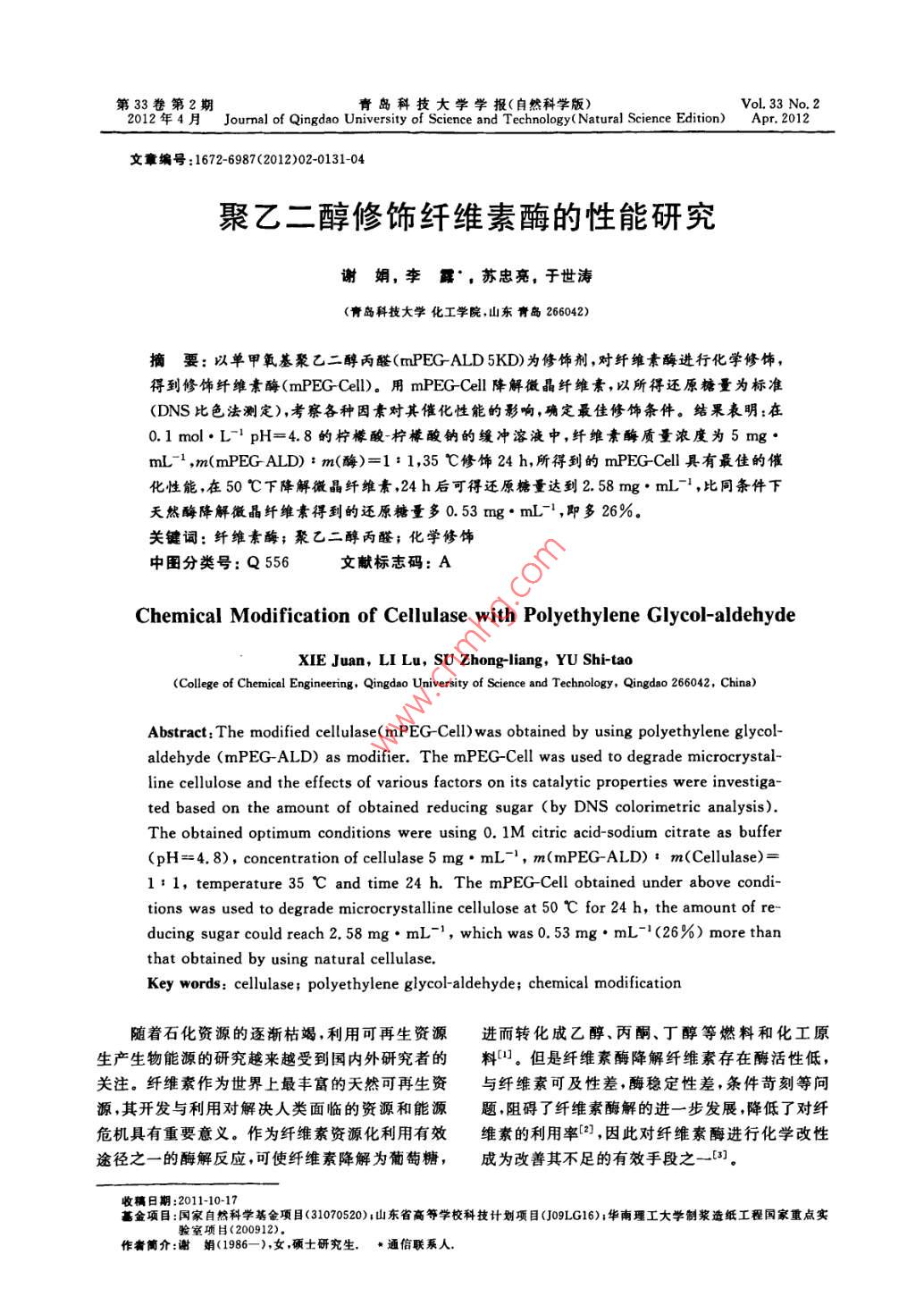 2012 Joumal期 of Qingdao Uni技大學學報自然科學 Vol. 33 No.2 nce and Technology( Natural Science Edition) Apr. 2012文章編號:1672-6987(2012)02-0131-04聚乙醇修飾纖維素酶的性能研究謝娟,李露蘇忠亮,于世濤(青島科技大學化工學院,山東青島266042)摘要:以單甲氧基聚乙二醇丙醛(mPEG-ALD5KD)為修飾劑,對纖維素酶進行化學修飾,得到修飾纖維素酶(mPEG-Cell)用mpe-Cll降解微晶纖維素,以所得還原糖量為標準(DNS比色法測定),考察各種因素對其催化性能的影響,確定最佳修飾條件。結果表明:在0.1mol·L-pH=4.8的檸檬酸-檸檬酸鈉的緩沖溶液中,纖維素酶質(zhì)量濃度為5mgmL-1,m(mPEG-ALD):m(酶)=1:1,35℃修飾24h,所得到的 mPEG-Cell具有最佳的催化性能,在50℃下降解微晶纖維素,24h后可得還原糖量達到2.58mg·mL,比同條件下天然酶降解微晶纖維素得到的還原糖量多0.53mgmL-,即多26%關鍵詞:纖維素酶;聚乙二醇丙醛;化學修飾中圖分類號:Q556文獻標志碼:A Chemical Modification of Cellulase with Polyethylene Glycol-aldehyde XIE Juan, LI Lu, SU Zhong-liang, YU Shi-tao (College of Chemical Engineering, Qingdao University of Science and Technology, Qingdao 266042. China) Abstract: The modified cellulase(mPEG-Cell)was obtained by using polyethylene glycol- aldehyde (mPEG-ALD) as modifier. The mPEG-Cell was used to degrade microcrystal- line cellulose and the effects of various factors on its catalytic properties were investiga- ted based on the amount of obtained reducing sugar( by DNS colorimetric analysis) The obtained optimum conditions were using 0. 1M citric acid-sodium citrate as buffer (pH=4.8), concentration of cellulase 5 mg.mL-I m(mPEG-ALD): m(Cellulase)= 1: 1, temperature 35 C and time 24 h. The mPEG-Cell obtained under above condi- tions was used to degrade microcrystalline cellulose at 50 C for 24 h, the amount of re- ducing sugar could reach 2. 58 mg. mL-', which was 0.53 mg. mL-I(26%)more than that obtained by using natural cellulase. Key words: cellulase; polyethylene glycol-aldehyde; chemical modification隨著石化資源的逐漸枯竭,利用可再生資源進而轉(zhuǎn)化成乙醇丙酮、丁醇等燃料和化工原生產(chǎn)生物能源的研究越來越受到國內(nèi)外研究者的料。但是纖維素酶降解纖維素存在酶活性低,關注纖維素作為世界上最豐富的天然可再生資與纖維素可及性差,酶穩(wěn)定性差,條件苛刻等問源,其開發(fā)與利用對解決人類面臨的資源和能源題阻礙了纖維素酶解的進一步發(fā)展,降低了對纖危機具有重要意義。作為纖維素資源化利用有效維素的利用率2,因此對纖維素酶進行化學改性途徑之一的酶解反應,可使纖維素降解為葡萄糖,成為改善其不足的有效手段之一收精日期:2011-10-17基金項目:國家自然科學基金項目(31070520)山東省高等學校科技計劃項目(J09LG16);華南理工大學制漿造紙工程國家重點實駿室項目200912作者簡介:謝娟(1986一),女,碩士研究生,通信聯(lián)系人132青島科技大學學報(自然科學版)第33卷目前國內(nèi)外對纖維素酶化學改性的研究比較1.3實驗方法少有研究者采用聚氧乙烯馬來酸酐聚合物聚1.3.1化學修飾方法乙二醇和順丁烯二酸酐、三聚氯氰活化聚乙二醇在裝有溫度計、冷凝管、轉(zhuǎn)子的50mL三口(PEG)和單甲氧基聚乙二醇(mPEG)焦碳酸二瓶中加入15mL一定pH的檸檬酸檸檬酸鈉緩乙酯和碳二亞胺對纖維素酶進行修飾,以上方?jīng)_溶液。設定一定溫度,待溫度穩(wěn)定后加入相應法存在活化劑毒性大、步驟繁瑣、修飾酶不穩(wěn)定等量酶粉,慢速攪拌溶解。稱取相應量修飾劑缺點。聚乙二醇類修飾劑現(xiàn)多用于藥物修飾,普(mpeg-ald)計時,混合均勻,再加入相應量還遍取得較好效果,與其它聚乙二醇類修飾劑相原劑(NaCNBH33)攪拌溶解,使終濃度保持在20比,單甲氧基聚乙二醇丙醛(mPEG-ALD)對蛋白mmol·ml-反應一定時間,加入3.0g甘氨質(zhì)N末端氨基的選擇性高,反應pH范圍較寬,酸終止反應30min透析過夜,得到修飾酶液對蛋白質(zhì)活性影響較小10,修飾產(chǎn)物均一性較(mpeg-Cell)高,有利于修飾產(chǎn)物的質(zhì)量控制。因此,本研究嘗1.3.2修飾酶活性測定試用單甲氧基聚乙二醇丙醛為修飾劑對酸性纖維按文獻[11]繪制標準葡萄糖曲線,用于換算素酶進行化學修飾,以期提高纖維素酶的穩(wěn)定性吸光度值對應的還原糖量進而提高其催化活性。以降解微晶纖維素為模型取15mL修飾酶液,加入0.30g微晶纖維素反應,明確修飾條件對酶活性的影響。(20gL-1),50℃下降解1h,采用DNS顯色法1實驗部分檢測對應吸光度A值,根據(jù)標準葡萄糖曲線換算成相應還原糖量,衡量不同修飾條件得到的修飾1.1材料與儀器酶降解微晶纖維素的效果,以確定最佳修飾條件。單甲氧基聚乙二醇丙醛(mPEG-ALD)5KD,北京凱正生物工程有限公司;氟基硼氫鈉2結果與討論(NaCNBH3),阿拉丁試劑;微晶纖維素(MCC),2.1修飾溫度對mpeg-cell催化活性的影響成都科隆化工試劑廠;纖維素酶,上海源葉生物科在pH=4.8的檸檬酸-檸檬酸鈉緩沖溶液技公司;透析袋,美國Aikb公司;3,5-二硝基水楊中,酶質(zhì)量濃度3mg·mL-1,m(mPEG-ALD):酸、檸檬酸、檸檬酸鈉、甘氨酸、EDTA、碳酸氫鈉m(酶)=1:1,修飾24h的條件下,考察不同修等試劑均為分析純。飾溫度對纖維素酶修飾效果的影響,結果見圖1.紫外光度計,UV755B型,上海精密科學儀器有限公司。2.71.2修飾反應原理2.42單甲氧基聚乙二醇丙醛與蛋白質(zhì)分子N端1.8的氨基通過曼尼希反應生成希夫堿,經(jīng)氰基硼氫151.2鈉(NaCNBH3)還原形成比較穩(wěn)定的亞胺連接體。畫09反應式如下:0.60