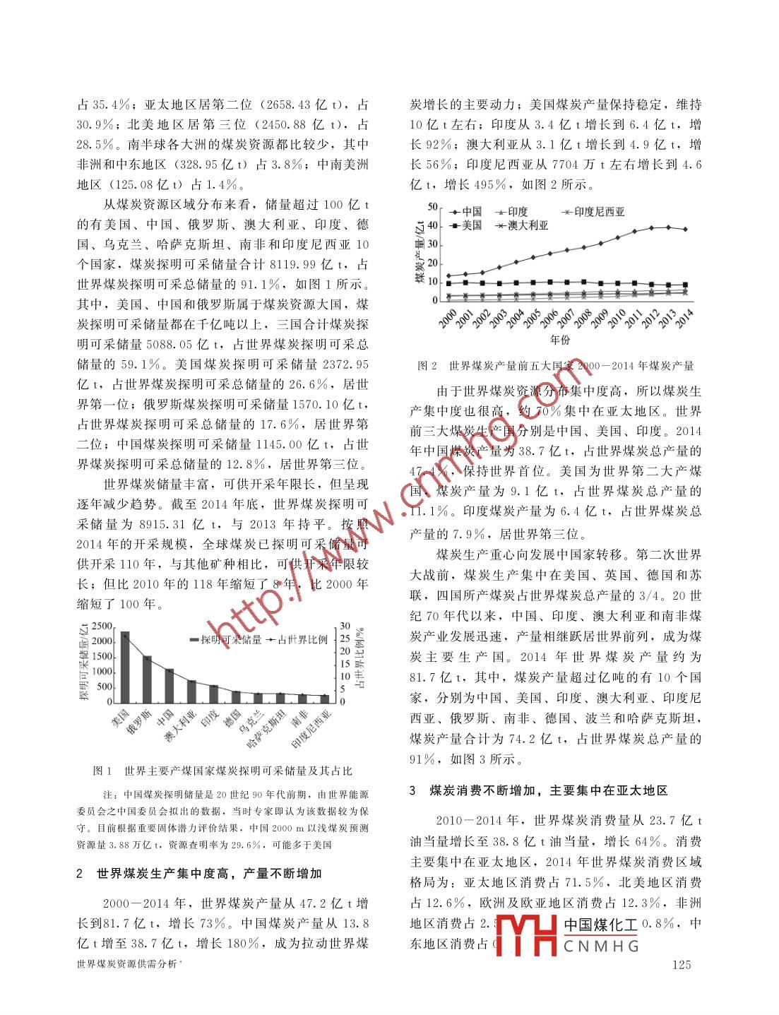 ★世界煤炭★世界煤炭資源供需分析*郭涓' 李維明2 么曉穎3(1.國土資源部信息中心,北京市西城區(qū),100812;2.國務(wù)院發(fā)展研究中心資源與環(huán)境政策研究所,北京市東城區(qū),100010;3.中國農(nóng)業(yè)銀行總行,北京市東城區(qū),100005)摘要世界煤炭儲量豐富,可供開采年限長,已探明可采儲量可供開采110年。煤炭資源分布集中,90%以上分布在北半球。2000 年以來,伴隨世界經(jīng)濟的發(fā)展,煤炭生產(chǎn)和消費保持較快增長,且消費和貿(mào)易的重心不斷向亞太地區(qū)轉(zhuǎn)移。同時受油氣資源分布的區(qū)域性不平衡以及運輸管道的限制,煤炭消費在一次能源中的份額區(qū)城差別很大。但隨著煤炭價格一路走低,區(qū)城間的價差逐漸縮小。關(guān)鍵詞世界煤炭 探明可采儲量生產(chǎn)集中度 能源消費構(gòu)成中圖分類號F416. 21文獻標(biāo)識碼ASupply and demand analysis of global coal resourceGuo Juan',Li Weiming”,Yao Xiaoying'(1. Information Center of Ministry of Land and Resources of People's Republicof China, Xicheng,Beijing 100812, China;2. Research institution of Resource and Policy, Development Research Centerof the State Council, Dongcheng, Beijing 100010,China;3. Agricultural Bank of China, Dongcheng, Beijing 100005, China)Abstract Global coal reserve is rich and available to mine a long time, particularly, theproved exploitable reserve is available to mine 110 years. There is 90% Coal reserve centralizeddistributes in the northern hemisphere. Since 2000, with development of world economy, coalproduction and consumption kept growing rapidly and the consumption and trade center shifted to .the Asia- Pacific region, meanwhile, consumption of coal had a great different on portions of pri-mary energy source in different regions because of oil and regional unbalance limitation of gas re-source distribution and pipeline limitation, however, with coal price were going down all theway,the regional gap were going to narrow.Key words world coal, proved exploitable reserve, concentration ratio of production, con-struction of energy consumption的第三紀(jì),是地史上最主要的聚煤期。從資源分布1世界煤炭資源分布集中看,煤炭分布相對比較集中,90%分布在北半球,煤炭是世界_上儲量最豐富的化石能源。古生代北緯30°~70°之間是世界上最主要的聚煤帶,占世的石炭紀(jì)、二疊紀(jì),中生代的侏羅紀(jì),以及新生代界煤炭資源的70%以上,尤其集中在北半球的中溫帶和亞寒帶地區(qū)。*基金項目:中國地質(zhì)調(diào)查局“礦產(chǎn)資源勘查與開發(fā)各大洲相比,北半球的三大洲煤炭資源都比較信息監(jiān)測與分析”工作項目資助(12120113027500), 中國豐富,煤炭資源量占世界90%以卜.已探明煤炭資地質(zhì)調(diào)查局“礦產(chǎn)資源管理形勢分析與決策支持”子項目源量中,歐洲及中國煤化工6.04億t),“大宗礦產(chǎn)品供需分析及預(yù)測”資助(12120113027600)YHCNMHG124中國煤炭第41卷第12期2015年12月占35.4%; 亞太地區(qū)居第二位(2658.43億t), 占炭增長的主要動力;美國煤炭產(chǎn)量保持穩(wěn)定,維持30.9%;北美地區(qū)居第三位(2450.88 億t),占10億t左右;印度從3.4億t增長到6.4億t,增28.5%。南半球各大洲的煤炭資源都比較少,其中長92%;澳大利亞從3.1億t增長到4.9億t,增非洲和中東地區(qū)(328.95億t) 占3.8%;中南美洲長56%;印度尼西亞從7704萬t左右增長到4.6地區(qū)(125.08億t) 占1. 4%。億t,增長495%,如圖2所示。從煤炭資源區(qū)域分布來看,儲量超過100億t50p. +中國←印度女印度尼西亞的有美國、中國、俄羅斯、澳大利亞、印度、德過40美國*澳大利亞國、烏克蘭、哈薩克斯坦、南非和印度尼西亞10間30個國家,煤炭探明可采儲量合計8119.99億t,占據(jù)20世界煤炭探明可采總儲量的91.1%,如圖1所示。類10其中,美國、中國和俄羅斯屬于煤炭資源大國,煤炭探明可采儲量都在千億噸以上,三國合計煤炭探明可采儲量5088.05億t,占世界煤炭探明可采總.年份儲量的59.1%。美國煤炭探明可采儲量2372.95圖2世界煤炭產(chǎn)量前五大國家2000-2014年煤炭產(chǎn)量億t,占世界煤炭探明可采總儲量的26. 6%,居世由于世界煤炭資源分布集中度高,所以煤炭生界第一位;俄羅斯煤炭探明可采儲量1570.10億t,產(chǎn)集中度也很高,約70%集中在亞太地區(qū)。世界占世界煤炭探明可采總儲量的17.6%,居世界第前三大煤炭生產(chǎn)國分別是中國、美國、印度。2014二位;中國煤炭探明可采儲量1145.00億t,占世年中國煤炭產(chǎn)量為38.7億t,占世界煤炭總產(chǎn)量的界煤炭探明可采總儲量的12. 8%,居世界第三位。47. 4%,保持世界首位。美國為世界第二大產(chǎn)煤世界煤炭儲量豐富,可供開采年限長,但呈現(xiàn)國,煤炭產(chǎn)量為9.1億t,占世界煤炭總產(chǎn)量的逐年減少趨勢。截至2014年底,世界煤炭探明可11. 1%。印度煤炭產(chǎn)量為6.4億t,占世界煤炭總采儲量為8915.31億t,與2013年持平。按照產(chǎn)量的7.9%,居世界第三位。2014年的開采規(guī)模,全球煤炭已探明可采儲量可煤炭生產(chǎn)重心向發(fā)展中國家轉(zhuǎn)移。第二次世界供開采110年,與其他礦種相比,可供開采年限較大戰(zhàn)前,煤炭生產(chǎn)集中在美國、英國、德國和蘇長;但比2010年的118年縮短了8年,比2000年聯(lián),四國所產(chǎn)煤炭占世界煤炭總產(chǎn)量的3/4。20世縮短了100年。紀(jì)70年代以來,中國、印度、澳大利亞和南非煤過2500福2000-探明可采儲量←占世界比例25量炭產(chǎn)業(yè)發(fā)展迅速,產(ch