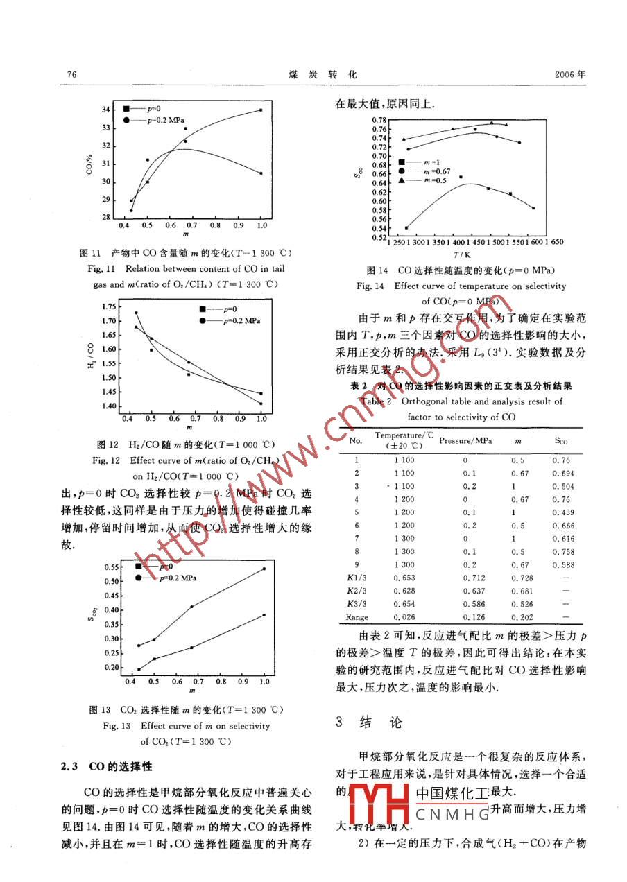 第29卷第4期Vol, 29 No, 42006年10月COAL CONVERSIONOct.2006非催化加壓甲烷部分氧化制合成氣任國良1)董根全?李小蓓1崔富梅》吳建慧3曹立仁4李永旺4摘要考察了非催化條件下,溫度、壓力和進(jìn)氣配比對(duì)甲烷部分氧化制合成氣的影響,結(jié)果表明:甲坑的轉(zhuǎn)化率隨溫度的升高,壓力的增加,進(jìn)氣中氧的增加而增加;產(chǎn)物中合成氣含量隨溫度的升高而增加,最高達(dá)81%以上;隨著溫度的升高,產(chǎn)物中H2/CO存在極值,在本實(shí)驗(yàn)的研究范圍內(nèi),最大可達(dá)1.8;進(jìn)氣中氧增多,產(chǎn)物中H2/CO減小;溫度升高,或壓力增大,CO2的選擇性也隨之提高.對(duì)CO選擇性的正交分析表明,進(jìn)氣配比對(duì)CO選擇性影響最大,壓力次之,溫度的影響關(guān)鍵詞甲烷,部分氧化,無催化,壓力,配比中圖分類號(hào)TQ221.1+1穩(wěn)定性、壽命、抗積碳能力或經(jīng)濟(jì)性仍然達(dá)不到工業(yè)0引言要求.為此,本實(shí)驗(yàn)室從工藝角度出發(fā),系統(tǒng)考察了無催化條件下溫度、壓力、進(jìn)氣配比等工藝條件對(duì)隨著石油資源的日趨緊張,進(jìn)一步開發(fā)利用天甲烷部分氧化制合成氣的影響,這些研究避開了催然氣(90%以上為甲烷)資源越來越受到人們的關(guān)化劑難題,有助于甲烷部分氧化制合成氣早日實(shí)現(xiàn)注.從現(xiàn)有探明儲(chǔ)量和消費(fèi)速度來看,全世界石油資工業(yè)化源只夠使用40年,而天然氣資源可夠用60年.據(jù)專家預(yù)測到21世紀(jì)中葉,天然氣在世界能源結(jié)構(gòu)1實(shí)驗(yàn)部分中所占比例將從現(xiàn)在的25%上升到40%左右,而石油將由現(xiàn)在的34%下降至20%.2能源結(jié)構(gòu)的變化1.1反應(yīng)原理必然導(dǎo)致能源利用和消費(fèi)結(jié)構(gòu)的變化,因此開發(fā)利非催化甲烷部分氧化制合成氣的反應(yīng)方程為用天然氣將具有非常廣闊的前景.目前來說,天然氣CH4+0.5O2=CO+2H除可直接用作燃料外,還可以作為高效、優(yōu)質(zhì)、清潔△H298=-37.5kJ/mol(1)的能源和化工燃料.甲烷的化工利用主要是兩種途這一反應(yīng)過程很復(fù)雜,包含多個(gè)副反應(yīng),如:徑:即直接轉(zhuǎn)化和間接轉(zhuǎn)化.直接轉(zhuǎn)化法是將甲烷直CH4+2O2→CO2+2H2O接轉(zhuǎn)化為乙烯、甲醇、甲醛、氯代甲烷等化工原料,間△H29=-802kJ/mol(2)接轉(zhuǎn)化法是先將甲烷轉(zhuǎn)化為合成氣,再由合成氣制CH,+H,O=CO+3H2備甲醇、汽油、柴油等液體燃料和合成氨等△H28=+206.1kJ/mol(3)甲烷制合成氣有三條途徑:即水蒸氣重整、二氧CH,+CO2 +2C0-+2H化碳重整和甲烷部分氧化.其中已經(jīng)工業(yè)化的△H298=247.3kJ/mol(4)方法為蒸氣重整法,進(jìn)而發(fā)展了龐大的合成氨和甲CO+H2O-CO2+H醇工業(yè).其中甲烷部分氧化反應(yīng)(CH4+0.50241.2 kJ/molCO+2H2)是近十幾年來的研究熱點(diǎn)目前的研式中:總反應(yīng)為體積增大的溫和放熱反應(yīng),反應(yīng)(2)究工作主要集中在催化劑方面,使得催化劑各個(gè)為燃燒反應(yīng),反應(yīng)(3)、反應(yīng)(4)均為吸熱反應(yīng),反應(yīng)方面的性能有了長足的進(jìn)步.但是由于目前甲烷部(5)為水煤氣變換反應(yīng)燃燒反應(yīng)生成大量的熱,并分氧化制合成氣催化劑使用過程中的活性選擇性、被吸中國煤化工中國科學(xué)院山西煤炭化學(xué)研究所創(chuàng)新基金資助項(xiàng)目(06SC7919C1)CNMHG1)碩士生;2)博士、副研究員;3)工程師;4)研究員,中國科學(xué)院山西煤炭化學(xué)研究所,030001太原收稿日期:2006-05-17;修回日期:2006-0622任國良等非催化加壓甲烷部分氧化制合成氣反應(yīng)的平衡常數(shù)見表1表1不同溫度下反應(yīng)的平衡常數(shù)Table 1 Equilibrium constant of reacts indifferent temperatureT/KReaction 1 Reaction 3 Reaction 4 Reaction 5XHOHExhaust10003.383E+113,275E+011.957E+011.67310502.921E+111.161E+028.530E+011.36111002.556E+113.667E+023.253E+021.12711502.263E+111.048E+031,104E+030.950圖1反應(yīng)流程圖12002.023E十112.745E+033.384E+030.811Fig 1 Schematic diagram of the12501.826E+116.657E+039.483E+030.702experimental apparatus13001.660E+111.508E+042.455E+040.614Methane gas cylinder: 2-Oxygen gas cylinder13501.521E+113.215E+045.924E+040.5433— Mass-flow controller;4— Pressure gage;14001.401E+116.493E+041.342E+050.48414501.299E+111.249E+052.874E+050.435Gas chromatograph15001.210E+112.302E+055.851E+050.39315501.132E+114.076E+051.137E+060.358COg16001.064E+116.964E+052.121E氧化碳收率:2c=CHm+CO+COz從表1可知,水煤氣變換反應(yīng)的平衡常數(shù)很小氧化碳收率:YC溫度對(duì)其平衡常數(shù)的影響很大,因此實(shí)驗(yàn)溫度的選CHat +Coout +CO2擇很重要.在其他條件一定的情況下,不同的溫度可以生成不同的H2/CO氫氣選擇性:SH2=XcH12實(shí)驗(yàn)裝置及條件合成氣收率Ym=3(CH+c0+5Y反應(yīng)器爐膛內(nèi)徑120mm,高度400mm,噴嘴氧化碳選擇性:Sc=xch為環(huán)流式,中心氣路為甲烷,環(huán)路為氧氣.反應(yīng)流程見圖1.甲烷、氧氣進(jìn)氣壓力0.3MPa,采用常溫下氧化碳選擇性:Sm2=x進(jìn)氣.反應(yīng)器外加電加熱裝置,通過自控系統(tǒng)自動(dòng)調(diào)整電加熱功率,調(diào)節(jié)反應(yīng)器壁的溫度,通過反應(yīng)器壁2結(jié)果與討論溫度和進(jìn)氣量的調(diào)整,達(dá)到控制反應(yīng)溫度的目的.進(jìn)氣采用質(zhì)量流量計(jì)控制,達(dá)到不同的配比m(m=1溫度的影響O2/CH4).主要反應(yīng)條件為:溫度1000℃~1300℃,壓力0~0.2MPa,反應(yīng)計(jì)量比m=0.