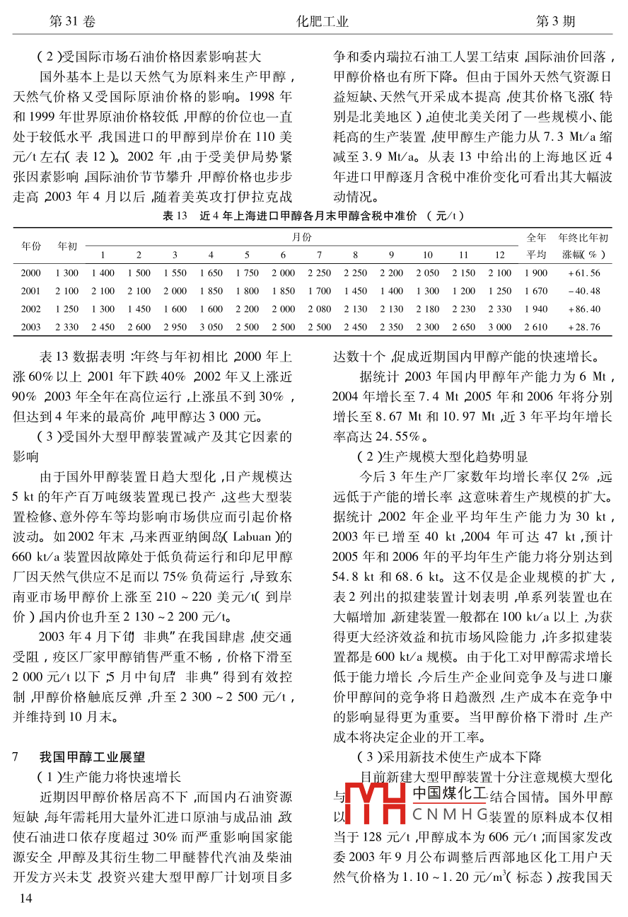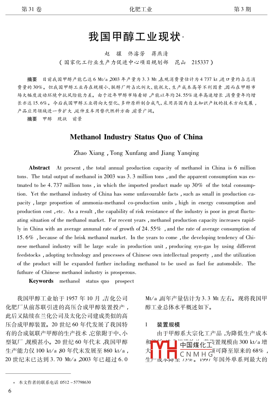 第31卷化肥工業(yè)第3期我國甲醇工業(yè)現狀趙驤佟濬芳蔣燕清國家化工行業(yè)生產力促進中心項目規(guī)劃部昆山215337)摘要目前我國甲醇產能已達6Mta2003年產量為3.3Mt表觀消費量估計為4737kt進口量約占總消費量的30%。但我國甲醇工業(yè)存在規(guī)模小聯醇廠所占比例大、能耗大、生產成本高等不利因素,因而在甲醇市場大幅度波動環(huán)境中抗風險能力差。由于近年甲醇市場看妤,產能以年均24-.5%速率髙速增長消費量年均増長亦達15.6%。今后我國甲醇工業(yè)將向大型化、多種原料制合成氣、采用具國內自主知識產權的技術方向發(fā)展產品應用領域進一步擴大延伸至車用替代燃料方面,前景廣闊。摘要甲醇現狀前景Methanol Industry Status Quo of ChinaZhao Xiang Tong Xunfang and Jiang YanqinAbstract At present the total annual production capacity of methanol in China is 6 milliontons. The total output of methanol in 2003 was 3. 3 million tons and the apparent consumption was es-tmated to be 4. 737 million tons, in which the imported product made up 30 of the total consump-tion. Yet the methanol industry of China has some unfavourable facts such as small in production capacity large proportion of ammonia-methanol co-production units, high in energy consumption andproduction cost etc. As a result the capability of risk resistance of the industry is poor in great fluctuating situation of the methanol market. For recent years, methanol production capacity increases rapidly in China with an average annunal rate of growth of 24. 55%, and the rate of average consumption of15.6%, because of the brisk methanol market. In the years to come the developing tendency of Chinese methanol industry will be large scale in production unit, producing syn-gas by using differentfeedstocks adopting technology and processes of Chinese own intellectual property and the utilizationof the product will be expanded further including methanol to be used as fuel for automobile. Thefuthure of Chinese methanol industry is prosperousKeywords methanol status quo prospect我國甲醇工業(yè)始于1957年10月,吉化公司Mta而年產量估計為3.3Mt左右?,F將我國甲化肥廠從前蘇聯引進的高壓合成甲醇裝置投產醇工業(yè)總體水平概述如下。此后又陸續(xù)在蘭化公司及太化公司建成類似的高壓合成甲醇裝置。20世紀60年代發(fā)展了我國特1裝置規(guī)模有的合成氨聯產甲醇的生產技術它依附于中、小由于甲醇系大宗化工產品,為降低生產成本型氨廠規(guī)模甚小。20世紀60年代末我國甲醇中國煤化工置規(guī)模由300a增生產能力僅100kta80年代末發(fā)展至860kt/a,CNMHG可降至原來的68%20世紀末已達到3.70M/a2003年已超過6.0生一成小陽里13%。1/年國外單系列最大的本文作者的聯系電話0512-57798630第31卷化肥工業(yè)第3期甲醇生產裝置規(guī)模為830kt/a1999年世界最大表1國內主要甲醇生產企業(yè)的甲醇制造廠商 Methanex公司在智利的蓬塔阿生產能力kt/a)生產企業(yè)雷納斯 Punta arenas)建成975kt/a裝置并在卡2003年2004年2005年塔爾的拉菲坦角( Ras laffan)同時建3套1.0Mt上海焦化有限公司a裝置且分別于2002、2004及2006年投產滯坦四川維尼綸廠甲醇( Titan methanol)公司在特立尼達與多巴哥榆林天然氣化工廠大慶油田甲醇廠興建的1.75Mt/a裝置已于2003年11月試車內蒙古蘇里格天然氣化工公司成為世界上已建成的最大裝置洢朗國家石油化哈爾濱氣化廠學公司建設的1.65MUa裝置計劃在2004年第吐哈油田鄯善甲醇廠季度投產。充礦魯南化肥廠相比之下我國甲醇裝置規(guī)模要小得多2000山西豐喜肥業(yè)公司年我國甲醇生產總能力為3.70Mt全國共有生產青海油田格爾木煉油廠個業(yè)186家,平均規(guī)模不到20kt/a,平均產量僅中原氣化遂平化工廠10680t而聯醇廠占總能力的64%其平均規(guī)模四川江油甲醇廠不到15kta2000年平均產量僅6550t。山西原平化工公司長慶油田甲醇廠100我國已建成的最大單系列裝置為上海焦化有浙江衢化公司限公司的200k/a甲醇裝置,目前又建成1套中原化工公司甲醇廠150kt/a裝置。該企業(yè)總能力已達350kt/a是全山東恒通化工公司國最大的甲醇生產企業(yè)。齊魯石化公司化肥廠我國現有100kt/a以上規(guī)模的甲醇生產企業(yè)河南尉氏化工總廠共17家80kt/a規(guī)模6家國內主要甲醇生產企河南煤氣集團公司義馬氣化廠業(yè)如表1所示。石家莊新化公司截止至2003年底我國較大的甲醇生產廠家河南淇縣華源化工公司總產能已達3.23Mt/a,已占全國甲醇產能的3/湖南湘氮集團公司8080804改變了原有裝置規(guī)模過小、能耗高、缺乏市場競安徽臨泉化工公司計323038904130爭能力的狀況。目前國內還有一些廠家正在籌建或申請建設大型甲醇生產裝置國內擬建100k力接近200kta其中長春化工公司以天然氣為a以上規(guī)模甲醇裝置情況見表2原料,采用ICI工藝生產能力為66k/a;李長榮此外報道的擬建項目還有內蒙古伊化集團化工公司亦以天然氣為原料,采用 lurgi工藝生總公司265kt/a)盤錦化工公司100kt/a)包產能力為60kta;中國石化開發(fā)公司則以重油頭天然氣化工基地(300kt/a)山西陽曲能源開為原料亦采用Iurg工藝能力為66kt/a發(fā)公司(300kt/a)西安華榆化工公司(600kta)山西現代煤產業(yè)公司200k/a)云南煤化工2原料結構基地(1.6Mt/a)等。國外基本上都是以天然氣為原料制取甲醇據2003年11月在海南召開的2003甲醇及下不同地區(qū)天然氣價格差異甚大如中東的沙特阿游產品市場論壇”上化工貿易副總裁所作的中國拉伯天然氣價格為0.5美
