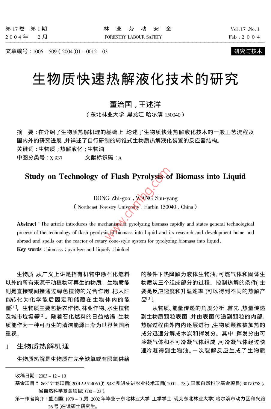 第17卷第1期林業(yè)勞動安全Vol 17 No. 12004年2月FORESTRY LABOUR SAFETYFeb,2004文章編號:1006-509(2004)1-0012-03研究與技術(shù)生物質(zhì)快速熱解液化技術(shù)的研究董治國,王述洋東北林業(yè)大學(xué)黑龍江哈爾濱150040)摘要:在介紹了生物質(zhì)熱解機(jī)理的基礎(chǔ)上論述了生物質(zhì)快速熱解液化技術(shù)的一般工藝流程及國內(nèi)外的研究進(jìn)展并詳述了自行研制的轉(zhuǎn)錐式生物質(zhì)熱解液化裝置的反應(yīng)器結(jié)構(gòu)。關(guān)鍵詞:生物質(zhì);熱解液化;生物油中圖分類號:X937文獻(xiàn)標(biāo)識碼:AStudy on Technology of Flash Pyrolysis of Biomass into LiquidDONG Zhi-guo WANG Shu-yangNortheast Forestry University Harbin 150040, ChinaAbstract: The article introduces the mechanism of pyrolyzing biomass rapidly and states general technologicalprocess of the technology of flash pyrolysis of biomass into liquid and its research and development home andabroad and spells out the reactor of rotary cone-style system for pyrolyzing biomass into liquidKey words: biomass i pyrolyze and liquefy i biofuel生物質(zhì)從廣義上講是指有機(jī)物中除石化燃料的條件下熱降解為液體生物油、可燃?xì)怏w和固體生以外的所有來源于動植物可再生的物質(zhì)。生物質(zhì)能物質(zhì)炭三個組成部分的過程??刂茻峤獾臈l件(主則是直接或間接通過綠色植物的光合作用把太陽要是反應(yīng)速度和升溫速率)可以得到不同的熱解產(chǎn)能轉(zhuǎn)化為化學(xué)能后固定和儲藏在生物體內(nèi)的能品3量1。生物質(zhì)主要包括農(nóng)作物、林業(yè)作物、水生植物從物質(zhì)、能量傳遞的角度分析,首先熱量傳遞及城市垃圾等2。隨著石化燃料的日益枯竭生物到生物質(zhì)顆粒表面,并由表面?zhèn)鬟f到顆粒的內(nèi)部。質(zhì)能作為一種可再生的清潔能源日漸為世界各國所熱解過程由外向內(nèi)逐層進(jìn)行生物質(zhì)顆粒被加熱的重視。成分迅速分解成木炭和揮發(fā)分。其中揮發(fā)分由可生物質(zhì)熱解機(jī)理冷凝氣體和不可冷凝氣體組成可冷凝氣體經(jīng)過快速冷凝得到生物油。一次裂解反應(yīng)生成了生物質(zhì)生物質(zhì)熱解是生物質(zhì)在完全缺氧或有限氧供給收稿日期:2003-12-10基金項(xiàng)目“863"計(jì)劃項(xiàng)目2001A514060X948”引進(jìn)先進(jìn)農(nóng)業(yè)技術(shù)項(xiàng)目(2001-28)國家自然科學(xué)基金項(xiàng)目(30170758)省自然科學(xué)基金項(xiàng)目(oO0-23第一作者簡介:董治國1979-)男200年畢業(yè)于東北林業(yè)大學(xué)工學(xué)學(xué)士現(xiàn)為東北林業(yè)大學(xué)哈爾濱市動力區(qū)和興路204年2月生物質(zhì)快速熱解液化技術(shù)的研究炭、一次生物油和不可冷凝氣體。在多孔生物質(zhì)顆生的氣態(tài)產(chǎn)物,以抑制二次裂解反應(yīng)的發(fā)生3-5粒內(nèi)部的揮發(fā)分將進(jìn)一步熱解稱為二次熱解反應(yīng)。快速熱解則就很好地解決了停留時間問題在極短生物質(zhì)熱解過程最終形成生物油、不可冷凝氣體和的時間內(nèi)使生物質(zhì)顆粒迅速熱解,又在極短的時間生物質(zhì)炭3如圖1)反應(yīng)器內(nèi)的溫度越高且氣態(tài)內(nèi)把熱解產(chǎn)物驟冷所以在很大程度上不但抑制了產(chǎn)物的停留時間越長,二次裂解反應(yīng)則越為嚴(yán)重。中間產(chǎn)物的發(fā)生而且避免了二次裂解從而最大限為了得到高產(chǎn)率的生物油,需快速移走一次熱解產(chǎn)度地增加了液態(tài)生物燃油的產(chǎn)量3。不可冷凝氣體熱重生物質(zhì)一一可冷凝氣體」生物油不可冷凝氣體生物質(zhì)二次裂解次氣體二次裂解二次生物油次生物油生物質(zhì)炭二次氣體圖1生物質(zhì)熱解過程示意圖2一般工藝流程得油率必須對分離后的熱解蒸氣進(jìn)行快速冷卻。生物油的收集生物質(zhì)熱解反應(yīng)器的設(shè)計(jì)除需從上面的生物質(zhì)熱解機(jī)理的分析中不難看出,要對溫度進(jìn)行嚴(yán)格控制外還應(yīng)在生物油的收集過無論采用何種方式熱解液化,它們的工藝流程應(yīng)該程中避免由于生物油的多種重組成分的冷凝而導(dǎo)致具有相似性。一般工藝流程如下反應(yīng)器堵塞。先將各種農(nóng)業(yè)秸桿、廢木材枝丫等較大的固體生物3生物質(zhì)快速熱解夜化技術(shù)的研究進(jìn)展質(zhì)破碎至類似工藝木片的尺度。3.1國外的研究進(jìn)展干燥為減少最終產(chǎn)物——生物油中的含水生物質(zhì)快速熱解液化技術(shù)在20世紀(jì)80年代以量必須對原料進(jìn)行干燥處理。一般將原料的含水后取得了很大進(jìn)展。國際能源署組織了加拿大、芬量控制在10%以下蘭、意大利、瑞典、英國及美國的十余個研究小組包粉碎為提高加熱速率獲得高的產(chǎn)油率原料括麻省理工學(xué)院等國際知名大學(xué)及實(shí)驗(yàn)室進(jìn)行了的進(jìn)一步粉碎和細(xì)化是十分必要的。對于不同的反10余年的研究工作重點(diǎn)對這一過程發(fā)展的潛力應(yīng)器有不同的粒徑要求技術(shù)經(jīng)濟(jì)可行性以及參與國之間的技術(shù)交流進(jìn)行了熱解將原料送入特制的反應(yīng)器中進(jìn)行高速熱協(xié)調(diào)1。世界各地的研究機(jī)構(gòu)相繼開發(fā)了各式各樣解氣化。該工藝的技術(shù)關(guān)鍵在于原料須在有嚴(yán)格溫的快速熱解液化工藝。在各種工藝中反應(yīng)器