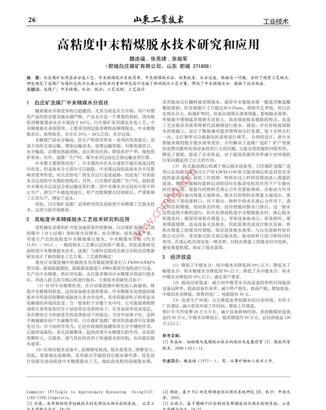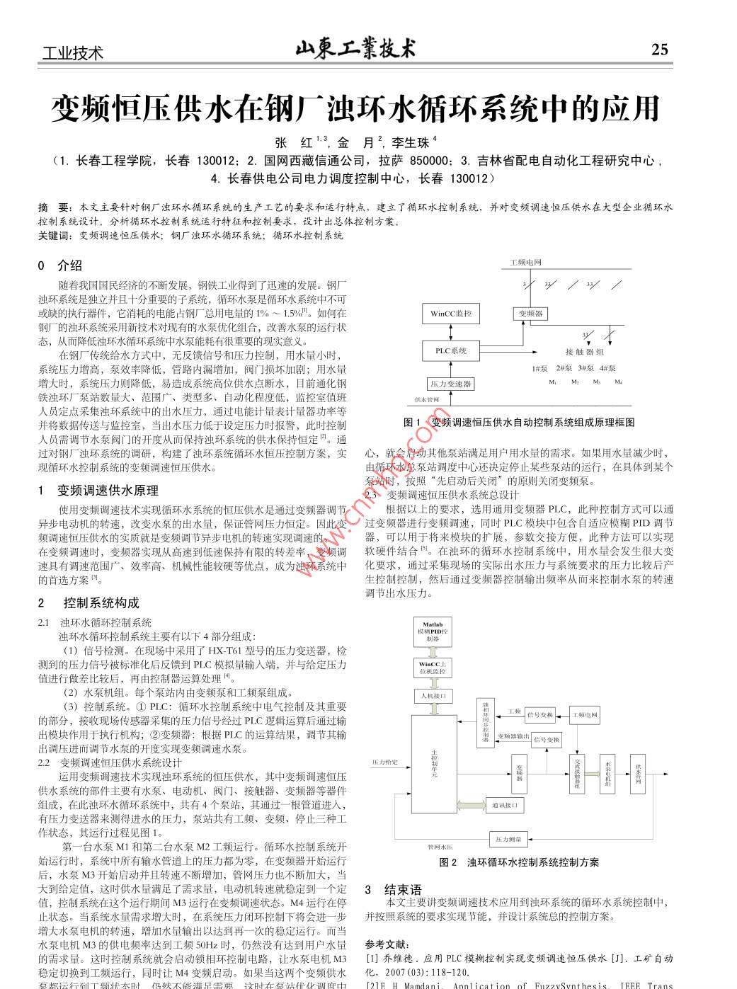 工業(yè)技術(shù)山束工業(yè)技術(shù)25變頻恒壓供水在鋼廠濁環(huán)水循環(huán)系統(tǒng)中的應(yīng)用張紅13,金月2,李生珠(1.長春工程學(xué)院,長春130012;2.國網(wǎng)西藏信通公司,拉薩850000;3.吉林省配電自動化工程研究中心4.長春供電公司電力調(diào)度控制中心,長春130012)摘要:本文主要針對鋼廠濁環(huán)水循環(huán)系統(tǒng)的生產(chǎn)工芑的要求和運行特點,建立了循環(huán)水控制系統(tǒng),并對變頻調(diào)速恒壓供水在大型企業(yè)循環(huán)水控制系統(tǒng)設(shè)計。分析循環(huán)水控制系統(tǒng)運行特征和控制要求,設(shè)計出總體控制方案關(guān)鍵詞:變頻調(diào)速恒壓供水;鋼廠濁環(huán)水循環(huán)系統(tǒng);循環(huán)水控制系統(tǒng)介紹工頻電網(wǎng)隨著我國鋼鐵工業(yè)得到了迅速的發(fā)展。鋼廠濁環(huán)系統(tǒng)是獨立并且十分重要的子系統(tǒng),循環(huán)水泵是循環(huán)水系統(tǒng)中不可或缺的執(zhí)行器件,它消耗的電能占鋼廠總用電量的1%~1.5。如何在WinCC監(jiān)控鋼廠的濁環(huán)系統(tǒng)采用新技術(shù)對現(xiàn)有的水泵優(yōu)化組合,改善水泵的運行狀態(tài),從而降低濁環(huán)水循環(huán)系統(tǒng)中水泵能耗有很重要的現(xiàn)實意義。在鋼廠傳統(tǒng)給水方式中,無反饋信號和壓力控制,用水量小時PLC系統(tǒng)接觸器組系統(tǒng)壓力增高,泵效率降低,管路內(nèi)漏增加,閥門損壞加劇;用水量1#泵2#泵3#泵4泵增大時,系統(tǒng)壓力則降低,易造成系統(tǒng)高位供水點斷水,目前通化鋼力變速鐵濁環(huán)廠泵站數(shù)量大、范圍廣、類型多、自動化程度低,監(jiān)控室值班水管博員定點采集濁環(huán)系統(tǒng)中的出水壓力,通過電能計量表計量器功率等并將數(shù)據(jù)傳送與監(jiān)控室,當(dāng)出水壓力低于設(shè)定壓力時報警,此時控制圖1變頻調(diào)速恒壓供水自動控制系統(tǒng)組成原理框圖員需調(diào)節(jié)水泵閥門的開度從而保持濁環(huán)系統(tǒng)的供水保持恒定。通過對鋼廠濁環(huán)系統(tǒng)的調(diào)研,構(gòu)建了濁環(huán)系統(tǒng)循環(huán)水恒壓控制方案,實心,就會啟動其他泵站滿足用戶用水量的需求。如果用水量減少時,循環(huán)水控制系統(tǒng)的變顎調(diào)速恒壓供水由循環(huán)水總泵站調(diào)度中心還決定停止某些泵站的運行,在具體到某個1變頻調(diào)速供水原理泵站時,按照“先啟動后關(guān)閉”的原則關(guān)閉變頻泵23變頻調(diào)速恒壓供水系統(tǒng)總設(shè)使用變頻調(diào)速技術(shù)實現(xiàn)循環(huán)水系統(tǒng)的恒壓供水是通過變顎器調(diào)節(jié)根據(jù)以上的要求,選用通用變頻器PLC,此種控制方式可以通異步電動機的轉(zhuǎn)速,改變水泵的出水量,保證管網(wǎng)壓力恒定。因此變過變頻器進行變頻調(diào)速,同時PC模塊中包含自適應(yīng)模糊PD調(diào)節(jié)頻調(diào)速恒壓供水的實質(zhì)就是變頻調(diào)節(jié)異步電機的轉(zhuǎn)速實現(xiàn)調(diào)速的器,可以用于將來模塊的擴展,參數(shù)交接方便,此種方法可以實現(xiàn)在變頦調(diào)速時,變頻器實現(xiàn)從高速到低速保持有限的轉(zhuǎn)差率,變頻調(diào)軟硬件結(jié)合。在濁環(huán)的循環(huán)水控制系統(tǒng)中,用水量會發(fā)生很大變速具有調(diào)速范圍廣、效率高、機械性能較硬等優(yōu)點,成為濁環(huán)系統(tǒng)中化要求,通過采集現(xiàn)場的實際出水壓力與系統(tǒng)要求的壓力比較后產(chǎn)的首選方案同。生控制控制,然后通過變頻器控制輸出頻率從而來控制水泵的轉(zhuǎn)速2控制系統(tǒng)構(gòu)成調(diào)節(jié)出水壓力2.1濁環(huán)水循環(huán)控制系統(tǒng)濁環(huán)水循環(huán)控制系統(tǒng)主要有以下4部分組成(1)信號檢測。在現(xiàn)場中采用了HXT61型號的壓力變送器,檢測到的壓力信號被標(biāo)準(zhǔn)化后反饋到PIC模擬量輸入端,并與給定壓力waCC上值進行做差比較后,再由控制器運算處理。(2)水泵機組。每個泵站內(nèi)由變頻泵和工頻泵組成。人機接口(3)控制系統(tǒng)。①PLC:循環(huán)水控制系統(tǒng)中電氣控制及其重要的部分,接收現(xiàn)場傳感器采集的壓力信號經(jīng)過PLC邏輯運算后通過輸工電網(wǎng)出模塊作用于執(zhí)行機構(gòu);②變頻器:根據(jù)PC的運算結(jié)果,調(diào)節(jié)其輸變頻器輸出信號變換出調(diào)壓進而調(diào)節(jié)水泵的開度實現(xiàn)變頻調(diào)速水泵22變頻調(diào)速恒壓供水系統(tǒng)設(shè)計壓力給定運用變頻調(diào)速技術(shù)實現(xiàn)濁環(huán)系統(tǒng)的恒壓供水,其中變頻調(diào)速恒壓水系統(tǒng)的部件主要有水泵、電動機、閥門、接觸器、變頻器等器件組成,在此濁環(huán)水循環(huán)系統(tǒng)中,共有4個泵站,其通過一根管道進入道訊接口有壓力變送器來測得進水的壓力,泵站共有工頻、變頻、停止三種工作狀態(tài),其運行過程見圖1H力測量第一臺水泵M1和第二臺水泵M2工頻運行。循環(huán)水控制系統(tǒng)開始運行時,系統(tǒng)中所有輸水管道上的壓力都為零,在變頦器開始運行圖2濁環(huán)循環(huán)水控制系統(tǒng)控制方案后,水泵M3開始啟動并且轉(zhuǎn)速不斷增加,管網(wǎng)壓力也不斷加大,當(dāng)大到給定值,這時供水量滿足了需求量,電動機轉(zhuǎn)速就穩(wěn)定到