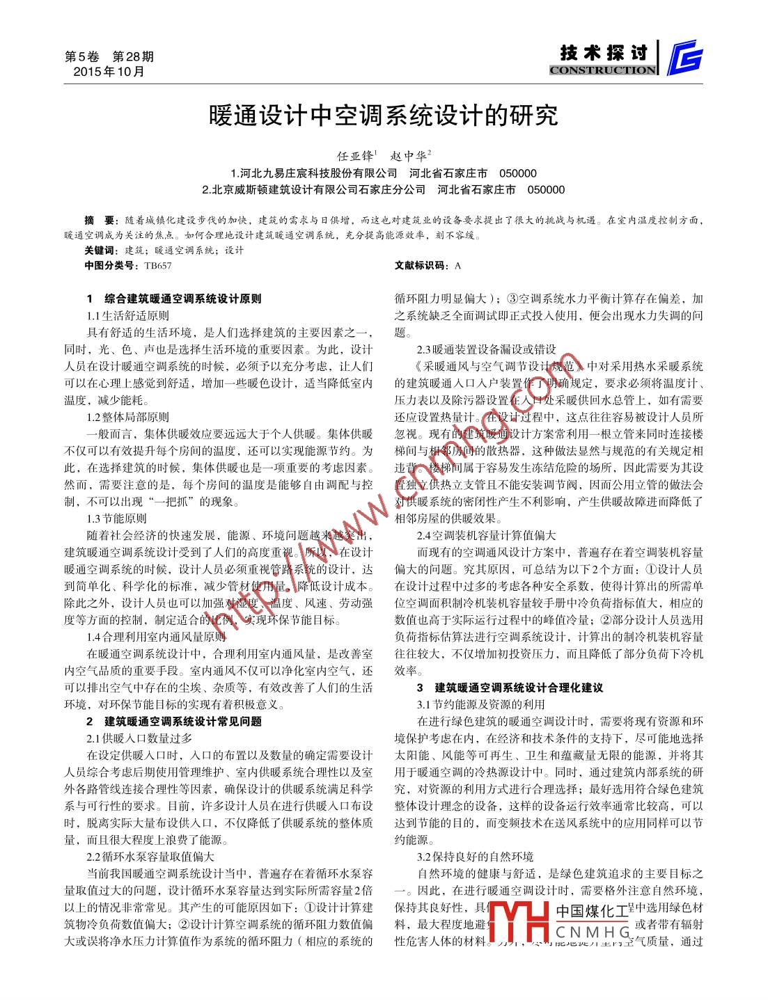 第5卷第28期技術(shù)探討2015年10月CONSTRUCTION后暖通設(shè)計(jì)中空調(diào)系統(tǒng)設(shè)計(jì)的研究任亞鋒'趙中 華21.河北九易莊宸科技股份有限公司河北省石家莊市0500002.北京威斯頓建筑設(shè)計(jì)有限公司石家莊分公司河北省石 家莊市050000摘要:隨著城鎮(zhèn)化建設(shè)步伐的加快,建筑的需求與日俱增,而這也對建筑業(yè)的設(shè)備要求提出了很大的挑戰(zhàn)與機(jī)遇。在室內(nèi)溫度控制方面,暖通空調(diào)成為關(guān)注的焦點(diǎn)。如何合理地設(shè)計(jì)建筑暖通空調(diào)系統(tǒng),充分提高能源效率,刻不容緩。關(guān)鍵詞:建筑;暖通空調(diào)系統(tǒng);設(shè)計(jì).中圖分類號: TB657文獻(xiàn)標(biāo)識碼: A1綜合建筑暖通 空調(diào)系統(tǒng)設(shè)計(jì)原則循環(huán)阻力明顯偏大);③空調(diào)系統(tǒng)水力平衡計(jì)算存在偏差,加1.1生活舒適原則之系統(tǒng)缺乏全面調(diào)試即正式投入使用,便會出現(xiàn)水力失調(diào)的問具有舒適的生活環(huán)境,是人們選擇建筑的主要因素之一- ,題同時,光、色、聲也是選擇生活環(huán)境的重要因素。為此,設(shè)計(jì)2.3暖通裝置設(shè)備漏設(shè)或錯設(shè)人員在設(shè)計(jì)暖通空調(diào)系統(tǒng)的時候,必須予以充分考慮,讓人們《采暖通風(fēng)與空氣調(diào)節(jié)設(shè)計(jì)規(guī)范》中對采用熱水采暖系統(tǒng)可以在心理上感覺到舒適,增加一.些暖色設(shè)計(jì),適當(dāng)降低室內(nèi)的建 筑暖通人口人戶裝置作了明確規(guī)定,要求必須將溫度計(jì)、溫度,減少能耗。壓力表以及除污器設(shè)置在人口處采暖供回水總管上,如有需要1.2整體局部原則還應(yīng)設(shè)置熱量計(jì)。在設(shè)計(jì)過程中,這點(diǎn)往往容易被設(shè)計(jì)人員所--般而言,集體供暖效應(yīng)要遠(yuǎn)遠(yuǎn)大于個人供暖。集體供暖忽視?,F(xiàn)有的建筑暖通設(shè)計(jì)方案常利用一根立管來同時連接樓不僅可以有效提升每個房間的溫度,還可以實(shí)現(xiàn)能源節(jié)約。為梯間 與相鄰房間的散熱器,這種做法顯然與規(guī)范的有關(guān)規(guī)定相此,在選擇建筑的時候,集體供暖也是--項(xiàng)重要的考慮因素。違背。樓梯間屬于容易發(fā)生凍結(jié)危險的場所,因此需要為其設(shè)然而,需要注意的是,每個房間的溫度是能夠自由調(diào)配與控置獨(dú)立供熱立支管且不能安裝調(diào)節(jié)閥,因而公用立管的做法會制,不可以出現(xiàn)“- -把抓”的現(xiàn)象。對供暖系統(tǒng)的密閉性產(chǎn)生不利影響,產(chǎn)生供暖故障進(jìn)而降低了1.3節(jié)能原則相鄰房屋的供暖效果。隨著社會經(jīng)濟(jì)的快速發(fā)展,能源、環(huán)境問題越來越突出,2.4空調(diào)裝機(jī)容量計(jì)算值偏大建筑暖通空調(diào)系統(tǒng)設(shè)計(jì)受到了人們的高度重視。所以,在設(shè)計(jì)而現(xiàn)有的空調(diào)通風(fēng)設(shè)計(jì)方案中,普遍存在著空調(diào)裝機(jī)容量暖通空調(diào)系統(tǒng)的時候,設(shè)計(jì)人員必須重視管路系統(tǒng)的設(shè)計(jì),達(dá)偏大的問題。 究其原因,可總結(jié)為以下2個方面:①設(shè)計(jì)人員到簡單化、科學(xué)化的標(biāo)準(zhǔn),減少管材使用量,降低設(shè)計(jì)成本。在設(shè)計(jì)過 程中過多的考慮各種安全系數(shù),使得計(jì)算出的所需單除此之外,設(shè)計(jì)人員也可以加強(qiáng)對濕度、溫度、風(fēng)速、勞動強(qiáng)位空調(diào)面積制冷機(jī)裝機(jī)容量較手冊中冷負(fù)荷指標(biāo)值大,相應(yīng)的度等方面的控制,制定適合的比例,實(shí)現(xiàn)環(huán)保節(jié)能目標(biāo)。數(shù)值也高于實(shí)際運(yùn)行過程中的峰值冷量;②部分設(shè)計(jì)人員選用1.4 合理利用室內(nèi)通風(fēng)量原則負(fù)荷指標(biāo)估算法進(jìn)行空調(diào)系統(tǒng)設(shè)計(jì),計(jì)算出的制冷機(jī)裝機(jī)容量在暖通空調(diào)系統(tǒng)設(shè)計(jì)中,合理利用室內(nèi)通風(fēng)量,是改善室往往較大, 不僅增加初投資壓力,而且降低了部分負(fù)荷下冷機(jī)內(nèi)空氣品質(zhì)的重要手段。室內(nèi)通風(fēng)不僅可以凈化室內(nèi)空氣,還效率??梢耘懦隹諝庵写嬖诘膲m埃、雜質(zhì)等,有效改善了人們的生活3建筑暖通 空調(diào)系統(tǒng)設(shè)計(jì)合理化建議環(huán)境,對環(huán)保節(jié)能目標(biāo)的實(shí)現(xiàn)有著積極意義。3.1 節(jié)約能源及資源的利用2建筑暖通空調(diào)系統(tǒng)設(shè)計(jì)常見問題在進(jìn)行綠色建筑的暖通空調(diào)設(shè)計(jì)時,需要將現(xiàn)有資源和環(huán)2.1供暖人口數(shù)量過多境保護(hù)考慮在內(nèi),在經(jīng)濟(jì)和技術(shù)條件的支持下,盡可能地選擇在設(shè)定供暖入口時,人口的布置以及數(shù)量的確定需要設(shè)計(jì)太陽能 、風(fēng)能等可再生、衛(wèi)生和蘊(yùn)藏量無限的能源,并將其人員綜合考慮后期使用管理維護(hù)、室內(nèi)供暖系統(tǒng)合理性以及室用于暖 通空調(diào)的冷熱源設(shè)計(jì)中。同時,通過建筑內(nèi)部系統(tǒng)的研外各路管線連接合理性等因素,確保設(shè)計(jì)的供暖系統(tǒng)滿足科學(xué)究, 對資源的利用方式進(jìn)行合理選擇;最好選用符合綠色建筑系與可行性的要求。目前,許多設(shè)計