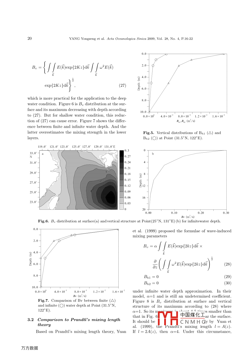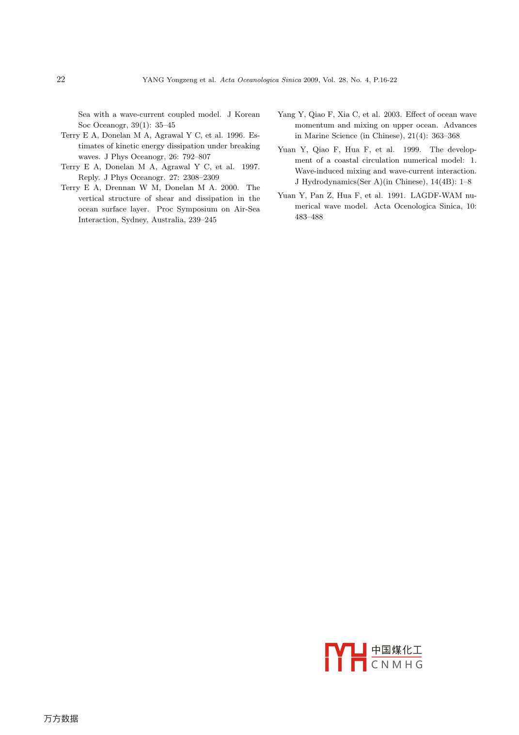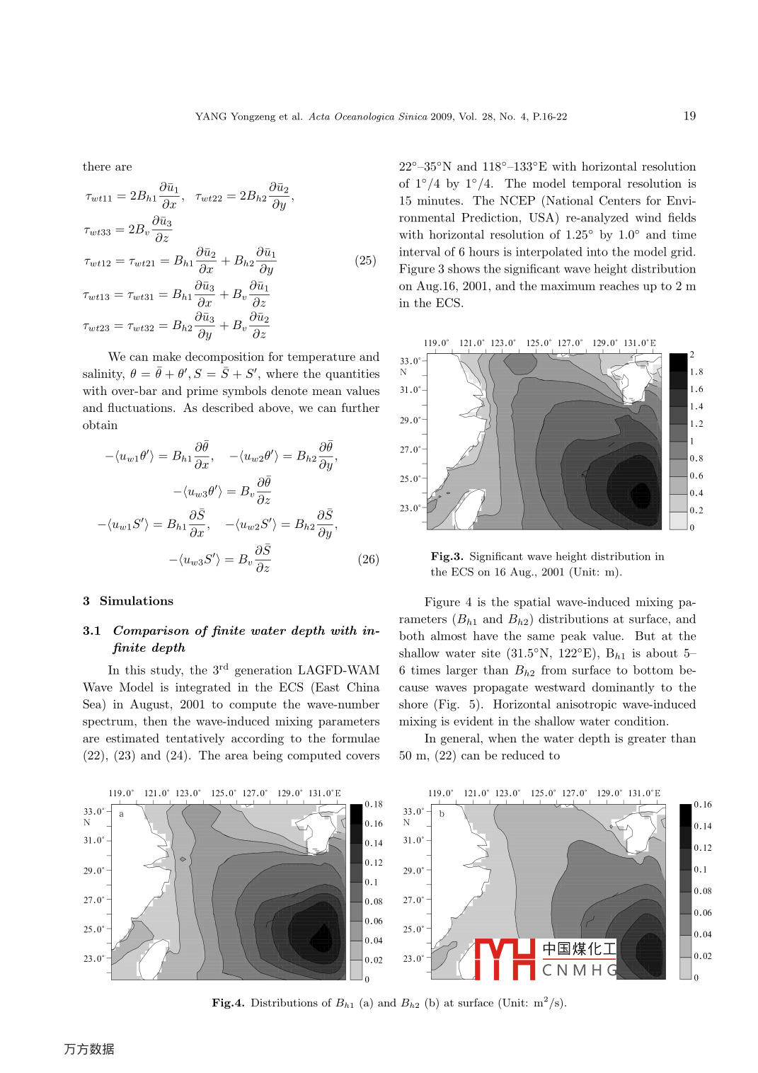 Acta Oceanologica Sinica 2009, Vol.28, No.4, p.16-22http:/ /www .hyxb.org.cnE-mail: hyxbe@263.netParameterization of ocean wave- induced mixingprocesses for finite water depthYANG Yongzeng1,2*, ZHAN Run', TENG Yong'1 First ]Institute of Oceanography, State Oceanic Administration, Qingdao 266061, China2 Key Laboratory of Marine Science and Numerical Modeling, State Oceanic Administration,Qingdao 266061, ChinaReceived 3 March 2008; accepted 18 September 2008AbstractThree dimensional wave-induced mixing plays an important role in shallow water area. A quitedirect approach through the Reynolds average upon characteristic length scale is proposed to pa-rameterize the horizontal and vertical shallow water mixing. Comparison of finite depth case withinfinite depth results indicates that the difference of the wave-induced mixing strength is evident.In the shallow water condition, the infinite water depth approximation overestimates the mixingstrength in the lower layers. The nonzero horizontal wave-induced mixing presents anisotropic prop-erty near the shore. The Prandtl's mixing length theory underestimated the wave- induced mixingin the previous studies.Key words: Reynolds average, Characteristic length scale, Wave-induced mixing parameter1 Introductionessential for mixed layer depth simulation.However, the wave-induced mixing parameteriza-Overestimated sea surface temperature (SST) andtion of infinite water depth approximation is probablyunderestimated mixed layer depth in summer are com-unsuitable in nearshore region, especially in the re-mon problems in ocean circulation modeling (Martin,gion in which the water depth ranges from 0 to 20 m.1985; Kantha and Clayson, 1994). It is believed thatSo this study addresses finite water depth cases, andthese two problems are caused by insufficient surfacepresents a more reasonable expression of wave-inducedmixing. The mixed layer is caused by several mecha- horizontal and vertical mixing parameters (Section 2).nisms, such as vertical convection, solar heat penetra-In Section 3, these parameters are estimated primarilytion, and ocean wave-induced mixing. In the modelby integrating the LAGFD-WAM Wave Model. Com-of Ezer (2000), the overheating SST was turned down parison of finite depth case with infinite depth resultsby asumning that shortwave radiation penetrates to is analyzed. At the end of this section, we compare the .deep layers. In other models, Agrawal et al. (1992),vertical mixing with Prandtl's mixing length results.Craig and Banner (1994), Terry et al. (1996, 1997,Some conclusions are summarized in Section 4.2000),Mellor and Blumberg (2004) suggested thatsurface wave breaking could enhance mixing in up2 Model derivationper layers by turbulence. In cases when consider-ing three-dimensional wave motions for infinite waterWe consider the linear wave equations for finitedepth, Yuan et al. (1999) proposed a parameteriza-water depth,tion of wave-induced mixing for circulation modelingbased on Prandtl's mixing length theory. Yang et al. .Oφ= 0z≤0(1(2003) estimated the amplitude of wave-induced verti-cal mixing parameter Bv in the ECS (the East China{Uw1,Uw2,Uw3}= Vφ .(2Sea) by using the LAGFD-WAM Wave Model. By in-8ζ_ 0φz=0ot0zcorporating the wave-induced mixing and tidal mixing)dprocesses in the Huanghai Sea, Qiao et al. (2004) ana-)t"9ζ=0. z=0(4lyzed the temperature and salinity distributions along0φ36° N section and found that both mixing processes are=0z=-H(5中國煤化工This work is supported by the national young scientist fund of China under contractand special fundfor fundamental scientific research under contract (No. 2007G15).YHCNMHG*Corresponding author, E-mail: yangyz@fio.org.cn.YANG Yongzeng et al. Acta Oceanologica Sinica 2009, Vol. 28, No. 4, P.16-22where φ is velocity potential, 5, elevation of waves, and where the subscripts t, w, C represent turbulence, waveH water depth. The solutions of the above equations and current respectively. We first consider the wave-can be written ascurrent Reynolds stress which indicates the wavemixing intensity for current momentum. As givenζ=| | Aexp{i(R.r-wt)}dKby Yuan et al. (1999), the wave-current Reynoldsstress isφ=[ [_igoshK(日+2)xsinhKHTwotij = -(Uwiltj) - (utilwj>.(11)exp{i(后.r- wt)}dh(7) The above characteristic length scale L,H,T forUw1 =[ wk1 gcoshK(H+z)、Reynolds average satisfyKAsinhKH xLt,Lw<< L<< Lcexp{i(后.r - wt)}dh .(8)Ht,Hw<< H<< HeUw2 =: [ (4kxcoshK(H+2》)xT,Tw< =2ZuusQryAT,(13)L2HTexp{i(后.p - wt}dk(10)where A(k) is the wave amplitude, and k: is the wave-where C△vj represent scale integral volume of fAuid el-number vector. Assuming that the wave field is sta-ements, N is the number of elements in volume L2H,titically stationary, that is (A()4(R) = 8(后 - and OT, the temporal interval.的)E(E).In the following, we adopt L = Lt = Lw,H =Ht= Hw, and T= Ti = Tw for simplicity. (13) can尸=ζbe rewritten as1z=0(ut1Uw3) =下2匯huu3Ov;AT; (14)L2 HwTwi=1j=1|Hwhere N1 is the number of elements in volumeL2Hw.For a given time t, one sort of fAuid elements has the.........V L,property uv3> 0, and the other, o3≤0 (Fig. 2).LSea floor .Fig.1. Sketch of the average scale.cn)●d1We now decompose Ui into three velocity com-ponents: a mean component ui, whose characteristicQu'<0scales are Te in time, Le, in horizontal and Hc in verti-u"'"=0cal, respectively; wave component Uwri, whose time andspace scales are Tw, and Lw(Hw); and a random tur-中國煤化工bulence component Uuti, whose time and space scalesare T, and L(Ht), such thatMYHCNMHGUi= ui+Uwi+ Uti. i= 1,2,3Fig.2. Sketch of sorts of fluid elements..18YANG Yongzeng et al. Acta Oceanologica Sinica 2009, Vol. 28, No.4, P.16-22For the first, there exist a height zj < z and time (19) can be also derived aszj= z+ A(z). Because thetj =-sinh2 KHu3△v;△T.(16)Given that uU'w3 and z - zj have the same sign for thesinh?K(H +z),。0u1first sort of elements,M當(dāng)2S(z-z)%3Ao;OT;≥0.(17)For the wave-current Reynolds stre