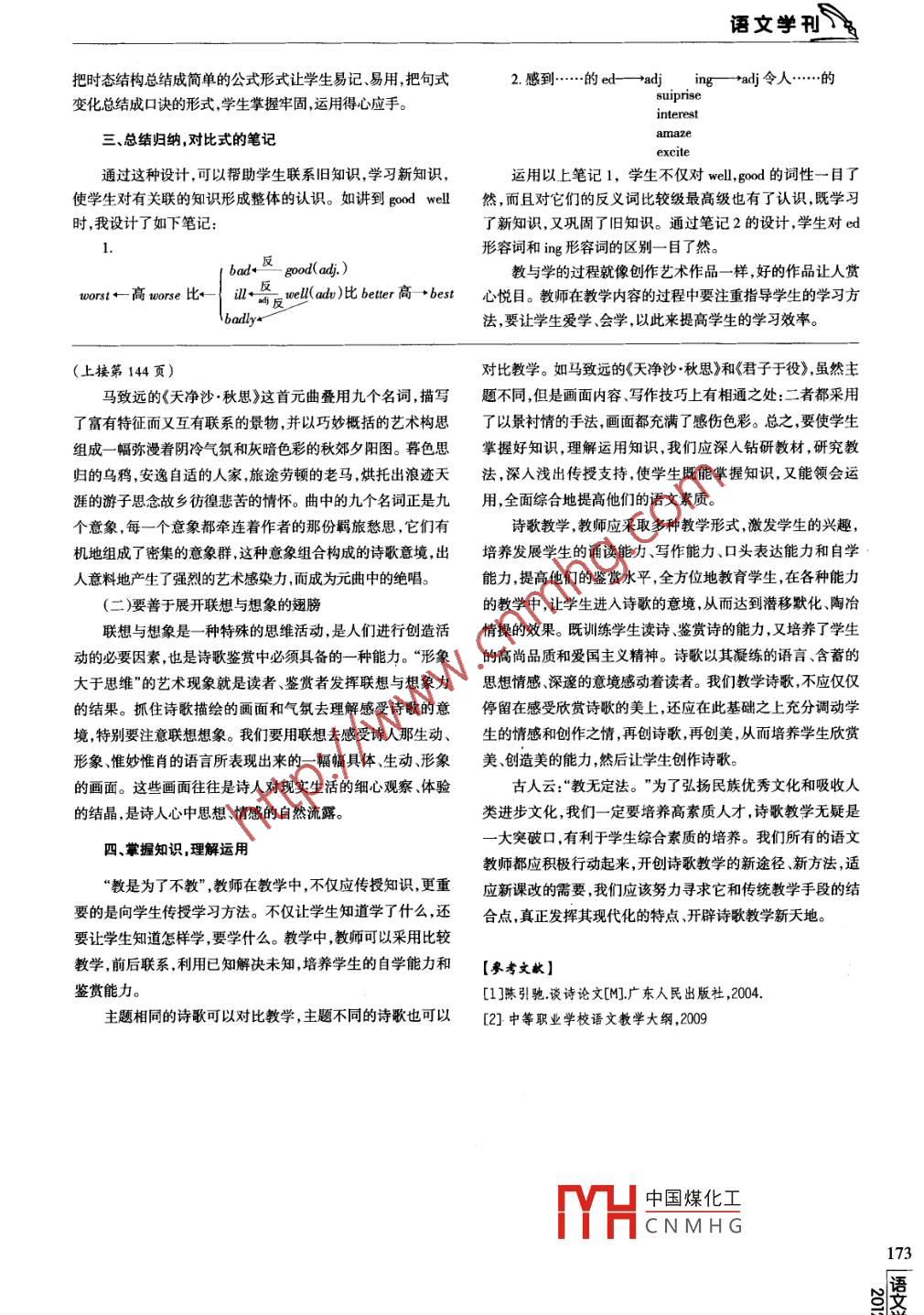 f丫教材與教法優(yōu)化筆記設(shè)計(jì)優(yōu)化課堂教學(xué)O李文玲(臨河第四中學(xué),內(nèi)蒙古巴彥淖爾015000)[摘要]注重優(yōu)化筆記的設(shè)計(jì),可以幫助學(xué)生用簡(jiǎn)單明了的方法記筆記,有助于學(xué)生學(xué)習(xí)和知識(shí)的運(yùn)用。[關(guān)鍵詞]筆記;設(shè)計(jì);課堂教學(xué);優(yōu)化中圖分類號(hào): H 193文獻(xiàn)標(biāo)識(shí)碼: A文章編號(hào): 1672- -8610(2012)7-0172-01作為一名英語(yǔ)教師,在多年的教學(xué)實(shí)踐中,筆者充分利用進(jìn)行時(shí)語(yǔ)言教學(xué)的特點(diǎn),在課堂教學(xué)中注重培養(yǎng)提高學(xué)生綜合語(yǔ)言能力的同時(shí),為幫助學(xué)生理清知識(shí)的條理,提高學(xué)習(xí)的效率,掌握過丟現(xiàn)在科學(xué)有效的學(xué)習(xí)方法,特別注重優(yōu)化筆記的設(shè)計(jì),幫助學(xué)生用amm簡(jiǎn)單明了的方法記筆記,這有助于學(xué)生學(xué)習(xí)和知識(shí)的運(yùn)用。根主+ We+ving.....were主<一 is v*...變化在 is. 上據(jù)教學(xué)內(nèi)容的不同特點(diǎn),筆記設(shè)計(jì)也不同。本文淺談在整體優(yōu)變化在was、were上areure化課堂教學(xué)中,筆記設(shè)計(jì)。一般時(shí)一、理思路、清條理的筆記設(shè)計(jì)這種設(shè)計(jì)讓學(xué)生對(duì)階段性的知識(shí)進(jìn)行整理,讓學(xué)生對(duì)課本內(nèi)容的設(shè)計(jì)有一種總的思路線條,而且筆記簡(jiǎn)單明了,學(xué)生便,V原do,主+v+......于記憶,易于理解,更便于運(yùn)用。在初一剛開始的教學(xué)中,我把| 變化借“did",動(dòng)詞主+<單三~Vs+..變化要借does所學(xué)句子歸納為兩種,同時(shí)用簡(jiǎn)單的語(yǔ)言概括了五種句式的變| 要還原e記住動(dòng)詞要還原化方法。將來(lái)時(shí)主(be)表句式變化amis areI she we5+not①主 + were +goingto +v原He You①主+is} going to+V原It The- -般問 往前提|變化在was上變化在am、is.are.上單肯定答yes,|②主+would+V原②主+will+V原否定答No,變化在would上變化在will上特殊問(劃線提問,其余)完成時(shí)L+疑問詞+-般問句2.主謂....| ①過去的過去影響、結(jié)果v_◆行為、動(dòng)作①過去..現(xiàn)在.②主+had+p.p ..延續(xù)變化在had上/ have二、公式口訣式的筆記設(shè)計(jì)②主+has我在歸納初中階段性的時(shí)態(tài)時(shí),設(shè)計(jì)了這種形式的筆記,我中國(guó)煤化工在hv.hs上MYHC NMH G-172[作者筒介]李文玲,內(nèi)蒙古巴彥淖爾市臨河第四中學(xué)教師。語(yǔ)文學(xué)刊3把時(shí)態(tài)結(jié)構(gòu)總結(jié)成簡(jiǎn)單的公式形式讓學(xué)生易記、易用,把句式2.感到..-.的ed-- +adjing-- +adj令....的變化總結(jié)成口訣的形式,學(xué)生掌握牢固,運(yùn)用得心應(yīng)手。suipriseinterest三、總結(jié)歸納,對(duì)比式的筆記amaze通過這種設(shè)計(jì),可以幫助學(xué)生聯(lián)系舊知識(shí),學(xué)習(xí)新知識(shí),運(yùn)用以上筆記1,學(xué)生不僅對(duì)wll,ood的詞性-目了使學(xué)生對(duì)有關(guān)聯(lián)的知識(shí)形成整體的認(rèn)識(shí)。如講到good well然,而且對(duì)它們的反義詞比較級(jí)最高級(jí)也有了認(rèn)識(shí),既學(xué)習(xí)時(shí),我設(shè)計(jì)了如下筆記:了新知識(shí),又鞏固了舊知識(shí)。通過筆記2的設(shè)計(jì),學(xué)生對(duì)ed1.形容詞和ing形容詞的區(qū)別- -目了然。bad-'good(adj.)教與學(xué)的過程就像創(chuàng)作藝術(shù)作品一樣,好的作品讓人賞wors←高worse比一ill 司后well( adv)比btter高→best心悅目。教師在教學(xué)內(nèi)容的過程中要注重指導(dǎo)學(xué)生的學(xué)習(xí)方badly.法,要讓學(xué)生愛學(xué)、會(huì)學(xué),以此來(lái)提高學(xué)生的學(xué)習(xí)效率。(上接第144頁(yè))對(duì)比教學(xué)。如馬致遠(yuǎn)的《天凈沙.秋思》和《君子于役》,雖然主馬致遠(yuǎn)的《天凈沙.秋思》這首元曲疊用九個(gè)名詞,描寫題不同,但是畫面內(nèi)容、寫作技巧上有相通之處:二者都采用了富有特征而又互有聯(lián)系的景物,并以巧妙概括的藝術(shù)構(gòu)思了以景襯情的手法,畫面都充滿了感傷色彩??傊箤W(xué)生組成一幅彌漫著陰冷氣氛和灰暗色彩的秋郊夕陽(yáng)圖。暮色思掌握好知識(shí),理解運(yùn)用知識(shí),我們應(yīng)深入鉆研教材,研究教歸的烏鴉,安逸自適的人家,旅途勞頓的老馬,烘托出浪跡天法,深人淺出傳授支持,使學(xué)生既能掌握知識(shí),又能領(lǐng)會(huì)運(yùn)涯的游子思念故鄉(xiāng)彷徨悲苦的情懷。曲中的九個(gè)名詞正是九用,全面綜合地提高他們的語(yǔ)文素質(zhì)。個(gè)意象,每一個(gè)意象都牽連著作者的那份羈旅愁思,它們有詩(shī)歌教學(xué),教師應(yīng)采取多種教學(xué)形式,激發(fā)學(xué)生的興趣,機(jī)地組成了密集的意象群,這種意象組合構(gòu)成的詩(shī)歌意境,出培養(yǎng)發(fā)展學(xué)生的誦讀能力、寫作能力、口頭表達(dá)能力和自學(xué)人意料地產(chǎn)生了強(qiáng)烈的藝術(shù)感染力,而成為元曲中的絕唱。能力,提高他們的鑒賞水平,全方位地教育學(xué)生,在各種能力(二)要善于展開聯(lián)想與想象的翅膀的教學(xué)中,讓學(xué)生進(jìn)入詩(shī)歌的意境,從而達(dá)到潛移默化陶冶聯(lián)想與想象是一-種特殊的思維活動(dòng),是人們進(jìn)行創(chuàng)造活情操的效果。既訓(xùn