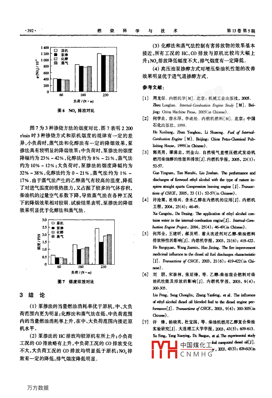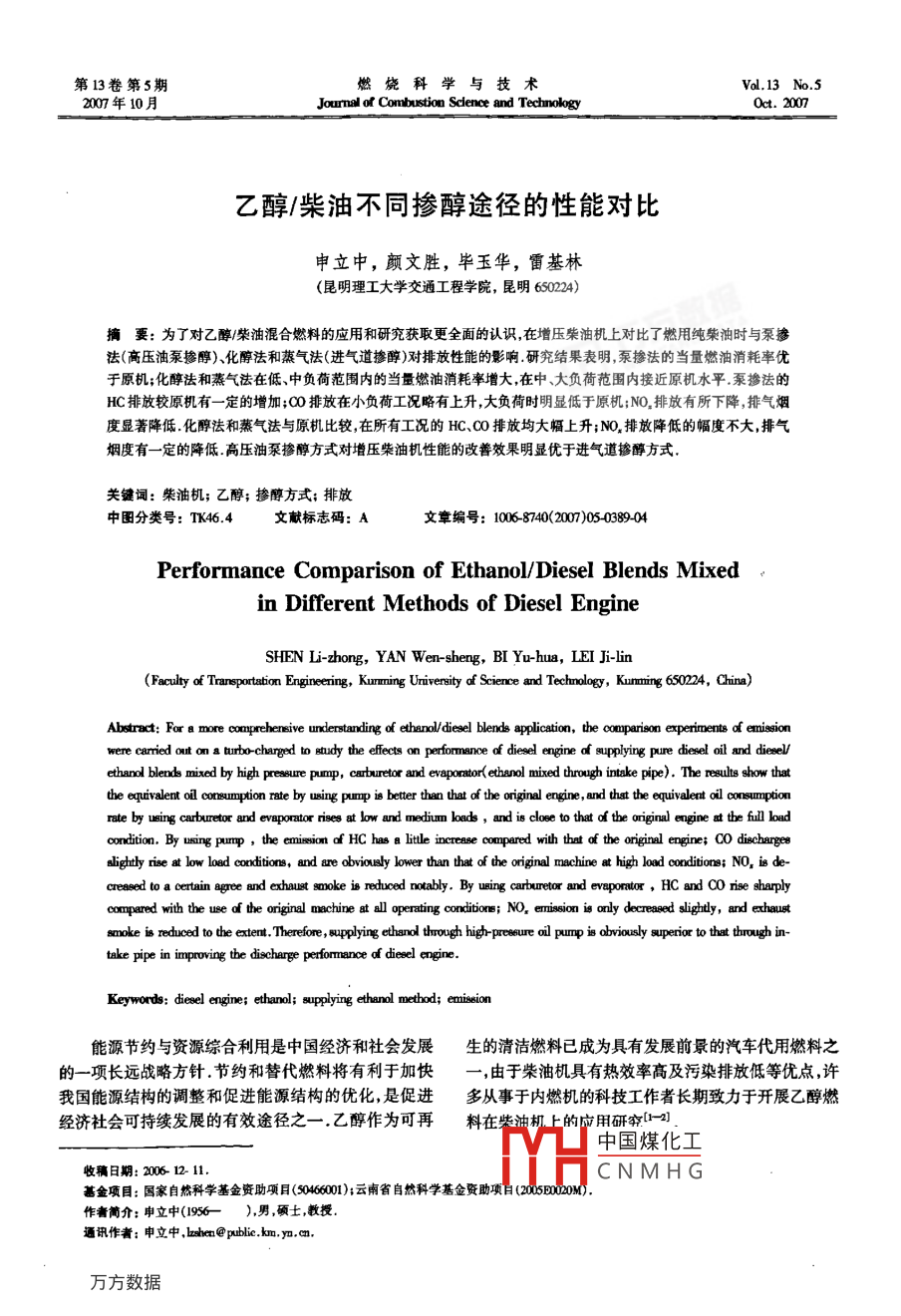 第13卷第5期v.13N.520年10月Jourmal of Combustion Science and Technologyot.2007乙醇/柴油不同摻醇途徑的性能對比申立中,顏文勝,畢玉華,雷基林(昆明理工大學(xué)交通工程學(xué)院,昆明65022摘要:為了對乙醇柴油混合燃料的應(yīng)用和研究獲取更全面的認(rèn)識,在增壓柴油機(jī)上對比了燃用純柴油時與泵摻法(高壓油泵摻醇)化醇法和蒸氣法(進(jìn)氣道摻醇)對排放性能的影響研究結(jié)果表明,泵摻法的當(dāng)量燃油消耗率優(yōu)于原機(jī);化醇法和蒸氣法在低、中負(fù)荷范圍內(nèi)的當(dāng)量燃油消耗率增大在中、大負(fù)荷范圍內(nèi)接近原機(jī)水平泵摻法的HC排放較原機(jī)有一定的增加;0排放在小負(fù)荷工況略有上升大負(fù)荷時明顯低于原機(jī);NO排放有所下降,排氣煙度顯著降低化醇法和蒸氣法與原機(jī)比較,在所有工況的HC、OO排放均大幅上升;NO排放降低的幅度不大排氣煙度有一定的降低高壓油泵摻醇方式對增壓柴油機(jī)性能的改善效果明顯優(yōu)于進(jìn)氣道摻醇方式關(guān)鍵詞:柴油機(jī);乙醇;摻醇方式;排放中圖分類號:TK464文獻(xiàn)標(biāo)志碼:A文章編號:10058740(2007)05038904Performance Comparison of Ethanol/Diesel Blends Mixedin Different Methods of Diesel EngineSHEN Li-zhong, YAN Wen-sheng, BI Yu-hua, LEI Ji-linFaculty of Transportation Engineering, Kunming Uriversity of Science and Technology, Kunmming 650224, China)Abstract: For a more comprehensive understanding of ethanol/diesel blends application, the comparison experiments of emissionwere caried out on a turbo-charged to study the effects on performance of diesel engine of supplying pure diesel oil and dieselethanol blends mixed by high preseure pump, carburetor and evaporator(ethanol mixed through intake pipe). The results show thatequivalent oil consumption rate by using pump is better than that of the original engine, and that the equivalent oil consumptionrate by using carburetor and evaporator rises at low and medium loads, and is cloee to that o the original engine ad the full loadcondition. By using pump, the emission of HC has a little increase compared with that of the orginal engine; Co dischargeslightly rise at low load conditions, and are obviously lower than that of the original machine at high load conditions: NO, is de-creased to a certain agree and exhaust smoke is reduced notably. By using carburetor and evaporator, HC and co rise sharplycompared with the use of the original machine at all operating conditions: NO, emission is only decreased slightly, and exhaustsmoke is reduced to the extent. Therefore, supplying ethanol through high-pressure oil pump is obviously superior to that through inimproving the discharge performance of dieselKeywords: diesel engine; ethanol; supplying ethanol method; emission能源節(jié)約與資源綜合利用是中國經(jīng)濟(jì)和社會發(fā)展生的清潔燃料已成為具有發(fā)展前景的汽車代用燃料之的一項(xiàng)長遠(yuǎn)戰(zhàn)略方針.節(jié)約和替代燃料將有利于加快由于柴油機(jī)具有熱效率高及污染排放低等優(yōu)點(diǎn),許我國能源結(jié)構(gòu)的調(diào)整和促進(jìn)能源結(jié)構(gòu)的優(yōu)化,是促進(jìn)多從事于內(nèi)燃機(jī)的科技工作者長期致力于開展乙醇燃經(jīng)濟(jì)社會可持續(xù)發(fā)展的有效途徑之一乙醇作為可再料在裝油機(jī)上的應(yīng)用研2中國煤化工收稿日期:20612-11CNMHG基金項(xiàng)目:國家自然科學(xué)基金資助項(xiàng)目(04600云南省自然科學(xué)基金資助項(xiàng)百(xDo作者簡介:申立中(19),男碩土教授通識作者;申立中,bhn@ public如m,cm科學(xué)與技術(shù)第13卷第5期排放法規(guī)逐漸嚴(yán)格,對減少柴油機(jī)有害排放物提出了進(jìn)一步的要求目前國內(nèi)外在柴油機(jī)上摻燒醇燃2試驗(yàn)結(jié)果與分析料的途徑為通過高壓油泵摻醇和進(jìn)氣道摻醇方式郭英男、許滄粟、何邦全、劉朋和許鋒等在柴圖1為2200mmin負(fù)荷特性時3種摻燒方法的對油機(jī)上以不同方式進(jìn)行了醇燃料與柴油混合摻燒的性比圖1(a)中,3種摻燒方法的有效燃油消耗率b均高能試驗(yàn)試驗(yàn)結(jié)果表明,釆用柴油機(jī)高壓油泵摻醇的方于原機(jī),泵摻法優(yōu)于化醇法和蒸氣法圖1(b)為當(dāng)量式,碳煙、微粒(PM排放均明顯改善,NO,排放有所降燃油消耗率b(將乙醇的熱值按純柴油的63%折合低,HC排放增加,CO排放的變化與負(fù)荷有關(guān);采用通為純柴油的燃油消耗率)與負(fù)荷的關(guān)系曲線泵摻法在過柴油機(jī)進(jìn)氣道摻醇的方式碳煙微粒(PM)均明顯改負(fù)荷特性中的當(dāng)量燃油消耗率均優(yōu)于原機(jī),中大負(fù)荷善,NO,有所降低,HC和CO均增加范圍內(nèi)更為明顯;化醇法和蒸氣法在低、中負(fù)荷范圍內(nèi)的當(dāng)量燃油消耗率上升,在中、大負(fù)荷范圍內(nèi)的當(dāng)量燃1試驗(yàn)方法和試驗(yàn)設(shè)備油消耗率接近原機(jī)水平試驗(yàn)用發(fā)動機(jī)為4100Z廢氣渦輪增壓直噴式柴油機(jī)(簡稱原機(jī)),標(biāo)定功率轉(zhuǎn)速為64kW(3200r一日泵化醉mn),最大轉(zhuǎn)矩轉(zhuǎn)速為230N·m/(2200rmin),壓縮蒸氣比為175,增壓壓比為22,供油提前角13°CA試驗(yàn)所用主要測試設(shè)備有奧地利AⅥ公司產(chǎn)的 AFA Drive250/48交流電力測功機(jī)、 AVL CEBⅡ直采式廢氣分析儀、AV733連續(xù)油耗儀、AⅥ439濾紙式煙度儀等試驗(yàn)地點(diǎn)的海拔高度為1912m,大氣壓力81負(fù)荷/CN·m)kPa,相對濕度40%-60%,氣溫18-21℃,試驗(yàn)數(shù)據(jù)(a)有