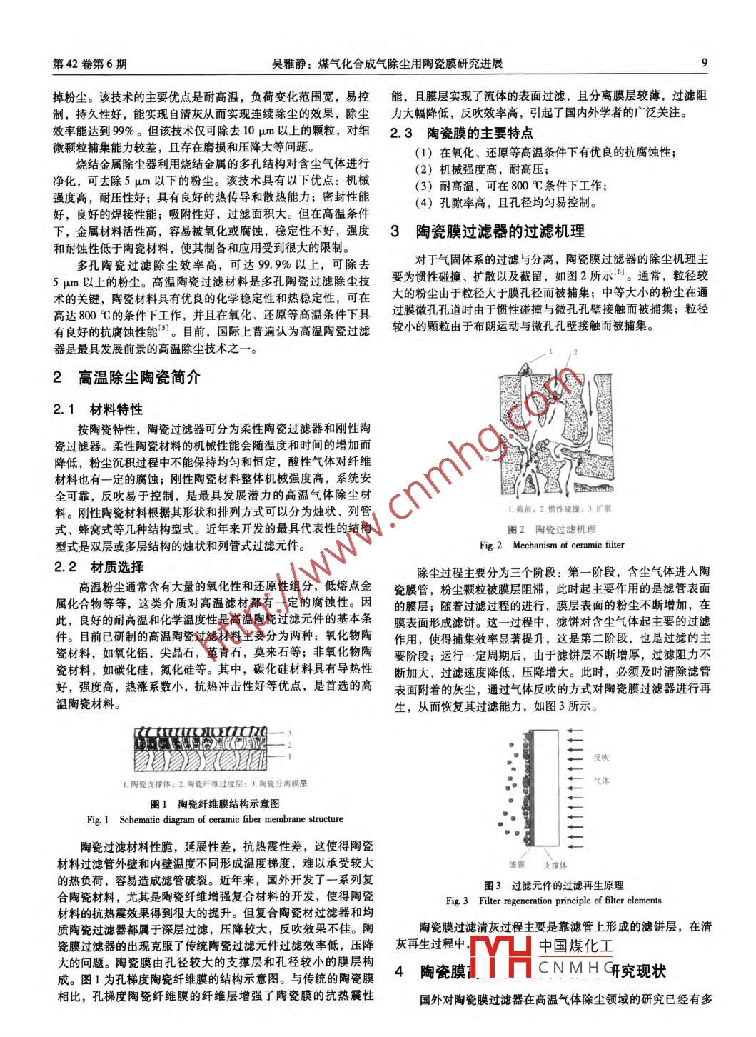第42卷第6期州化工VoL 42 No 6014年3月Guangzhou Chemical IndustryMar 2014專論與綜述煤氣化合成氣除塵用陶瓷膜研究進(jìn)展吳雅靜(南京工業(yè)大學(xué)理學(xué)院,江蘇南京21000摘要:當(dāng)前,世界各國(guó)均在研究增壓流化床聯(lián)合循環(huán)發(fā)電技術(shù)和整體煤氣化聯(lián)合循環(huán)發(fā)電技術(shù)中的高溫除塵技術(shù)。介紹了陶瓷膜除塵分離的原理,以及其在國(guó)內(nèi)外的應(yīng)用和研究現(xiàn)狀。認(rèn)為陶瓷膜優(yōu)點(diǎn)突出,在煤氣化合成氣除塵及高溫氣體除塵領(lǐng)域具有廣闊的應(yīng)用前景。關(guān)鍵詞:陶瓷膜;高溫除塵;煤氣化中圖分類號(hào):C642文獻(xiàn)標(biāo)志碼:A文章編號(hào):1001-9677(2014)06-008-09Removal of Coal Gasification Syngas.DustStudy Progress in Ceramic Membrane Used inwU Ya-jingCollege of Sciences, Nanjing University of Technology, Jiangsu Nanjing 210009, China)Abstract: Recently, many countries were studying the technology of high-temperature dust removal in pressurizedfluidized bed combustion combined cycle and integrated gasification combined cycle technology. The mechanism ofceramic membrane was introduced, and the application and research status of the ceramic membrane at home and abroadwere also summarized. The ceramic membranes had broad application prospect in coal gasification syngas cleaning andhigh temperature gas dedustingKey words: ceramic membrane; high temperature dedust; coal gasification cleanup凈化要求高(大于10μm的粉塵應(yīng)除去,1-10μm的粉塵濃1氣固分離與除塵技術(shù)現(xiàn)狀度應(yīng)小于58mg/kg,0-1pm的粉塵濃度應(yīng)小于22mg/kg)。我國(guó)是一個(gè)富煤少油缺氣的國(guó)家,煤炭因其儲(chǔ)量豐富,易除塵要求如此苛刻,一般的氣固分離設(shè)備是遠(yuǎn)遠(yuǎn)達(dá)不到要求開采且價(jià)格比較穩(wěn)定,成為我國(guó)動(dòng)力生產(chǎn)的主要燃料。我國(guó)的。的能源生產(chǎn)中,煤炭能源占75%,以煤為能源的火力發(fā)電占據(jù)高溫氣體除塵技術(shù)的研究始于20世紀(jì)70年代,美、德電力生產(chǎn)總量的80%。我國(guó)目前的燃煤發(fā)電技術(shù)相對(duì)落后,不日、英等國(guó)對(duì)高溫除塵技術(shù)研究較早。其中,美國(guó)的高溫氣體僅浪費(fèi)大量的熱能,還造成嚴(yán)重的環(huán)境污染。因此,如何高除塵技術(shù)代表全球的最高水準(zhǔn)。我國(guó)的高溫除塵技術(shù)起步較效、清潔地利用煤炭資源,是提高能源利用效率和治理環(huán)境污晚,無(wú)論廣度上還是深度上,都與先進(jìn)國(guó)家有不小差距,目前染急需解決的問題,是實(shí)現(xiàn)我國(guó)國(guó)民經(jīng)濟(jì)可持續(xù)發(fā)展的重要舉基本處于實(shí)驗(yàn)室研究階段。目前,高溫氣體除塵設(shè)備主要有:旋風(fēng)除塵器、靜電除塵煤氣化是一種潔凈的煤綜合利用技術(shù),能降低煤直接燃燒器、移動(dòng)顆粒層過濾除塵器、燒結(jié)多孔金屬過濾除塵器和多孔過程中產(chǎn)生的污染。增壓流化床聯(lián)合循環(huán)發(fā)電技術(shù)(PFBC)和陶瓷過濾除塵器4整體煤氣化聯(lián)合循環(huán)發(fā)電技術(shù)(IGCC)是新型的潔凈煤發(fā)電技旋風(fēng)除塵器具有良好的耐高溫性能,但其耗材多,不耐腐術(shù)。PFBC和IGCC系統(tǒng)中,高溫氣體除塵是一個(gè)重要組成部蝕,除塵效率不高,對(duì)粒徑在1~10μm之間的粒子無(wú)效,達(dá)分,不僅可以保護(hù)燃?xì)廨啓C(jī)葉片和下游設(shè)備,使排出的煙氣符不到燃?xì)廨啓C(jī)對(duì)粉塵的要求。因此,旋風(fēng)除塵器一般只作為預(yù)合環(huán)保要求,避免了濕法除塵帶來的二次水污染,而且能最大除塵設(shè)備程度地利用氣體顯熱,大幅提高系統(tǒng)的發(fā)電效率2。因此,高靜電除塵的特點(diǎn)是除塵效率高,壓降低,氣體處理量大溫氣體除塵技術(shù)是決定煤炭能否高效清潔利用及延長(zhǎng)經(jīng)濟(jì)壽命但靜電除塵的缺點(diǎn)同樣明顯,其應(yīng)用范圍受固體顆粒的比阻限的關(guān)鍵所在。制,在高溫高壓下電暈難以維持,電極壽命短,對(duì)煙氣成分敏高溫氣體除塵技術(shù)的特點(diǎn)是:要求凈化的含塵氣體溫度感,且價(jià)格昂貴,短時(shí)間內(nèi)無(wú)法工業(yè)化高;粉塵顆粒較細(xì)(一般認(rèn)為,對(duì)渦輪機(jī)葉片危害最大的是粒移動(dòng)顆粒YH中國(guó)煤化工定的固體顆粒如石徑大于5μm的粉塵的磨蝕以及粒徑小于2m的粉塵的沉積);英砂等形成移動(dòng)CNM|隙和曲折通道過濾基金項(xiàng)目:國(guó)家自然科學(xué)基金項(xiàng)目(No:21101094)和江蘇省自然科學(xué)基金項(xiàng)目(SBK2011231)。作者簡(jiǎn)介:吳雅靜(1982-),女,江蘇南京人,博士,講師,主要從事催化材料合成與催化分離過程研究第42卷第6期吳雅靜:煤氣化合成氣除塵用陶瓷膜研究進(jìn)展掉粉塵。該技術(shù)的主要優(yōu)點(diǎn)是耐高溫,負(fù)荷變化范圍寬,易控能,且膜層實(shí)現(xiàn)了流體的表面過濾,且分離膜層較薄,過濾阻制,持久性好,能實(shí)現(xiàn)自清灰從而實(shí)現(xiàn)連續(xù)除塵的效果,除塵力大幅降低,反吹效率高,引起了國(guó)內(nèi)外學(xué)者的廣泛關(guān)注。效率能達(dá)到99%。但該技術(shù)僅可除去10μm以上的顆粒,對(duì)細(xì)2.3陶瓷膜的主要特點(diǎn)微顆粒捕集能力較差,且存在磨損和壓降大等問題。(1)在氧化、還原等高溫條件下有優(yōu)良的抗腐蝕性燒結(jié)