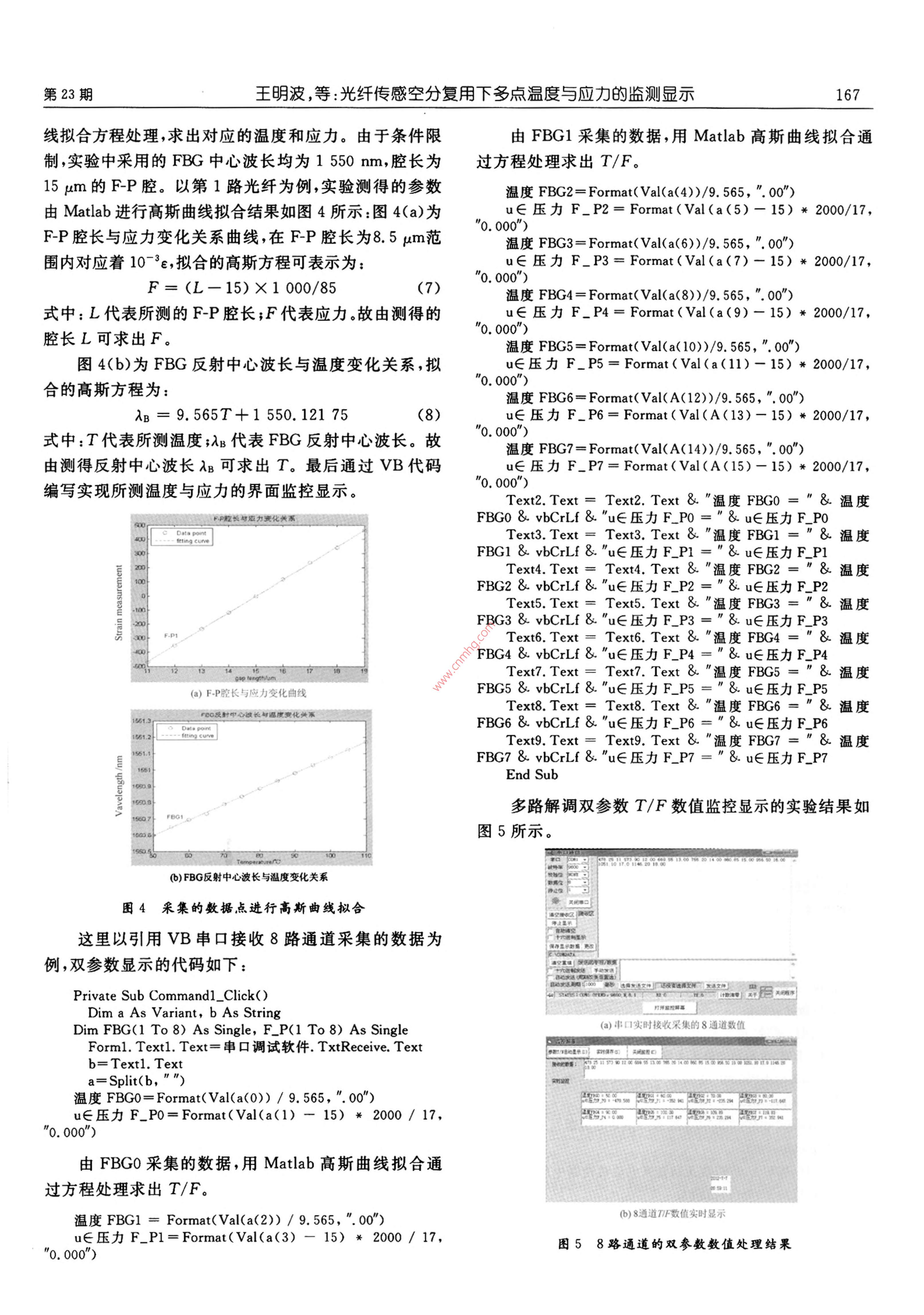 2012年12月1日現(xiàn)代電子技術(shù)Dec.2012第35卷第23期Modern Electronics TechniqueVo.35No.23光纖傳感空分復(fù)用下多點溫度與應(yīng)力的監(jiān)測顯示王明波,惠小強酉安郵電大學(xué)理學(xué)院,陜西西安710121)摘要:多參量多點實時監(jiān)測顯示是傳感研究領(lǐng)琙的一項重要技術(shù)。以光纖 Fabry-Perot(F-P)腔與光纖Brag光柵(FBG)傳感器的串聯(lián)復(fù)用結(jié)構(gòu)為單元構(gòu)建空分復(fù)用(SDM)系統(tǒng),設(shè)計了溫度、應(yīng)力多點實時顯示的方案。由FPGA構(gòu)建的SOPC與iosⅡ完成對多監(jiān)測點的數(shù)據(jù)采集,由VB串口通信接收FPGA存儲器存儲的采集數(shù)據(jù),再把此數(shù)據(jù)由高斯曲線擬合方程處理得到溫度和應(yīng)力的參數(shù)值,最后用VB實現(xiàn)監(jiān)測顯示。結(jié)果表明F-P腔與FBG串聯(lián)能有效克服溫度與應(yīng)力的交叉敷感,FPGA結(jié)合VB能很方便的實現(xiàn)多麥量多點的實時監(jiān)測顯示。關(guān)鍵詞:光纖傳感;空分復(fù)用;溫度與應(yīng)力顯示;FPGA;VB中圖分類號:TN911-34文獻(xiàn)標(biāo)識碼:A文章編號:1004373X(2012)23-0164-05Display of multi-point temperature and strain in space division multiplexing of fiber sensorsWANG Ming-bo, XI Xiao-qiangSchool of Science, Xi'an University of Posts and Telecommunications, Xi'an 710121, China)Abstract: The real-time display of multi-parameter and multi-point monitoring is an important technology in the researchield of sensors. For the space division multiplexing constituted by the multiplexing of fiber Fabry-Perot(F-P) cavity in seriesith fiber bragg grating(FBG) sensor, a real-time display proposal of multi- point temperature and strain is designed. Theprogrammable system on chip(SOPC)constituted by FPga and Nios f are adopted for data acquisition on multiple pointsand then VB serial communication is used to receive and process data from FPGA memorizer. Third, the data are processed byGaussian curve fitting equation to obtain temperature and strain parameter values. Finally the real-time monitoring is realizedwith VB. The results show that the design method of fiber Fabry-Perot(F-P) cavity in series with fiber Bragg grating(FBG)sensor can overcome the cross-sensitivity of temperature and strain, and FPga with the combination of vb can realize the display of multi-parameter and multi-point convenientlyKeywords: fiber sensor; space division multiplexing; display of temperature and strain; FPGA; VB本文主要完成了對多監(jiān)測點雙參數(shù)監(jiān)控顯示的研0引言究。FBG能通過反射或透射波長實現(xiàn)對溫度的測近年來,光纖光柵傳感技術(shù)的應(yīng)用在各行各業(yè)中得量;F-P可用做可調(diào)諧FP腔、濾波器、傳感器等,調(diào)到了快速的發(fā)展叫。人們對待測物理量在精度、性能、節(jié)腔長與電壓的關(guān)系能實現(xiàn)對應(yīng)力解調(diào)°。故首先設(shè)容量以及多參數(shù)等方面提出了更高的要求。這極大地計了一種基于FBG與FP腔傳感器串聯(lián)復(fù)用,并對其促進(jìn)了光纖光柵傳感復(fù)用類型相關(guān)理論和技術(shù)的研究,進(jìn)行空分復(fù)用,構(gòu)建成能實現(xiàn)多監(jiān)測點雙參數(shù)高精度解而解調(diào)顯示技術(shù)正是其中的一個重要環(huán)節(jié),現(xiàn)常以調(diào)的系統(tǒng)。分析FP腔與FBG串聯(lián)復(fù)用的光譜,可知能ARM,DSP,FPGA等芯片為核心控制多路數(shù)據(jù)信號的實現(xiàn)待測信號的高精度解調(diào):即FP腔長(應(yīng)力)和FBG采集、存儲和處理,并用 LabVIew,VB, Matlab及其混反射中心波長(溫度)的同時測量。并使用FBG和合使用等做界面顯示處理241。FP腔分別對溫度與應(yīng)力進(jìn)行測量,進(jìn)而與FP腔和文中FPGA與VB結(jié)合實現(xiàn)多參量的監(jiān)測顯示,FBG串聯(lián)復(fù)用所得結(jié)果進(jìn)行比較,通過實驗對該方法進(jìn)得益于FGA高度集成、內(nèi)部資源豐富、功能強大、時行了驗證。而空分復(fù)用就能實現(xiàn)多個監(jiān)測點的雙參數(shù)高序控制精確、支持并行處理、編程靈活等優(yōu)點;VB簡潔精度解調(diào)。此后由FPGA構(gòu)建的SOPC與Nos完成對易懂、界面設(shè)計簡單多監(jiān)測點雙參數(shù)的數(shù)據(jù)采集;由VB串口通信進(jìn)行數(shù)據(jù)接收,并把采集到的數(shù)據(jù)帶入高斯曲線擬合方程屮,求收稿日期:20120724出具體的溫度與應(yīng)力,并用VB界面實現(xiàn)了監(jiān)控顯示?;痦椖?國家自然科學(xué)基金資助(11174165)第23期王明波,等:光纖傳感空分復(fù)用下多點溫度與應(yīng)力的監(jiān)測顯示1651原理分析與理論模型形成最終的輸出光譜Io。其數(shù)學(xué)表達(dá)式為:Iout=I +14=In[fBG+(1-fFBG)2fE-PJ (4)1.1FBG的應(yīng)變和溫度響應(yīng)式中:fFBG=R·exp[-(λ-AB)2/C2],即用高斯分布來根據(jù)光纖耦合模型理論可知,滿足 Bragg條件的反表示FBG的反射譜,R為光柵峰值反射率;λB為 Bragg射光波長為:反射中心波長;c值的大小用于表征反射峰的寬度;AB= nera(1)fp=2r[1+cos(4πL/λ+x)],其中r為光纖端面反射式中:A為光柵周期;nf為有效折射率。當(dāng)A和nd因外率,L為FP腔的腔長,為光波長界同時引起較小的變化△A和△n時,由 Bragg條件可由式(4)可知,由傳感器返回的光譜并不是FBG傳知,反射波長會發(fā)生移位△B?!鰽B可表示為:感器與FP腔傳感器各自反射光譜的簡單疊加。此△AB=2△n4+2n:△A(2)時,若直接采集光譜信號中的FBG反射峰值波長作為若溫度、應(yīng)變共同作用時,產(chǎn)生的 Bragg
