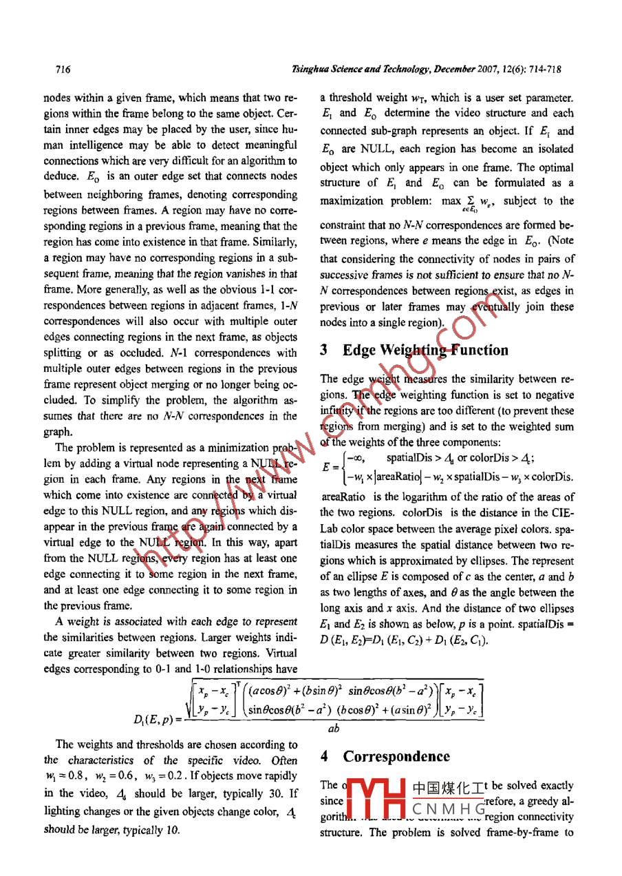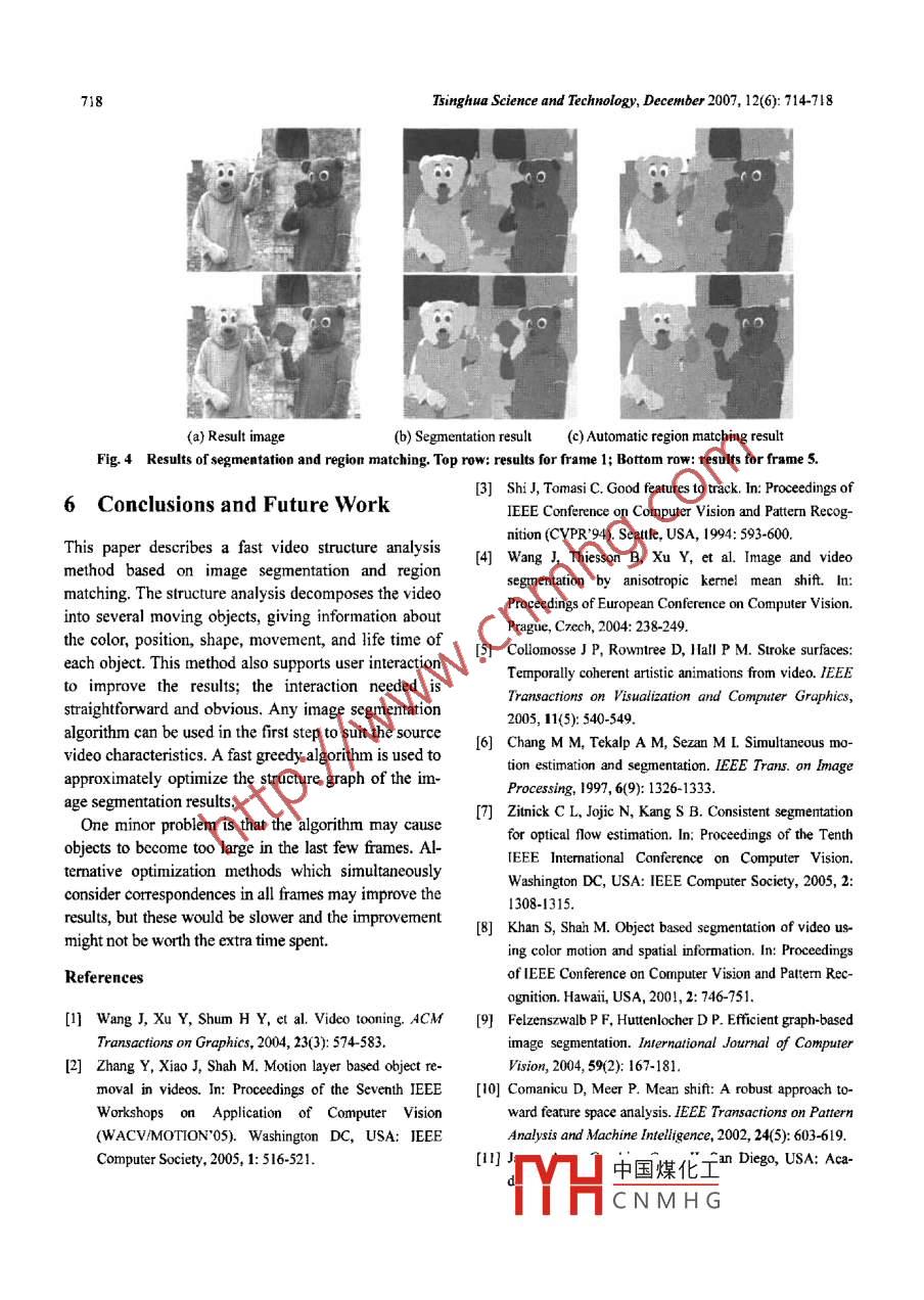 TSINGHUA SCIENCE AND TECHNOLOGYISSN 1007-0214 14/20 pp714-718Volume 12, Number 6, December 2007Video Structure Analysis*ZHANG Songhai (張松海)"”, ZHANG Yifei (張一飛), CHEN Tao (陳韜>,Peter M. Halr, Ralph Martin'1. Department of Computer Science and Technology, Tsinghua University, Beijing 100084, China;2. Department of Computer Science, University of Bath, Bath BA2 7AY, United Kingdom;3. School of Computer Science, Cardiff University, Wales CF24 3AA, United KingdomAbstract: Video structure analysis is a basic requrement for most content-based video editing and process-ing systems. This paper presents a fast video structure analysis method based on image segmentation ineach frame, with region matching between frames. The structure analysis decomposes the video into sev-eral moving objects, including information about their colors, positions, shapes, movements, and lifetimnes.The method also supports user interactions to improve the results. The result shows that this method is fastand stable and can complete video analyzing interactively.Key words: video structure analysis; video segmentation; image segmentation; region matchingpublications. For example, a video-tooning approach"'Introductionpays particular attention to providing coherent segmen-tation in the space-time space to re-render the video asVideo editing is widely used not only in professionala cartoon animation. A recent paper on motion layer-movie making, but also in many other areas such asbased object removal in videos'- also proposed a mo-home vidcos, educational videos, and marketing videos.tion-based video segmentation method as a preparatoryWith the popularization of video cameras, even morestep to object removal.potential applications are developing, Even relativelyIn many appications, this video analysis and seg-straightforward applications may wish to edit the videomentation step is the most time consuming step in the(for example, to remove an unwanted object from aapplication. For example, video tooning may take sev-scene) to process it in some other way (for example, toeral hours to segment a short video clip. This paperre-render it as a cartoon). In general, such tasks needpresents a fast video structure analysis method basedan understanding of the structure of the video content,on image segmentation in each frame, with regionas a basis both for editing and for more advanced andmatching between frames,complex video processing operations.The need to treat the whole video in a coherent1 Related Workmaner has been emphasized in several previousThe two main kinds of information in any video are theReceived: 2007-06-25color appearance and the visual motion, which leads to* Supported by the National Key Basic Research and Developmentthree approaches to video analysis. (1) The first is(973) Program of China (No. 2006CB303 106), the SpecializedResearch Fund for the Doctoral Program of Higher Education ofbased on motion tracking') as in the method used inMOE, P.R.C. No.20003057), and the Basic Ressearch Foun-中國煤化工moval4. Such ap-dation of Tsinghua National Laboratory for Information Scienceproac1 many highly tex-and Technology (TNList)tured:TYTHC N M H Gons, where trackers* * To whom corespondence should be adresse.:an readily follow moving objects and describe theirE-mail: zhangsh@gnail.com; Tel: 86 10-62797001-807ZHANG Songhai (張松海) et al: Video Structure Analysis715motion with a simple model. (2) Another approach isbodies and motions as in Fig. 1, whereas histogram-based on color and appearance. Such approaches arebased methods, i.e., color quantizaion, work wellmore suited to videos with relatively lttle texture andfor videos containing non-igid motion, for examplesimple scenes. They can, to a certain extent, cope withmoving liquids, fire, and clouds as shown in Fig. 2.various changes in objects, including deformation,splitting, and color changes. Such approaches can befurther subdivided into space-time segmentation, suchas performed by the anisotropic kermnel mean shift algo-rithm'", and segmentation in each frame separately fo]-lowed by matching regions between frames, as in thestroke surfaces approach!. Space-time segmentationFig, 1 Mean shift segmentationhas the advantage that it identifies the entire object byobservations throughout the video, which can, for ex-ample, help solve issues of occlusion, but such ap-proaches generally have long-run times and can besensitive to the speed of the object's motion and tovariations in the object shape, color, and lighting, sincethis is a global approach. The stroke surfaces method isfaster and can generally cope quite well with objectsFig.2 Histogram-based segmentationwhose appearance changes, but its object matchingability needs to improve. The method described hereEven when using the most suitable algorithm for afollows a similar scheme of image segmentation ingiven video, the segmentation result for each frameeach frame, with region matching between frames. Themay typically have hundreds of regions, which is still agreedy algorithm quickly matches regions betweenvery complex representation. A higher level resultframes quickly, and combines motion tracking andneeds to merge these regions in an appropriate way andsimple user interaction to improve the results. (3) The .to find associations between regions in adjacent framesthird approach is based on both color and motion in-of the video. Regions belonging to the same object areformation. Such approaches often introduce a statis-connected to derive a three-dimensional object intics-based model16-8J and use an expectation maximumspace-time. A given region may, for example, occluded(EM) algorithm to solve the optimization problem.by some other object in any given frame, in which caseSuch approaches lose the efficiency and the conven-the region is split in that frame with the space-timeience for user interaction, and are not suitable to fastrepresentation branching at that frame. Conversely,video struc