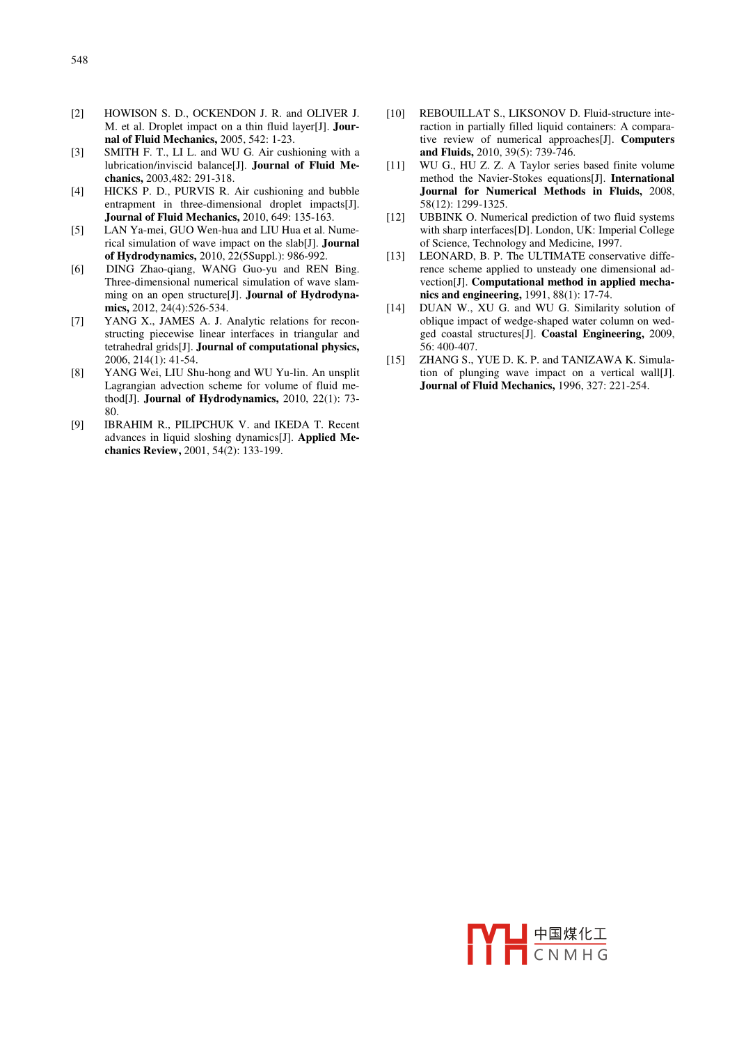 538Available online at www.sciencedirect.comScienceDirectHT充DJournal of HydrodynamicsEL SEVIER2014,26(4):538-548www.sciencedirect.com/science/journal/l001 6058DOI: 10.1016/S 1001 -6058( 14)60061-5Unstructured finite volume method for water impact on a rigid bodyYU Yan (余艷)College of Power and Energy Engineering, Harbin Engineering University, Harbin 150001, ChinaSchool of Science, Harbin University, Harbin 150086, China, E mail: yuyan801 206@ 126.comMING Ping-jian (明平劍)DUAN Wen-yang (段文洋)College of Shipbuilding Engineering, Harbin Engineering University, Harbin 150001, China(Received May 3, 2013, Revised September 11, 2013)Abstract: A new method is presented for the water impact simulation, in which the air- water two phase flow is solved using thepressure-based computational fluid dynamics method. Theoretically, the air effects can be taken into account in the water structureinteraction. The key point of this method is the air-water interface capture, which is treated as a physical discontinuity and can becaptured by a well-designed high order scheme. According to a normalized variable diagram, a high order discrete scheme onunstructured grids is realised, so a numerical method for the free surface flow on a fixed grid can be established. This method isimplemented using an in-house code, the General Transport Equation Analyzer, which is an unstructured grid finite volume solver.The method is verified with the wedge water and structure interaction problem.Key words: air cushion, numerical simulation, unstructured grid, volume of fluid (VOF)Introductionwas on the air cushion and on the period until“touch-Fluid/structure impact problems can be found wi-down". A further example was the case of a dropletdely in marine and ship engineering applications. Iimpact on a thin fluid layer during the initial stages' .many cases, the process in which the body of the fluidHicks and Purvis4I studied the air cushioning effectsbounded by a free surface impacts on approaching st-on a droplet impact on a structure or fluid. Lan et al.!5ructures or other fluids, is affected by air cushioning.studied the wave impact on slab using both experi-Many analytical solutions were. obtained with simpli-mental and numerical methods. Ding et al.'0 discussedfied assumptions. Wood et al.!l focused on the waterthe the characteristics of the wave impact forces onalone with approximations of the pressure-impulsethe undersides of the rectangular structures with va-theory for the impact process. Howison et al.!4I theore-rious length-breadth ratios. The last several decadestically studied the air cushioning effects in the gapsaw a great progress in this field. Initially, the effectsbetween the fluid and the structure. Another exampleof the gravity and the viscosity of the liquid are usua-was the case considered by Smith et al.5 for liquidlly ignored because the impact usually lasts for a verycolumns moving towards each other, but the focusshort period of time. When the compressibility of theliquid is ignored, the velocity potential can be introdu-* Project supported by the National Natural Science Foun-ced. The problem of a two-dimensional wedge ente-dation of China (Grant Nos. 51206031, 51079032), the Chinaring water can thus be studied step by step, from aPostdoctoral Science Foundation funded Project (Grant No.symmetrical wedge to an asymmetrical wedge, fromconstant velocity to free fall, and from a rigid body toBiography: YU Yan (1980-), Female, Ph. D. Candidatean elastic wedge body. So this problem is used to veri-Corresponding author: MING Ping-jian,fy the volume of fluid (VOF) method in this study.E-mail: pingjianming @ hrbeu.edu.cnIn the pre中國煤化工1 method isadopted to stud|YHCNMH Gpact on ast-ructure taking ....。...oning effect.539There are two normal interface reconstruction algori-V.{u[VU +(VU)I]}+ ρb(2)thms for the VOF method. One is based on the simpleline interface construction (SLIC) algorithm, and thewhere U,pb and p are the velocity vector, theother is based on the piecewise linear interface const-body force vector and the pressure, and ρ and μ areruction (PLIC) algorithm. Y ang and James' simula-ted the interaction between an extreme wave and athe density and the dynamic viscosity of the fluid.freely-floating structure using the VOF method basedWhen the fluid domain is discretized into small cells, .on an unstructured grid. Y ang et al.s proposed an un-we define the liquid volume fraction as a in eachsplit Lagrangian advection (ULA) scheme based oncell, which is the ratio of the volume taken by the li-PLIC, which was implemented with two dimension st-quid in the cell and the volume of the cell itself. Thusructured grids. However, these method could not gua-a is 1 foracell full of water and 0 for a cell full ofrantee that the free surfaces calculated on either sideair. For a cell containing both liquid and air 0Zaf[(n)no - ()rum)(13)through the cell face j. The value of the velocity inthe summation of Eq.(9) is taken at the intersection ofeach face with the line linking the centres of the twoThe advantage of this equation is that the term beforeadjacent cells. The accuracy of such an approximationu.。is also positive. This will improve the stability ofwas discussed in Ref.[11]. The required value on thethe solution.cell face is then interpolated from those at the cellcentres, which is another layer of approximation'There are many different interpolation methods. Herewe use .工(u)f = (u.)puD + Aa[(u)Ho - (u})pw]cPwhere 0≤A≤1. The subscripts HO and FUD irthe equation indicate that the value is obtained fromthe high order and the first order upwind methods, re-Fig.1 The grid structure and the normal and tangential direc-spectively, based on the sign of f;. This givestions of the cell faceFor the diffusion term in Eq.(8), we have之(u)pf=之f(n)r + SZzf[(4)mo - ()pum)ou;JupNVu,.dA=二(vVu)oAn=Z(μA。=Ion )。(14)Based on the definition of the first order upwind,the first ter