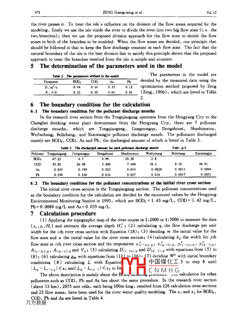 Joumnal of Environmental Sciences Vol. 12 , No.4,pp 469- -473,2000CN1-2629/XArticle ID: 1001-0742(2000)04-0469-05 CLC number; X131 Docment code; ATwo-dimensionalnumericalalgorithmforwater qualitymodeling in the topographically complicated riverZENG Guang ming' , JIANG Yi-min' , GUO Huai-cheng2 , Gordon Guo He Huang31. Environmental Protection Institute, Hunan University, Hunan 410082, China; 2. Environmental Science Center, PekingUniersity. Bejing 100871, China; 3. Environmental Systems Engineering. Universty of Regina, Sask S4S 0A2, Canada)Abstract:In this paper, a two-dimensional numerical calculation algorithm for the water quality rmodeling in the Hengyang Gity sectionof the Xiangjiang River is researched considering the efete of the Deyuandu navigational key project. The research river is windingof applying topographic map of the river course and the finite elenent method. The calculation result for the water quality modelingincludes the concentrtion felds for various pollutants. The numerical calculation algorithm for the water quality modeling stl up inthis paper can be applied to shallww river with similar topographically complicated river c∞urse.Key words: two dimensional river; water quality; numerical calculation algorithm1 IntroductionAccording to the Hunan component of the proposed inland waterways multipurpose project ,the Dayuandu navigational key project, located 62 km downstream from the Hengyang City, willbe built with the help of the world bank loan. After the project being constructed, the XiangjiangRiver section within the Hengyang City will be changed into a reservoir resulted from the projectand the water quality will be surely influenced as the river hydrological condition upstream from theproject will be changed. To make it clear how much negative influence the project will have on thewater quality in the Xiangjiang River section within the Hengyang City, the research river section(about 13 km) from the Tongqiaogang upstream from the Hengyang City to the Chengbei drinkingwater plant downstream from the Hengyang City was selected with the consideration of thepollutants' discharge distribution and the water quality management of the Hengyang City. Thelocation of the research river section is shown in Fig.1.The research river section is topographically complicated as it is winding, relatively shallowwith two branches resulted from an isle and its cross section changes irregularly along the river. Forthese reasons, the traditional one- dimensional water quality model and the traditional two-dimensional water quality model fit for straight river with uniform rectangle cross section can not beused for this research, and the two dimensional numerical calculation algorithm based on the finiteelement method is proposed. To finish the water quality modeling, totally about 2921 unit cellshave been divided in the researched 13 km river section and a lot of application problems have beenmet and solved. These problems include how to build the modeling algorithm, how to decide thewidth and length of the modeled unit cell, how to estimate the hydraulic and hydrologicalparameters required in the model and so on. As the water quality modeling problem based on thefinite element method for the topographically complected river is always difficult and not well solved(Cheng,1996; Heidtke, 1986; White, 1977 ),the two-dimensional numerical calculationalgorithm proposed in this paper and some details中國煤化工deling are quitepossible to be used as a reference for future waterMHC N MH Grparaphiallcomplicated river.Foundation item; The National Natural Science Foundation of China (No. 49201015) and the Science Foundation of EducationMinistry of Chine for Outstanding Young Teachers470ZENG Guang-ming et al.Vor. 122Water qualityFlow zoneRiver crOSS soctionFlow linemodelThe modelbuildingYapproech for the two-Deyuandu projoctxdimensionalnumerial氣十Xiangiang Rivercalculation algorithm mainlyincludes two steps. The firstZengshui Riverstep is to divide the river flowFig.2 The rectangular curved coordinateinto m flow zones followingsystem for the river weter qualitythe flow direction as well asmodelingintoriversections入-' Rexcceractonon perpendicularto the flow direction and then a series of(sce Fi23)Leishui Rivermathematical models for all the unit cells to model the waterquality based on the mass conservation law are established.To make the research easier, the flow discharge in each flowHengyang Ciyzone has to be kept constant. In this way there will be onlypollutant exchange resulting from the dispersion and not any flowFig.1 The loeation of the research riverdischarge exchange existing between the neighboring filow zones.Correspondingly, the width for each flow zone must change alongsectionthe river as the shape of the river cross section changes along theriver (Fig.2).Take one unit cell (given ij unit cell), assuming pollutant ( given BOC5) concentration isuniform in each unit cell, the pure added amount for each unit cell resulted from the river waterflow is:q;(L-1.s- Lq),(1)the pure added amount for BOD3 in each unit cell resulted from the longitudinal dispersion is:Di-.,.6(L-.- Ly) - D.i1.(Lj - Li+1.;),(2)the pure added amount for BODs in each unit cell resulted from the river cross dispersion is:Di,j-l).6(L;,s-1L:)- D,(i,+1)(Lj- L,j+1).As the decreased BODs amount in each ij unit cell is V;KawLj and the input BODs amountfrom the outside of each ij unit cell is Wj, therefore, the following equation can be obtainedacording to the mass conservation principle:VydL。/di =q(L-1;- Lg)+ Di-,(L1,- Lg)- Di,i+1.,)(L,- ..1,) .+ Di.1-n,(,.,1- L;) - Di,r.,+t)(L, - .,.1)- V;KuJLe+ W略,(4)in whichD(i-1,i),j = D(i-1,j).6i ●A(i1,i),g/5i-.j)j,(5)Dj.<(i+1,j) = Dij(i+1.J) ●Ang,(i+1,ji)/xi,(i+1,i),(6)D'(i,j-1). = Di,j-1),. A-//1i.(7)Di(5i,j+1) = Dij(i,+1中國煤化工(8)q,is the flow in the j flow zone, m'/s; L:CNMHGU unit ell, mg/;V; the volume for the ij unit cell, m3 ; Kai the'DuLs deoxyge