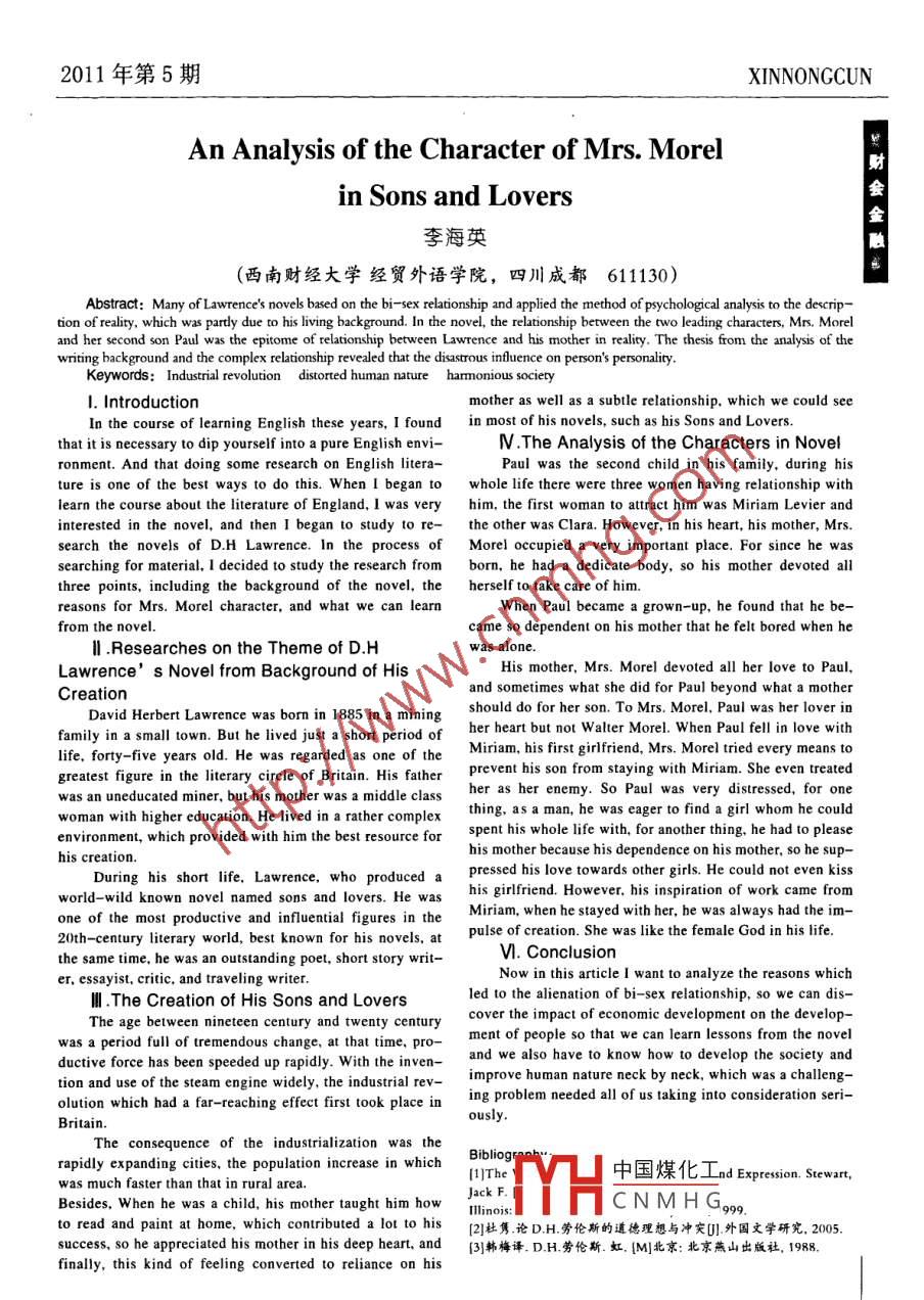 2011年第5期XINNONCCUNAn Analysis of the Character of Mrs. Morel材in Sons and Lovers會金李海英(西南財(cái)經(jīng)大學(xué)經(jīng)貿(mào)外語學(xué)院,四川成都611130)Abstract: Many of Lawrence's novels based on the bi-sex relationship and applied the method of psychological analysis to the descrip-tion of reality, which was pardly due to his living background. In the novel, the relationship between the two leading characters, Mrs. Moreland her second son Paul was the epitome of relationship between Lawrence and his mother in reality. The thesis from the analysis of thewriting background and the complex relationship revealed that the disastrous infuence on person's personality.Keywords: Industrial revolution distorted human nature harmonious socieryI. Introductionmother as well as a subtle relationship, which we could seeIn the course of learning English these years, I foundin most of his novels, such as his Sons and Lovers.that it is necessary to dip yourself into a pure English envi-N .The Analysis of the Characters in Novelronment. And that doing some research on English litera-Paul was the second child in his family, during histure is one of the best ways to do this. When 1 began to whole life there were three women having relationship withlearn the course about the literature of England, 1 was veryhim, the first woman to attract him was Miriam Levier andinterested in the novel, and then 1 began to study to re-the other was Clara. However, in his heart, his mother, Mrs.search the novels of D.H Lawrence. In the process of Morel occupied a very important place. For since he wassearching for material, 1 decided to study the research fromborn, he had a dedicate body, so his mother devoted allthree points, including the background of the novel, theherself to take care of him.reasons for Mrs. Morel character, and what we can learnWhen Paul became a grown-up, he found that he be-from the novel.came so dependent on his mother that he felt bored when heII .Researches on the Theme of D.Hwas alone.Lawrence' s Novel from Background of HisHis mother, Mrs. Morel devoted all her love to Paul,Creationand sometimes what she did for Paul beyond what a motherDavid Herbert Lawrence was born in 1885 in a miningshould do for her son. To Mrs. Morel, Paul was her lover infamily in a small town. But he lived just a short period ofher heart but not Walter Morel. When Paul fell in love withlife, forty five years old. He was regarded as one of theMiriam, his first girlfriend, Mrs. Morel tried every means togreatest figure in the literary circle of Britain. His fatherprevent his son from staying with Miriam. She even treatedwas an uneducated miner, but his mother was a middle classher as her enemy. So Paul was very distressed, for onewoman with higher education. He lived in a rather complexthing, as a man, he was eager to find a girl whom he couldenvironment, which provided with him the best resource forspent his whole life with, for another thing, he had to pleasehis mother because his dependence on his mother, so he sup-his creation.During his short life. Lawrence, who produced apressed his love towards other girls. He could not even kissworld- wild known novel named sons and lovers. He washis girlfriend. However, his inspiration of work came fromone of the most productive and influential figures in theMiriam, when he stayed with her, he was always had the im-20th- century literary world, best known for his novels, atpulse of creation. She was like the female God in his life.the same time, he was an outstanding poet, short story writ-VI. ConclusionNow in this article I want to analyze the reasons whicher, essayist, critic, and traveling writer.lI.The Creation of His Sons and Loversled to the alienation of bi-sex relationship, so we can dis-The age between nineteen century and twenty centurycover the impact of economic development on the develop-was a period full of tremendous change, at that time, pro-ment of people so that we can learn lessons from the novelductive force has been speeded up rapidly. With the inven-and we also have to know how to develop the society andtion and use of the steam engine widely, the industrial rev-improve human nature neck by neck, which was a challeng-olution which had a far-reaching effect first took place ining problem needed all of us taking into consideration seri-ously.The consequence of the industrialization was therapidly expanding cities, the population increase in which1]The |中國煤化工nd Expesion. Ssewar,was much faster than that in rural area.Besides, When he was a child, his mother taught him howJackF.TYH. CN M HGq9g.llinois:to read and paint at home, which contributed a lot to his[2]杜雋.論D.H.勞倫斯的道德理想與沖突[].外國文學(xué)研究, 2005.success, so he appreciated his mother in his deep heart, and{3]韓梅譯. D.H.勞倫斯.虹. (M]北京:北京燕山出版社, 1988.finally, this kind of feeling converted to reliance on his185 I