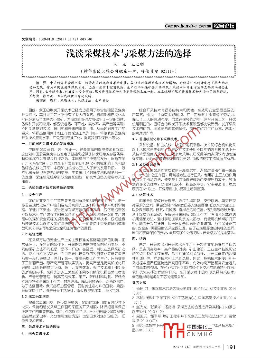 Comprehensive forum綜合論壇|文章編號: 1009-8119 (2015) 01 (2) -0191-01 .淺談采煤技術與采煤方法的選擇馮立王立順(神華集團大雁公司敏東一礦,呼倫貝爾021114)摘要中國的煤炭資源豐富。隨著我國時代和改革的發(fā)展,各行業(yè)對能源的需求不斷增加,對能源技術的開發(fā)有了很大的改進和發(fā)展。作為中國主要的煤炭資源,已顯示出需求空前提高。生產效率和煤礦企業(yè)的煤炭開采技術和開采方法的直接影響安全生產。同時,由于近年來,時有發(fā)生安全事故,煤炭開采技術和方法是緊密聯系在一起。在系統(tǒng)研究煤礦開采技術和方法作了簡要評述,并得出一些結論,為實踐提供可靠的支持。關鍵詞煤礦;采煤技術;采煤方法;生產安全目前,我國的煤炭開采技術已經成功運用了綜合性很強的煤炭綜合開采技術有很多的特點和優(yōu)勢,高效和安全是最重要的,開采技術,其開采工藝水平也有了很大的提高,機械化和自動化水產量高,也是一個能耗低的優(yōu)點,在一-定程度,上也減少了勞動力,平已經遍及全國各大小煤礦,為我國的經濟發(fā)展做出了- -定的貢獻。降低了工人的勞動強度。雖然有很多的功能,綜合開采工藝,其優(yōu)各煤礦開發(fā)和挖掘,都應該遵循,可靠性,高效率,高產量等實現,點是明顯的,但綜合的煤炭開采技術和設備都比較昂貴,發(fā)揮綜采不斷創(chuàng)新挖掘技術,將目前和未來的重要工作,從而達到高生產的技術的優(yōu)勢,必然要考慮其他條件,良好的礦井生產系統(tǒng),高水平要求,將提高使用集中和工作面采煤工藝為中心,將使我國的煤炭的管理操作等。開采技術應用水平,廣泛應用與推廠化,提高我國采煤技術等級。3.2普通機械化井下采煤技術一、目前國內采煤技術的發(fā)展概況采礦設備,礦山機械,從這個角度來看,技術和綜合機械化采中國的煤炭資源,居世界第一, 是最豐富的煤炭資源和煤炭,煤工藝技術是類似的。但是這種技術使用不同的站通機械化地下開這些對中國發(fā)展煤炭事業(yè)奠定了基礎和提供了快速可靠的必要條件。采技術是滾筒式采煤機。雙滾筒采煤機可采用單向實現雙向切削煤新中國成立以來煤炭行業(yè)之后,中國獲得了快速的發(fā)展,逐漸在采河實施。此外,滾筒式采煤機煤會更好,頂板的穩(wěn)定性有明顯的優(yōu)勢。礦方法有所創(chuàng)新,之后逐漸開發(fā)和實現機械化和機械化的工藝和設3.3放頂煤采煤法備綜合機械化開采。中國礦W機械化已進入了新的發(fā)展階段,一-般放頂煤采煤法的實質就是在厚煤層中,沿煤層底部布置一采高的機械設備也有更充分的更換,主要采用了封底式刮板輸送機一:2 ~ 3m的長壁工作面,用常規(guī)方法進行回采,利用礦山壓力的作用的速度,采煤機無鏈牽引雙滾筒和側放,新技術設備的程序綜采工輔以人工松動方法,使支架上方頂煤破碎后由支架后方放出。放頂作面。煤有許多的憂點:比如降低成本,提高效率等,它主要適用于煤層二、選擇采煤方法應該遵循的基礎厚度在6m以上,頂煤厚度過小易發(fā)生超前冒頂。2. 1安全生產3.4炮采技術煤礦企業(yè)安全生產首先要考慮和解決的問題是安全生產。進一炮采是用爆破開采煤炭,通過手動加載,皮帶輸送,單支柱支步發(fā)展現代化生產中我們要充分利用先進的科學技術水平和科學管撐屋頂的空間。爆破必須嚴格熟悉頂部的煤層厚度、頂底和承載能力,理,保證井下安全,促進選擇采煤方法的健康發(fā)展,應仔細檢查各以及煤層厚度,硬度,間隙等,選擇合適的位置,鉆孔爆破的數據集,種煤技術和生產過程中的采煤系統(tǒng),各個環(huán)節(jié)都必須在煤礦生產過利用煤炭鉆孔爆破。在爆破開采的放頂煤工作面,除部分裝載輸送程中的煤礦安全規(guī)程的規(guī)定相-致, 正確確定采煤技術,仔細檢查機用爆破方法,通過手動加載剩余的大部分,有使用機械煤礦幾開各種煤技術以煤礦及采礦系統(tǒng)的生產,-定 要防止支架傾倒機械事始。隨著開采的推進,頂板出現懸頂面積逐漸增加,為了保證正常故和其它事故可能危及安全和正常生產的漏洞。的、安全的,需要及時的采空區(qū)處理。由于在煤層厚度的特性的差異,2.2經濟適用屋頂和表面保護的要求,雖然有多個處理方法,但最常見的是崩落法。在采煤方法的安全生產上的主要標準的基礎是經濟的影響。正四、結語常情況下,在特定的條件下,開采的方法是最關鍵的經濟指標,不總之,開采技術和開采技術在生產和開發(fā)礦業(yè)的心臟的合理選同的采礦方法不同但是,是不一樣的,甚至遠。所以在選擇采礦方圣,是實現高效率、高產量的時候,礦山建設,工業(yè)生產指數和它法,技術分析不僅需要,而且需要比較最終的經濟效益來確定最佳的優(yōu)點和缺點采煤國家,除了標準的相關資源,主要是確定的合理方案一般應遵循以下原則:第一,提高采煤工作面生產。只有提高性和適用性,推進技術和工藝的選擇。因此,挖掘技術的使用和開了工作面產量,穩(wěn)產高產是可以實現的。提高產量是提高機械化開采過程中應嚴格堅持選擇高回采率煤、有效的高產量和高安全這幾采的計劃面臨的最大問題。第二,提高效率。采礦技術和工作組織個最基本的原則,在經濟實力和相同的條件下技術的地質特征煤層,的適當的選擇,采用先進的工藝和設備網以機械化以提高勞動者素我們優(yōu)先選擇