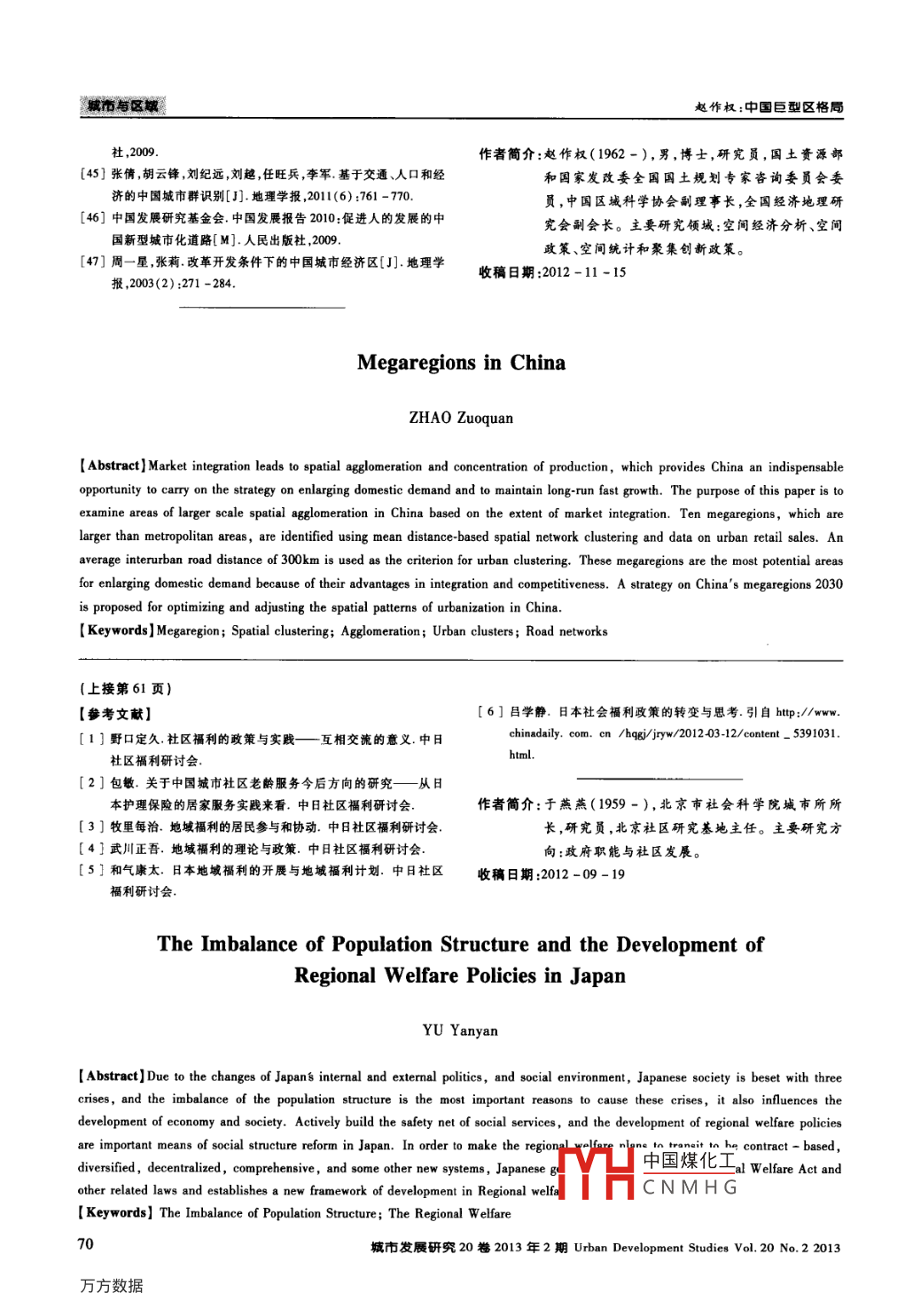城擊氧【文章編號】1006-3862(2013)02-0062-09中國巨型區(qū)格局趙作權(quán)(中國科學(xué)院科技政策與管理科學(xué)研究所,北京,100190)【摘要】市場一體化引發(fā)生產(chǎn)要素的空間聚集與集中,為我國實(shí)施擴(kuò)大內(nèi)需戰(zhàn)略、保持經(jīng)濟(jì)長期較快增長提供了十分難得的機(jī)遇。依據(jù)我國市場一體化進(jìn)程確定我國未來可能出現(xiàn)的大規(guī)模空間聚集與集中的區(qū)域。以城市間平均交通距離300km為標(biāo)準(zhǔn),利用基于平均距離的空間網(wǎng)絡(luò)聚類方法和城市消費(fèi)市場數(shù)據(jù),確定我國未來可能出現(xiàn)的10個(gè)規(guī)模比城市群更大的巨型區(qū)。這些巨型區(qū)是我國一體化程度和競爭力最強(qiáng)的地區(qū),是我國擴(kuò)大內(nèi)需最有潛力的地區(qū)。建議我國實(shí)施面向2030年巨型區(qū)發(fā)展戰(zhàn)略,優(yōu)化和調(diào)整我國的城市化格局。【關(guān)鍵詞】巨型區(qū);空間聚類;聚集;城市群;交通網(wǎng)絡(luò)【中圖分類號】K901;F291.1文獻(xiàn)標(biāo)識碼】A間聚集趨勢推動我國邁向內(nèi)生增長、持續(xù)發(fā)展的軌1概述道?中國有沒有自身特色的大國發(fā)展格局?這是市場一體化引發(fā)生產(chǎn)要素的空間聚集與集中,我國區(qū)域發(fā)展與管理、城市規(guī)劃等領(lǐng)域面臨的重大為我國實(shí)施擴(kuò)大內(nèi)需戰(zhàn)略、保持經(jīng)濟(jì)長期較快增長科學(xué)問題。特別是國內(nèi)市場一體化和交通設(shè)施快提供了十分難得的發(fā)展機(jī)遇。一方面,國際國內(nèi)市速發(fā)展直接影響著中國城市化格局的轉(zhuǎn)型。發(fā)達(dá)場促使我國經(jīng)濟(jì)不斷向大城市集中,推動了許多大的交通網(wǎng)絡(luò)已使我國各個(gè)城市和地區(qū)成為一個(gè)有城市群的興起。這種空間聚集與集中趨勢還要持機(jī)整體,全國經(jīng)濟(jì)呈現(xiàn)高度網(wǎng)絡(luò)化和一體化態(tài)勢續(xù)至少20年。到2030年,中國人口增長將達(dá)到頂(劉生龍和胡鞍鋼,2011),促使我國未來形成許多峰14.3億左右,有至少2億的人口進(jìn)人城市(蔡昉,規(guī)模比目前城市群更大的經(jīng)濟(jì)聚集區(qū)。到2030年2010)。空間聚集和集中是世界發(fā)達(dá)國家人均收人我國區(qū)域一體化進(jìn)程將突破目前我國城市群空間達(dá)到一萬美元之前經(jīng)濟(jì)發(fā)展的普遍規(guī)律(Word格局的限制,如長三角城市群可能與安徽省的許多Bank,2009),我國目前人均收入遠(yuǎn)遠(yuǎn)低于這個(gè)數(shù)字城市具有更密切的經(jīng)濟(jì)聯(lián)系。(國家統(tǒng)計(jì)局,2012)。另一方面,擴(kuò)大內(nèi)需已成為為此,本文根據(jù)我國區(qū)域經(jīng)濟(jì)一體化進(jìn)程,以我國經(jīng)濟(jì)社會發(fā)展的戰(zhàn)略基點(diǎn)。李克強(qiáng)(2012)指城市間平均交通距離300km.為標(biāo)準(zhǔn),利用基于距離出:“擴(kuò)大內(nèi)需是保持經(jīng)濟(jì)長期平穩(wěn)較快發(fā)展的必的空間網(wǎng)絡(luò)聚類方法和城市消費(fèi)市場數(shù)據(jù),確定我由之路。我國人口眾多國土江闊,是世界上最大國未來可能出現(xiàn)的10個(gè)規(guī)模比城市群更大的巨型的發(fā)展中國家,正處于發(fā)展的重要戰(zhàn)略機(jī)遇期,市聚集區(qū)(簡稱巨型區(qū))。這些巨型區(qū)是我國發(fā)展要場空間大,回旋余地大,內(nèi)需潛力大,對經(jīng)濟(jì)發(fā)展具素聚集水平最高的地區(qū),占我國消費(fèi)市場、GDP、就有持久的拉動作用。因此,必須堅(jiān)定不移地實(shí)施擴(kuò)大內(nèi)需戰(zhàn)略,……建立健全擴(kuò)大內(nèi)需的長效機(jī)制業(yè)和制造業(yè)的四分之三,占我國人口的三分之二牢牢掌握發(fā)展的主動權(quán)”。是我國擴(kuò)大內(nèi)需最有潛力的地區(qū)。可是,我國擁有大陸般的國土空間,哪里是擴(kuò)巨型區(qū)是在市場驅(qū)動下形成的要素高度聚集大內(nèi)需最有潛力的地區(qū)?如何利用市場引發(fā)的空的經(jīng)濟(jì)區(qū),作為新型聚集區(qū)目前已引起國際學(xué)術(shù)界和政府的高度關(guān)注(Ro,2009; Goldfeld,2007基金項(xiàng)目:國土資源部公益性行業(yè)科研專項(xiàng)經(jīng)費(fèi)項(xiàng)目(項(xiàng)目編V凵中國煤化工規(guī)劃協(xié)會提出號210101國家自然科學(xué)基金委管理學(xué)部重點(diǎn)項(xiàng)目(項(xiàng)目批準(zhǔn)美國2050CNMHG發(fā)展戰(zhàn)略,認(rèn)為號70933002);全國國土規(guī)劃綱要編制重大專題(專題7)巨型區(qū)正在取代20世紀(jì)的都市區(qū)(類似城市群)成城市發(fā)展研究20卷2013年2期 Urban Development Studies Vol.20No.22013趙作權(quán):中國巨型區(qū)格局城與區(qū)為美國參與21世紀(jì)全球經(jīng)濟(jì)競爭的新單元(RPA,尺度,這里250~300km基本與廣闊的成渝經(jīng)濟(jì)區(qū)2006)。歐盟早就認(rèn)識到巨型區(qū)的重要性,試圖在相當(dāng)。歐洲中部核心區(qū)之外建成若干個(gè)極具競爭力的巨型區(qū)(EC,1999; MSPTD,2011)。不過,我國政府和2文獻(xiàn)綜述學(xué)術(shù)界對巨型聚集區(qū)的關(guān)注比較有限。我國政府巨型區(qū)是國際國內(nèi)兩個(gè)市場共同驅(qū)動下要素正在推進(jìn)以城市群為主體的全國城市化戰(zhàn)略格局高度聚集的經(jīng)濟(jì)區(qū),由至少兩個(gè)都市區(qū)或城市群