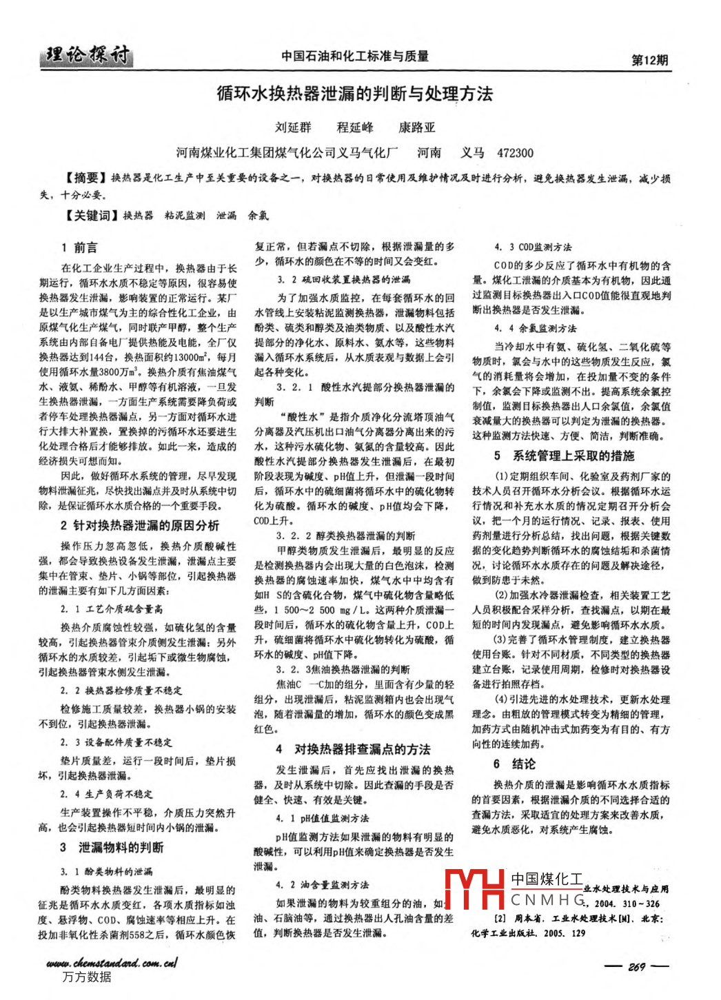 理倫探付中國石油和化工標(biāo)準(zhǔn)與質(zhì)量第12期循環(huán)水換熱器泄漏的判斷與處理方法劉延群程延峰康路亞河南煤業(yè)化工集團(tuán)煤氣化公司義馬氣化廠河南義馬472300【摘要】換熱器是化工生產(chǎn)中至關(guān)重要的設(shè)備之一,對換熱器的日常使用及維護(hù)情況及時進(jìn)行分析,避免換熱器發(fā)生泄漏,減少損失,十分必要【關(guān)鍵詞】換熱器粘泥監(jiān)測泄漏余氣1前言復(fù)正常,但若漏點不切除,根據(jù)泄漏量的多4.3C0D監(jiān)測方法在化工企業(yè)生產(chǎn)過程中,換熱器由于長少,循環(huán)水的顏色在不等的時間又會變紅c0D的多少反應(yīng)了循環(huán)水中有機(jī)物的含期運(yùn)行,循環(huán)水水質(zhì)不穩(wěn)定等原因,很容易使3.2硫回收裝置換熱器的泄漏量。煤化工泄漏的介質(zhì)基本為有機(jī)物,因此通換熱器發(fā)生泄漏,影響裝置的正常運(yùn)行。某廠為了加強(qiáng)水質(zhì)監(jiān)控,在每套循環(huán)水的回過監(jiān)測目標(biāo)換熱器出入口COD值能很直觀地判是以生產(chǎn)城市煤氣為主的綜合性化工企業(yè),由水管線上安裝粘泥監(jiān)測換熱器,泄漏物料包括斷出換熱器是否發(fā)生泄漏原煤氣化生產(chǎn)煤氣,同時聯(lián)產(chǎn)甲醇,整個生產(chǎn)酚類、硫類和醇類及油類物質(zhì)、以及酸性水汽4.4余氯監(jiān)測方法系統(tǒng)由內(nèi)部自備電廠提供熱能及電能,全廠僅提部分的凈化水、原料水、氨水等,這些物料當(dāng)冷卻水中有氨、硫化氫、二氧化硫等換熱器達(dá)到14臺,換熱面積約1300每月漏入循環(huán)水系統(tǒng)后,從水質(zhì)表觀與數(shù)據(jù)上會引物質(zhì)時,氯會與水中的這些物質(zhì)發(fā)生反應(yīng),氯使用循環(huán)水量3800萬m3,換熱介質(zhì)有焦油煤氣起各種變化。氣的消耗量將會增加,在投加量不變的條件水、液氨、稀酚水、甲醇等有機(jī)溶液,一旦發(fā)3.2.1酸性水汽提部分換熱器泄漏的下,余氯會下降或監(jiān)測不出。提高系統(tǒng)余氯控生換熱器泄漏,一方面生產(chǎn)系統(tǒng)需要降負(fù)荷或判斷制值,監(jiān)測目標(biāo)換熱器出人口余氯值,余氯值者停車處理換熱器漏點,另一方面對循環(huán)水進(jìn)“酸性水”是指介質(zhì)凈化分流塔頂油氣衰減量大的換熱器可以判定為泄漏的換熱器。行大排大補(bǔ)置換,置換掉的污循環(huán)水還要進(jìn)生分離器及汽壓機(jī)出口油氣分離器分離出來的污這種監(jiān)測方法快速、方便、簡潔,判斷準(zhǔn)確化處理合格后才能夠排放。如此一來,造成的水,這種污水硫化物、氨氮的含量較高。因此經(jīng)濟(jì)損失可想而知酸性水汽提部分換熱器發(fā)生泄漏后,在最初5系統(tǒng)管理上采取的措施因此,做好循環(huán)水系統(tǒng)的管理,盡早發(fā)現(xiàn)階段表現(xiàn)為堿度、pH值上升,但泄漏一段時間1)定期組織車間、化驗室及藥劑廠家的物料泄漏征兆,盡快找出漏點并及時從系統(tǒng)中切后,循環(huán)水中的硫細(xì)菌將循環(huán)水中的硫化物轉(zhuǎn)技術(shù)人員召開循環(huán)水分析會議。根據(jù)循環(huán)水運(yùn)除,是保證循環(huán)水水質(zhì)合格的一個重要手段化為硫酸,循環(huán)水的堿度、pH值均會下降,行情況和補(bǔ)充水水質(zhì)的情況定期召開分析會2針對換熱器泄漏的原因分析COD上升議,把一個月的運(yùn)行情況、記錄、報表、使用3.2.2醇類換熱器泄漏的判斷藥劑量進(jìn)行分析總結(jié),找出問題,根據(jù)關(guān)鍵數(shù)操作壓力忽高忽低,換熱介質(zhì)酸堿性甲醇類物質(zhì)發(fā)生泄漏后,最明顯的反應(yīng)據(jù)的變化趨勢判斷循環(huán)水的腐蝕結(jié)垢和殺菌情強(qiáng),都會導(dǎo)致?lián)Q熱設(shè)備發(fā)生泄漏,泄漏點主要是檢測換熱器內(nèi)會出現(xiàn)大量的白色泡沫,檢測況,討論循環(huán)水水質(zhì)存在的問題及解決途徑,集中在管束、墊片、小鍋等部位,引起換熱器換熱器的腐蝕速率加快,煤氣水中中均含有做到防患于未然的泄漏主要有如下幾方面因素如HS的含硫化合物,煤氣中硫化物含量略低(2)加強(qiáng)水冷器泄漏檢查,相關(guān)裝置工藝2.1工藝介質(zhì)硫含量高些,1500~2500ng/L。這兩種介質(zhì)泄漏人員積極配合采樣分析,查找漏點,以期在最換熱介質(zhì)腐蝕性較強(qiáng),如硫化氫的含量段時間后,循環(huán)水的硫化物含量上升,C0D上短的時間內(nèi)發(fā)現(xiàn)漏點,避免影響循環(huán)水水質(zhì)較高,引起換熱器管束介質(zhì)側(cè)發(fā)生泄漏;另外升,硫細(xì)菌將循環(huán)水中硫化物轉(zhuǎn)化為硫酸,循(3)完善了循環(huán)水管理制度,建立換熱器循環(huán)水的水質(zhì)較差,引起垢下或微生物腐蝕,環(huán)水的堿度、值下降使用臺賬。針對不同材質(zhì),不同類型的換熱器引起換熱器管束水側(cè)發(fā)生泄漏。3.2.3焦油換熱器泄漏的判斷建立臺賬,記錄使用周期,檢修時對換熱器設(shè)2.2換熱器檢修質(zhì)量不穩(wěn)定焦油C一C加的組分,里面含有少量的輕備進(jìn)行拍照存檔組分,出現(xiàn)泄漏后,粘泥監(jiān)測箱內(nèi)也會出現(xiàn)氣(4)引進(jìn)先進(jìn)的水處理技術(shù),更新水處理檢修施工質(zhì)量較差,換熱器小鍋的安裝泡,隨著泄漏量的增加,循環(huán)水的顏色變成黑理念。由粗放的管理模式轉(zhuǎn)變?yōu)榫?xì)的管理不到位,引