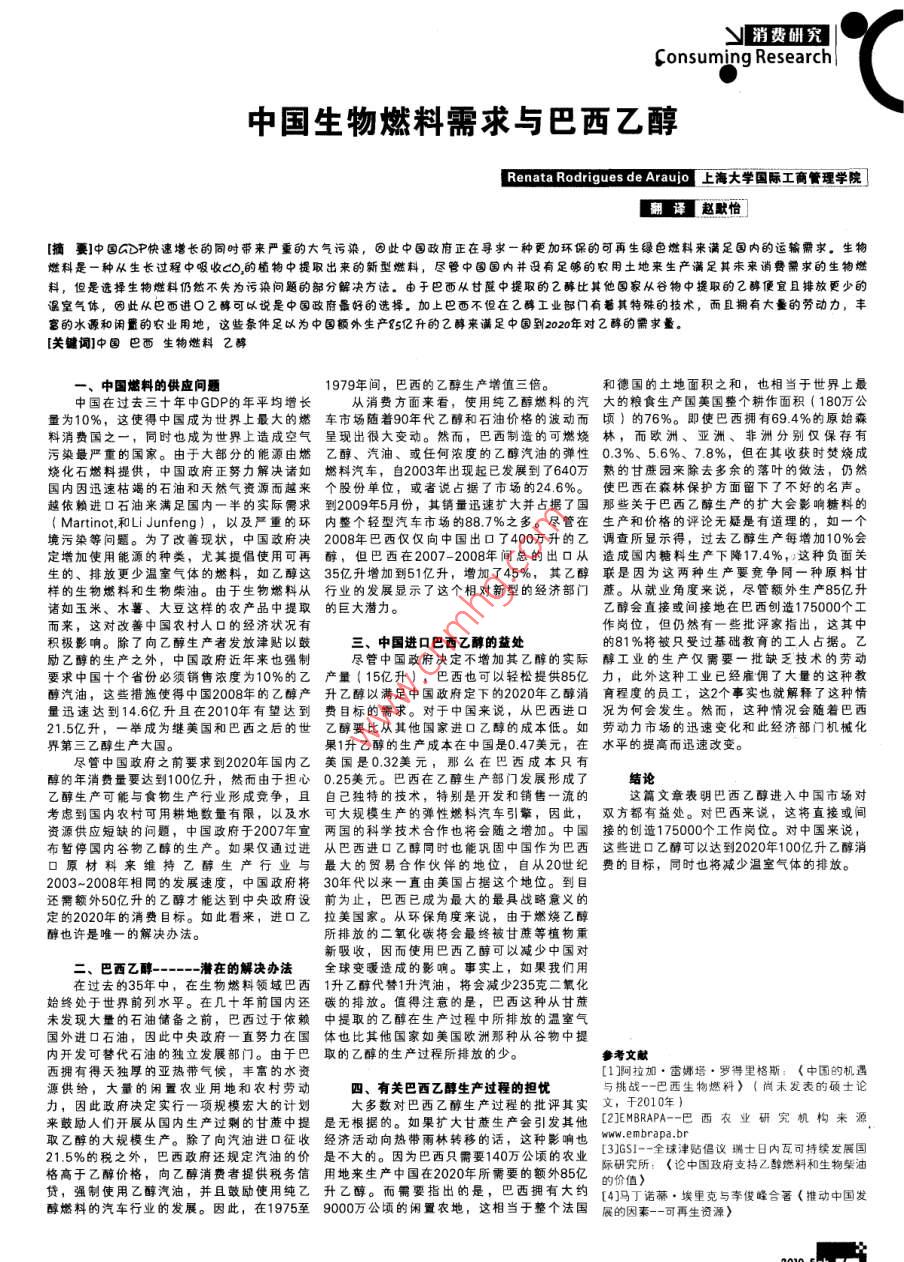 ⊥消費(fèi)究Consuming research中國生物燃料需求與巴西乙醇de Araujo|上海大學(xué)國際工商管理學(xué)院「翻譯趙歇怡」「摘要]中國DP快速增長的同時(shí)帶來嚴(yán)重的大氣污染,因此中國政府正在導(dǎo)求一種更加環(huán)保的可再生綠色燃料來滿足國內(nèi)的運(yùn)輸需求。生物燃科是一種從生長過程中吸收c△,的植物中提取出來的新型燃料,盡管中國國內(nèi)#設(shè)有足夠的農(nóng)用土地來生產(chǎn)滿足其未來誚費(fèi)需求的生物燃料,但是選擇生物繼料仍然不失為污染問題的部分解決方法。由于巴西從甘蔗中提取的己酶比其他國寂從谷物中提取的乙醇便宜且排放更少的謠皇氣體,因此從巴西進(jìn)口乙醇可以說是中國政府最好的選擇。加上巴西不但在乙醇工業(yè)部門有著其特殊的技術(shù),面且擁有大量的勞動(dòng)力,豐露的水源和閑置的農(nóng)業(yè)用地,這些條件足以為中國額外生產(chǎn)5億升的乙醇來滿足中國到2020年對(duì)乙醇的需求量關(guān)鍵詞中國巴西生物燃料乙醇、中國燃料的供應(yīng)問題1979年間,巴西的乙醇生產(chǎn)增值三倍。和德國的土地面積之和,也相當(dāng)于世界上最國在過去三十年中GDP的年平均增長從消費(fèi)方面來看,使用純乙醇燃料的汽大的糧食生產(chǎn)國美國整個(gè)耕作面積(180萬公量為10%,這使得中國成為世界上最大的燃車市場隨著90年代乙醇和石油價(jià)格的波動(dòng)而頃)的76%。即使巴西擁有694%的原始森料消費(fèi)國之一,同時(shí)也成為世界上造成空氣呈現(xiàn)出很大變動(dòng)。然而,巴西制造的可燃燒林,而歐洲、亞洲、非洲分別僅保存有污染最嚴(yán)重的國家。由于大部分的能源由燃乙醇、汽油、或任何濃度的乙醇汽油的彈性03%、56%、78%,但在其收獲時(shí)焚燒成燒化石燃料提供,中國政府正努力解決諸如燃料汽車,自2003年出現(xiàn)起已發(fā)展到了640萬熟的甘蔗園來除去多余的落葉的做法,仍然國內(nèi)因迅速枯竭的石油和天然氣資源而越來個(gè)股份單位,或者說占據(jù)了市場的246%。使巴西在森林保護(hù)方面留下了不好的名聲。越依賴進(jìn)口石油來滿足國內(nèi)一半的實(shí)際需求到2009年5月份,其銷量迅速擴(kuò)大并占據(jù)了國那些關(guān)于巴西乙醇生產(chǎn)的擴(kuò)大會(huì)影響糖料的( Martinot和 Li Junfeng),以及嚴(yán)重的環(huán)內(nèi)整個(gè)輕型汽車市場的88.7%之多。盡管在生產(chǎn)和價(jià)格的評(píng)論無疑是有道理的,如境污染等問題。為了改善現(xiàn)狀,中國政府決2008年巴西僅僅向中國出口了400萬升的乙調(diào)查所顯示得,過去乙醇生產(chǎn)每增加10%會(huì)定增加使用能源的種類,尤其提倡使用可再醇,但巴西在2007-2008年間總的出口從造成國內(nèi)糖料生產(chǎn)下降174%,這種負(fù)面關(guān)生的、排放更少溫室氣體的燃料,如乙醇這35億升增加到51億升,增加了45%,其乙醇聯(lián)是因?yàn)檫@兩種生產(chǎn)要競爭同一種原料甘樣的生物燃料和生物柴油。由于生物燃料從行業(yè)的發(fā)展顯示了這個(gè)相對(duì)新型的經(jīng)濟(jì)部門蔗。從就業(yè)角度來說,盡管額外生產(chǎn)85億升諸如玉米、木薯、大豆這樣的農(nóng)產(chǎn)品中提取的巨大潛力。乙醇會(huì)直接或間接地在巴西創(chuàng)造175000個(gè)工而來,這對(duì)改善中國農(nóng)村人口的經(jīng)濟(jì)狀況有作崗位,但仍然有一些批評(píng)家指出,這其中積極影響。除了向乙醇生產(chǎn)者發(fā)放津貼以鼓三、中國進(jìn)口巴西乙醇的益處的81%將被只受過基礎(chǔ)教育的工人占據(jù)。乙勵(lì)乙醇的生產(chǎn)之外,中國政府近年來也強(qiáng)制盡管中國政府決定不增加其乙醇的實(shí)際醇工業(yè)的生產(chǎn)僅需要一批缺乏技術(shù)的勞動(dòng)要求中國十個(gè)省份必須銷售濃度為10%的乙產(chǎn)量(15億升),巴西也可以輕松提供85億力,此外這種工業(yè)已經(jīng)雇傭了大量的這種教醇汽油,這些措施使得中國2008年的乙醇產(chǎn)升乙醇以滿足中國政府定下的2020年乙醇消育程度的員工,這2個(gè)事實(shí)也就解釋了這種情量迅速達(dá)到14.6億升且在2010年有望達(dá)到費(fèi)目標(biāo)的需求。對(duì)于中國來說,從巴西進(jìn)口況為何會(huì)發(fā)生。然而,這種情況會(huì)隨著巴西21.5億升,一舉成為繼美國和巴西之后的世乙醇要比從其他國家進(jìn)口乙醇的成本低。如勞動(dòng)力市場的迅速變化和此經(jīng)濟(jì)部門機(jī)械化界第三乙醇生產(chǎn)大國1升乙醇的生產(chǎn)成本在中國是0.47美元,在水平的提高而迅速改變盡管中國政府之前要求到2020年國內(nèi)乙英國是0.32美元,那么在巴西成本只有醇的年消費(fèi)量要達(dá)到100億升,然而由于擔(dān)心0.25美元。巴西在乙醇生產(chǎn)部門發(fā)展形成了結(jié)論別是開發(fā)和銷這篇文章表明巴西乙醇進(jìn)入中國市場對(duì)考慮到國內(nèi)農(nóng)村可用耕地?cái)?shù)量有限,以及水可大規(guī)模生產(chǎn)的彈性燃料汽車引擎,因此,雙方都有益處。對(duì)巴西來說,這將直接或間資源供應(yīng)短缺的問題,中國政府于2007年宣兩國的科學(xué)技術(shù)合作也將會(huì)隨之增加。中國接的創(chuàng)造175000個(gè)工作崗位。對(duì)中國來說,布暫停國內(nèi)谷物乙醇的生產(chǎn)。如果僅通過進(jìn)從巴西進(jìn)口乙醇同時(shí)也能