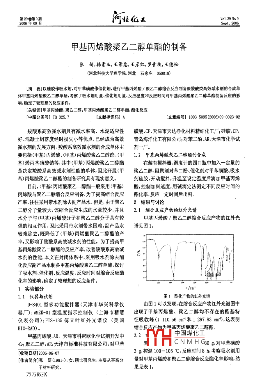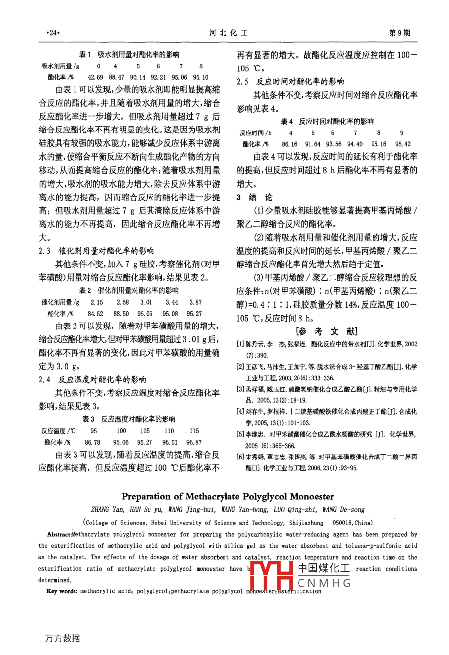 第29卷第9期VoL.29 Na92006年09月河北化工Sept. 2006甲基丙烯酸聚乙二醇單酯的制備張妍,韓素玉,王景惠,王彥紅, 羅青枝,王德松(河北科技大學(xué)理學(xué)院,河北石家莊050018)[摘要]以硅膠作吸水劑,對(duì)甲苯磺酸作催化劑,進(jìn)行甲基丙烯酸/聚乙二醇縮合反應(yīng)制備聚羧酸類高效減水劑的合成單體甲基丙烯酸聚乙二醇單酯,考察了吸水劑用量、催化劑用量、反應(yīng)溫度和反應(yīng)時(shí)間對(duì)甲基丙烯酸聚乙二醇單酯制備反應(yīng)的影響,確定了較理想的反應(yīng)條件。[關(guān)鍵詞]甲基丙烯酸;聚乙二醇;甲基丙烯酸聚乙二醇單酯;酯化反應(yīng)[中圖分類號(hào)] TQ 325.7[文獻(xiàn)標(biāo)識(shí)碼] A[文章編號(hào)] 1003- -5095 (2006)09-0023-02羧酸系高效減水劑具有減水率高、水泥適應(yīng)性磺酸,CP,天津市天達(dá)凈化材料精細(xì)化工廠;硅膠,CP,好、混凝土坍落度經(jīng)時(shí)損失小等優(yōu)點(diǎn),已經(jīng)成為高效青島海洋化工有限公司;對(duì)苯二酚,AR,天津市化學(xué)試減水劑的發(fā)展方向。羧酸系高效減水劑的合成單體主劑一廠。要包括(甲基)丙烯酸、(甲基)丙烯酸聚乙二醇酯、(甲1.2甲 基丙烯酸聚乙二醇酯的合成基)烯丙基磺酸鈉等,其中(甲基)丙烯酸聚乙二醇酯在裝有攪拌器、溫度計(jì)的四口瓶中加入- -定 量的是決定羧酸系高效減水劑性能的單體,因此開展(甲聚乙二醇、阻聚劑對(duì)苯二酚、催化劑對(duì)甲苯磺酸、吸水基)丙烯酸聚乙二醇酯的制備研究具有現(xiàn)實(shí)意義。劑硅膠,開動(dòng)攪拌,升溫至設(shè)定溫度后滴加甲基丙烯目前,(甲基)丙烯酸聚乙二醇酯一般采用(甲基)酸,控制加料速度,用堿滴定法測(cè)定不同反應(yīng)時(shí)間的丙烯酸與聚乙二醇縮合反應(yīng)制備,為了提高縮合反應(yīng)酯化率,反應(yīng)- -定時(shí)間后出料。產(chǎn)率,往往采用帶水劑除去副產(chǎn)品水。但是,由于聚乙2結(jié)果與討論二醇分子量較大,該縮合反應(yīng)生成的水量較少,并且2.1縮合反應(yīng)產(chǎn) 物的紅外光譜水分子與(甲基)丙烯酸分子和聚乙二醇分子具有較甲基丙烯酸/聚乙二醇縮合反應(yīng)產(chǎn)物的紅外光強(qiáng)的相互作用,因此采用帶水劑帶水困難,副產(chǎn)品水譜見圖1。較難除去,既降低了(甲基)丙烯酸聚乙二醇酯的產(chǎn)率,又影響了羧酸系高效減水劑的性能。為了提高甲基丙烯酸聚乙二醇酯的反應(yīng)產(chǎn)率,改善羧酸系高效減水劑的性能,本文在封閉體系中,采用吸水劑除去酯化反應(yīng)副產(chǎn)品水制備甲基丙烯酸聚乙二醇單酯,探討了吸水劑、催化劑、反應(yīng)溫度、反應(yīng)時(shí)間對(duì)縮合反應(yīng)酯化率的影響,確定了較理想的反應(yīng)條件。1實(shí)驗(yàn)部分v/cmr' .1.1 儀器與試劑圖1酯化產(chǎn)物的紅外光譜D-8401型多功能攪拌器(天津市華興科學(xué)儀由圖1可以發(fā)現(xiàn),在縮合反應(yīng)產(chǎn)物紅外光譜圖中器廠);WMZK-01型溫度指示控制儀(上海市精慧出現(xiàn)了甲基丙烯酸、聚乙二醇均不存在的酯基特儀表公司);FTS-135傅立葉紅外光譜儀(美 國(guó)征吸收峰(1 110. 56 cm'和1 297. 83 cm"), 這表明BIO-RAD)??s合,反應(yīng)產(chǎn)物為電基丙烯酸聚7.二醇酯。中國(guó)煤化工甲基丙烯酸,AR,天津市科密歐化學(xué)試劑開發(fā)中2.2心;聚乙二醇,AR,天津市標(biāo)準(zhǔn)科技有限公司;對(duì)甲苯Y(jié)HCNMHG30g,對(duì)甲苯磺酸3 g,控溫100- 105 C,反應(yīng)時(shí)間8 h,考察吸水劑用[收稿日期]2006-06-07[作者簡(jiǎn)介]張妍(1981-),女,碩士研究生,主要從事高分量對(duì)甲基丙烯酸和聚乙二醇縮合反應(yīng)酯化率影響,結(jié)子材料研究. .果見表1?!?4●河北化工第9期表1吸水劑用量對(duì)酯化率的影響再有顯著的增大。故酯化反應(yīng)溫度應(yīng)控制在100-吸水劑用量/g04.5678105 C。酯化率%42.69 88.47 90.14 92.21 95.06 95. 10由表1可以發(fā)現(xiàn),少量的吸水劑即能明顯提高縮2.5反應(yīng)時(shí)間對(duì)酯化率的影響其他條件不變,考察反應(yīng)時(shí)間對(duì)縮合反應(yīng)酯化率合反應(yīng)的酯化率,并且隨著吸水劑用量的增大,縮合影響見表4。反應(yīng)酯化率進(jìn)一步增大,但吸水劑用量超過7 g后表4反應(yīng)時(shí)間對(duì)酯化率的影響縮合反應(yīng)酯化率不再有明顯的變化。這是因?yàn)槲畡┓磻?yīng)時(shí)間/h456789硅膠具有較強(qiáng)的吸水能力,能夠減少反應(yīng)體系中游離酯化率% 86.16 91.64 93.56 94.40 95.16 95.42水的量,使縮合平衡反應(yīng)不斷向生成酯化產(chǎn)物的方向由表4可以發(fā)現(xiàn),反應(yīng)時(shí)間的延長(zhǎng)有利于酯化率移動(dòng),從而提高縮合反應(yīng)的酯化率;隨著吸水劑用量的提高,但反應(yīng)時(shí)間超過8 h后酯化率不再有顯著的的增大,吸水劑的吸水能力增大,除去反應(yīng)體系中游增大。離水的能力提高,因而縮合反應(yīng)的酯化率進(jìn)- -步提3結(jié)論高;但吸水劑用量超過7 g后其清除反應(yīng)體系中游(1)少量吸水劑硅膠能夠顯著提高甲基丙烯酸1離水的能力不再提高,因此縮合反應(yīng)酯化率不再增聚乙二醇縮合反應(yīng)的酯化率。大。(2)隨著吸水劑用量和催化劑用量的增大,反應(yīng)2.3催化劑用 量對(duì)酯化率的影響溫度的提高和反應(yīng)時(shí)間的延長(zhǎng),甲基丙烯酸/聚乙二其他條件不變,加入7 g硅膠,考察催化劑(對(du