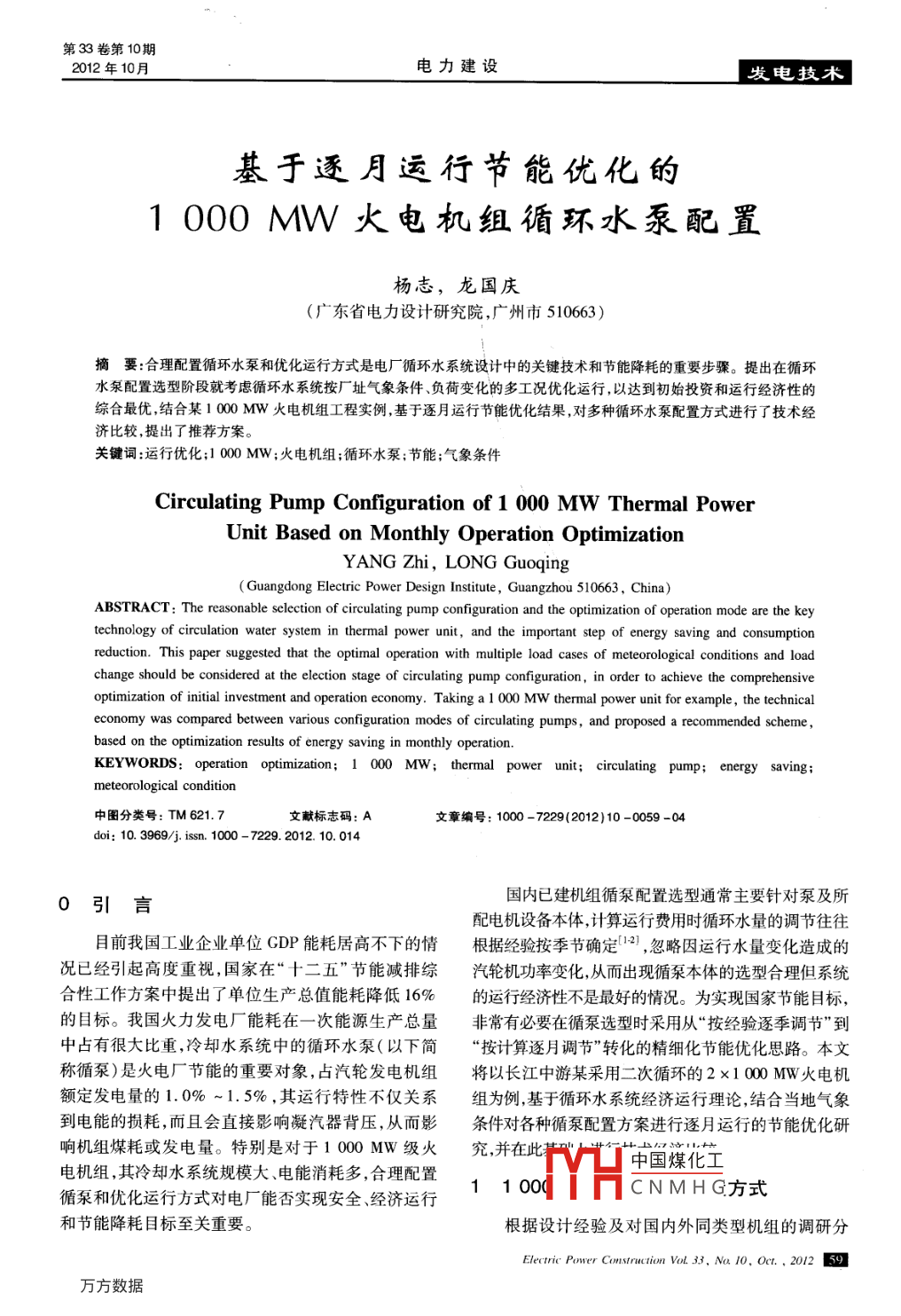 第33卷第10期2012年10月電力建設(shè)發(fā)電技術(shù)基于逐月運(yùn)行節(jié)能優(yōu)化的1000MW火電機(jī)組循環(huán)水泵配置楊志,龍國慶(廣東省電力設(shè)計(jì)研究院,廣州市510663 )摘要:合理配 置循環(huán)水泵和優(yōu)化運(yùn)行方式是電廠循環(huán)水系統(tǒng)設(shè)計(jì)中的關(guān)鍵技術(shù)和節(jié)能降耗的重要步驟。提出在循環(huán)水泵配置選型階段就考慮循環(huán)水系統(tǒng)按廠址氣象條件、負(fù)荷變化的多工況優(yōu)化運(yùn)行,以達(dá)到初始投資和運(yùn)行經(jīng)濟(jì)性的綜合最優(yōu),結(jié)合某1 000 MW火電機(jī)組工程實(shí)例,基于逐月運(yùn)行節(jié)能優(yōu)化結(jié)果,對(duì)多種循環(huán)水泵配置方式進(jìn)行了技術(shù)經(jīng)濟(jì)比較,提出了推薦方案。關(guān)鍵詞:運(yùn)行優(yōu)化;10000 MW;火電機(jī)組;循環(huán)水泵;節(jié)能;氣象條件:Circulating Pump Configuration of 1 000 MW Thermal PowerUnit Based on Monthly Operation OptimizationYANG Zhi, LONG Guoqing(Guangdong Electric Power Design Institute, Guangzhou 510663, China)ABSTRACT: The reasonable section of circulating pump configuration and the opimization of operation mode are the keytechnology of circulation water sysem in thermal power unit, and the important step of energy saving and consumptionreduction. This paper suggested that the optimal operation with multiple load cases of meteorological conditions and loadchange should be considered at the elecion stage of circulating pump configuraion, in order to achieve the comprehensiveoptimization of initial investment and operation economy. Taking a 1 000 MW thermal power unit for example, the technicaleconomy was compared between various configuration modes of circulating pumps, and proposed a recommended scheme,based on the optimization results of energy saving in monthly operation.KEYWORDS: operation optimization; 1 000 MW; thermal power unit; circulating pump; energy saving;meteorological condition中團(tuán)分類號(hào): TM 621.7文獻(xiàn)標(biāo)志碼: A文章編號(hào): 1000 -7229(2012)10-0059 -04doi: 10. 3969/j. issn. 1000 - 7229.2012. 10. 014國內(nèi)已建機(jī)組循泵配置選型通常主要針對(duì)泵及所0引言配電機(jī)設(shè)備本體,計(jì)算運(yùn)行費(fèi)用時(shí)循環(huán)水量的調(diào)節(jié)往往目前我國工業(yè)企業(yè)單位GDP能耗居高不下的情根據(jù)經(jīng)驗(yàn)按季節(jié)確定['21,忽略因運(yùn)行水量變化造成的況已經(jīng)引起高度重視,國家在“十二五”節(jié)能減排綜汽輪機(jī)功率變化,從而出現(xiàn)循泵本體的選型合理但系統(tǒng)合性工作方案中提出了單位生產(chǎn)總值能耗降低16%的運(yùn)行經(jīng)濟(jì)性不是最好的情況。為實(shí)現(xiàn)國家節(jié)能目標(biāo),的目標(biāo)。我國火力發(fā)電廠能耗在- -次能源生產(chǎn)總量非常有必要在循泵選型時(shí)采用從“按經(jīng)驗(yàn)逐季調(diào)節(jié)”到中占有很大比重,冷卻水系統(tǒng)中的循環(huán)水泵(以下簡“按計(jì)算逐月調(diào)節(jié)”轉(zhuǎn)化的精細(xì)化節(jié)能優(yōu)化思路。本文稱循泵)是火電廠節(jié)能的重要對(duì)象,占汽輪發(fā)電機(jī)組將以長江中游某采用二次循環(huán)的2x 1000 MW火電機(jī)額定發(fā)電量的1. 0% ~1. 5% ,其運(yùn)行特性不僅關(guān)系組為例,基于循環(huán)水系統(tǒng)經(jīng)濟(jì)運(yùn)行理論,結(jié)合當(dāng)?shù)貧庀蟮诫娔艿膿p耗,而且會(huì)直接影響凝汽器背壓,從而影條件對(duì)各種循泵配置方案進(jìn)行逐月運(yùn)行的節(jié)能優(yōu)化研響機(jī)組煤耗或發(fā)電量。特別是對(duì)于1 000 MW級(jí)火究,并在此著小進(jìn)行南暗花竹中國煤化工電機(jī)組,其冷卻水系統(tǒng)規(guī)模大、電能消耗多,合理配置11000HCNM H G.方式循泵和優(yōu)化運(yùn)行方式對(duì)電廠能否實(shí)現(xiàn)安全、經(jīng)濟(jì)運(yùn)行和節(jié)能降耗目標(biāo)至關(guān)重要。根據(jù)設(shè)計(jì)經(jīng)驗(yàn)及對(duì)國內(nèi)外同類型機(jī)組的調(diào)研分Eletrir Poner Construction VoL 33, Na 10, Oc. , 20121 59發(fā)電技術(shù)電力建設(shè)2012年10月析[3]. ,結(jié)合廠址氣象條件特點(diǎn),本工程2x1 000 MW22 配置方案1循泵運(yùn)行工況(1 x1 000 MW機(jī)組)Tab.2 Operating conditions in No, 1 configuration機(jī)組循泵主要按一機(jī)兩泵擴(kuò) 大單元制、一-機(jī)三泵單元scheme of circulating pump (1 x1 000 MW unit)制2種配置方式進(jìn)行比選。進(jìn)口泵價(jià)格昂貴,循泵型循泵運(yùn)行方式流量百分比/%流量/(m3.s-1)式按國產(chǎn)立式斜流泵考慮。3泵1028.4由于四季氣溫變化和全年發(fā)電負(fù)荷變化,機(jī)組對(duì)2泵7S21.3循環(huán)水量的需求變化也較大。為了降低電耗,可將1泵4(11.41 000 MW機(jī)組循泵設(shè)計(jì)成流量可調(diào)的方式。改變循泵特性一般采用變頻調(diào)節(jié)、改變泵的轉(zhuǎn)速、調(diào)節(jié)導(dǎo)葉表3配置方案2循泵運(yùn)行工況(1 x1 000 MW機(jī)組)[ab.3 Operating conditions in No.2 configuration和葉片的安裝角度3種方法。根據(jù)同類工程計(jì)算結(jié)果[4],變頻器的投資回收流量百分比/% .流量/(m2 .g-')期取決于機(jī)組變負(fù)荷運(yùn)行的時(shí)間。大型變頻器價(jià)格3高高,為減小投人的風(fēng)險(xiǎn),建議電廠在投運(yùn)幾年后再進(jìn)2高1低9行循泵變頻改造論證。2低1高25.4近年來,國內(nèi)1000 MW火電機(jī)組
