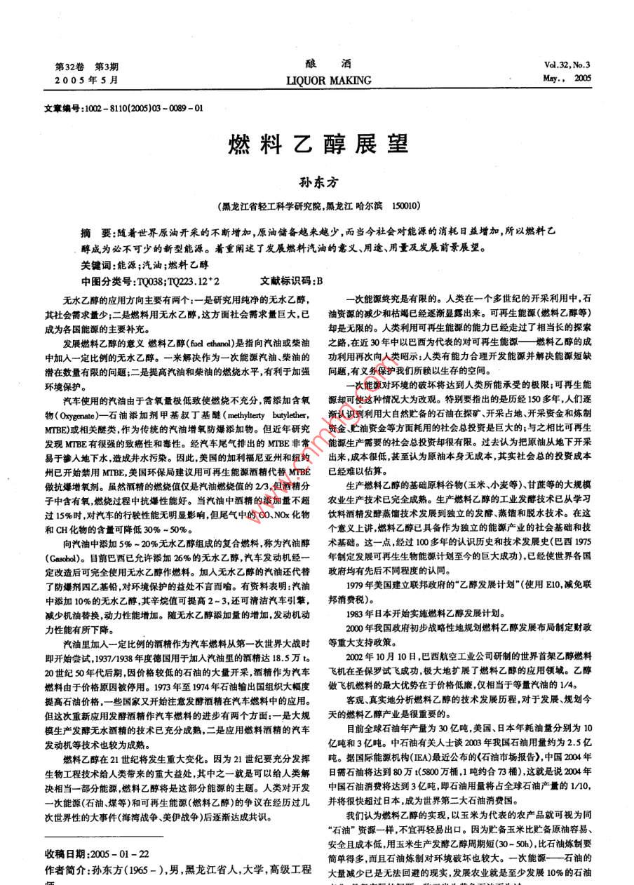 第32卷第3期釀酒 Vol.32,No.32005年5月 LIQUOR MAKING May., 2005文章編號:1002-81102005)03-0089-01燃料乙醇展望孫東方(黑龍江省輕工科學(xué)研究院,黑龍江哈爾濱150010)摘要:隨著世界原油開采的不斷增加,原油儲備越來越少,而當(dāng)今社會對能源的消耗日益增加,所以燃料乙醇成為必不可少的新型能源。著重闡述了發(fā)展燃料汽油的意義用途、用量及發(fā)展前景展望。關(guān)鍵詞:能源;汽油;燃料乙醇中圖分類號:TQ038:TQ223.122文獻標識碼:B其社會需求量少;二是燃料用無水乙醇,這方面社會需求量巨大,已油資源的減少和枯竭已經(jīng)逐漸顯露出來可再生能源(燃料乙醇等)成為各國能源的主要補充。卻是無限的。人類利用可再生能源的能力已經(jīng)走過了相當(dāng)長的探索發(fā)展燃料乙醇的意義燃料乙醇(fud cthanol)指向汽油或柴油之路,在近30年中以巴西為代表的對可再生能源燃料乙醇的成中加入一定比例的無水乙醇。一來解決作為一次能源汽油、柴油的功利用再次向人類昭示:人類有能力合理開發(fā)能源并解決能源短缺潛在數(shù)量有限的問題;二是提高汽油和柴油的燃燒水平,有利于加強問題,有義務(wù)保護我們所賴以生存的空間。環(huán)境保護。一次能源對環(huán)境的破壞將達到人類所能承受的極限;可再生能汽車使用的汽油由于含氧量極低致使燃燒不充分需添加含氧源卻可使這種情況大為改觀。特別要指出的是歷經(jīng)150多年,人們逐物()一石油添加劑甲基叔丁基醚(methylterty butylether,漸認識到利用大自然貯備的石油在探礦、開采占地、開采資金和煉制)或相關(guān)醚類,作為傳統(tǒng)的汽油增氧防爆添加物但近年研究資金、貯油資金等方面耗用的社會總投資是巨大的;與之相比可再生發(fā)現(xiàn)MBE有很強的致癌性和毒性。經(jīng)汽車尾氣排出的MIBE非常能源生產(chǎn)需要的社會總投資卻很有限。過去認為把原油從地下開采易于滲入地下水,造成井水污染。因此,美國的加利福尼亞州和紐約出來,成本很低,甚至認為原油本身無成本其實社會總的投資成本做抗爆增氧劑。雖然酒精的燃燒值僅是汽油燃燒值的23但酒精分生產(chǎn)燃料乙醇的基礎(chǔ)原料谷物(玉米、小麥等)、甘蔗等的大規(guī)模子中含有氧燃燒過程中抗爆性能好。當(dāng)汽油中酒精的添加量不農(nóng)業(yè)生產(chǎn)技術(shù)已完全成熟。生產(chǎn)燃料乙醇的工業(yè)發(fā)酵技術(shù)已從學(xué)習(xí)過15%時,對汽車的行駛性能無明顯影響,但氣中的C.N化物飲料酒精發(fā)酵蒸餾技術(shù)發(fā)展到獨立的發(fā)酵蒸餾和脫水技術(shù)在這和CH化物的含量可降低30%50%個意義上講,燃料乙醇已具備作為獨立的能源產(chǎn)業(yè)的社會基礎(chǔ)和技為獨向汽油中添加5%~20%無水乙醇組成的復(fù)合燃料稱為汽油醇術(shù)基礎(chǔ)。這一點,經(jīng)過100多年的認識歷史和技術(shù)發(fā)展史(巴西1975()目前巴西已允許添加26%的無水乙醇,車發(fā)動機經(jīng)一年制定發(fā)展可再生生物能源計劃至今的巨大成功)已經(jīng)使世界各國定改造后可完全使用無水乙醇作燃料。加入無水乙醇的汽油還代替政府均有先后不同程度的認同。了防爆劑四乙基鉛,對環(huán)境保護的益處不言而喻。有資料表明:汽油1979年美國建立聯(lián)邦政府的“乙醇發(fā)展計劃(使用E10減免聯(lián)中添加10%的無水乙醇,其辛烷值可提高2-3,還可清潔汽車引,邦消費稅)油替換,動力性能增加。隨無水乙醇添加量的增加,發(fā)動機動1983年日本開始實施燃料乙醇發(fā)展計劃。減少機油替換,動力性能增加力性能有所下降。2000年我國政府初步戰(zhàn)略性地規(guī)劃燃料乙醇發(fā)展布局制定財政汽油里加入一定比例的酒精作為汽車燃料從第一次世界大戰(zhàn)時等重大支持政策即開始嘗試,1937/1938年度德國用于加入汽油里的酒精達18.5萬t2002年10月10日,巴西航空工業(yè)公司研制的世界首架乙醇燃料20世紀50年代后期,因價格較低的石油的大量開采酒精作為汽車飛機在圣保羅試飛成功,極大地擴展了燃料乙醇的應(yīng)用領(lǐng)域乙醇燃料由于價格原因被停用。1973年至1974年石油輸出國組織大幅度做飛機燃料的最大優(yōu)勢在于價格低廉,僅相當(dāng)于等量汽油的1/4提高石油價格,一些國家又開始注意發(fā)酵酒精在汽車燃料中的應(yīng)用??陀^、真實地分析燃料乙醇的技術(shù)發(fā)展歷程,對于發(fā)展、規(guī)劃今但這次重新應(yīng)用發(fā)酵酒精作汽車燃料的進步有兩個方面:一是大規(guī)天的燃料乙醇產(chǎn)業(yè)是很重要的模生產(chǎn)發(fā)酵無水酒精的技術(shù)已充分成熟,二是應(yīng)用燃料酒精的汽車目前全球石油年產(chǎn)量為30億噸,美國、日本年耗油量分別為10億噸和3億噸。中石油有關(guān)人士談2003年我國石油用量約為2.5億發(fā)動機等技術(shù)也較紀將發(fā)生重大變化。因為21世紀要充分發(fā)揮噸據(jù)國際機構(gòu)(E)最的(市報告中204年決相當(dāng)一部分能源,燃料乙醇將是這部分能源的主題。人類對開發(fā)中國石油消費將達到3億噸即石油用量將占全球石油產(chǎn)量的1/10,一次能源(石油、煤等)和可再生能源(燃料乙醇)的爭議在經(jīng)歷過幾并將很快超過日本成為世界第二大石油消費國。次世界性的大事件(海灣戰(zhàn)爭、美伊戰(zhàn)爭)后逐漸達成共識。我們認為燃料乙醇的