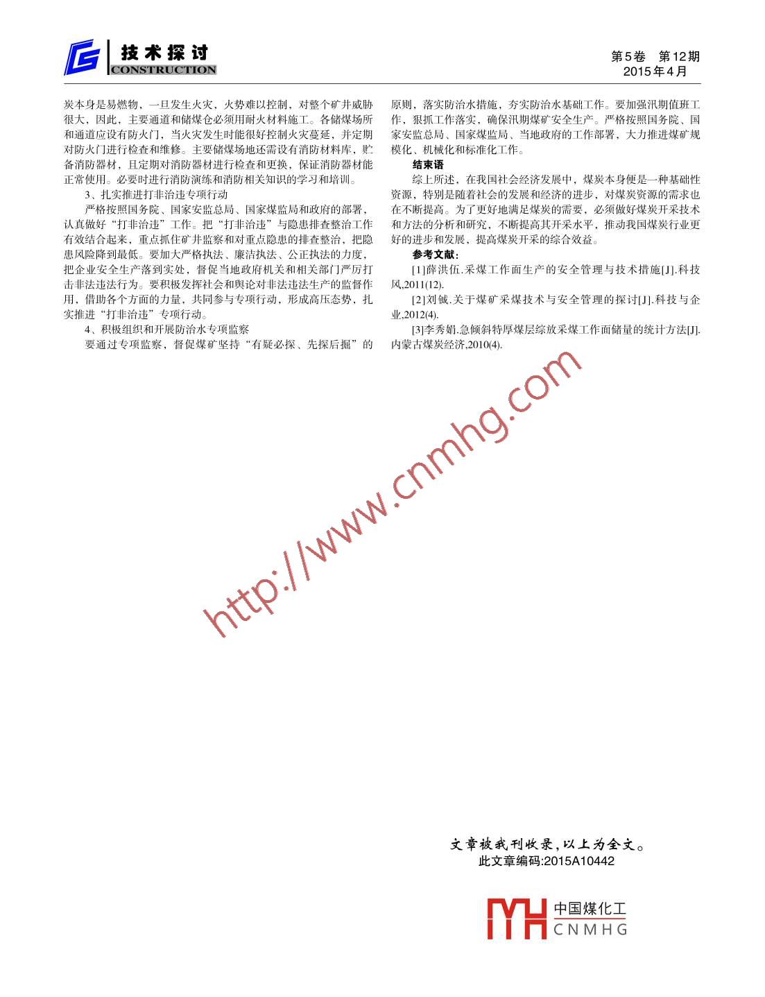 第5卷第12期技術(shù)探討2015年4月CONSTRUCTION煤礦采煤技術(shù)與安全管理郭臣山西蘭花科技創(chuàng)業(yè)有限公司唐安煤礦分公司山西晉城 048000摘要:隨著經(jīng)濟(jì)發(fā)展和社會(huì)不斷進(jìn)步,新型能源被不斷開發(fā)、開采,然而在中國(guó)的能源供應(yīng)中,煤炭依舊扮演著很重要的角色。中國(guó)煤炭產(chǎn)量占全世界煤炭總產(chǎn)量的37%左右,但事故死亡人數(shù)卻占全世界煤礦死亡總?cè)藬?shù)的70%左右。因此,要重視煤炭在開采過(guò)程中的安全和技術(shù)管理關(guān)鍵詞:煤礦;采煤技術(shù);安全管理中圖分類號(hào): X752文獻(xiàn)標(biāo)識(shí)碼: A一、煤礦開采的主要方法對(duì)于- -個(gè)企業(yè)而言,紀(jì)律是安全生產(chǎn)的重要保障。但往往在實(shí)1、滑移支架放頂煤開采法際的煤礦企業(yè)中,- -些領(lǐng)導(dǎo)卻忽視對(duì)紀(jì)律管理,從而導(dǎo)致安全生產(chǎn)頂梁以及支柱二者構(gòu)成了滑移頂梁,應(yīng)該將彈簧鋼或者導(dǎo)向上 沒(méi)有明確的規(guī)章制度,- 片混亂,有的甚至嚴(yán)重影響了企業(yè)的正槽運(yùn)用進(jìn)去,連接后梁和前梁,并在后梁的尾部位置進(jìn)行尾梁的設(shè)常 生產(chǎn)經(jīng)營(yíng)秩序。其導(dǎo)致的不安全因素有很多,例如,員工在上下置?;浦Ъ芙Y(jié)構(gòu)本身比較的簡(jiǎn)單,制造的時(shí)候成本比較的低,并班以及輪休的過(guò) 程中不能按照單位的制度執(zhí)行,隨意性很大,將安且安全性比較的高,能夠在很多環(huán)境中使用。特別是中小型煤礦在全生產(chǎn)紀(jì)律流 于形式,不能發(fā)揮作用,這在很大程度上不僅僅影響進(jìn)行煤炭開采的時(shí)候,這種方法運(yùn)用的更加普遍。一般情況下, 可了 企業(yè)的發(fā)展,而且很容易因?yàn)檫@種散漫的工作態(tài)度而導(dǎo)致安全事以用滑移支架放頂煤開采的辦法來(lái)開采煤礦,煤層厚度應(yīng)該在5厘故的發(fā)生, 所以,必須建立嚴(yán)格的考察管理制度,將紀(jì)律責(zé)任落實(shí)米左右,工作面的長(zhǎng)度范圍應(yīng)該是60~ 80米,最長(zhǎng)可以超過(guò)區(qū)105到每- -位員 工的心里,制定嚴(yán)格的監(jiān)督管理機(jī)制,發(fā)現(xiàn)問(wèn)題及時(shí)解米,滑移支架的高度-般應(yīng)該在5 ~ 10米之間。這種方法的缺點(diǎn)在決處理, 絕不能輕縱。于,工作面支架的撐力和工作阻力比較低,其穩(wěn)定性沒(méi)有保證。3、員工素質(zhì)普遍偏低。2、二型鋼梁放頂煤開采法大多數(shù)煤礦生產(chǎn)企業(yè),員工素質(zhì)相對(duì)都較低,一般情況下都是在進(jìn)行煤礦開采的時(shí)候?qū) -型鋼梁放頂煤開采法運(yùn)用進(jìn)去,能由底層的工作人 員提拔到管理層的,對(duì)于管理的相關(guān)知識(shí)并不熟悉夠保證采樣和放煤分別進(jìn)行,使用這種方法進(jìn)行煤炭開采的時(shí)候了解,但憑借經(jīng)驗(yàn)進(jìn)行管理,所以說(shuō)管理水平差,很難在企業(yè)中發(fā)應(yīng)該使用單體液壓支柱以及將二型鋼梁運(yùn)用進(jìn)去,來(lái)做好煤棚的支揮應(yīng)有的效用, 這樣就為安全生產(chǎn)留下了極大的隱患。對(duì)于煤礦企護(hù)工作,最高空定距離應(yīng)該在3.4米以下,最低控項(xiàng)距離應(yīng)該在2.4業(yè) 發(fā)展而言,必須提高其員工整體水平以及管理能力的培養(yǎng),讓安米以上。若是使用放炮的方式進(jìn)行落煤,那么必須進(jìn)行雙排眼的設(shè)全意 識(shí)貫穿于整個(gè)行業(yè)的發(fā)展過(guò)程中,促進(jìn)行業(yè)的發(fā)展。置。在放炮結(jié)束之后,應(yīng)該及時(shí)地移動(dòng)主梁,將主梁的支護(hù)作用發(fā)4、安全教育培訓(xùn)缺乏。揮出來(lái)。這種辦法在那些煤層賦存條件變化比較大的小型煤礦以及一些煤礦生產(chǎn) 企業(yè)為了獲得更多的經(jīng)濟(jì)利潤(rùn),不僅僅忽視員工中型煤礦中運(yùn)用得比較廣泛。整體素質(zhì)的提高,還不斷地進(jìn)行裁員,縮短辦公人員的人數(shù),減少3、偽傾斜柔性掩護(hù)支架采煤法開支,從而使其大多數(shù)的煤礦工人要身兼數(shù)職,很多教育培訓(xùn)的開在煤礦開采的時(shí)候,若是將這種辦法運(yùn)用進(jìn)去,可以利用掩護(hù)展也只是單 獨(dú)停留在形式上,沒(méi)有一個(gè)很好的貫徹落實(shí)。不斷的延支架隔離采空區(qū)以及采煤空間,這樣能夠簡(jiǎn)化頂板管理工作,給煤長(zhǎng) 工作時(shí)間,降低工作效率,在企業(yè)發(fā)展中,建立完善的培訓(xùn)機(jī)制礦開采更好地進(jìn)行提供更加安全的條件,- -般情況下,這種辦法在是極其重要的, 缺乏有效的進(jìn)步空間,這將大大降低員工的責(zé)任心厚度為2 ~ 6米的煤層中比較適用,并且還要求煤層厚度變化不大,以及 安全意識(shí),影響企業(yè)長(zhǎng)久發(fā)展。并且埋深穩(wěn)定,其工作面比較長(zhǎng),但是在煤層傾斜的情況下,掘進(jìn)三、保障礦井安全生產(chǎn)的措施建議效率比較低下。1、煤炭企業(yè)要對(duì)下井作業(yè)人員進(jìn)行安全培訓(xùn)4、階段爆破落煤采煤法對(duì)安全培訓(xùn)和教學(xué)不僅要重視機(jī)械設(shè)備使用方法的培訓(xùn),更這種辦法在傾斜角在40°以上,厚度在3.5~ 7.5米的范圍內(nèi)比要 制定具體培訓(xùn)計(jì)劃和目標(biāo),確保安全培訓(xùn)的意義和目的。對(duì)新員較適