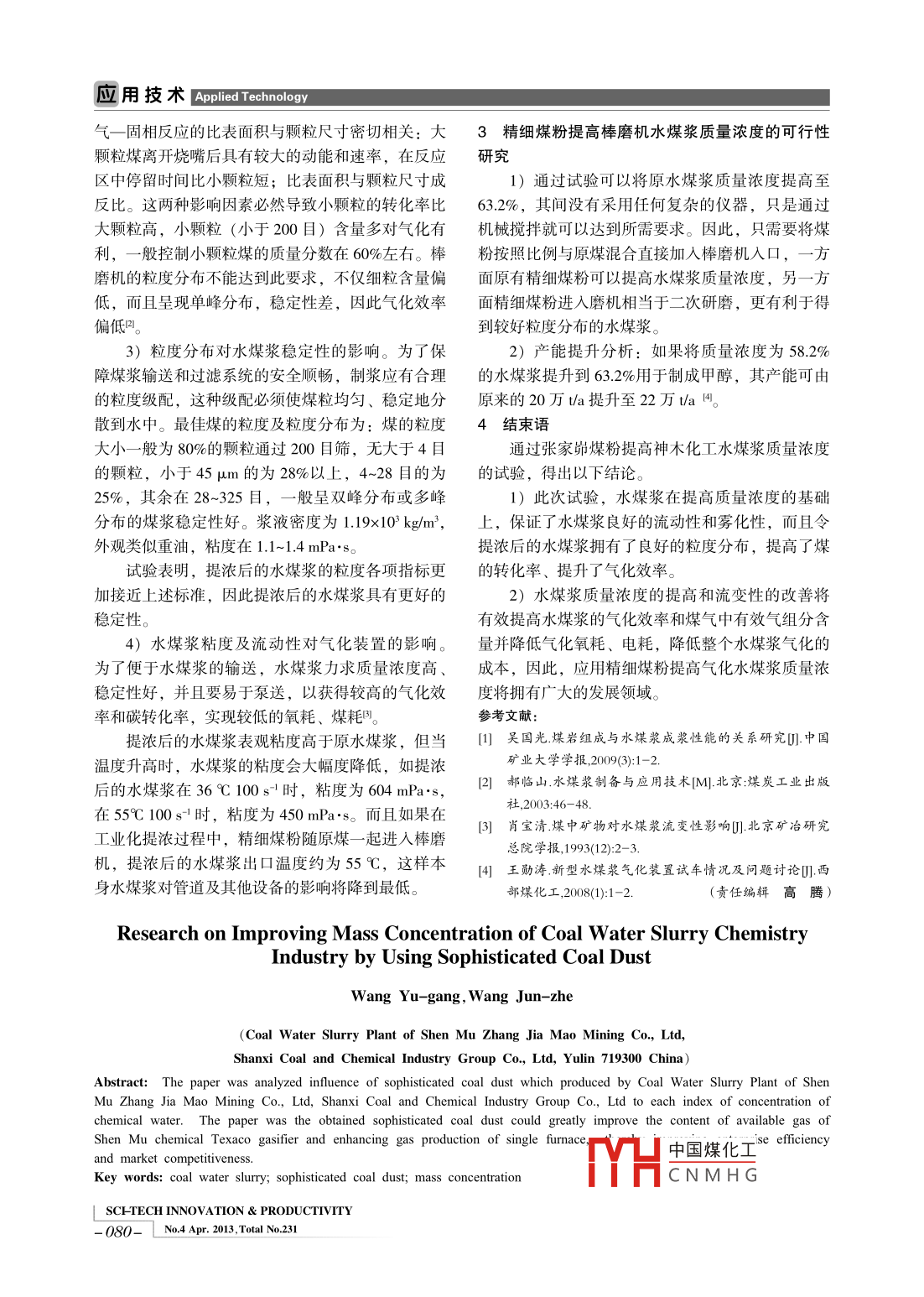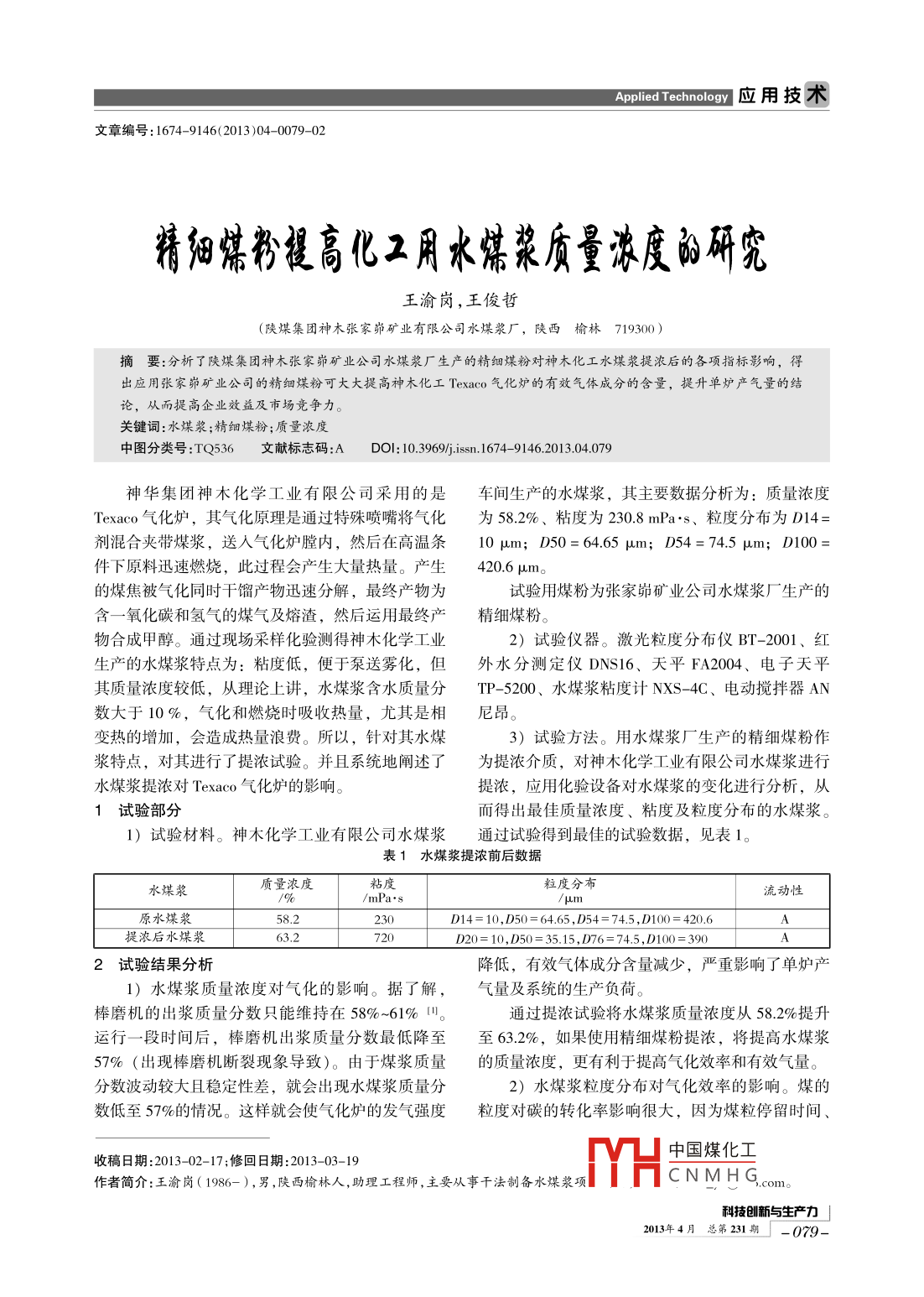 Applied Technology應用技術文章編號:1674-9146(2013)04-0079-02精閹煤粉提高化用水煤漿質量泳度船研究王渝崗,王俊哲〔陜煤集團神木張家峁礦業(yè)有限公司水煤漿廠,陜西榆林719300)摘要:分析了陜煤集團神木張家峁礦業(yè)公司水煤漿廠生產的精細煤粉對神木化工水煤漿提濃后的各項指標影響,得出應用張家峁礦業(yè)公司的精細煤粉可大大提高神木化工 Texaco氣化爐的有效氣體成分的含量,提升單爐產氣量的結論,從而提高企業(yè)效益及市場競爭力關鍵詞:水煤漿;精細煤粉;質量濃度中圖分類號:TQ536文獻標志碼:ADO|:10.3969/sn.1674-9146.2013.04.079神華集團神木化學工業(yè)有限公司采用的是車間生產的水煤漿,其主要數據分析為:質量濃度Texaco氣化爐,其氣化原理是通過特殊噴嘴將氣化為58.2%、粘度為230.8mPa·s、粒度分布為D14劑混合夾帶煤漿,送入氣化爐膛內,然后在高溫條10m;D50=6465μm;D54=74.5μm;D100=件下原料迅速燃燒,此過程會產生大量熱量。產生420.6μm。的煤焦被氣化同時干餾產物迅速分解,最終產物為試驗用煤粉為張家峁礦業(yè)公司水煤漿廠生產的含一氧化碳和氫氣的煤氣及熔渣,然后運用最終產精細煤粉。物合成甲醇。通過現場采樣化驗測得神木化學工業(yè)2)試驗儀器。激光粒度分布儀BT-2001、紅生產的水煤漿特點為:粘度低,便于泵送霧化,但外水分測定儀DNS16、天平FA2004、電子天平其質量濃度較低,從理論上講,水煤漿含水質量分TP-5200、水煤漿粘度計NXS4C、電動攪拌器AN數大于10%,氣化和燃燒時吸收熱量,尤其是相尼昂。變熱的增加,會造成熱量浪費。所以,針對其水煤3)試驗方法。用水煤漿廠生產的精細煤粉作漿特點,對其進行了提濃試驗。并且系統(tǒng)地闡述了為提濃介質,對神木化學工業(yè)有限公司水煤漿進行水煤漿提濃對 Texaco氣化爐的影響。提濃,應用化驗設備對水煤漿的變化進行分析,從1試驗部分而得出最佳質量濃度、粘度及粒度分布的水煤漿。)試驗材料。神木化學工業(yè)有限公司水煤漿通過試驗得到最佳的試驗數據,見表1。表1水煤漿提濃前后數據水煤漿質量濃度粘度粒度分布/mPa·s流動性原水煤漿58.2D14=10,D50=6465,D54=74.5,D100=420.6A提濃后水煤漿63,2D20=10,D50=3515,D76=74.5,D10=3902試驗結果分析降低,有效氣體成分含量減少,嚴重影響了單爐產)水煤漿質量濃度對氣化的影響。據了解,氣量及系統(tǒng)的生產負荷棒磨機的出漿質量分數只能維持在58%-61%。通過提濃試驗將水煤漿質量濃度從58.2%提升運行一段時間后,棒磨機岀漿質量分數最低降至至63.2%,如果使用精細煤粉提濃,將提髙水煤漿57%(出現棒磨機斷裂現象導致)。由于煤漿質量的質量濃度,更有利于提高氣化效率和有效氣量。分數波動較大且穩(wěn)定性差,就會出現水煤漿質量分2)水煤漿粒度分布對氣化效率的影響。煤的數低至57%的情況。這樣就會使氣化爐的發(fā)氣強度粒度對碳的轉化率影響很大,因為煤粒停留時間收稿日期:2013-02-17;修回日期:2013-03-19中國煤化工作者簡介:王渝崗(1986-),男,陜西榆林人,助理工程師,主要從事干法制備水煤漿項CNMHG科技團新與生產力3年4月總第231期」-079-應用技術 Applied Technology氣—固相反應的比表面積與顆粒尺寸密切相關:大3精細煤粉提高棒磨機水煤漿質量濃度的可行性顆粒煤離開燒嘴后具有較大的動能和速率,在反應研究區(qū)中停留時間比小顆粒短;比表面積與顆粒尺寸成1)通過試驗可以將原水煤漿質量濃度提高至反比。這兩種影響因素必然導致小顆粒的轉化率比63.2%,其間沒有采用任何復雜的儀器,只是通過大顆粒高,小顆粒(小于200目)含量多對氣化有機械攪拌就可以達到所需要求。因此,只需要將煤利,一般控制小顆粒煤的質量分數在60%左右。棒粉按照比例與原煤混合直接加入棒磨機入口,一方磨機的粒度分布不能達到此要求,不僅細粒含量偏面原有精細煤粉可以提髙水煤漿質量濃度,另一方低,而且呈現單峰分布,穩(wěn)定性差,因此氣化效率面精細煤粉進入磨機相當于二次研磨,更有利于得偏低到較好粒度分布的水煤漿。)粒度分布對水煤漿穩(wěn)定性的影響。為了保2)產能提升分析:如果將質量濃度為58.2%障煤漿輸送和過濾系統(tǒng)的安全順暢,制漿應有合理的水煤漿提升到63.2%用于制成甲醇,其產能可由的粒度級配,這種級配必須使煤粒均勻、穩(wěn)定地分原來的20萬ta提升至22萬ta。散到水中。最佳煤的粒度及粒度分布為:煤的粒度4結束語大小一般為80%的顆粒通過200目篩,無大于4目通過張家峁煤粉提高神木化工水煤漿質量濃度的顆粒,小于45μm的為28%以上,4-28日目的為的試驗,得出以下結論。25%,其余在28~325目,一般呈雙峰分布或多峰1)此次試驗,水煤漿在提高質量濃度的基礎分布的煤漿穩(wěn)定性好。漿液密度為1.19×103kg/m3,上,保證了水煤漿良好的流動性和霧化性,而且令外觀類似重油,粘度在1.1~1.4mPa·s。提濃后的水煤漿擁有了良好的粒度分布,提高了煤試驗表明,提濃后的水煤漿的粒度各項指標更的轉化率、提升了氣化效率。加接近上述標準,因此提濃后的水煤漿具有更好的2)水煤漿質量濃度的提高和流變性的改善將穩(wěn)定性。有效提高水煤漿的氣化效率和煤氣中有效氣組分含4)水煤漿粘度及流動性對氣化裝置的影響。量并降低氣化氧耗、電耗,降低整個水煤漿氣化的為了便于水煤漿的輸送,水煤漿力求質量濃度高、成本,因此,應用精細煤粉提高氣化水煤漿質
