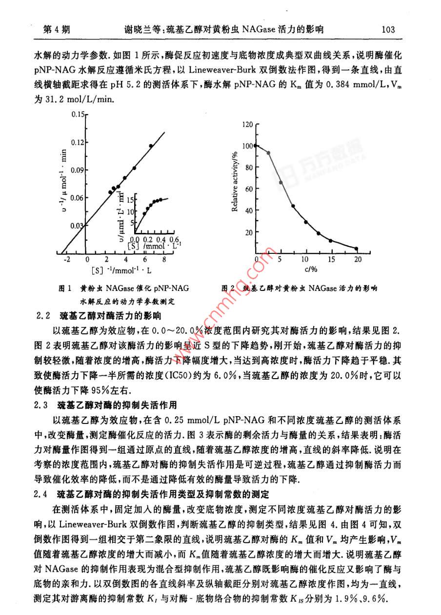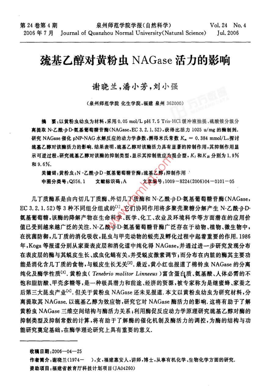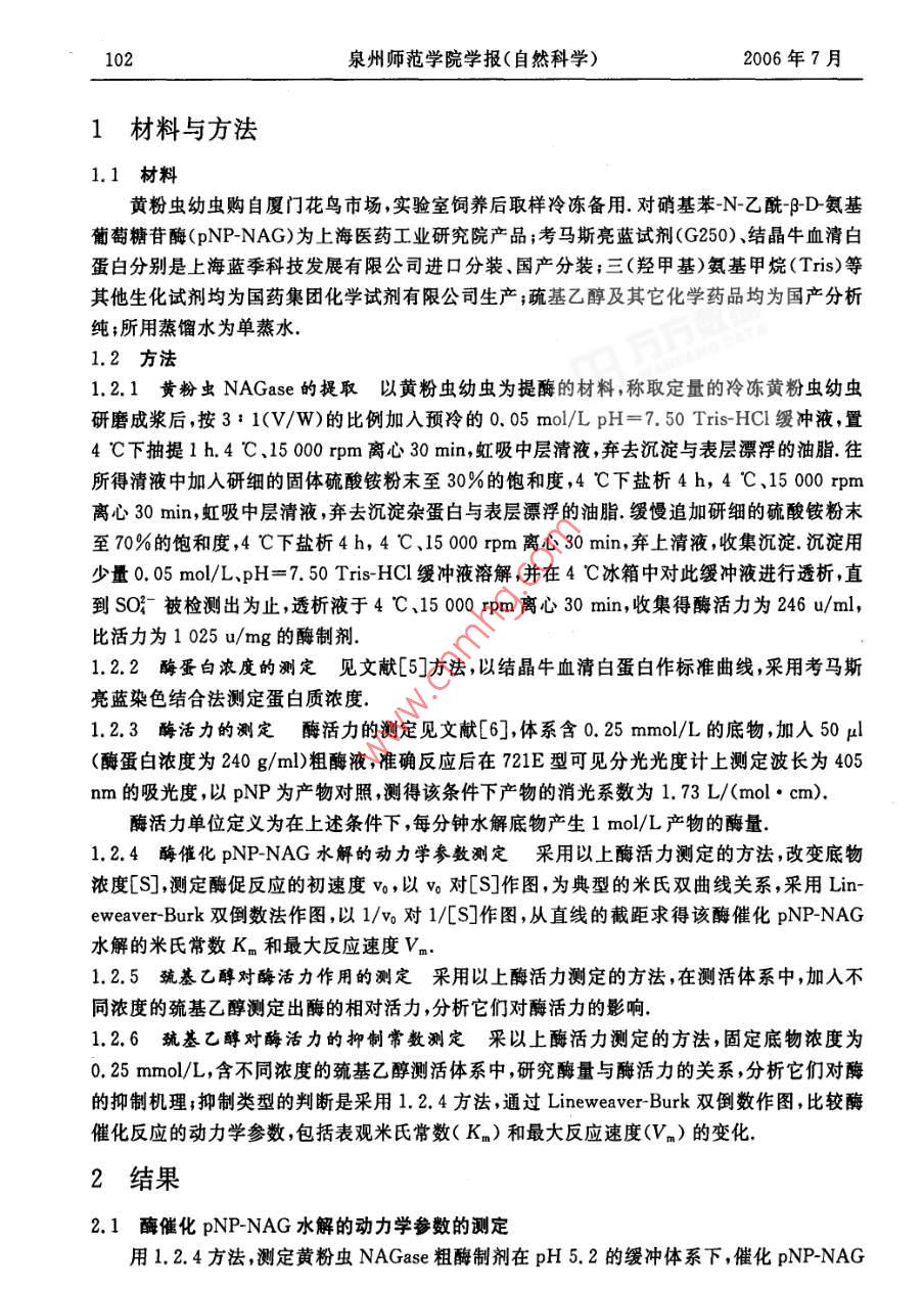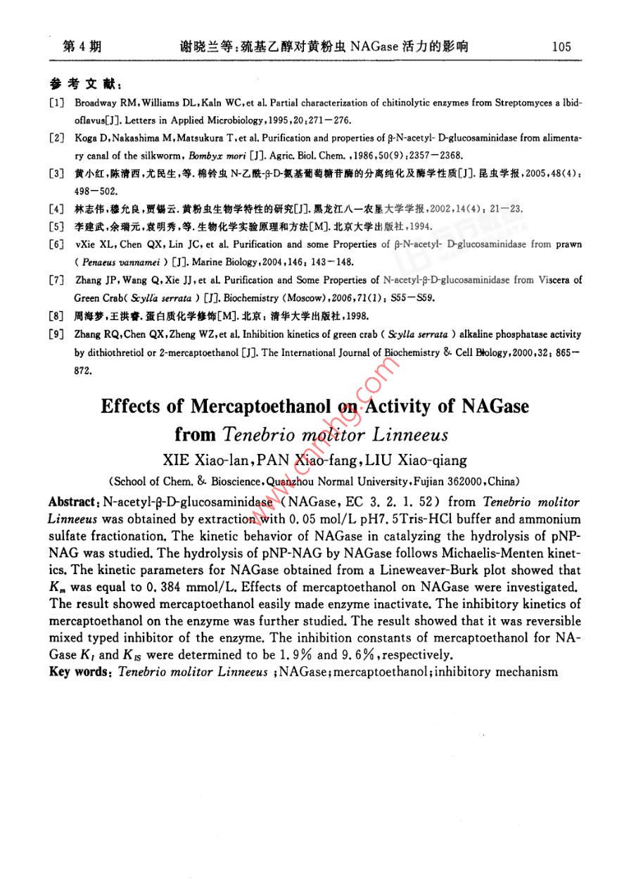 第24卷第4期泉州師范學(xué)院學(xué)報(bào)(自然科學(xué))VoL 24 No 42006 F 7 a Journal of Quanzhou Normal University(Natural Science) Jul 2006巰基乙醇對黃粉蟲 NAGase活力的影響謝曉蘭,潘小芳,劉小強(qiáng)(泉州師范學(xué)院化生學(xué)院,福建泉州362000摘要:以黃粉蟲幼蟲為材料,采用0.05mol/LpH7.5 Tris-HCl緩沖液抽提、硫酸銨分級分離提取N乙酰D氨基葡萄糖苷酶( NAGase, EC3.2.1.52),獲得比活力1025u/mg的酶制劑,研究 NAGase催化 PNP-NAG水解反應(yīng)的動力學(xué)參數(shù)測得米氏常數(shù)K=0.384mmo/L,探討巰基乙醇對該酶活力的影響.結(jié)果表明巰基乙醇對該酶活力具有顯著的抑制作用,其抑制作用顯示可逆過程研究巰基乙醇對該酶的抑制類型顯示其抑制效應(yīng)為混合型,K1和KB分別為1.9%和9.6%關(guān)鍵詞:黃粉蟲;N-乙酰PD·氨基葡萄糖苷酶;巰基乙醇;抑制作用中圖分類號:Q556.1文獻(xiàn)標(biāo)識碼:A文章編號:1009-8224(2006)04-0101-05幾丁質(zhì)酶系是由內(nèi)切幾丁質(zhì)酶外切幾丁質(zhì)酶和N乙酰BD氨基葡萄糖苷酶( NAGaseEC321.52)等3種不同組分組成的(,它們協(xié)同作用將多聚殼聚糖分解產(chǎn)生N乙酰BD氨基葡萄糖,該酶的降解產(chǎn)物在生命科學(xué)醫(yī)學(xué)、化工、農(nóng)業(yè)及環(huán)境科學(xué)等方面潛在的應(yīng)用價(jià)值已受到越來越廣泛的關(guān)注N乙酰BD氨基葡萄糖苷酶廣泛存在于動物、植物、微生物中,在抗菌防御,幾丁質(zhì)的消化吸收,昆蟲與甲殼動物的蛻殼及孵化過程中起著重要的作用.1986年,Koga等報(bào)道分別從家蠶表皮層和消化道中純化得 NAGase,并通過進(jìn)一步研究發(fā)現(xiàn)分布在表皮層的酶與其蛻皮生長成蟲化蛹有關(guān),并受蛻皮激素調(diào)節(jié);而分布在內(nèi)臟的酶其主要功能是消化含幾丁質(zhì)的食物,與蛻皮生長無關(guān)2.最近,黃小紅也報(bào)道了棉鈴蟲 NAGase的分離純化及酶學(xué)性質(zhì)黃粉蟲( Tenebrio molitor linneeus)富含蛋白質(zhì)氨基酸、人體必需的不飽和脂肪酸、甲殼多糖等,是一種極具潛力和前途、經(jīng)濟(jì)的資源,被專家稱為是繼蜜蜂、家蠶之后第三大昆蟲產(chǎn)業(yè),但關(guān)于黃粉蟲 NAGase還未見報(bào)道本文以黃粉蟲幼蟲為研究材料,分離提取其 NAGase.以巰基乙醇為效應(yīng)物,研究它對 NAGase酶活力的影響.這將有助于了解黃粉蟲 NAGase三維空間結(jié)構(gòu)與酶活力關(guān)系;利用酶促反應(yīng)動力學(xué)原理研究巰基乙醇對酶的抑制類型及抑制常數(shù)的計(jì)算將有助于了解酶的催化機(jī)制及酶活力的調(diào)控,為酶的結(jié)構(gòu)與功能研究奠定基礎(chǔ),在酶學(xué)理論研究上具有重要的意義.收稿日期:2006-04-25作者簡介:謝曉蘭(1974—),女,福建惠安人,講師,博士,從事有機(jī)化學(xué)、生物化學(xué)方面的研究資助項(xiàng)目:福建省教育廳科技計(jì)劃項(xiàng)目(JA04260)102泉州師范學(xué)院學(xué)報(bào)(自然科學(xué))2006年7月1材料與方法1.1材料黃粉蟲幼蟲購自廈門花鳥市場實(shí)驗(yàn)室飼養(yǎng)后取樣冷凍備用對硝基苯N乙酰D氨基葡萄糖苷酶( PNP-NAG)為上海醫(yī)藥工業(yè)研究院產(chǎn)品;考馬斯亮藍(lán)試劑(G250)結(jié)晶牛血清白蛋白分別是上海藍(lán)季科技發(fā)展有限公司進(jìn)口分裝、國產(chǎn)分裝;三(羥甲基)氨基甲烷(Tris)等其他生化試劑均為國藥集團(tuán)化學(xué)試劑有限公司生產(chǎn);疏基乙醇及其它化學(xué)藥品均為國產(chǎn)分析純;所用蒸餾水為單蒸水1.2方法1.2.1黃粉蟲 NAGase的提取以黃粉蟲幼蟲為提酶的材料,稱取定量的冷凍黃粉蟲幼蟲研磨成漿后,按3:1(V/W)的比例加入預(yù)冷的0.05mo/LpH=7.50 Tris-HCl緩沖液,置4C下抽提1h.4C、15000rpm離心30mn,虹吸中層清液,棄去沉淀與表層漂浮的油脂.往所得清液中加入研細(xì)的固體硫酸銨粉末至30%的飽和度,4℃下鹽析4h,4℃、15000rpm離心30min,虹吸中層清液,棄去沉淀雜蛋白與表層漂浮的油脂緩慢追加研細(xì)的硫酸銨粉末至70%的飽和度,4℃下鹽析4h,4℃、15000rpm離心30min,棄上清液,收集沉淀,沉淀用少量0.05mol/L、pH=7.50 Tris-HCl緩沖液溶解,并在4℃冰箱中對此緩沖液進(jìn)行透析,直到SO3被檢測出為止,透析液于4C、15000rpm離心30min,收集得酶活力為246u/ml,比活力為1025u/mg的酶制劑1.2.2酶蛋白濃度的測定見文獻(xiàn)[5]方法,以結(jié)晶牛血清白蛋白作標(biāo)準(zhǔn)曲線,采用考馬斯亮藍(lán)染色結(jié)合法測定蛋白質(zhì)濃度1.2.3酶活力的測定酶活力的測定見文獻(xiàn)[6]體系含0.25mmol/L的底物,加入50l(酶蛋白濃度為240g/ml)粗酶液,準(zhǔn)確反應(yīng)后在721E型可見分光光度計(jì)上測定波長為405nm的吸光度,以pNP為產(chǎn)物對照測得該條件下產(chǎn)物的消光系數(shù)為1.73L/( mol cm)酶活力單位定義為在上述條件下,每分鐘水解底物產(chǎn)生1mol/L產(chǎn)物的酶量1.2.4酶催化 PNP-NAG水解的動力學(xué)參數(shù)測定采用以上酶活力測定的方法,改變底物濃度[S],測定酶促反應(yīng)的初速度v,以v對[S]作圖,為典型的米氏雙曲線關(guān)系,采用Lineweaver-Burk雙倒數(shù)法作圖,以1/v對1/[S]作圖,從直線的截距求得該酶催化 PNP-NAG水解的米氏常數(shù)Kn和最大反應(yīng)速度Vn1.2.5巰基乙醇對酶活力作用的測定采用以上酶活力測定的方法,在測活體系中,加入不同濃度的巰基乙醇測定出酶的相對活力,分析它們對酶活力的影響1.2.6巰基乙醇對酶活力的抑制