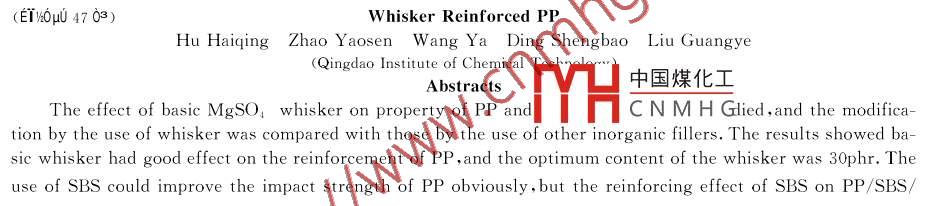 山29%2陽UEUAT1n0uVol 29 No 22001Ae30ACHINA PLASTICS INDUSTRYMar 2001DAX4E6iDe abo%4U±ulGa*00cE- 1o NC iE÷±}A61aic(GapP,-1Ns09,cap266042)00陽D%足EEA0AD啊土IePP/SBS12auD0A0A0°,2c場(chǎng)E0e旺aE,00 initaL06cPP≠ADS1AE和0土。印的10±A+:EA0EA46啊PP0TAμA06c06D10,xMN0A1930Yx600。SBSA0E!PPA=a》÷C框"601a,B。μwPP/ SBS SDe la lu0B102WN。 EI2AoEaAMS6B0B-c0oμ。10如0‘E:4E%A0EaA34006CAD00t0T02AlET-0‰0±01c0 DO,DCE土ua,Ec:301aA÷「D0Be0AAE0U30·YE±,A- Ei Ci EEaSE00AAuA0001021,06E÷0- ua la ey D02,9A,0UE÷0n00Ec2和0E,0EE·0060。世B0AA"Tp30-Yx00E,A-Eic了業(yè)±AA=D0、AA10B02,2AU0A0 UxCEasE01a÷00x00μ,Ea6N,EUTA。Ecx“00μE士uAA-Eic框土AA02?!窪AD2A—4D6,0AT3a06C知土i04 sWeEta PP9框E0Di。4DA0EeE1ANEii0,A01b2AE-06 Cieu aOUHAEIE6E土。±31A3aAE0TAa.BoA 100%>u 1 a EuNe E013EI E/ Ao Ea A%4 4S De,O PP°PP/SBS12iaTμBOND%1-31EμN(yùn)e201.10÷00-AT0Ax“‰0±01cE0,E0la0Ey2.54g/10min,A3E1Ef20;EA0 Ea a%%4SD,距和31040um, 3n%E 20-30, Dox, Caues"lnNS09Tpxu2"1pEμN(yùn)eE09TaE;SBS,a0805,0AN6》-1a3E20;i1N6A晶須用量/PHR101091076,陽AaE,-1EMEu2;020-EaD、”E-0ikEa.E、2AET-、°x1U正,ED0120A13和PPA- Ei DOAUμA0°1.2印μN(yùn)A31a00Fig 1 Effect of whisker on tensile characteristics of PPA6A→PA→N0N·AN1→[0N→2.1.23 as De TO PP iacuc EI02框E0°sDeOUDiAfC°OAaa0U140 CIA. E012h。iAEPP0A9÷0004AE0A0UE16,y·0ATeEc eUeU0,0U40 SBS. +i T14,0, 0U100oCL2AAlSDe0EaEu0c2AT。iAc°16AE170~175C,916TAME 165C, >i A OV4 10min. AE N1 IA E 180C, N1 AH5MPa,0E10min,±N1±隨a5min,AaEE±a5min晶須用量/PHR2%a10060AU2.14 sDeOoci PP oAAiuAE「2.1.1 sDe 0 PP A-EiDOAUHAO Ii中國(guó)煤化工9框μ0°T土30PPAA10Y2土a,A±aD6μAOAA元,ACNMH Gding strength of PIEcIM2EbEw,%sDeμAM0E6,EμAPPμ A lacus0BSD60A0 PP A-EID0A0 HAOli,Eck1Eie。012,0,09A110~30¥060。0E0,48060A0 PP HAA-Ei CLEOD U OHA0。u4sEco0 4S De IET-HAu"0AEA、3,0PPE÷0-0Bb.Eex÷030:a,A,1968AeE。1993Ae10uaE里“6NS,B0x02AT,EE,E}。 EAEOATx“ u%INS4iEND1u29p2陽UEU AIy4uOE, E uAy400! AH ODDSHAuAu'2xOf,O o E1 PP HA lacu oU PP/SBS 0oEl laluODv0Ee s De Am ODEoWOm EUHAOoCic哐066。pB1E土,0e2n30E,0E足-±AeEv0xBs10,EuE0a0a23010E+TY. Mo E1 iacuc SE00 AOuA-u E)O Di S De HA aoee 2.3 SDe/SBS XUAL 10 PP DOAUHAOoTiE1 A PP HA2E0DEa.B。0u0A第30、Yx600土±£30SBS/EAa土E25:30=5:62±a,A±a60μ,"E°602ElA1SBS 1 4SDeμAx0A,“c10 Eae xa SBS9「B0AAA060,yAEa》÷cePP/SBS06 Eiialula20,A-Ei2.1.3%D0AAcEμA0°Tic、 lacuc、24ET02ETA0Ei3E0036,SD6和PODTμA06Ex÷0A,D1100/30Ta土,÷D0 AUIAAUZ。0EEuA36,0Ea÷ca、B1.5~2.5土0%。4D0A030·6SBS10E1PPA框a.BU,EcE“E1Be0+9+0E和x60u。000EEEE¥AE219×0OU%4S De AUOEHe -OEcOU PP E-0-0D, % De+ E-0-ou 1s. B 2.4 as De0e Tp uiTAiOoGi PP HAtEvl0±00 PP OD Ii4030·YA2 EAS IET(0AAAa4A000N0A0A。OE41E03,.B0A)、》-E,0、Ea、E、°x叫A,PPBA0PP HAul lAax:9框Ey600Aa+框lay,pA0土1EμA÷和 PP HAui IA'aDoODVI OHA,AEE。土1.00iAT啊PPD0AUuA0°TiTab l effect ofof ppsDe mE.U IEa E 2CAS IEl-7oxIA-EiCi TE/MPaui lAam+CLE/k673f IAan+C,Elauc∈/MPa2ET0E/MPa154.3988.896.2111.6136.6EIao, Ey/g晶須用量/PHR0±i10 Ey 4YiE00d36,0£AET-、E0、Ea.E、°xi正 PhulTAla土E,B06cPPulA°|3EIA3ax÷C眶4x6。c0A-Ei、 lauri柜433eoA和 PP 3a+Caμ0T02E9A0AU啊0A0 UREaE30C2AT。00·EEg 3 Effect of whisker content on impact strength of PPA0 EaA4x÷0000ADA0C2AAT,480Eμ足a·c00u。3£TA;2-uA31‰aAU2.1.4% SDeOAAi O PPA÷0AUμA0°i(1)EA0EaAA0T00AE和0土0uAA0Ei44E00d36,3SBeμAM0 Ee El HA PP uAEU la0,NB0A0。3yA-Ei框A01cTA如a,[auA、TAa6y00,:60Aa.B。020~40·×600E士,1a.Ea.82±×600,Cuc框、2E02唯°A:0AT00B。 E2AOEAa4sb60粼U±0lcμ AxIv4NOAA& I(2) SBS EaEe1PP/B0 Ci katHuA3a》÷CElaB,EE11aIuA-EiC、IacC眶、2E02眶00TA4μ,E1A4 sDeuAoocix÷0A0B(3)0ASEe0cPP,±0A2AE1-、”E0、kEaE、°x叫正印nAT6cPPA-Eic、a》÷哐A÷B0‰9A,00 lacuc±空 ASIET-EOD,2E02爬0AET-Ta‰,800E10A0u:14 IA x晶須用量/PHR10e00÷ta,0ATAD0.±20:ATx36°aEc,19880A0÷a.B-0× OITAI NS,i44和PPA+0AUuA0oe中國(guó)煤化工叫A.E啊1s1B%ECN GIAOU 2000-05-30 EOu2)2.2SBS0esbeμ AOAAL± E O PP DOAU HAO°i(IAxaHU 36 03)00SBS25·91330·Y,0Ax0955·2±aAC6IAA± a sbs 14sDeuAAa±,·cT0 Axa SBS OAAL HA060,5D99數(shù)據(jù)E0, PP HA iacuc、A-Eic、2E2E3 ElAVUHAC÷E,0x0B3a÷爬 EEIEYHAC÷E(EI0山4703)Whisker reinforced ppHu Haiqing Zhao Y aosen Wang Ya Ding Shengbao Liu guangyeAbstracts中國(guó)煤化工The effect of basic MgSO, whisker on property of PP andCNMH Gied, and the modification by the use of whisker was compared with those by the use of other inorganic fillers. The results showed basic whisker had good effect on the reinforcement of PP, and the optimum content of the whisker was 3Ophr These of SBS could improve the impact strength of pp obviously, but the reinforcing effect of SBS on PP/SBS/whisker wE# ood. Basic MgSO, whisker is a new and valuable reinforcing materialKeywords: Basic MgSO, Whisker Reinforcement PP