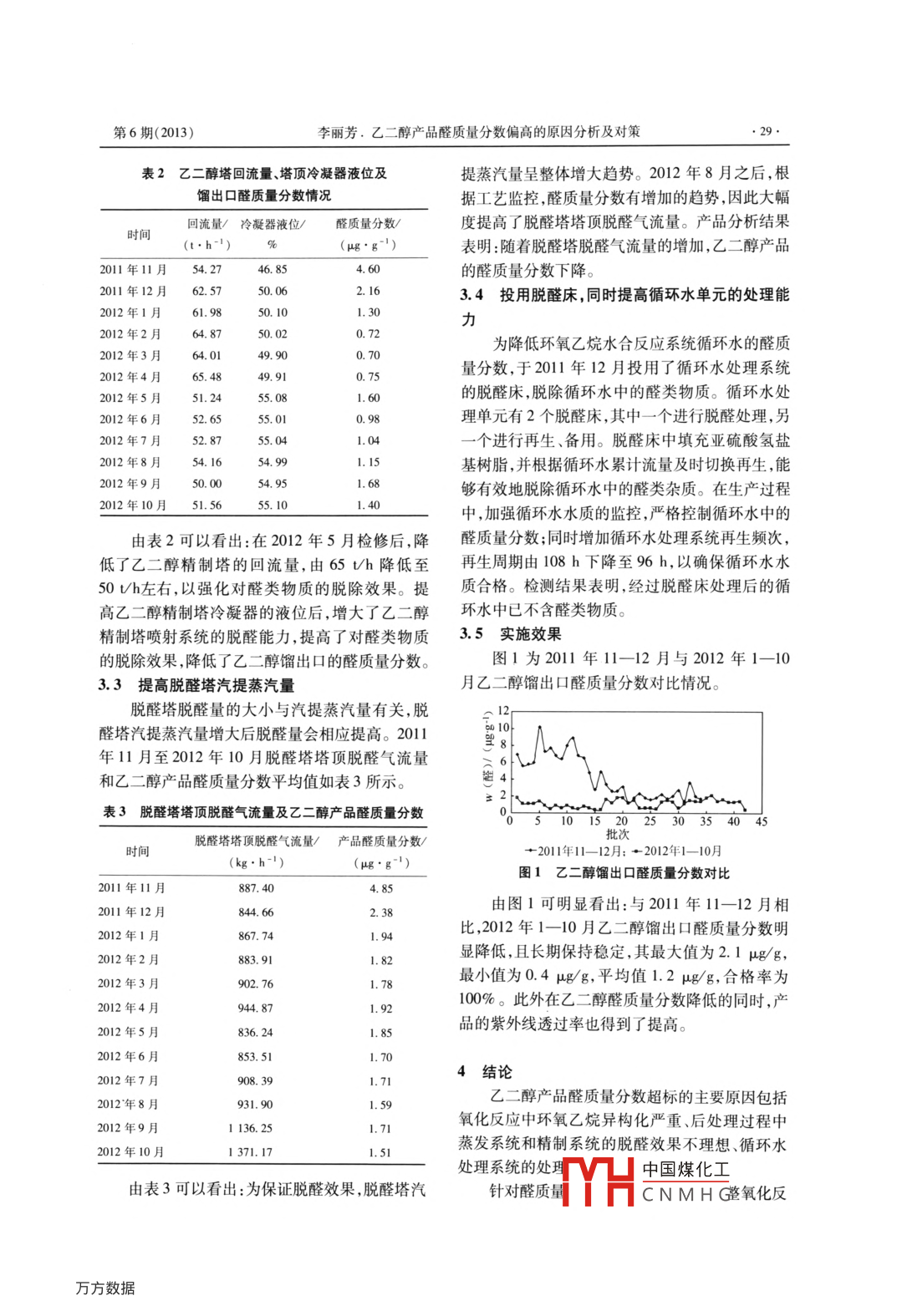 第29卷第6期石油化工技術與經濟2013年12月Technology Economics in Petrochemicals技術進步s乙二醇產品醛質量分數偏高的原因分析及對策李麗芳(中國石化上海石油化工股份有限公司化工部,200540)摘要:對乙二醇裝置乙二醇產品醛質量分數偏高的原因進行了分析,采取了優(yōu)化氧化反應工藝參數、調整乙二醇精制塔操作參數、強化蒸發(fā)系統(tǒng)和精制系統(tǒng)的脫醛效果等措施,通過實施這些措施減少了生產過程中醛類雜質的生成,乙二醇產品醛質量分數明顯降低,產品合格率達到了100%。關健詞:乙二醇醛質量分數原因分析措施文章編號:1674-1099(2013)06-0027-04中圖分類號:TQ23文獻標識碼:A乙二醇俗稱甘醇,是一種重要的化工原料。量分數約85%的粗乙二醇水溶液再對粗乙二醇乙二醇的用途之一是生產聚酯纖維,乙二醇中醛進行脫水、精制和脫醛后得到乙二醇產品。質量分數高會引起紫外線透過率降低,從而影響201l年10月,2乙二醇裝置在國內同類裝聚酯纖維產品的質量,因此生產廠家對原料乙二置中率先選用國產高選擇性催化劑YS-8810,催醇中醛質量分數的要求非常嚴格21。在乙二醇化劑顯現出較好的選擇性,開車初期的選擇性就生產過程中,環(huán)氧乙烷會發(fā)生異構化反應生成醛達到85%,且產品單耗明顯下降,但乙二醇產品類副產物,在乙二醇的精制過程中,也因發(fā)生分解中的醛質量分數卻明顯偏高。裝置改造之前,乙產生醛類物質,這些醛類物質對乙二醇產品的質二醇餾出口的醛質量分數全部合格,平均值為量產生直接影響。隨著對乙二醇產品質量要求的3.6μ/g,最大值53μg/g,最小值1.3μg/g;改不斷提高,盡量減少生產過程中醛類物質的生成造后乙二醇餾出口的醛質量分數偏高,最大值甚和最大限度地脫除產生的醛類物質,已成為乙二至達到了10.2/g,遠遠超過了產品質量控制醇生產過程中的重要課題。指標(乙二醇優(yōu)等品的醛質量分數不應超過00008%,即8wg/g)(3。此外隨著催化劑使用乙二醇聯(lián)合裝置現狀時間的延長,乙二醇餾出口的醛質量分數呈還漸升中國石化上海石油化工股份有限公司(以下高趨勢。以2011年11月為例,采用國產高選擇性簡稱上海石化)乙二醇聯(lián)合裝置中的2乙二醇裝催化劑后乙二醇餾出口醛質量分數情況見表1置采用美國科學設計公司(SD)的專利技術,于表1乙二醇餾出口醛質量分數分布2007年3月建成投產,裝置設計產量300ka(當分析次數醛質量分數/(·g1)比例/%量環(huán)氧乙烷)。裝置工藝流程如下:41.38以甲烷為致穩(wěn)劑,乙烯和氧氣以一定比例在24.14壓力206MPa、反應溫度225~275℃及銀催化6-8劑作用下反應,生成環(huán)氧乙烷(EO)。反應氣體經2水洗,環(huán)氧乙烷與其他氣體分離,然后通過汽提從環(huán)氧乙烷水溶液中分離出環(huán)氧乙烷。環(huán)氧乙烷和收稿日期:2013-09-29。水以1:20~1:25(物質的量比)的比例,在壓力作者簡介:李麗芳,女,1979年3月出生,2003年畢業(yè)于石油1.7MPa、溫度150~190℃無催化劑的情況下水大學(華東)中國煤化工從事質量管理合生成乙二醇。反應生成物經多效蒸發(fā)后得到質CNMHG石油化工技術與經濟第29卷第6期Technology Economics in Petrochemicals2013年12月由表1可以看出:2011年11月乙二醇餾出凝效果,致使塔頂蒸汽中部分醛類沒能帶出,而是口共檢測分析29次,不合格率為69%,嚴重影留在了塔內,造成乙二醇產品中醛質量分數偏高。響了乙二醇的產品質量,因此需對這一問題進行2.3循環(huán)水處理單元的處理不達標分析并采取相應措施。環(huán)氧乙烷水合生成乙二醇的反應系統(tǒng)中,水是遠遠過量的,過量的水經分離后循環(huán)使用,而水2影響乙二醇產品醛質量分數的因素分析中含有部分醛類雜質。循環(huán)水處理單元是一套脫乙烯氧化制環(huán)氧乙烷的反應過程中會同時發(fā)離子裝置,設有專門的脫醛床。在開車初期,脫醛生環(huán)氧乙烷的異構化反應而生成乙醛,因此在氧化床尚未投用醛類物質在循環(huán)水中不斷累積;又由過程中醛類雜質的生成是不可避免的。氧化反應于循環(huán)水返回到環(huán)氧乙烷水合中循環(huán)使用,循環(huán)過程中產生的醛類物質會進入后處理系統(tǒng)導致乙水中的醛類物質被帶到了乙二醇中影響了產品二醇產品中帶有醛類。此外,甲醛、乙醛、環(huán)氧乙質量。烷、乙二醇以及有機酸等共存會發(fā)生復雜的化學反應,生成揮發(fā)度較低的醛基化合物,因此,在生產過降低乙二醇產品醛質量分數的措施及實施效果程中,各系統(tǒng)都不可避免產生醛類雜質4-5。31優(yōu)化氧化反應工藝條件,減少氧化過程中環(huán)2.1氧化反應中環(huán)氧乙烷異構化氧乙烷的異構化代武軍等人研究認為,在乙烯氧化制環(huán)氧由于反應溫度越低,環(huán)氧乙烷異構化反應生乙烷過程中,當反應溫度大于100℃時環(huán)氧乙烷成乙醛的量也越少,因此在確保催化劑活性、選擇會發(fā)生異構化反應,生成乙醛,而且隨著反應溫度性生產負荷和產品質量的前提下,通過對反應溫的升高,乙醛生成量呈升高趨勢;當反應溫度大于度的調節(jié),可以減少環(huán)氧乙烷異構化反應的產生,200℃時,異構化反應速率明顯加快同時,在銀降低醛類等雜質的生成。為此,對乙二醇裝置氧催化劑作用下生成的乙醛會被氧氣氧化生成二氧化反應系統(tǒng)工藝條件進行了優(yōu)化?;己退?。(1)自2011年12月起,嚴格控制反應升溫