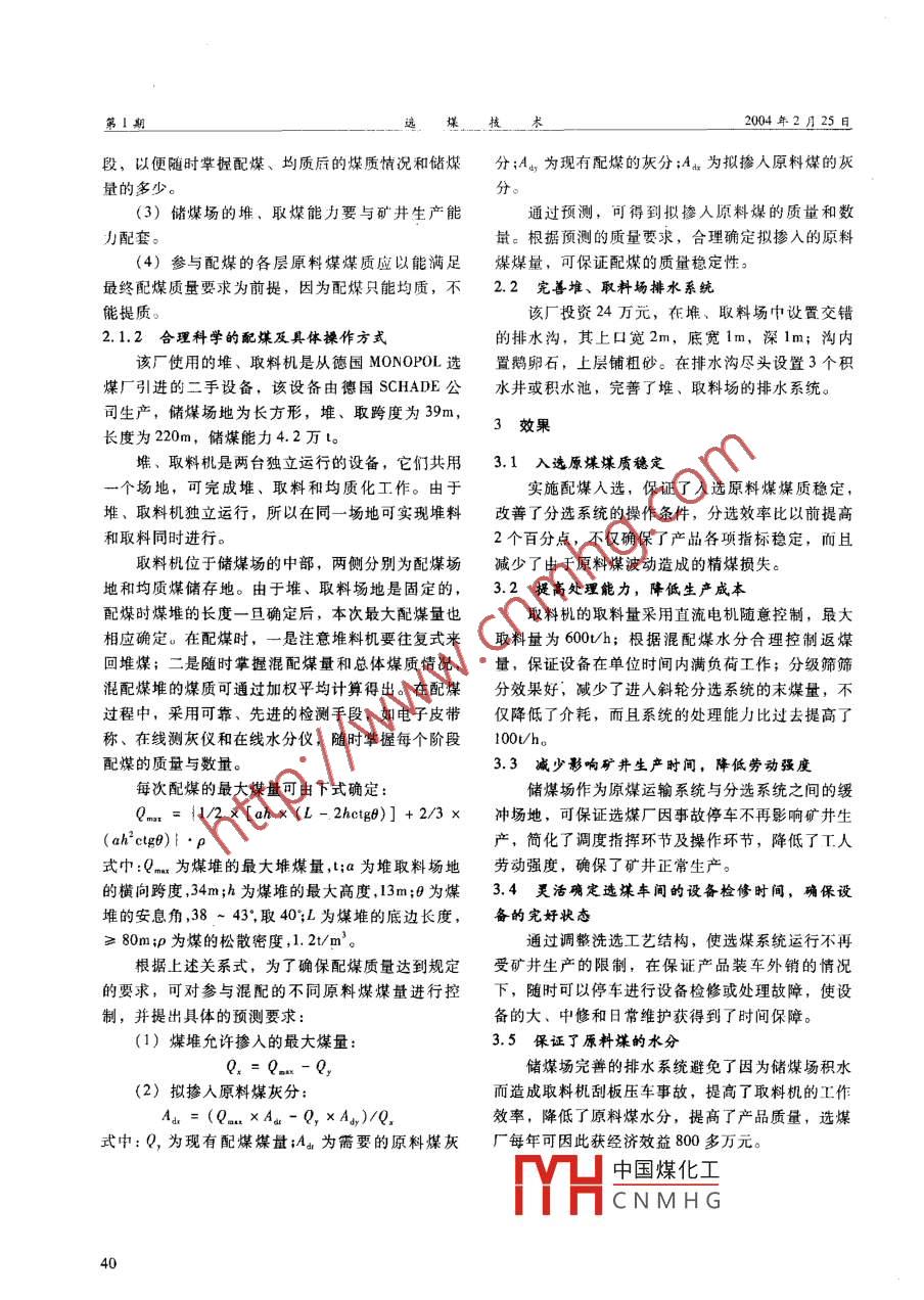No. 1第1期2004年2月C0AI. PREPARATION_ TECHNOLOCYFeb. 2004文章編號: 1001 -3571 (2004) 01 -0039 -02配煤入選的實踐馬少軍',丁四華',劉黨生”,裴桂才”(1. 國投新集第二選煤廠,安徽淮南232171; 2.國投新集能源股分有限公司化驗中心,安徽淮南232181; 3.天地科技股份有限公司唐山分公司,河北唐山063012)摘要:介紹了國投新集第二選煤廠實施配煤入選的實踐與效果。關(guān)鍵詞:配煤入選;實踐;效果中圖分類號: TD941*.6文獻(xiàn)標(biāo)識碼: A國投新集第二選煤廠”人選的原料煤來自不同的重影響了選煤廠的經(jīng)濟(jì)效益。采煤工作面,由于各工作面原煤煤質(zhì)相差較大,致(3) 礦井來煤直接人選時,出于原煤水分高,使原料煤煤質(zhì)不穩(wěn)定,嚴(yán)重影響精煤質(zhì)量和選煤廠分級篩篩分效果不好,加之無法控制來煤煤量,導(dǎo)的經(jīng)濟(jì)效益,因此,實施配煤入選勢在必行。致大量末煤進(jìn)人斜輪分選系統(tǒng),增加了介耗。(4)雨季,堆、取料場排水不暢,取料時易存在問題造成取料機(jī)壓車,同時,由于原料煤水分高,導(dǎo)致(1) 國投新集第二選煤廠為礦井型動力煤選分級效果差,直接影響分選系統(tǒng)的分選效果。煤廠,井下原煤提升至地面后直接進(jìn)人選煤廠主廠2改進(jìn)措施房洗選。由于礦井來煤量的不穩(wěn)定和事故的影響,導(dǎo)致設(shè)備小時處理量較低,設(shè)備電耗較大。2.1配謀原則及控制方 式(2)礦井來煤煤質(zhì)波動較大,不僅增大了選.2.1.1配煤原則及工 作條件煤廠的生產(chǎn)成本,而且難于保證精煤產(chǎn)品質(zhì)量,嚴(yán)采用堆、取料機(jī)配煤必須具備如下幾個條件:收稿日期: 2002 -12-25(1) 要有足夠的T作場地及儲備能力,能隨作者簡介:馬少軍(1964-), 男,吉林省梅河口市人,高時進(jìn)行配制并儲備--定量的均質(zhì)煤。-.般配煤場的級工程師。1986 年畢業(yè)于黑龍江礦業(yè)學(xué)院選煤專業(yè),現(xiàn)在儲備能力應(yīng)為礦井生產(chǎn)量的3~4倍。田投新集第二選煤廠從事技術(shù)管理工作。聯(lián)系電話: 0554- 8669984。(2)要有及時準(zhǔn)確的計量手段和煤質(zhì)檢查手(2) 由于新型不銹鋼篩板的開孔率大,且篩善,降低了材料消耗,帶來了可觀的經(jīng)濟(jì)效益。據(jù)板走向與料流--致,減少了篩板對脈動水流的阻力不完全統(tǒng)計,跳汰機(jī)篩板改造后,年綜合效益可達(dá)和風(fēng)水壓力損失,使風(fēng)水分布均勻,造成整個床層400多萬元。上的穩(wěn)定的分層條件,而且可使跳汰機(jī)在風(fēng)壓低5結(jié)束語時,也能保證床層的松散和穩(wěn)定,從而提高跳汰機(jī)的分選效果和處理能力。(1) 新型不銹鋼篩板具有強(qiáng)度大、耐用、不.(3)跳汰機(jī)篩孔尺寸的選擇,既要考慮原煤易變形、使用周期長和開孔率高、透篩效果好等特的性質(zhì),又要根據(jù)現(xiàn)場跳汰機(jī)的工藝要求和操作制點(diǎn)。新型不銹鋼篩板的應(yīng)用,極大改善了跳汰機(jī)的度,并通過試驗選出最佳尺寸。機(jī)械性能和分選效果,提高了處理能力,減少了設(shè)(4) 采用新型不銹鋼篩板后,跳汰機(jī)的不完備維護(hù)量,降低了工人的勞動強(qiáng)度,取得明顯的經(jīng)善度為1 = 0. 127,12 =0. 197,達(dá)到設(shè)計規(guī)范的要濟(jì)效益。求,使跳汰機(jī)的機(jī)械性能達(dá)到了國內(nèi)先進(jìn)水平。但中國煤化工的不斷變化,篩孔的與世界先進(jìn)水平0.11 ~0.14還有差距。,化設(shè)計和與之相適應(yīng)(5)新型不銹鋼篩板的應(yīng)用,大大提高了跳5YHCNMH G進(jìn)-一步完善。汰機(jī)的處理能力和精煤產(chǎn)率,篩板機(jī)械性能的改39第|期選煤__技__術(shù)2004年2月25且段,以便隨時掌握配煤、均質(zhì)后的煤質(zhì)悄況和儲煤分;Ae,為現(xiàn)有配煤的灰分;Aa為擬摻人原料煤的灰量的多少。分。(3)儲煤場的堆、取媒能力要與礦井生產(chǎn)能.通過預(yù)測,可得到擬摻人原料煤的質(zhì)量和數(shù)力配套。量。根據(jù)預(yù)測的質(zhì)量要求,合理確定擬摻人的原料(4) 參與配煤的各層原料煤煤質(zhì)應(yīng)以能滿足煤煤量,可保證配煤的質(zhì)量穩(wěn)定性。最終配煤質(zhì)量要求為前提,因為配煤只能均質(zhì),不2.2完善堆、 取料場排水系統(tǒng).能提質(zhì)。該廠投資24萬元,在堆、取料場中設(shè)置交錯2.1.2合理科學(xué)的 配煤及具體操作方式的排水溝,其上口寬2m,底寬1m,深1m;溝內(nèi)該廠使用的堆、取料機(jī)是從德園MONOPOL選置鵝卵石,上層鋪粗砂。在排水溝盡頭設(shè)置3個積煤廠引進(jìn)的二手設(shè)備,該設(shè)備由德國SCHADE公水井或積水池,完善了堆、取料場的排水系統(tǒng)。司生產(chǎn),儲煤場地為長方形,堆、取跨度為39m,3效果長度為220m,儲煤能力4.2萬l。堆、取料機(jī)是兩臺獨(dú)立運(yùn)行的設(shè)備,它們共用3.1入選原煤謀質(zhì)穩(wěn)定一個場地,可完成堆、取料和均質(zhì)化工作。由于實施配煤入選,保證了人選原料煤煤質(zhì)穩(wěn)定,堆、取料機(jī)獨(dú)立運(yùn)行,所以在同- -場地可實現(xiàn)堆料改善了分選系統(tǒng)的操作條件,分選效率比以前提高和取料同時進(jìn)行。2個百分點(diǎn),不僅確保了產(chǎn)品各項指標(biāo)穩(wěn)定,而且取料機(jī)位于儲煤場的中部,兩側(cè)分別為配煤場減少了由于原料煤波動造成的精煤損失。地和均質(zhì)煤儲存地。由于堆、取料場地是固定的,3.2