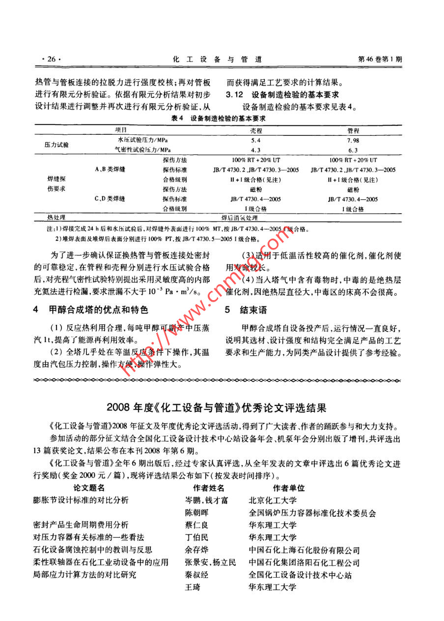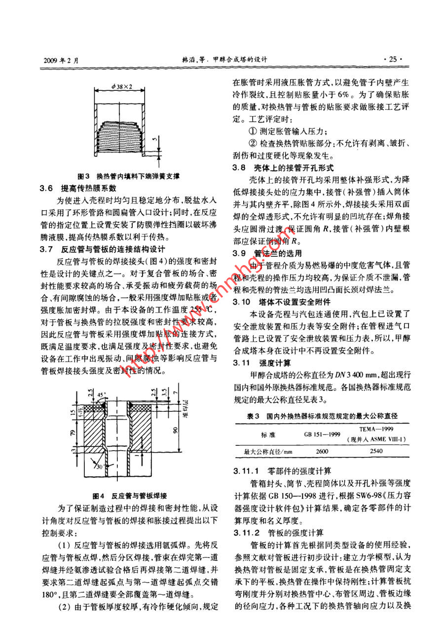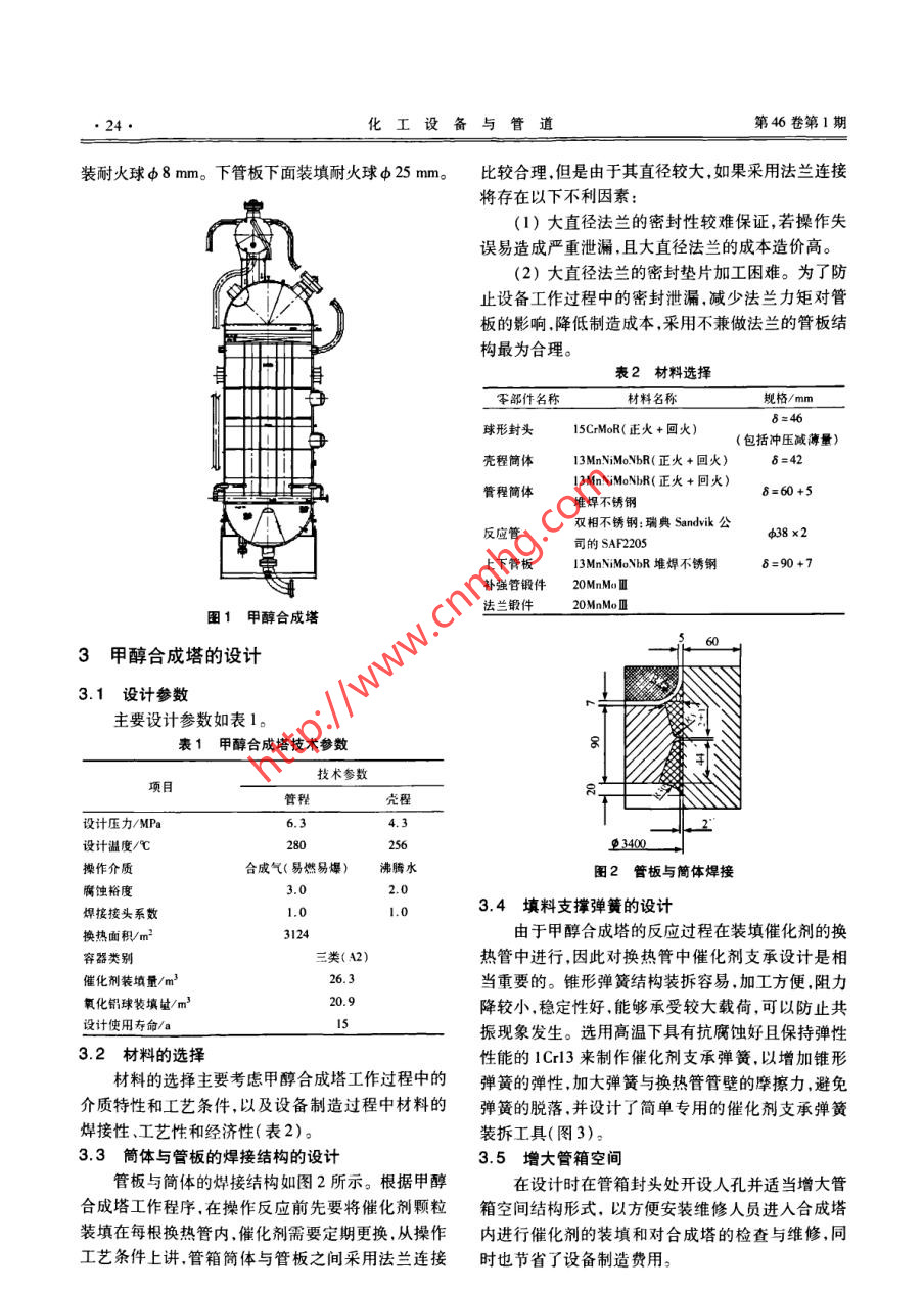 第46卷第1期化工設(shè)備與管道Vol. 46 No. 12009年2月PROCESS EQUIPMENT & PIPINGFeb. 2009甲醇合成塔的設(shè)計(jì)韓滔,聶杰,安豐華,于艷芬.(錦西化工機(jī)械(集團(tuán))有限責(zé)任公司設(shè)計(jì)院,遼寧葫蘆島125001)摘要:大直徑不帶法蘭的立式列管固定床甲醇合成塔具有能源利用合理,催化劑使用壽命較長(zhǎng),操作方便等特點(diǎn)。通過(guò)設(shè)計(jì)實(shí)例,介紹了甲醇合成塔的工作原理結(jié)構(gòu)特點(diǎn)、設(shè)計(jì)參數(shù)及材料選擇原則,并對(duì)其結(jié)構(gòu)設(shè)計(jì)、強(qiáng)度計(jì)算、設(shè)備制造檢驗(yàn)的要求等設(shè)計(jì)要點(diǎn)進(jìn)行了詳細(xì)介紹,為同類(lèi)產(chǎn)品設(shè)計(jì)提供了參考經(jīng)驗(yàn)。關(guān)鍵詞:甲醇合成塔;工作原理; 結(jié) 構(gòu)設(shè)計(jì)特點(diǎn)中圖分類(lèi)號(hào):TQ 050.2文獻(xiàn)標(biāo)識(shí)碼: A文章編號(hào): 1009-3281(2009)01 _0023-04Design of Methanol Synthesis TowerHAN Tao,NIE Jie,AN Feng-hua,YU Yan-fen(Research & Derelopment Institute, Jinxi Chemical Machinery Group Co.,Ld. . huludao 12500 , China)Abstract: Large diamelter vertical tubular fixed bed methanol synthesis tower without flange has the advantages of suitable usage ofenergy,long using life of catalyst and convenient operation. With the practical example , the operating mechanism, structural features,design paramelers and material selection principle were introduced in this article. Moreover, the structural design, strength calculationand requirements of fabrication and inepection for this equipment were described in detail. What presented herein can be referenced forthe design of the same equipment.Keywords: methanol synthesis tower; operating mechanism; feature of structural design甲醇工業(yè)始于20世紀(jì)初,到20世紀(jì)60年代,MPa,與循環(huán)氣以1:5比例混合(人塔氣) ,經(jīng)過(guò)與出甲醇工業(yè)取得了重大進(jìn)展。1966 年英國(guó)ICI公司首塔氣換熱并升溫至230 C后,從頂部的人口進(jìn)人甲先推出了低壓甲醇合成工藝一-ICI 工藝,此為低壓醇合成塔,經(jīng)過(guò)裝填- -定粒徑的( Cu-Zn-AI)催化劑在法生產(chǎn)甲醇的開(kāi)端。所有中、低壓法甲醇裝置工藝.換熱管內(nèi),在催化劑的作用下,CO、CO2加氫合成甲過(guò)程類(lèi)似,在壓力為5.0~15.0 MPa、溫度205 ~275醇,反應(yīng)熱傳給殼程的沸騰水,產(chǎn)生蒸汽進(jìn)人汽包,反C操作。各種工藝的主要區(qū)別在于反應(yīng)器的設(shè)計(jì)、應(yīng)器出口氣溫度約254C,含甲醇6.2%左右。反應(yīng)熱的移走及回收利用方式的不同,另外所用的2甲醇合成塔的結(jié)構(gòu)催化劑亦有差異。國(guó)內(nèi)低壓甲醇裝置建設(shè)始于20世紀(jì)70年代,甲醇合成塔的型式為立式列管固定床,設(shè)備直最早引進(jìn)的是ICI公司的冷激型低壓甲醇合成塔裝徑為φ3 400 mm,反應(yīng)管為φ 38 mm x2 mm x6000置,數(shù)量不多。某公司年產(chǎn)500kt甲醇合成裝置采.mm列管,共計(jì)4513根,換熱面積為3124 m2 ,內(nèi)裝用華東理工大學(xué)“絕熱一管 殼外冷復(fù)合式反應(yīng)催化劑共26.3 m' ,催化劑床層高度為200 mm。主器”專(zhuān)利技術(shù),甲醇合成塔是此項(xiàng)目的關(guān)鍵設(shè)備,其.要由管板簡(jiǎn)體裙座管箱換熱管束等部件組成,其主建成投產(chǎn)后,運(yùn)行狀況一直良好,對(duì)兗礦高硫煤能夠要結(jié)構(gòu)見(jiàn)圖1。甲醇合成塔的上下封頭,采用半球封頭。上封頭得到充分有效利用.減少資源浪費(fèi),使煤炭行業(yè)向高合成氣人口處設(shè)置氣體分布器,在管板的上部裝填一附加值一化工方向轉(zhuǎn)化等方面,具有重要意義。層200mm高的絕熱層催化劑.絕熱層催化劑上部填現(xiàn)將該設(shè)備的主要設(shè)計(jì)過(guò)程進(jìn)行簡(jiǎn)單的介紹。1甲醇合 成塔的工作原理收稿日期:2008 10-29作者簡(jiǎn)介:韓渭(1971一).女.河北邯鄲人,工程師。一直從事壓力新鮮氣在離心式透平壓縮機(jī)內(nèi)加壓(A)至8.2容器的設(shè)計(jì)與制造工作?!?4●化工設(shè)備與管道第46卷第1期裝耐火球φ 8 mm。下管板下面裝填耐火球φ 25 mm。比較合理,但是由于其直徑較大,如果采用法蘭連接將存在以下不利因素:(1)大直徑法蘭的密封性較難保證,若操作失誤易造成嚴(yán)重泄漏,且大直徑法蘭的成本造價(jià)高。(2)大直徑法蘭的密封墊片加工困難。為了防止設(shè)備工作過(guò)程中的密封泄漏.減少法蘭力矩對(duì)管板的影響,降低制造成本,采用不兼做法蘭的管板結(jié)構(gòu)最為合理。表2材料選擇零部件名稱(chēng)材料名稱(chēng)規(guī)格/mmδ=46球形封頭15CrMoR(正火+回火)(包括沖壓減薄量)殼程簡(jiǎn)體13MnNiMoNbR(正火+回火)δ=42管程簡(jiǎn)體8=60+5堆焊不銹鋼反應(yīng)管雙相不銹鋼:瑞典Sandvik公φ38 x2.司的SAF2205上下管板13MnNiMeNbR堆焊不銹鋼8=90 +7補(bǔ)強(qiáng)管鍛件20MnMoM法蘭鍛件20MnMo I圖1甲醇合成塔3甲醇合成塔的設(shè)計(jì)3.1設(shè)計(jì)參數(shù)主要設(shè)計(jì)參數(shù)如表1。表1甲醇合成塔技術(shù)參數(shù)技術(shù)參數(shù)項(xiàng)目殼程設(shè)計(jì)壓力/MPa6.34.3設(shè)計(jì)溫度/C280256更3400操作介質(zhì)合成氣(易燃易爆)沸騰水圖2管板與簡(jiǎn)體焊接 :腐蝕裕度3.02.0焊接接頭:系數(shù)1.0.03.4填料支撐彈簧的設(shè)計(jì)換熱面積/m'3124由于甲醇合成塔的反應(yīng)過(guò)程在裝填催化劑的換容器類(lèi)別三類(lèi)(A2)熱管中