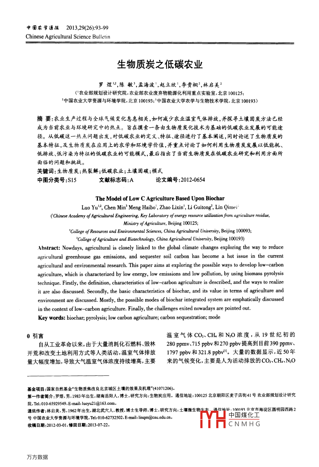 中國學(xué)通搌2013,29(26):93-99Chinese agricultural Science Bulletin生物質(zhì)炭之低碳農(nóng)業(yè)羅煜2,陳敏3,盂海波',趙立欣,李貴桐冫,林啟美2(農(nóng)業(yè)部規(guī)劃設(shè)計(jì)研究院,農(nóng)業(yè)部農(nóng)業(yè)廢棄物能源化利用重點(diǎn)實(shí)驗(yàn)室,北京100122中國農(nóng)業(yè)大學(xué)資源與環(huán)境學(xué)院北京100193:中國農(nóng)業(yè)大學(xué)農(nóng)學(xué)與生物技術(shù)學(xué)院,北京100193)摘要:農(nóng)業(yè)生產(chǎn)過程與全球氣候變化息息相關(guān),如何減少農(nóng)業(yè)溫室氣體排放,并探尋土壤固炭方法已經(jīng)成為當(dāng)前農(nóng)業(yè)與環(huán)境研究中的熱點(diǎn)。旨在摸索一條由生物質(zhì)炭化技術(shù)為基礎(chǔ)的低碳農(nóng)業(yè)發(fā)展的可能途徑。從低碳這一熱點(diǎn)問題出發(fā),對低碳農(nóng)業(yè)的定義、特征、途徑進(jìn)行了基本闡述,同時論述了生物質(zhì)炭的基本特征,及生物質(zhì)炭在應(yīng)用上的農(nóng)學(xué)和環(huán)境學(xué)價(jià)值,并重點(diǎn)討論了如何利用生物質(zhì)炭發(fā)展以低能耗、低排放、低污染為特征的低碳農(nóng)業(yè)的可能模式,最后指出了當(dāng)前生物質(zhì)炭在低碳農(nóng)業(yè)研究和利用方面所面臨的問題和挑戰(zhàn)。關(guān)鍵詞:生物質(zhì)炭;熱裂解;低碳農(nóng)業(yè);土壤固碳;模式中圖分類號:S15文獻(xiàn)標(biāo)志碼:A論文編號:2012-0654The Model of Low C agriculture Based Upon BiocharLuo Yu 2, Chen Min Meng Haibo, Zhao Lixin, Li Guitong, Lin QimeiChinese Academy of Agricultural Engineering, Key Laboratory of energy resource utilization from agriculture residue,Ministry of Agriculture, Beijing 100125'college of Resources and Environmental Sciences, China Agricultural University, Beijing 100093;College of Agriculture and Biotechnology, China Agricultural Uniuersity, Beijing 100193)Abstract: Nowdays, agricultural is closely linked to the global climate changes exploring the way to reduceagricultural greenhouse gas emissions, and sequester soil carbon has become a hot issue in the currentagricultural and environmental research. This paper aims at exploring the possible ways to develop low-carbonagriculture, which is characterized by low energy, low emissions and low pollution, by using biomass pyrolysistechnique. Firstly, the definition, characteristics of low-carbon agriculture is described, and the ways to realizet are also discussed. Secondly, the basic characteristics of biochar, and its value in terms of agriculture andenvironment are discussed. Mostly, the possible modes of biochar integrated system are emphatically discussedin the context of low-carbon agriculture. Finally, the challenges exited nowadays are pointed out.Key words: biochar; pyrolysis; low carbon agriculture; carbon sequestration; mode0引言溫室氣體CO2、CH和N2O濃度,從19世紀(jì)初的自從工業(yè)革命以來由于大量消耗化石燃料、毀林280ppmv、715ppbv和270ppbv提高到目前390pmv開荒和改變土地利用方式等人類活動溫室氣體排放1797ppbv和321.8ppbv。大量的數(shù)據(jù)顯示,近50年量大幅度增加,導(dǎo)致大氣溫室氣體濃度持續(xù)增高,主要來的氣候變化,主要是人為活動排放的CO2、CHNO基金項(xiàng)目:國家自然基金“生物質(zhì)焦改良北京城區(qū)土壤的效果及機(jī)理”41071206)第一作者簡介:羅煜男,1983年出生,湖南岳陽人博士研究方向:生物炭應(yīng)用。通信地址:10025北京朝陽區(qū)麥子店街41號農(nóng)業(yè)部規(guī)劃設(shè)計(jì)研究,Tel:010-65929549,E-mail:luoyu21@163.com.通訊作者:林啟美男,1962年出生湖北武穴人,教授博士生導(dǎo)師博士研究方向:土壤微生物10103北京市海淀區(qū)圓明園西路2號中國農(nóng)業(yè)大學(xué)資源與環(huán)境學(xué)院Tel:010-62732502,E-mail:linq@Dcau.edu.cn中國煤化工收稿日期:20120301,修回日期:2013-0722CNMHG中國農(nóng)學(xué)逼報(bào)hp:/w:casb. org. cn等溫室氣體造成的,到2100年全球平均氣溫將升高全球農(nóng)業(yè)土壤碳庫擴(kuò)充潛力為12~3 I Pg C/a,耕層土1.0-35℃。一旦氣溫升高3℃,大規(guī)模反饋機(jī)制將開始壤有機(jī)碳含量提高1tC·a/hm2,發(fā)展中國家糧食產(chǎn)量年發(fā)揮作用,造成不可逆的氣候變化。因此,節(jié)能減排,增加2400-3200萬t根莖產(chǎn)量年增加600-1000萬t,農(nóng)發(fā)展低碳經(jīng)濟(jì),是實(shí)現(xiàn)全球社會與經(jīng)濟(jì)可持續(xù)發(fā)展的業(yè)的固碳增匯潛力巨大。據(jù)估測全球通過植物生物根本出路量每年固定約120Pg碳,但是,自然條件下,幾乎全部農(nóng)業(yè)是國民經(jīng)濟(jì)的基礎(chǔ)既是重要的溫室氣體來經(jīng)過礦化作用轉(zhuǎn)化為CO2,沒有任何凈固碳作用,這也源之一,也是巨大的碳匯。從原始農(nóng)業(yè)傳統(tǒng)農(nóng)業(yè)到現(xiàn)是現(xiàn)有農(nóng)業(yè)耕作栽培技術(shù)包括秸稈還田施用有機(jī)肥代農(nóng)業(yè),農(nóng)業(yè)的“正碳性”或碳排放量逐漸增強(qiáng)。根據(jù)政料、保護(hù)性耕作等技術(shù)措施,固碳增匯效果比較低且不府間氣候變化專業(yè)委員會(IPC)第4次評估報(bào)告農(nóng)業(yè)穩(wěn)定的根本原因是溫室氣體的第二大重要來源。中國糧食生產(chǎn)年排放近幾年,生物質(zhì)炭農(nóng)業(yè)與環(huán)境應(yīng)用倍受關(guān)注,是國約14億t的CO2C當(dāng)量碳足跡(0780.08)tCa/hm3或內(nèi)外研究熱點(diǎn),不少研究者認(rèn)為是生物質(zhì)炭不僅是廉(0.1001)Ct糧食。除了作物