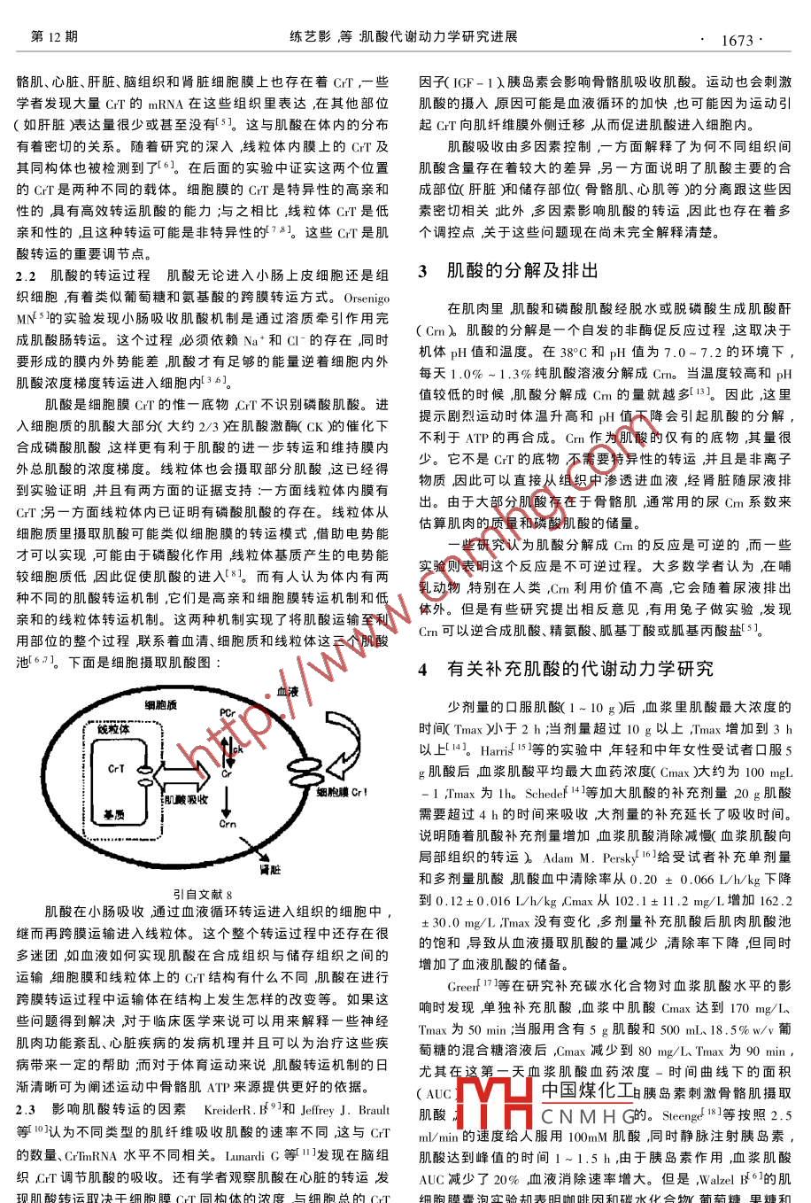 第29卷第12期北京體育大學(xué)學(xué)報(bào)2006年12月Journal of Beijing Sport Universityec.2006肌酸代謝動(dòng)力學(xué)研究進(jìn)展練藝影1曹建民2鄧艷香3石鴻儒←(1.天津醫(yī)科大學(xué)體育部天津3000702.北京體育大學(xué)北京100043.廣西大學(xué)體育部廣西南寧5300044.河北師范大學(xué)體育學(xué)院河北石家莊050000摘要現(xiàn)已發(fā)現(xiàn)肌酸進(jìn)行跨膜轉(zhuǎn)運(yùn)霱要相應(yīng)的轉(zhuǎn)運(yùn)伓包括細(xì)胞膜運(yùn)載體和線粒體運(yùn)載體)是肌酸在體內(nèi)分布的關(guān)鍵因素之一肌酸的轉(zhuǎn)運(yùn)與轉(zhuǎn)運(yùn)體的數(shù)量及其表達(dá)、骨骼肌纖維的類型、Naˉ和C濃度、激素、運(yùn)動(dòng)等多因素相關(guān)肌酸在機(jī)體內(nèi)代謝并分解為肌酸酐并且經(jīng)腎臟排除體外肌酸代謝動(dòng)力學(xué)硏究涉及到血藥最大濃度(Cmax和達(dá)到最大濃度的時(shí)間(Tmax)等動(dòng)力學(xué)參數(shù)關(guān)鍵詞肌酸磷酸肌酸轉(zhuǎn)運(yùn)體代謝藥物代謝動(dòng)力學(xué)運(yùn)動(dòng)中圖分類號(hào):804.7文獻(xiàn)標(biāo)識(shí)碼:A文章編號(hào)1007-361x2006)2-1672-03Research Progress on the Pharmacokinetics of CreatineLIAN YiCAO JianDENG Yan-xiang, SHI Hong-ruTianjin University of Medicine Tianjin 300070, China 2. Sport Bio-chemic Teaching Department,Beijing Sport University Beijing 100084, China 3. P.E. Department, Guangxi University Nanning 530004, Guangxi,China4. Institute of P. E., Hebei Normal University Shijiazhuang 050000, Hebei, ChinaAbstract:The result shows that it is known that there are two main kinds of Cr transporters( CrTs),one is plasmalemmaCrT and the other is mitochondrial CrT which affects the distribution of Cr. Cr uptake across the plasma membrane by CrTrelating to the quantity of CrT and its expression different skeletal muscle fiber types the of Na+ and Cl-, hormone ,exercises and so on. Cr is converted into creatinine( Crn )that constantly diffuses out of the tissues into the blood and is excreted by the kidneys into the urine. Some researches on pharmacokinetics has examined the behaviors of Cr in blood suchas a concentration of maximal plasma( Cmax )and a time of maximal plasma( TmaxKey words: creatine transporters i metabolism i pharmacokinetics ; exercises隨著體育商業(yè)化的快速發(fā)展體育竟賽的日益激烈肌肉助下肌酸進(jìn)行跨膜轉(zhuǎn)運(yùn),做工能力的改善成為這其中的關(guān)鍵問題。國(guó)內(nèi)大部分研究集中在補(bǔ)充肌酸對(duì)運(yùn)動(dòng)能力的影響有關(guān)機(jī)體中肌酸代謝的動(dòng)源果性肌酸腸態(tài)變化的報(bào)道不多,了解肌酸代謝動(dòng)力學(xué)變化對(duì)科學(xué)合理地內(nèi)惴黢#膏、補(bǔ)充肌酸具有十分重要的意義。本文以綜述的形式介紹一些肌酸動(dòng)代謝動(dòng)力學(xué)的研究進(jìn)展,讓人們對(duì)肌酸有更進(jìn)一步的血胞nCr ind war1肌酸在人體內(nèi)的分布骨肌在人體內(nèi)內(nèi)源性肌酸主要在肝臟合成但是肝臟儲(chǔ)存量很少。服用的外源性肌酸要通過胃腸吸收可能類似氨基酸吸收途徑1由轉(zhuǎn)運(yùn)體轉(zhuǎn)運(yùn)進(jìn)入血液循環(huán)系統(tǒng)。內(nèi)源性和外源性的肌酸都通過血液循環(huán)肌酸被運(yùn)輸?shù)剿鼉?chǔ)存和利用的部位。在機(jī)體中骨骼肌、心臟、精子、視網(wǎng)膜的感光細(xì)胞中肌酸和磷酸肌酸含量最多其他器官、組織含量很少。在這些區(qū)注實(shí)線表示肌酸的路徑虛線表示肌酸酐的路徑。域里肌酸經(jīng)過代謝分解為肌酸酐最后通過尿液排除體外。小腸是外源性肌酸到達(dá)其靶器官的第一道障礙, Peral以下是肌酸在機(jī)體內(nèi)的流程圖21Ⅵ3用螢光免疫檢驗(yàn)法定位人、大鼠和雞的回腸CrT蛋白在光鏡下觀察可以看見明顯的熒光標(biāo)記襯在小腸粘膜刷狀緣2肌酸的轉(zhuǎn)運(yùn)上而旳瞄細(xì)胞基底膜、小腸腺、杯狀細(xì)胞中國(guó)煤化士它具NC-依賴性、高21肌酸轉(zhuǎn)運(yùn)體無(wú)論是外源性肌酸還是內(nèi)源性肌酸要真親和性CNMHG大鼠的空腸粘膜頂端區(qū)正發(fā)揮作用,關(guān)鍵是肌酸順利地進(jìn)入組織細(xì)胞內(nèi)進(jìn)行代謝。域也發(fā)現(xiàn)同樣的Cr而在基底膜卻沒有找到該載體。這說研究證實(shí)機(jī)體里存在著特異性的肌酸轉(zhuǎn)運(yùn)體(Crr)在它的幫明了Cr所在的位置非常有利于肌酸的吸收。除此之外骨投稿日期:005-11-22作者簡(jiǎn)介練藝1981-),女廣東人助教碩士研究生,研究方向運(yùn)動(dòng)生物化學(xué)。第12期練藝影等肌酸代謝動(dòng)力學(xué)研究進(jìn)展1673骼肌、心臟、肝臟、腦組織和腎臟細(xì)胞膜上也存在著Cr,一些因孔(IGF-1)胰島素會(huì)影響骨骼肌吸收肌酸。運(yùn)動(dòng)也會(huì)刺激學(xué)者發(fā)現(xiàn)大量Cr的mRNA在這些組織里表達(dá),在其他部位肌酸的攝入原因可能是血液循環(huán)的加快也可能因?yàn)檫\(yùn)動(dòng)引如肝臟凄達(dá)量很少或甚至沒有5。這與肌酸在體內(nèi)的分布起Cr向肌纖維膜外側(cè)遷移從而促進(jìn)肌酸進(jìn)入細(xì)胞內(nèi)。有著密切的關(guān)系。隨著研究的深入線粒體內(nèi)膜上的Cr及肌酸吸收由多因素控制,一方面解釋了為何不同組織間其同構(gòu)體也被檢測(cè)到了6。在后面的實(shí)驗(yàn)中證實(shí)這兩個(gè)位置肌酸含量存在著較大的差異,另一方面說明了肌酸主要的合的Cr是兩種不同的載體。細(xì)胞膜
