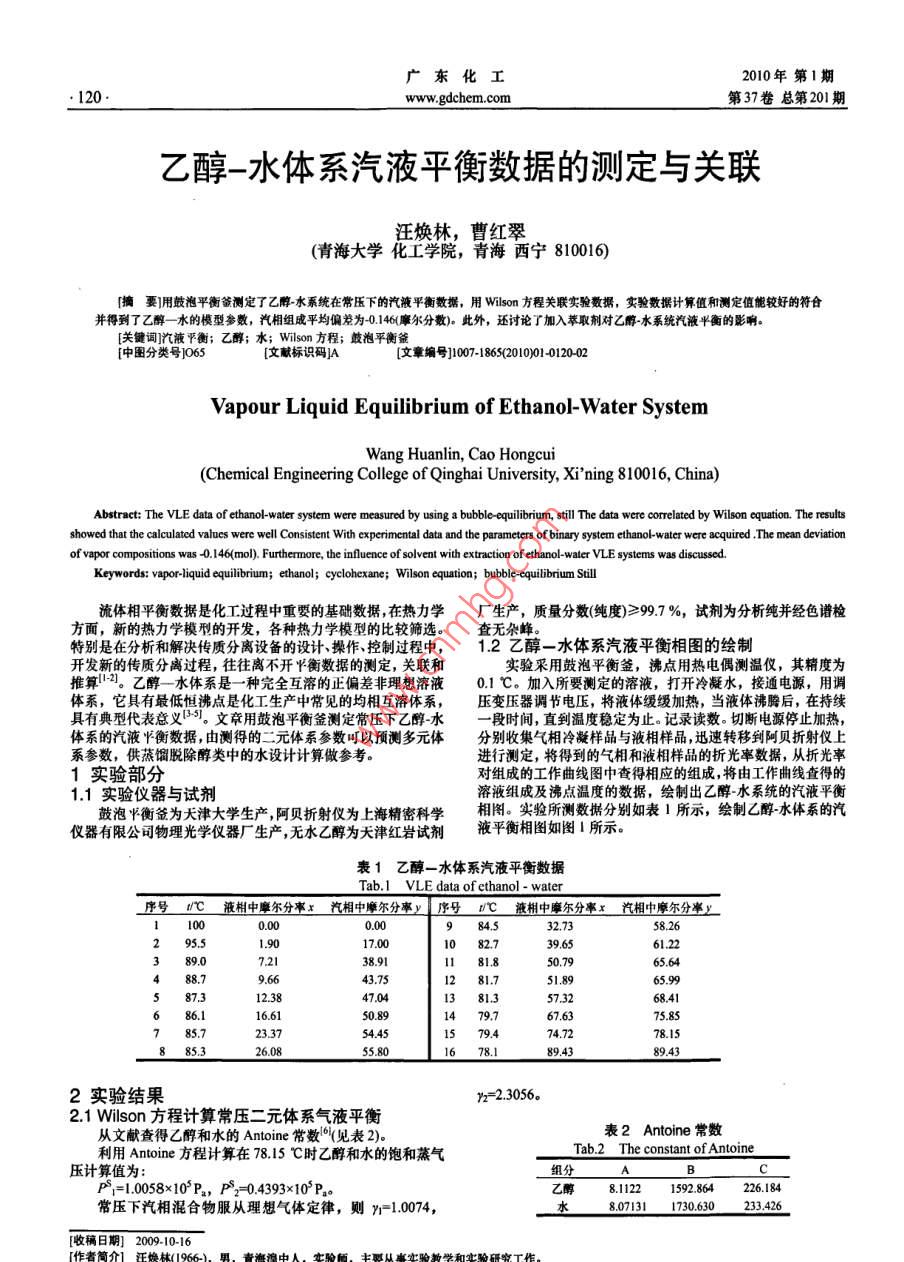 乙醇-水體系汽液平衡數(shù)據(jù)的測定與關聯(lián)