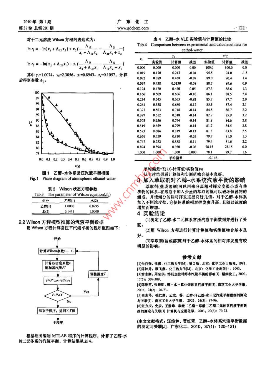 廣東化工2010年第l期120www.gdchem.com第37卷總第201期乙醇-水體系汽液平衡數(shù)據(jù)的測定與關聯(lián)汪煥林,曹紅翠青海大學化工學院,青海西寧810016)「摘要用鼓泡平衡釜測定了乙醇水系統(tǒng)在常壓下的汽液平衡數(shù)據(jù),用 Wilson方程關聯(lián)實驗數(shù)據(jù),實驗數(shù)據(jù)計算值和測定值能較好的符合并得到了乙醇一水的模型參數(shù),汽相組成平均偏差為0146(摩爾分數(shù))。此外,還討論了加入蘋取劑對乙醇水系統(tǒng)汽液平衡的影響[關鍵詞汽液平衡;乙醇;水;wson方程;鼓泡平衡釜[中圖分類號1065[文獻標識碼A[文章編號】]1007-1865(2010)014012002Vapour Liquid Equilibrium of Ethanol-Water SystemWang Huanlin, Cao HongcunChemical Engineering College of Qinghai University, Xi'ning 810016, China)Abstract: The VLE data of ethanol-water system were measured by using a bubble-equilibrium, still The data were correlated by Wilson equation. The resultsowed that the calculated values were well Consistent With experimental data and the parameters of binary system ethanol-water were acquired, The mean deviationof vapor compositions was - 0. 146(mol). Furthermore, the influence of solvent with extraction of ethanol-water VLE systems was discussedKeywords: vapor-liquid equilibrium; ethanol; cyclohexane; Wilson equation; bubble-equilibrium Still流體相平衡數(shù)據(jù)是化工過程中重要的基礎數(shù)據(jù)在熱力學廠生產(chǎn),質量分數(shù)純度)≥997%,試劑為分析純并經(jīng)色譜檢方面,新的熱力學模型的開發(fā),各種熱力學模型的比較篩選。查無雜峰。特別是在分析和解決傳質分離設備的設計操作、控制過程中,12乙醇一水體系汽液平衡相圖的繪制開發(fā)新的傳質分離過程,往往離不開平衡數(shù)據(jù)的測定,關聯(lián)實驗采用鼓泡平衡釜,沸點用熱電偶測溫儀,其精度為推算2。乙醇一水體系是一種完全互溶的正偏差非理想溶液01℃。加入所要測定的溶液,打開冷凝水,接通電源,用調(diào)體系,它具有最低恒沸點是化工生產(chǎn)中常見的均相互溶體系,壓變壓器調(diào)節(jié)電壓,將液體緩緩加熱,當液體沸后,在持續(xù)具有典型代表意義。文章用鼓泡平衡釜測定常壓下乙醇水一段時間,直到溫度穩(wěn)定為止。記錄讀數(shù)。切斷電源停止加熱體系的汽液平衡數(shù)據(jù),由測得的二元體系參數(shù)可以預測多元體分別收集氣相冷凝樣品與液相樣品,迅速轉移到阿貝折射儀上系參數(shù),供蒸餾脫除醇類中的水設計計算做參考。進行測定,將得到的氣相和液相樣品的折光率數(shù)據(jù),從折光率1實驗部分對組成的工作曲線圖中查得相應的組成,將由工作曲線查得的1.1實驗儀器與試劑溶液組成及沸點溫度的數(shù)據(jù),繪制出乙醇水系統(tǒng)的汽液平衡鼓泡平衡釜為大津大學生產(chǎn),阿貝折射儀為上海精密科學相圖。實驗所測數(shù)據(jù)分別如表1所示,繪制乙醇水體系的汽儀器有限公司物理光學儀器廠生產(chǎn),無水乙醇為天津紅巖試劑液平衡相圖如圖1所示表1乙醇一水體系汽液平衡數(shù)據(jù)Tab 1 vle data of ethanol-water序號℃液相中摩爾分率x汽相中摩爾分率」『序號℃蕙相中嚀爾分率x汽相中摩爾分率∑5826295.517.001082739612238903891l18l865.6443.751281.75l896599686.150891479.767637585785.72354451579474.7226088942實驗結果y2=230521 Wilson方程計算常壓二元體系氣液平衡從文獻查得乙醇和水的 antoine常數(shù)(見表2)。表2 Antoine常數(shù)利用 Antoine方程計算在78l5℃時乙醇和水的飽和蒸氣Tab.2 The constant of antoine壓計算值為:P=1.0058×105P,P2=04393×105P乙醇8.1122常壓下汽相混合物服從理想氣體定律,則y1-1.00748071311730630233426[收稿日期]200910-162010年第1期廣東化工第37卷總第201期www.gdchem.com121對于二元溶液Wion方程的表達式為表4乙醇-水ⅥE實驗值與計算值的比較Tab 4 Comparison between experimental and calculated data forln(x1+A12x2)+x2(x1+A2x2A21x1+x2m=-mx2+Anx)6(、MAn)xˉ實驗值計算值殘差實驗值計算值殘差其中y1=1.0074、y2=23056、x1=0.8943、x20.1057,計算0019.1700.2955后得到參數(shù)行°038904580078900.0970.51300.12404700.1660.5090.6060.1086.1054568538740.32705830.718-0.140.397060.7480.148405190.6590.7990.148184.50.5730.68483.825820.7470.782816089495000678.150010000008100a10203040.506070平均偏差平均偏差=(1.0-計算值實驗值yn圖1乙醇-水體系常壓汽液平衡相圖從上述結果看計算值和實測值吻合基本良好ig. 1 Phase diagram of atmospheric ethanol-water3加入萃取劑對乙醇-水系統(tǒng)汽液平衡的影響表3 Wilson狀態(tài)方程參數(shù)萃取劑(鹽或溶劑)可以用來分離相對揮發(fā)度很小或有共Tab. 3 The沸物的體系。在溶液中加入少量的萃取劑就可以破壞恒沸物的組成,并使組分的相對揮發(fā)度提高好幾倍。對于乙醇水體系乙醇(山)水(2)加入不同濃度鹽,它使體系的相對揮發(fā)度升高,且隨鹽濃度的乙醉(1)1000008995增加而增加4實驗結論22 Wilson方程模型推算的汽液平衡數(shù)據(jù)(1)測定了乙醇水二元體系常壓汽液平衡數(shù)據(jù)并進行了關用 Wilson方程計算常壓下汽液平衡的程序框圖如下(2)用 Wilson方程進行計算計算值和實測值吻合基本良(3)萃取劑(鹽或溶劑)對于乙醇水體系的相對揮發(fā)度有較明顯的影響。計算 wilson參數(shù)an,a參考文獻計算各活度系數(shù)[]自強,徐汛.化工熱力學DM第2版北京:化學工業(yè)出版社,1991飽和蒸汽壓P[2]陳鐘秀,顧飛燕化工熱力學M]北京:化學工業(yè)出版社,1993調(diào)整溫度T3]雷志剛,周榮琪