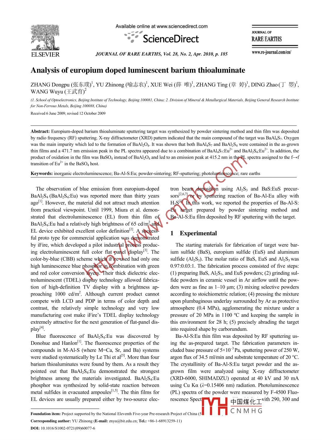 Available online at www.sciencedirect.comJOURNALOF“ScienceDirectRARE EARTHS ,EL SEVIERJOURNAL OF RARE EARTHS, Vol. 28, No. 2, Apr. 2010, p. 185www.e-journal.com/en/Analysis of europium doped luminescent barium thioaluminateZHANG Dongpu (張東璞), YU Zhinong (喻志農(nóng))', XUE Wei (薛唯), ZHANG Ting (章婷), DING Zhao(丁墨),WANG Wuyu (王武育)(1. School of Optoelectronics, Beijing Institute of Technology, Bejing 100081, China; 2. Division of Mineral & Melallurgical Materials, Bejing General Research Institutefor Non-Ferrous Metals, Beiing 10088 China)Received 6 June 2009; revised 12 October 2009Abstract: Europium-doped barium thioaluminate sputtering target was synthesized by powder sintering method and thin film was depositedby radio frequency (RF) sputtering. X-ray diffractometer (XRD) pattern indicated that the main compound of the target was BaAl4S7. Oxygenwas the main impurity which led to the formation of BaAl2O4 It was shown that both BaAl4S- and BaAl2S4 were contained in the as grownthin films and a 471.7 nm emission peak in the PL spectra appeared due to a combination of BaAl4S:Eu2+ and BaAl2S4:Eu2 . In addition, theproduct of oxidation in the film was BaSO4 instead of BaAl2O. and led to an emission peak at 415.2 nm in the PL spectra assigned to the f-→ftransition of Eu+ in the BaSO4 host.Keywords: inorganic electroluminescence; Ba-Al-S:Eu; powder-sintering; RF-sputering; photoluminescence; rare earthsThe observation of blue emission from europium-dopedtron beam deposition using Al2S3 and BaS:EuS precur-BaAl2S4 (BaAl2S4:Eu) was reported more than thirty yearssorsl2-6.1 or by sputtering reaction of Ba-Al-Eu alloy withago". However, the material did not attract much attentionH2Sb. In this work, we reported the properties of Ba-Al-S:from practical viewpoint. Until 1999, Miura et al. demon-Eu target prepared by powder sintering method andstrated that electroluminescence (EL) from thin film ofBa-Al-S:Eu film deposited by RF sputtering with the target.BaAl2S4:Eu had a relatively high brightness of 65 cd/m2 andEL device exhibited excellent color definition!2]. A success-1 Experimentalful proto type for commercial application was demonstratedby iFire, which developed a pilot industrial process produc-The starting materials for fabrication of target were bar-ing electroluminescent full color flat panel display'. Theium sulfide (BaS), europium sulfide (EuS) and aluminumcolor-by-blue (CBB) scheme which iFire used had only onesulfide (Al2Ss3). The molar ratio of BaS, EuS and Al2S3 washigh luminescence blue phosphor in combination with green0.97:0.03:1. The fabrication process consisted of five steps:and red color conversion layers. Their thick dielectric elec-(1) preparing BaS, Al2Ss, and EuS powders; (2) grinding sul-troluminescent (TDEL) display technology allowed fabrica-fide powders in ceramic vessel in Ar airflow until the pow-tion of high-definition TV display with a brightness ap-ders were as fine as 1-10 pum; (3) mixing selective powdersproaching 1000 cd/m2. Although current product cannotcompete with LCD and PDP in terms of color depth andupon plumbaginous underlay surrounded by Ar as protectivecontrast, the relatively simple technology and very lowatmosphere (0.4 MPa), agglomerating the mixture under amanufacturing cost make iFire's TDEL display technologypressure of 20 MPa in 1100 °C and keeping the sample inextremely attractive for the next generation of flat-panel dis-this environment for 28 h; (5) precisely abrading the targetplay"I.into required shape by carborundum.Blue fluorescence of BaAlS4:Eu was discovered byBa-Al- S:Eu thin film was deposited by RF sputtering us-Donohue and Hanlon' ". The fluorescence properties of theing the as-prepared target. The fabrication parameters in-compounds in M-AI-S (where M=Ca, Sr, and Ba) systemscluded base pressure of 5x 10 3 Pa, sputtering power of250 W,were studied systematically by Le Thi et al'. More than fourargon flux of 34.5 ml/min and substrate temperature of 20 °C.barium thioaluminates were found by them. As a result theyThe crystallinity of Ba-AI-S:Eu target powder and the as-pointed out that BaAl2S:Eu demonstrated the strongestgrown film were analyzed using X-ray diffractometerbrightness among the materials investigated. BaAl2S4Eu(XRD-6000, SHIMADZU) operated at 40 kV and 30 mAphosphor was synthesized by solid-state reaction betweenusing Cu Ka (2=0.15406 nm) radiation. Photoluminescencemetal sulfides in evacuated ampoulsfl-.]. The thin films for(PL) spectra of the powder were measured by F-4500 Fluo-EL devices are usually prepared either by two-source elec-rescence Spec中國煤化ivith 290, 300 andCNMH GFoundation item: Project supported by the National Eleventh Five-year Pre-research Project of China (TMYHCorresponding author: YU Zhinong (E-mail: zmnyu@bit.edu.cn; Tel: +86-1-68913259-11)DOI: 10.01/0-2072109)6077-6186JOURNAL OF RARE EARTHS, Vol. 28, No. 2, Apr. 2010320 nm excitation wavelength, respectively. The excited ul-4f7(S72) transition of Eu2+ occurs regardless of the excita-traviolet for the thin film was 220 nm. The X-ray photoelec-ion wavelength used. This emission peak represents thetron spectroscopy (XPS) was measured using PHI5300presence of BaAl4S:Eu as this material has an emissionESCA system.maximum at 470 nm5. Its emission will overlap with thefluorescence peak of BaAl2S4:Eu at 475 nm. Generally, the2 Results and discussionBa-AI-S system contains at least seven termary compounds.All of these ternary compounds can be doped at the Ba sitewith Eu5.10. However, only the cubic BaAl2S4:Eu compound2.1 Analysis of the sputtering targethas practical value as an EL phosphor. The existence ofFig.1 shows the components of the target. Theother phases may affect the color definition of the emittedcomponents include barium tetraaluminum sulfide (BaAl4S),blue light. The other compounds in the Ba-Al-S system ac-barium sulfide (BaS), europium sulfide (EuS), bariumtivated by Eu2+ emit light at a longer wavele