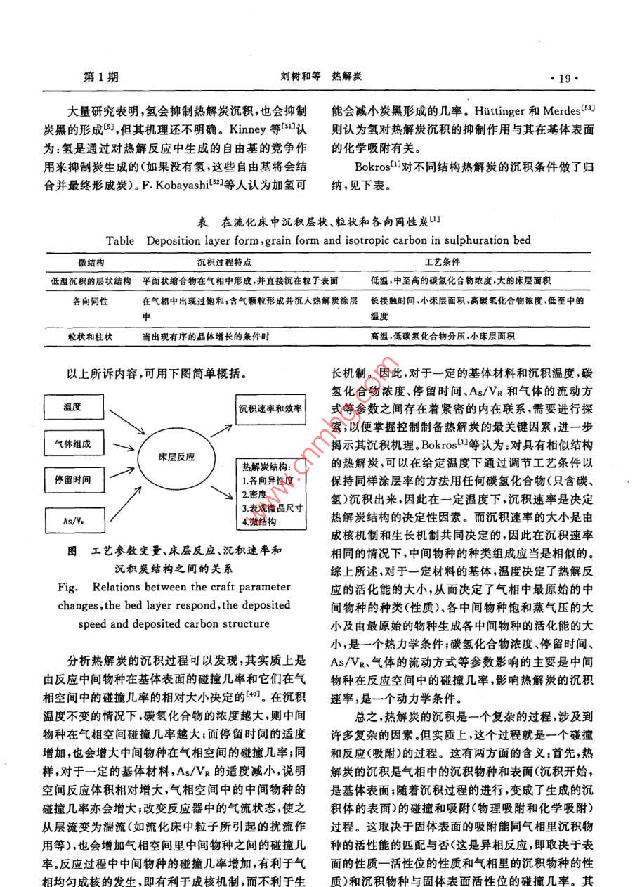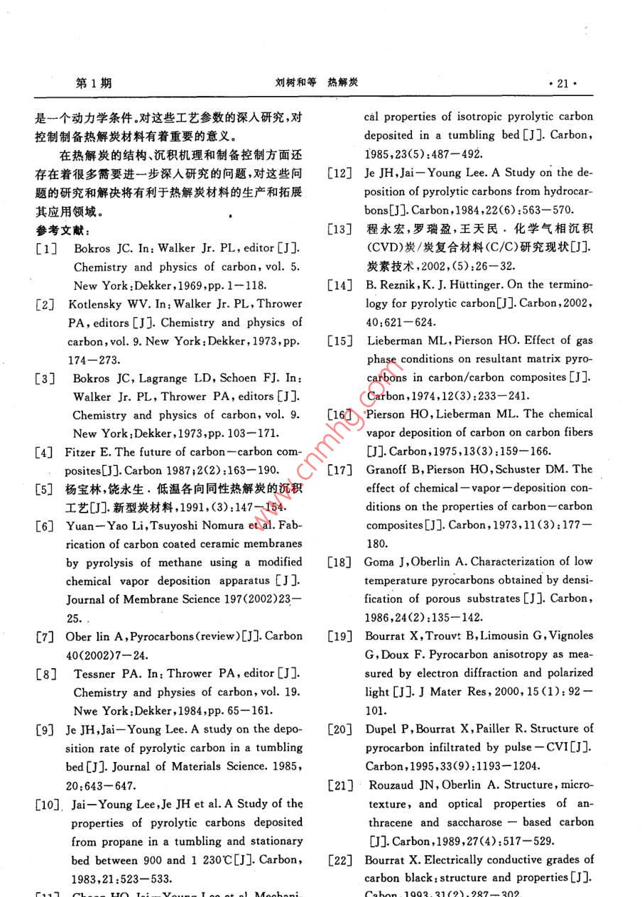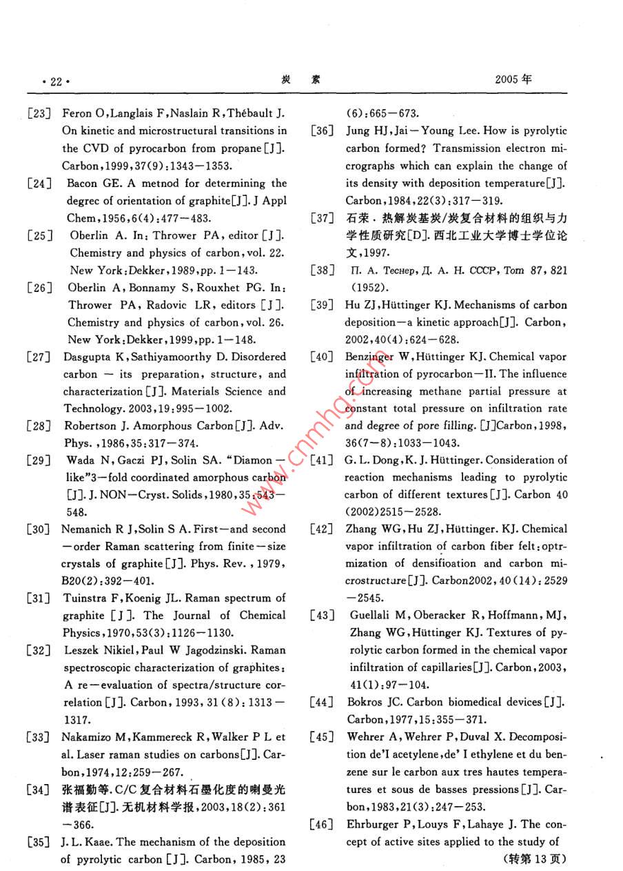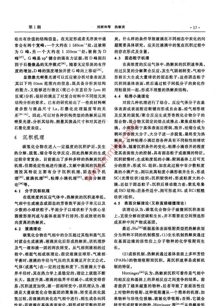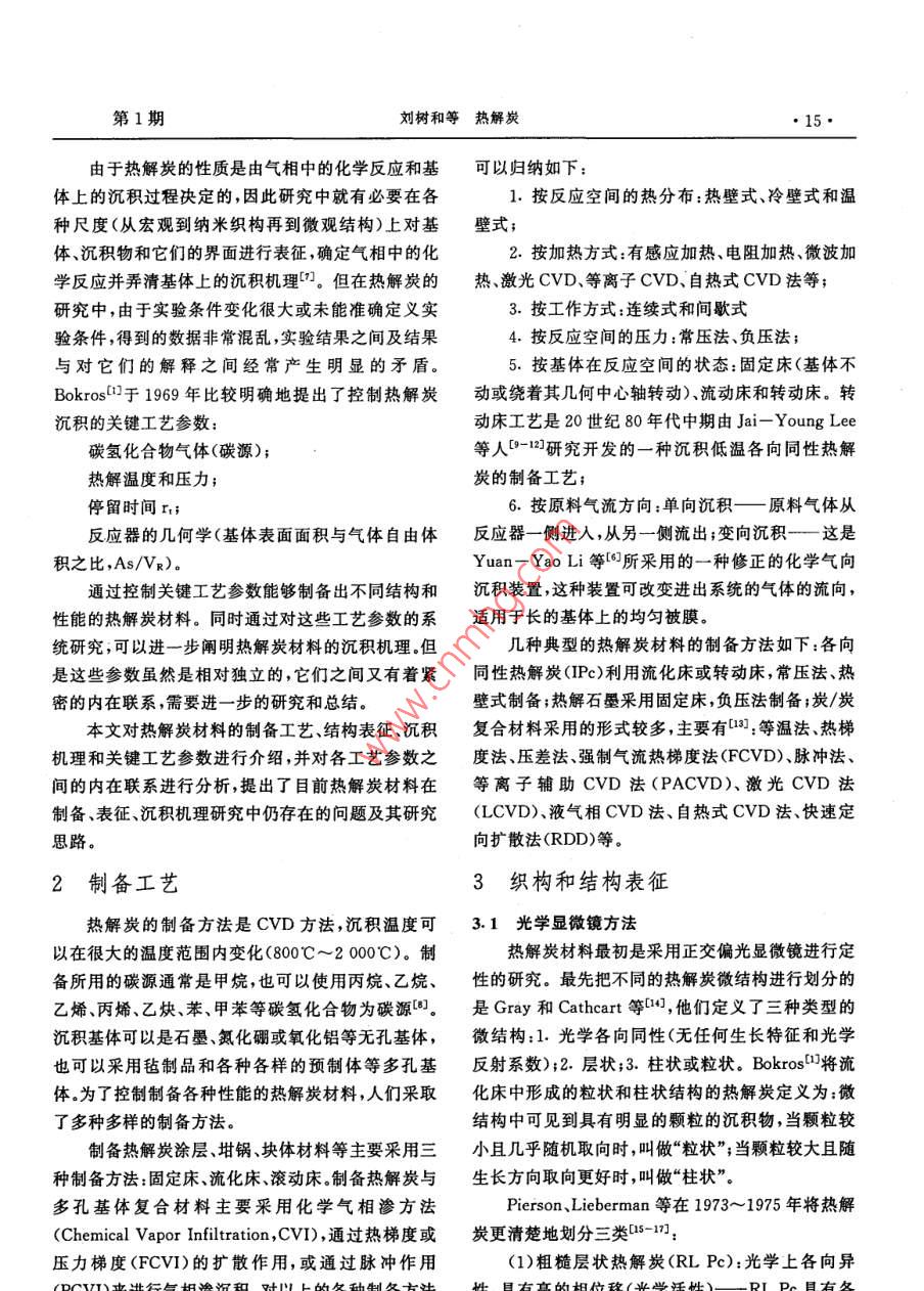 炭素14·CARBON總第121期文章編號(hào):1001-898(2005)01-0014-10熱解炭劉樹(shù)和,白朔,成會(huì)明(中國(guó)科學(xué)院金屬研究所先進(jìn)炭材料研究部,沈陽(yáng)110016)摘要:主要介紹了熱解炭材料的制備工藝、結(jié)構(gòu)表征、沉積機(jī)理和影響熱解炭制備的關(guān)鍵工藝參數(shù),對(duì)各工藝參數(shù)之間的內(nèi)在聯(lián)系進(jìn)行了分析,并對(duì)其結(jié)構(gòu)表征、制備、沉積機(jī)理研究中的一些問(wèn)題提出了研究思路。關(guān)鍵詞:熱解炭;化學(xué)氣相沉積;制備;結(jié)構(gòu);沉積機(jī)理中圖分類(lèi)號(hào):TB332文獻(xiàn)標(biāo)識(shí)碼:APYROCARBONSLIU Shu-he, BAI Shuo, CHENG Hui-mingGroup of Advanced Carbon Material Research, Institute of Metal Research, ChineseAcademy of Science Shenyang 110016, China)Abstract The pyrocarbons prepared by chemical vapor deposition(CVD )are reviewed in this paper, whichmainly covers the application and development of this material, the synthesis technique, the influential fac-tors, the characterization of the structure of pyrocarbon, the deposition mechanisms involved in the pro-cess, the main problems existed in this field and their possible solving methodsKey words: Pyrocarbon; Chemical vapor deposition; Synthesis; Structure; Deposition Mechanism1前言各種不同結(jié)構(gòu)和性能的熱解炭材料,作為結(jié)構(gòu)和功能材料在航空航天、原子能、醫(yī)學(xué)、電子、機(jī)械、納米熱解炭( Pyrocarbons,Pe)是氣態(tài)碳?xì)浠衔镌诓牧系阮I(lǐng)域都得到了廣泛的應(yīng)用熱基體表面通過(guò)脫氫作用而形成的炭材料。近50多國(guó)內(nèi)外對(duì)熱解炭材料的制備工藝、結(jié)構(gòu)和性能年來(lái),由于熱解炭材料在工業(yè)上有著重要的應(yīng)用,因方面進(jìn)行了大量的研究工作,取得了很多研究成果。此出現(xiàn)了大量的關(guān)于熱解炭的文獻(xiàn)報(bào)導(dǎo)口-。最初但在制備熱解炭沉積機(jī)理方面的基礎(chǔ)研究工作相對(duì)人們采用在流化床中化學(xué)氣相沉積( Chemical va-較少,雖然提出了很多種理論模型但一直沒(méi)有形成por Deposition,CVD)的方法,用熱解炭包覆核反應(yīng)致性的看法。產(chǎn)生這一現(xiàn)象不僅由于實(shí)驗(yàn)設(shè)計(jì)的堆燃料粒子用于核反應(yīng)堆中。隨著熱解炭材料的制復(fù)雜性,也由于沒(méi)有列出有效的工藝參數(shù)或列出了備工藝性能和結(jié)構(gòu)等方面研究的逐步深入,發(fā)展出卻未進(jìn)行系統(tǒng)研究17日期:2004-10-18簡(jiǎn)介:劉樹(shù)和(1970-)男,吉林蛟河人,中國(guó)科學(xué)院金屬研究所博士研究生,主要從事熱解炭材料研究工作,E-mail;shiu@imr.ac.cn第1期劉樹(shù)和等熱解炭15由于熱解炭的性質(zhì)是由氣相中的化學(xué)反應(yīng)和基可以歸納如下:體上的沉積過(guò)程決定的,因此研究中就有必要在各1.按反應(yīng)空間的熱分布:熱壁式、冷壁式和溫種尺度(從宏觀到納米織構(gòu)再到微觀結(jié)構(gòu))上對(duì)基壁式;體、沉積物和它們的界面進(jìn)行表征,確定氣相中的化2.按加熱方式:有感應(yīng)加熱、電阻加熱、微波加學(xué)反應(yīng)并弄清基體上的沉積機(jī)理。但在熱解炭的熱、激光CVD等離子CVD、自熱式CVD法等;研究中,由于實(shí)驗(yàn)條件變化很大或未能準(zhǔn)確定義實(shí)3按工作方式:連續(xù)式和間歇式驗(yàn)條件,得到的數(shù)據(jù)非?;靵y,實(shí)驗(yàn)結(jié)果之間及結(jié)果4.按反應(yīng)空間的壓力:常壓法、負(fù)壓法;與對(duì)它們的解釋之間經(jīng)常產(chǎn)生明顯的矛盾。5按基體在反應(yīng)空間的狀態(tài):固定床(基體不Bokros口于1969年比較明確地提出了控制熱解炭動(dòng)或繞著其幾何中心軸轉(zhuǎn)動(dòng))、流動(dòng)床和轉(zhuǎn)動(dòng)床。轉(zhuǎn)沉積的關(guān)鍵工藝參數(shù):動(dòng)床工藝是20世紀(jì)80年代中期由Jai- Young Lee碳?xì)浠衔餁怏w(碳源);等人-12研究開(kāi)發(fā)的一種沉積低溫各向同性熱解熱解溫度和壓力;炭的制備工藝停留時(shí)間r6.按原料氣流方向:單向沉積—原料氣體從反應(yīng)器的幾何學(xué)(基體表面面積與氣體自由體反應(yīng)器一側(cè)進(jìn)入,從另一側(cè)流出;變向沉積—這是積之比,As/VR)。Yun- Yao li等6所采用的一種修正的化學(xué)氣向通過(guò)控制關(guān)鍵工藝參數(shù)能夠制備出不同結(jié)構(gòu)和沉積裝置,這種裝置可改變進(jìn)出系統(tǒng)的氣體的流向,性能的熱解炭材料。同時(shí)通過(guò)對(duì)這些工藝參數(shù)的系適用于長(zhǎng)的基體上的均勻被膜統(tǒng)研究,可以進(jìn)一步闡明熱解炭材料的沉積機(jī)理。但幾種典型的熱解炭材料的制備方法如下:各向是這些參數(shù)雖然是相對(duì)獨(dú)立的,它們之間又有著緊同性熱解炭(IPc)利用流化床或轉(zhuǎn)動(dòng)床,常壓法、熱密的內(nèi)在聯(lián)系,需要進(jìn)一步的研究和總結(jié)。壁式制備;熱解石墨釆用固定床,負(fù)壓法制備;炭/炭本文對(duì)熱解炭材料的制備工藝、結(jié)構(gòu)表征、沉積復(fù)合材料采用的形式較多,主要有:等溫法、熱梯機(jī)理和關(guān)鍵工藝參數(shù)進(jìn)行介紹并對(duì)各工藝參數(shù)之度法、壓差法、強(qiáng)制氣流熱梯度法(FCⅤD)、脈沖法、間的內(nèi)在聯(lián)系進(jìn)行分析,提出了目前熱解炭材料在等離子輔助CVD法( PACVD)、激光CVD法制備、表征、沉積機(jī
