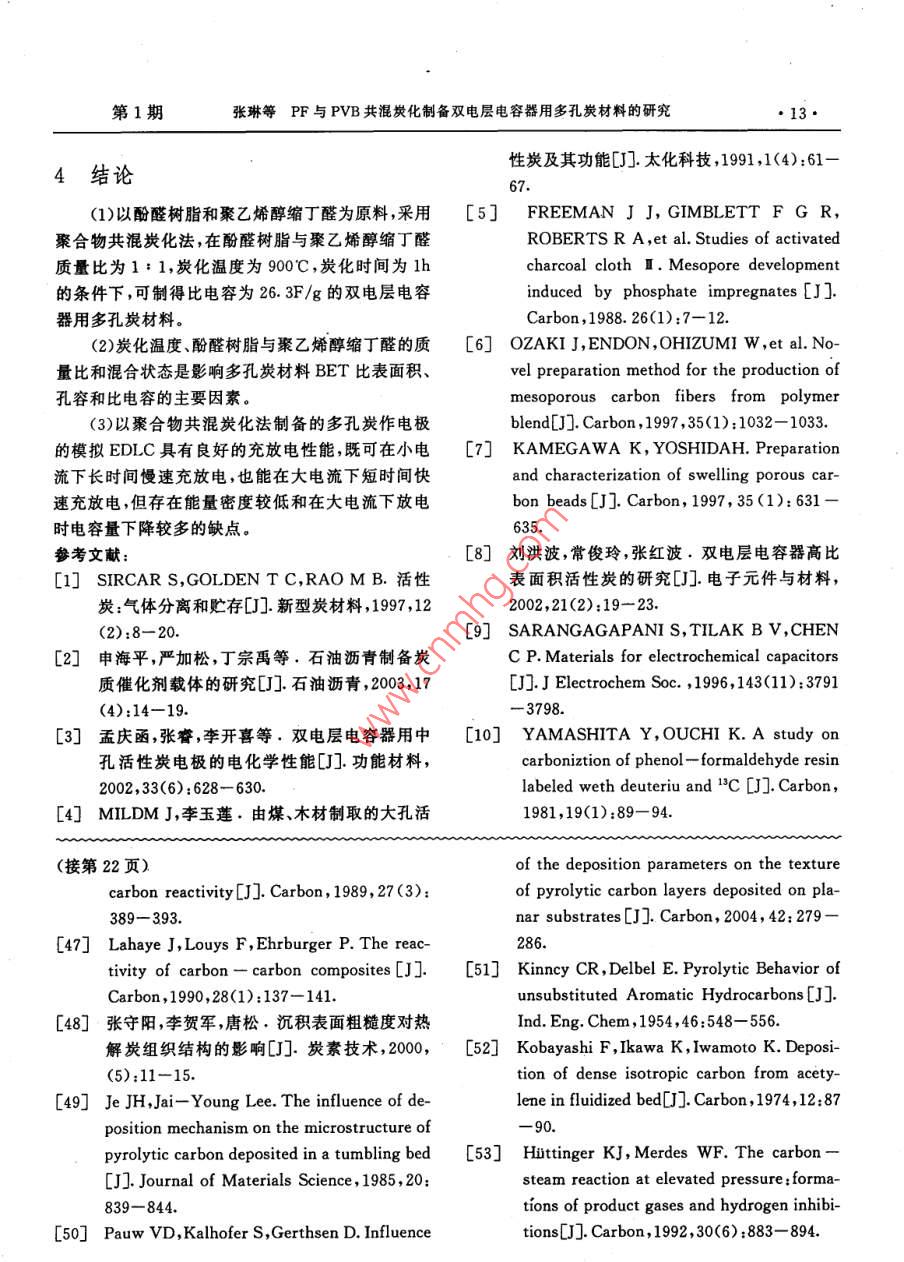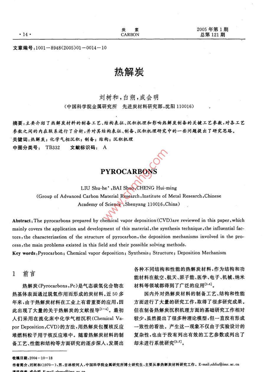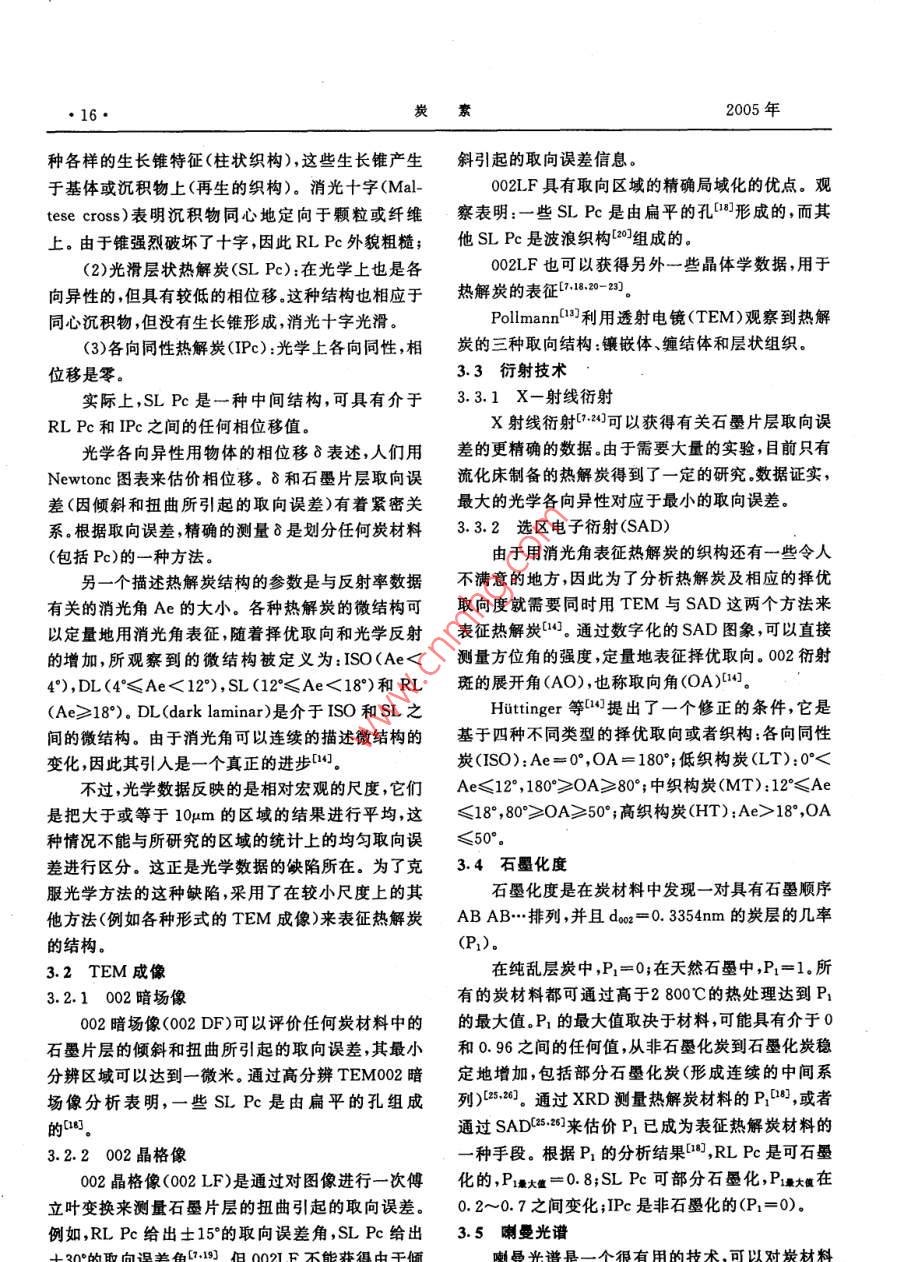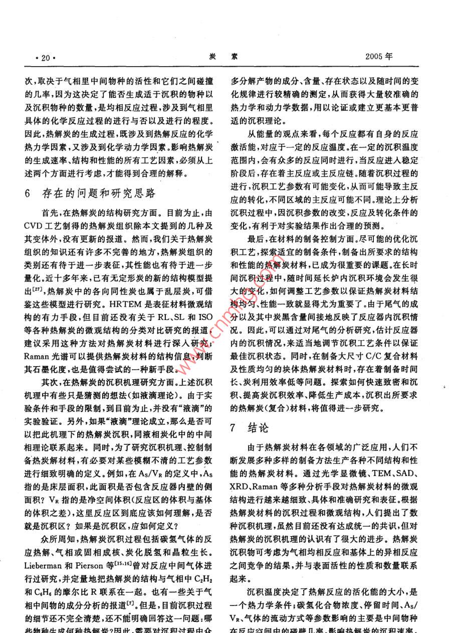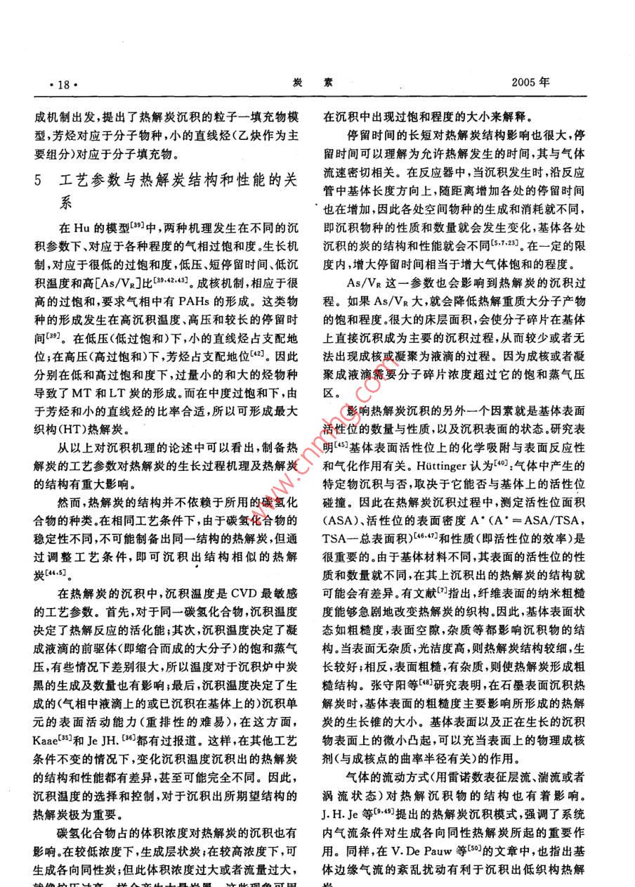 炭素14·CARBON總第121期文章編號(hào):1001-898(2005)01-0014-10熱解炭劉樹(shù)和,白朔,成會(huì)明(中國(guó)科學(xué)院金屬研究所先進(jìn)炭材料研究部,沈陽(yáng)110016)摘要:主要介紹了熱解炭材料的制備工藝、結(jié)構(gòu)表征、沉積機(jī)理和影響熱解炭制備的關(guān)鍵工藝參數(shù),對(duì)各工藝參數(shù)之間的內(nèi)在聯(lián)系進(jìn)行了分析,并對(duì)其結(jié)構(gòu)表征、制備、沉積機(jī)理研究中的一些問(wèn)題提出了研究思路。關(guān)鍵詞:熱解炭;化學(xué)氣相沉積;制備;結(jié)構(gòu);沉積機(jī)理中圖分類(lèi)號(hào):TB332文獻(xiàn)標(biāo)識(shí)碼:APYROCARBONSLIU Shu-he, BAI Shuo, CHENG Hui-mingGroup of Advanced Carbon Material Research, Institute of Metal Research, ChineseAcademy of Science Shenyang 110016, China)Abstract The pyrocarbons prepared by chemical vapor deposition(CVD )are reviewed in this paper, whichmainly covers the application and development of this material, the synthesis technique, the influential fac-tors, the characterization of the structure of pyrocarbon, the deposition mechanisms involved in the pro-cess, the main problems existed in this field and their possible solving methodsKey words: Pyrocarbon; Chemical vapor deposition; Synthesis; Structure; Deposition Mechanism1前言各種不同結(jié)構(gòu)和性能的熱解炭材料,作為結(jié)構(gòu)和功能材料在航空航天、原子能、醫(yī)學(xué)、電子、機(jī)械、納米熱解炭( Pyrocarbons,Pe)是氣態(tài)碳?xì)浠衔镌诓牧系阮I(lǐng)域都得到了廣泛的應(yīng)用熱基體表面通過(guò)脫氫作用而形成的炭材料。近50多國(guó)內(nèi)外對(duì)熱解炭材料的制備工藝、結(jié)構(gòu)和性能年來(lái),由于熱解炭材料在工業(yè)上有著重要的應(yīng)用,因方面進(jìn)行了大量的研究工作,取得了很多研究成果。此出現(xiàn)了大量的關(guān)于熱解炭的文獻(xiàn)報(bào)導(dǎo)口-。最初但在制備熱解炭沉積機(jī)理方面的基礎(chǔ)研究工作相對(duì)人們采用在流化床中化學(xué)氣相沉積( Chemical va-較少,雖然提出了很多種理論模型但一直沒(méi)有形成por Deposition,CVD)的方法,用熱解炭包覆核反應(yīng)致性的看法。產(chǎn)生這一現(xiàn)象不僅由于實(shí)驗(yàn)設(shè)計(jì)的堆燃料粒子用于核反應(yīng)堆中。隨著熱解炭材料的制復(fù)雜性,也由于沒(méi)有列出有效的工藝參數(shù)或列出了備工藝性能和結(jié)構(gòu)等方面研究的逐步深入,發(fā)展出卻未進(jìn)行系統(tǒng)研究17日期:2004-10-18簡(jiǎn)介:劉樹(shù)和(1970-)男,吉林蛟河人,中國(guó)科學(xué)院金屬研究所博士研究生,主要從事熱解炭材料研究工作,E-mail;shiu@imr.ac.cn第1期劉樹(shù)和等熱解炭15由于熱解炭的性質(zhì)是由氣相中的化學(xué)反應(yīng)和基可以歸納如下:體上的沉積過(guò)程決定的,因此研究中就有必要在各1.按反應(yīng)空間的熱分布:熱壁式、冷壁式和溫種尺度(從宏觀到納米織構(gòu)再到微觀結(jié)構(gòu))上對(duì)基壁式;體、沉積物和它們的界面進(jìn)行表征,確定氣相中的化2.按加熱方式:有感應(yīng)加熱、電阻加熱、微波加學(xué)反應(yīng)并弄清基體上的沉積機(jī)理。但在熱解炭的熱、激光CVD等離子CVD、自熱式CVD法等;研究中,由于實(shí)驗(yàn)條件變化很大或未能準(zhǔn)確定義實(shí)3按工作方式:連續(xù)式和間歇式驗(yàn)條件,得到的數(shù)據(jù)非?;靵y,實(shí)驗(yàn)結(jié)果之間及結(jié)果4.按反應(yīng)空間的壓力:常壓法、負(fù)壓法;與對(duì)它們的解釋之間經(jīng)常產(chǎn)生明顯的矛盾。5按基體在反應(yīng)空間的狀態(tài):固定床(基體不Bokros口于1969年比較明確地提出了控制熱解炭動(dòng)或繞著其幾何中心軸轉(zhuǎn)動(dòng))、流動(dòng)床和轉(zhuǎn)動(dòng)床。轉(zhuǎn)沉積的關(guān)鍵工藝參數(shù):動(dòng)床工藝是20世紀(jì)80年代中期由Jai- Young Lee碳?xì)浠衔餁怏w(碳源);等人-12研究開(kāi)發(fā)的一種沉積低溫各向同性熱解熱解溫度和壓力;炭的制備工藝停留時(shí)間r6.按原料氣流方向:單向沉積—原料氣體從反應(yīng)器的幾何學(xué)(基體表面面積與氣體自由體反應(yīng)器一側(cè)進(jìn)入,從另一側(cè)流出;變向沉積—這是積之比,As/VR)。Yun- Yao li等6所采用的一種修正的化學(xué)氣向通過(guò)控制關(guān)鍵工藝參數(shù)能夠制備出不同結(jié)構(gòu)和沉積裝置,這種裝置可改變進(jìn)出系統(tǒng)的氣體的流向,性能的熱解炭材料。同時(shí)通過(guò)對(duì)這些工藝參數(shù)的系適用于長(zhǎng)的基體上的均勻被膜統(tǒng)研究,可以進(jìn)一步闡明熱解炭材料的沉積機(jī)理。但幾種典型的熱解炭材料的制備方法如下:各向是這些參數(shù)雖然是相對(duì)獨(dú)立的,它們之間又有著緊同性熱解炭(IPc)利用流化床或轉(zhuǎn)動(dòng)床,常壓法、熱密的內(nèi)在聯(lián)系,需要進(jìn)一步的研究和總結(jié)。壁式制備;熱解石墨釆用固定床,負(fù)壓法制備;炭/炭本文對(duì)熱解炭材料的制備工藝、結(jié)構(gòu)表征、沉積復(fù)合材料采用的形式較多,主要有:等溫法、熱梯機(jī)理和關(guān)鍵工藝參數(shù)進(jìn)行介紹并對(duì)各工藝參數(shù)之度法、壓差法、強(qiáng)制氣流熱梯度法(FCⅤD)、脈沖法、間的內(nèi)在聯(lián)系進(jìn)行分析,提出了目前熱解炭材料在等離子輔助CVD法( PACVD)、激光CVD法制備、表征、沉積機(jī