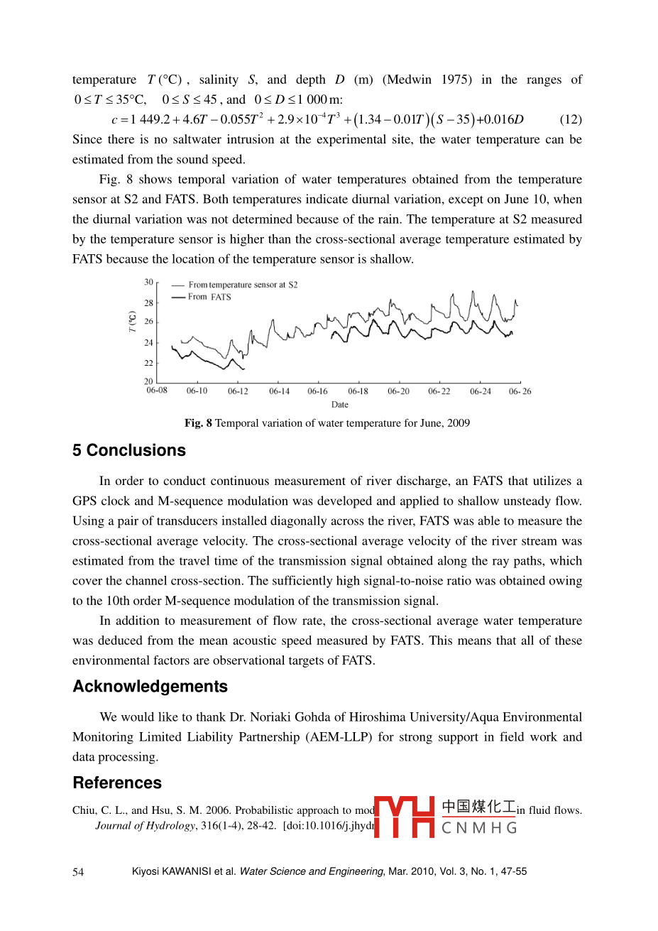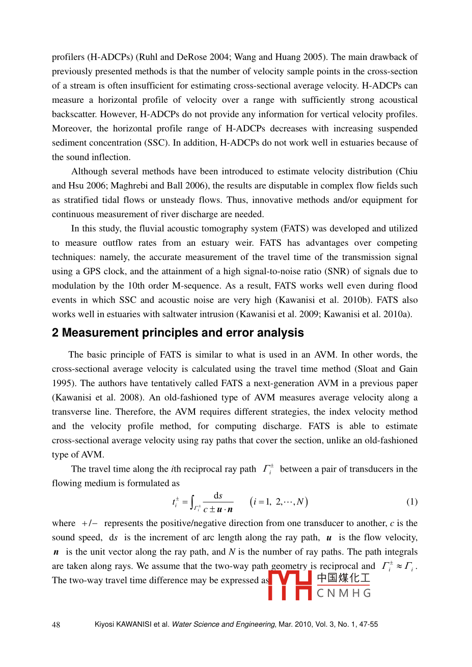 SEWater Science and Engineering, 2010, 3(1): 47-55doi:10.382/.issn.1674-2370.2010.01.005htp://ww.waterjournal.cne-mail: wse2008@vip.163.comNew acoustic system for continuous measurement of riverdischarge and water temperatureKiyosi KAWANISI*', Arata KANEKO', Shinya NIGO?, Mohammad SOLTANIASL',Mahmoud F. MAGHREBII. Graduate School of Engineering, Hiroshima University, 1-4-1, Kagamiyama,Higashi-Hiroshima 739-8527, Japan2. Ministry of Land, Infrastructure, Transport and Tourism, 2-4-36 Kitaku Sikadachou,Okayama 700-0914, Japan3. Civil Engineering Department, Ferdowsi University of Mashhad, P. O. Box 91775- 11, Mashhad, IranAbstract: In many cases, river discharge is indirectly estimated from water level or streamflowvelocity near the water surface. However, these methods have limited applicability. In this study, aninnovative system, the fluvial acoustic tomography system (FATS), was used for continuousdischarge measurement. Transducers with a central frequency of 30 kHz were installed diagonallyacross the river. The system's significant functions include accurate measurement of the travel timeof the transmission signal using a GPS clock and the attainment of a high signal-to-noise ratio as aresult of modulation of the signal by the 10th order M-sequence. In addition, FATS is small andlightweight, and its power consumption is low. Operating in unsteady streamflow, FATSsuccessfully measured the cross-sectional average velocity. The agreement between FATS andacoustic Doppler current profilers (ADCPs) on water discharge was satisfactory. Moreover, thetemporal variation of the cross-sectional average temperature deduced from the sound speed ofFATS was similar to that measured by a temperature sensor near the bank.Key words: streamflow; fluovial acoustic tomography; cross-sectional average velocity; unsteadyflow; water temperature1 IntroductionRiver discharge is an important hydrological factor in river and coastalplanning/management, control of water resources, and environmental conservation. Therefore,establishing the method and technology for streamflow measurement is a crucial issue.However, it is very difficult to measure cross-sectional average velocity in unsteady flows orduring extreme hydrologic events, such as flooding.For continuous measurement of water discharge, a few different pieces of equipment areavailable, e.g., acoustic velocity meters (AVMs) and horizontal acoustic Doppler current中國煤化工This work was supported by the Construction Technology ResearF of the Ministryof Land, Infrastructure, Transport and Tourism of Japan (NoMYHC N M H G.19-1212-005,21-1212-009).*Corresponding author (e-mail: kiyosi @ hiroshima -u.acjp)Received Sep.17, 2009; Accepted Dec.2, 2009profilers (H-ADCPs) (Ruhl and DeRose 2004; Wang and Huang 2005). The main drawback ofpreviously presented methods is that the number of velocity sample points in the cross-sectionof a stream is often insufficient for estimating cross-sectional average velocity. H-ADCPs canmeasure a horizontal profile of velocity over a range with sufficiently strong acousticalbackscatter. However, H-ADCPs do not provide any information for vertical velocity profiles.Moreover, the horizontal profile range of H-ADCPs decreases with increasing suspendedsediment concentration (SSC). In addition, H-ADCPs do not work well in estuaries because ofthe sound inflection.Although several methods have been introduced to estimate velocity distribution (Chiuand Hsu 2006; Maghrebi and Ball 2006), the results are disputable in complex flow fields suchas stratified tidal flows or unsteady flows. Thus, innovative methods and/or equipment forcontinuous measurement of river discharge are needed.In this study, the fluvial acoustic tomography system (FATS) was developed and utilizedo measure outflow rates from an estuary weir. FATS has advantages over competingtechniques: namely, the accurate measurement of the travel time of the transmission signalusing a GPS clock, and the attainment of a high signal-to-noise ratio (SNR) of signals due tomodulation by the 10th order M-sequence. As a result, FATS works well even during floodevents in which SSC and acoustic noise are very high (Kawanisi et al. 2010b). FATS alsoworks well in estuaries with saltwater intrusion (Kawanisi et al. 2009; Kawanisi et al. 2010a).2 Measurement principles and error analysisThe basic principle of FATS is similar to what is used in an AVM. In other words, thecross-sectional average velocity is calculated using the travel time method (Sloat and Gain1995). The authors have tentatively called FATS a next-generation AVM in a previous paper(Kawanisi et al. 2008). An old-fashioned type of AVM measures average velocity along atransverse line. Therefore, the AVM requires different strategies, the index velocity methodand the velocity profile method, for computing discharge. FATS is able to estimateCrOss- sectional average velocity using ray paths that cover the section, unlike an old-fashionedtype of AVM.The travel time along the ith reciprocal ray path r; between a pair of transducers in theflowing medium is formulated aslsJrac士u.n(i=1, 2,--,N)(1)where +/- represents the positive/negative direction from one transducer to another, c is thesound speed, ds is the increment of arc length along the ray path, u is the flow velocity,n is the unit vector along the ray path, and N is the number of ray paths. The path integralsare taken along rays. We assume that the two-way path geometry, is reciprocal and r; ≈I.The two-way travel time difference may be expressed as中國煤化工TYHCNMHG.48Kiyosi KAWANISI et al. Water Science and Engineering, Mar. 2010, Vol. 3, No. 1, 47-552u.n .2u.n2L,u,MI=5-5=1n2--(u.n)ads≈」,c"ds≈(2)where L, is the length of the ith ray path, and w, and G are the range average watervelocity and the sound speed along the ith ray path, respectively:元=一「. u. nds(3)云J,cds(4)c is calculated fromL+→+(+)-1.2=(imds≈(5)The cross-sectional average water velocity in th