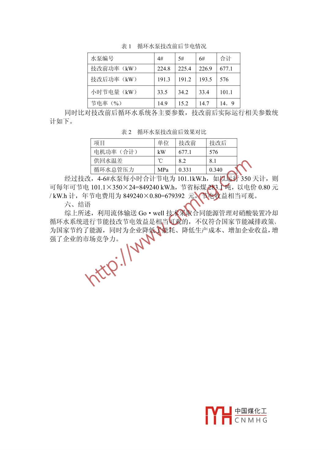 流體輸送Gowell技術(shù)在冷卻循環(huán)水系統(tǒng)節(jié)能技改中的應(yīng)用馬松浙江科維節(jié)能技術(shù)股份有限公司杭州市 310012摘要:本文結(jié)合山東華陽(yáng)迪爾化工有限公司硝酸裝置工藝?yán)鋮s循環(huán)水系統(tǒng)節(jié)能技改實(shí)際,對(duì)工藝?yán)鋮s循環(huán)水系統(tǒng)存在的問(wèn)題進(jìn)行闡述,對(duì)采取流體輸送Gowell技術(shù)進(jìn)行循環(huán)水系統(tǒng)節(jié)能技改的可行性進(jìn)行簡(jiǎn)要分析,對(duì)流體輸送Gowell技術(shù)的特點(diǎn)、手段進(jìn)行闡述,并介紹了節(jié)能技改項(xiàng)目取得的實(shí)際效果。關(guān)鍵詞:冷卻循環(huán)水系統(tǒng);流體輸送Gorwell技術(shù);節(jié)能技改中圖分類號(hào): TE08 .文獻(xiàn)標(biāo)識(shí)碼: A山東華陽(yáng)迪爾化工有限公司(下稱“華陽(yáng)迪爾公司”)是專業(yè)生產(chǎn)經(jīng)營(yíng)濃、稀硝酸的股份制企業(yè),華陽(yáng)迪爾公司稀硝酸裝置從愛(ài)爾蘭IFI公司全套引進(jìn),生產(chǎn)工藝先進(jìn)。華陽(yáng)迪爾公司生產(chǎn)管理水平處于國(guó)內(nèi)同行業(yè)前列,公司領(lǐng)導(dǎo)高度重視節(jié)能減排工作,基于技術(shù)和投資成本考慮,華陽(yáng)迪爾公司選擇了和循環(huán)水系統(tǒng)節(jié)能專業(yè)公司一-浙江科維 節(jié)能技術(shù)股份有限公司(下稱“科維公司”)采取合同能源管理模式,在不負(fù)擔(dān)任何節(jié)能技改費(fèi)用的前提下對(duì)硝酸裝置冷卻循環(huán)水系統(tǒng)進(jìn)行技改。一.方面華陽(yáng)迪爾公司存在循環(huán)水系統(tǒng)能耗過(guò)高的實(shí)際,另一方面科維公司在資金、技術(shù)上具有相當(dāng)?shù)膬?yōu)勢(shì)。工藝?yán)鋮s循環(huán)水系統(tǒng)在硝酸裝置生產(chǎn)能耗中占較大比重,而循環(huán)水泵是冷卻循環(huán)水系統(tǒng)中能耗較大的設(shè)備之-一,在循環(huán)水系統(tǒng)實(shí)際運(yùn)行過(guò)程中,往往出現(xiàn)循環(huán)水系統(tǒng)運(yùn)行效率不高、電機(jī)運(yùn)行功率偏大等現(xiàn)象,不僅縮短電機(jī)的使用壽命,更重要的是造成電能的浪費(fèi)??凭S公司采用流體輸送Go'well技術(shù)對(duì)華陽(yáng)迪爾公司硝酸裝置工藝?yán)鋮s循環(huán)水系統(tǒng)實(shí)施節(jié)能技改,取得了顯著的節(jié)電效果。一、硝酸裝置冷卻循環(huán)水系統(tǒng)運(yùn)行情況及存在問(wèn)題華陽(yáng)迪爾公司稀硝酸裝置分為稀硝酸和濃硝酸2個(gè)生產(chǎn)區(qū)域,冷卻循環(huán)水.通過(guò)泵房總管輸送至裝置區(qū),然后分別由各裝置支管供應(yīng)給各換熱器使用,換熱后回冷卻塔冷卻。該循環(huán)水系統(tǒng)配備水泵規(guī)格如下:德國(guó)KSB水泵(3臺(tái)):MBS300-400 (P= 220kW);.上海東方水泵(3 臺(tái)): DFSS300-435B (P=220kW);山東博山水泵(1臺(tái)): 12SH-9B (P=132kW)。實(shí)際運(yùn)行中出現(xiàn)以下問(wèn)題: 3臺(tái)DFSS300-435B泵在不同運(yùn)行模式下均出現(xiàn)超電流、超功率現(xiàn)象,偏離水泵實(shí)際工況,水泵運(yùn)行效率較低、循環(huán)水系統(tǒng)輸送效率低下,造成較大的能量損耗,有較大的節(jié)電空間。二、流體輸送Gowell技術(shù)簡(jiǎn)介1、流體輸送Gowell技術(shù)組成及技術(shù)思路科維公司流體輸送Gowell技術(shù)由數(shù)據(jù)采集(檢測(cè))技術(shù)、系統(tǒng)診斷分析技術(shù)、系統(tǒng)優(yōu)化改造技術(shù)、ECOWELL高效節(jié)能泵及變頻節(jié)能控制系統(tǒng)等四部分組成,也稱“3+1 ”節(jié)能技術(shù)。以合理的水送能耗指標(biāo)做指導(dǎo),以系統(tǒng)優(yōu)化、最佳工況運(yùn)行為目的,從調(diào)整合理流量、降低系統(tǒng)阻抗、提高水泵運(yùn)行效率三方面入手做起按晶住T況運(yùn).行原則,建立專業(yè)水力計(jì)算數(shù)學(xué)模型,通過(guò)檢測(cè)復(fù)核中國(guó)煤化工數(shù)和YHCNMHG設(shè)備參數(shù),即可準(zhǔn)確判斷引起“高功耗”的各種原因,準(zhǔn)確找到最佳工況點(diǎn);通過(guò)調(diào)整系統(tǒng)不利工況因素,并按最佳運(yùn)行工況參數(shù)定做“Go.well高效節(jié)能泵”替換目前處于不利工況、低效率運(yùn)行的水泵,徹底根治引起功耗增加的不利工況,提.高水泵效率,降低“無(wú)效功能”,達(dá)到真正的節(jié)能。2、工藝?yán)鋮s循環(huán)水系統(tǒng)節(jié)能技改設(shè)計(jì)過(guò)程2.1、通過(guò)分析系統(tǒng)裝置熱負(fù)荷以及工藝特點(diǎn),按經(jīng)濟(jì)供回水溫差原則,判斷流量的合理性,并確定合理流量,做到“裝置側(cè)合理用水、泵站側(cè)合理供水”。2.2、對(duì)換熱器及冷卻塔的熱工性能進(jìn)行評(píng)估,以確保經(jīng)濟(jì)供回水溫差實(shí)現(xiàn)的可行性。2.3、運(yùn)用計(jì)算機(jī)模擬技術(shù)分析管網(wǎng)水力節(jié)點(diǎn)平衡,尋找水力失衡原因,并通過(guò)閥門(mén)調(diào)節(jié)或增加提升動(dòng)力等手段優(yōu)化管網(wǎng)結(jié)構(gòu),得到可實(shí)現(xiàn)的最優(yōu)管網(wǎng)性能曲線,降低系統(tǒng)管網(wǎng)阻抗,提高管網(wǎng)運(yùn)行效率。2.4、通過(guò)對(duì)泵站原有運(yùn)行模式的工況分析,判斷電機(jī)及水泵的實(shí)際運(yùn)行效率是否高效,并結(jié)合裝置側(cè)所需的技術(shù)參數(shù)要求,確定高效節(jié)能泵參數(shù)設(shè